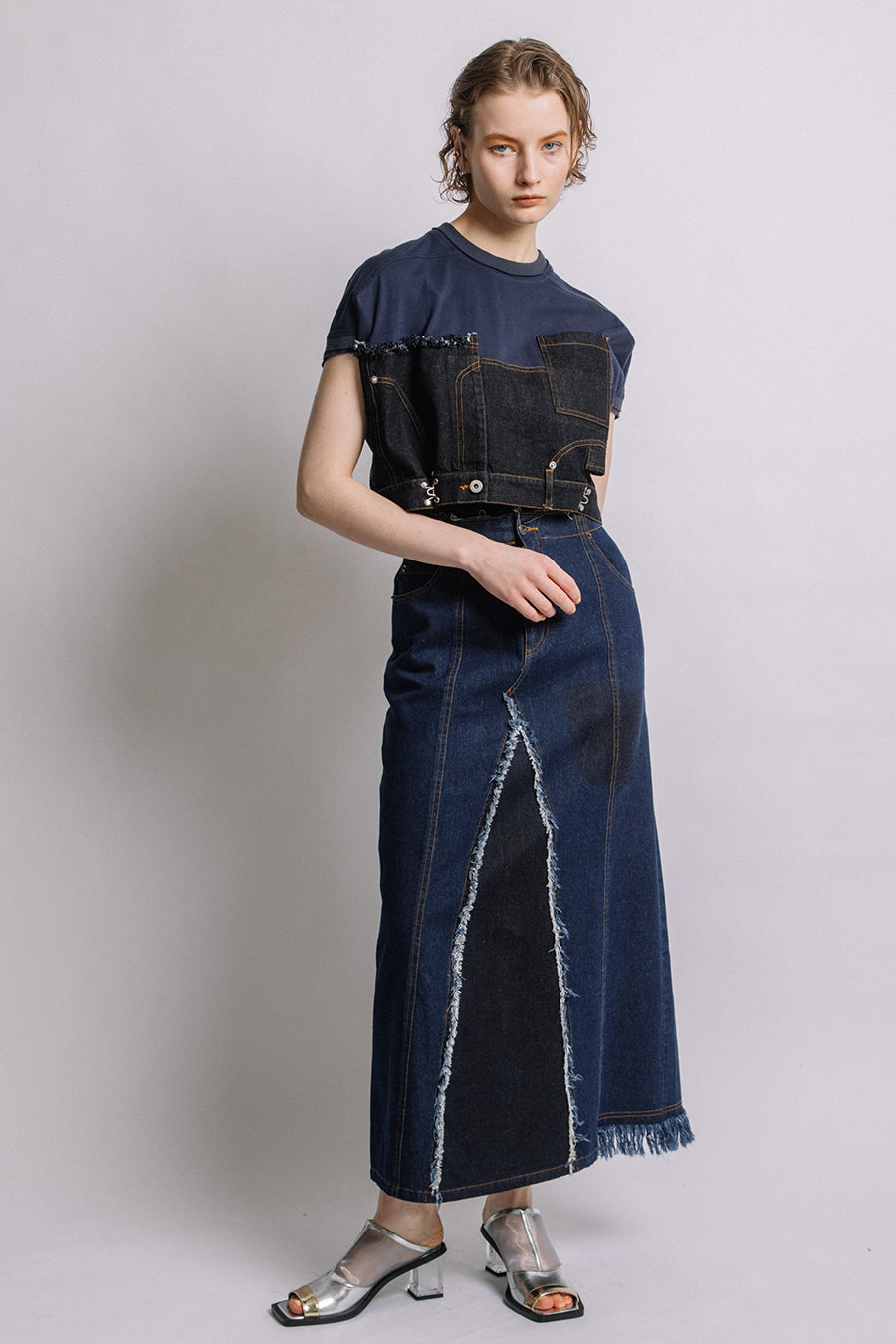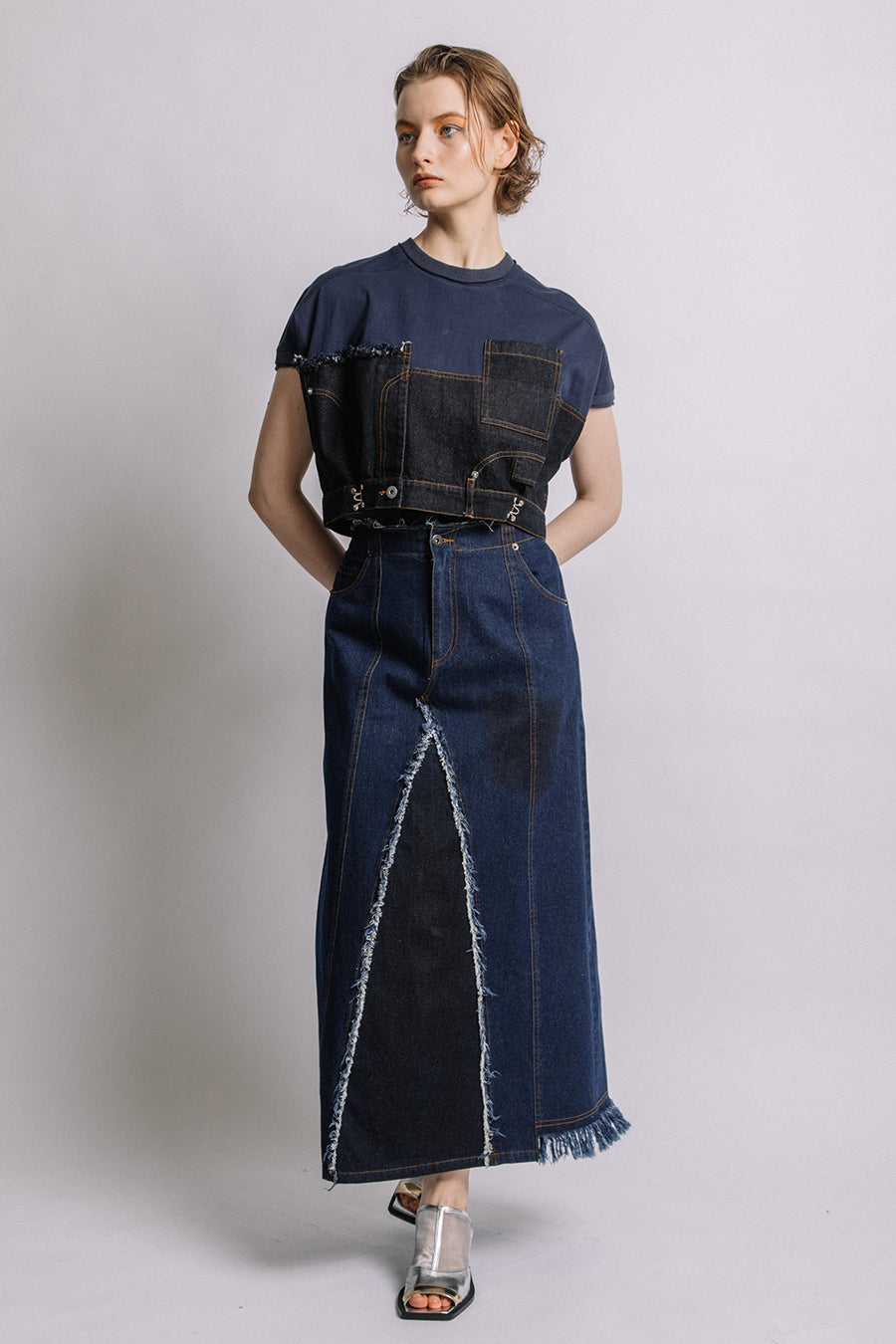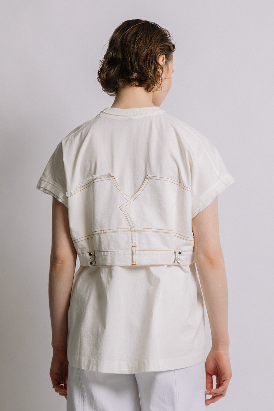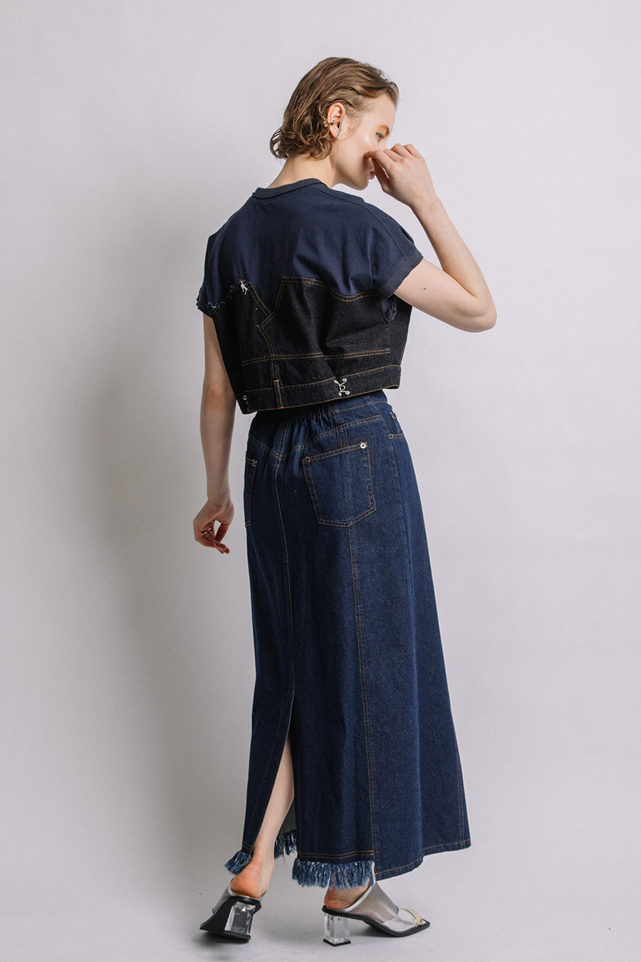 コットン天竺とライトオンスデニムのアシンメトリーコンビTシャツ。薄く軽やかなコットン天竺素材とライトオンスデニムを使用し、春先のインナーとしても、真夏のトップスとしても着用可能。デニムは加工を施し、柔らかく、ヴィンテージライクな風合いに仕上げ、アシンメトリーに施したフリンジもポイントに。デニムのウエスト箇所の前後ホックを留めるとレディライクなフレアシルエットに変わり、ウエストが絞られることでスタイルアップ効果も◎スタイリングによって好みのシルエットを楽しめます。着丈はヒップにかかる設定なので腰回りを、フレンチスリーブは長めの設定で二の腕をカバーしてくれるのも嬉しいポイント。