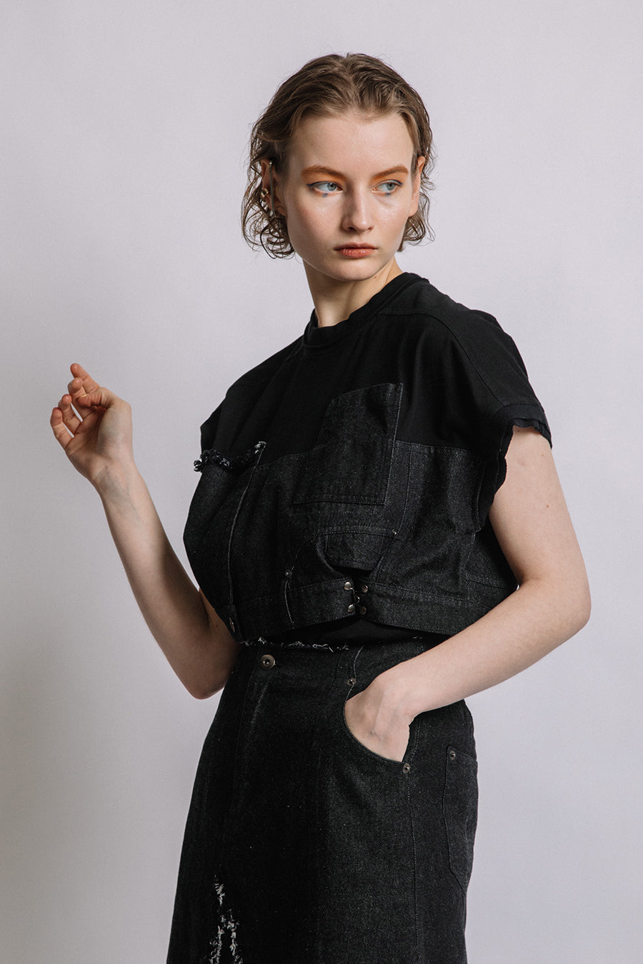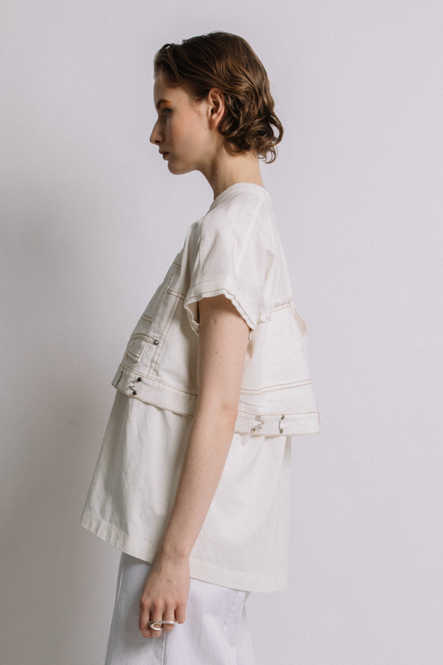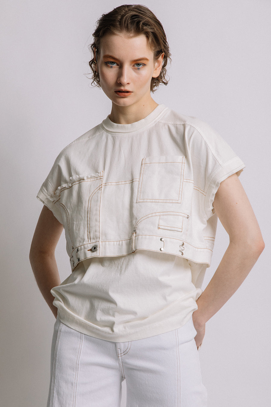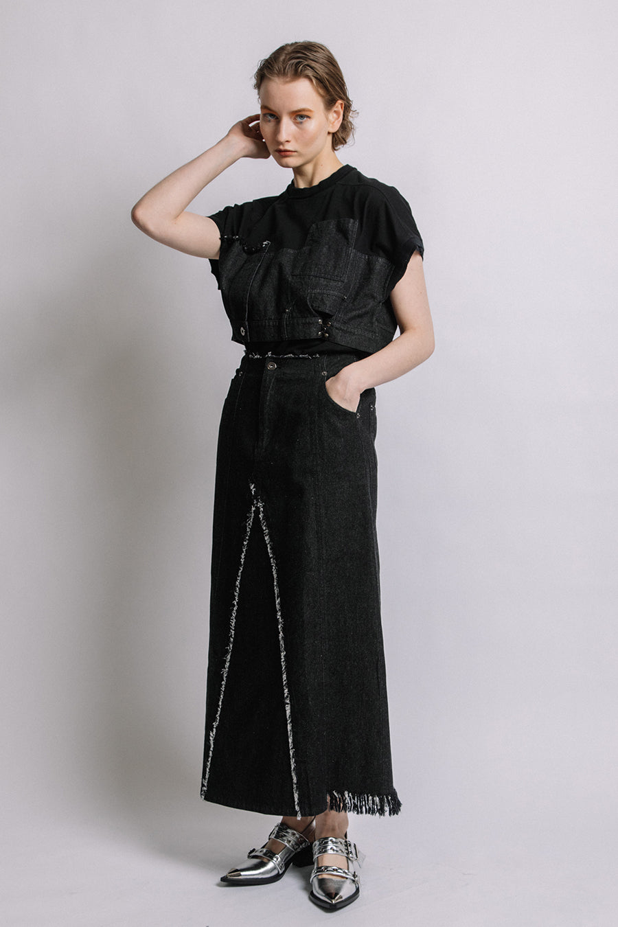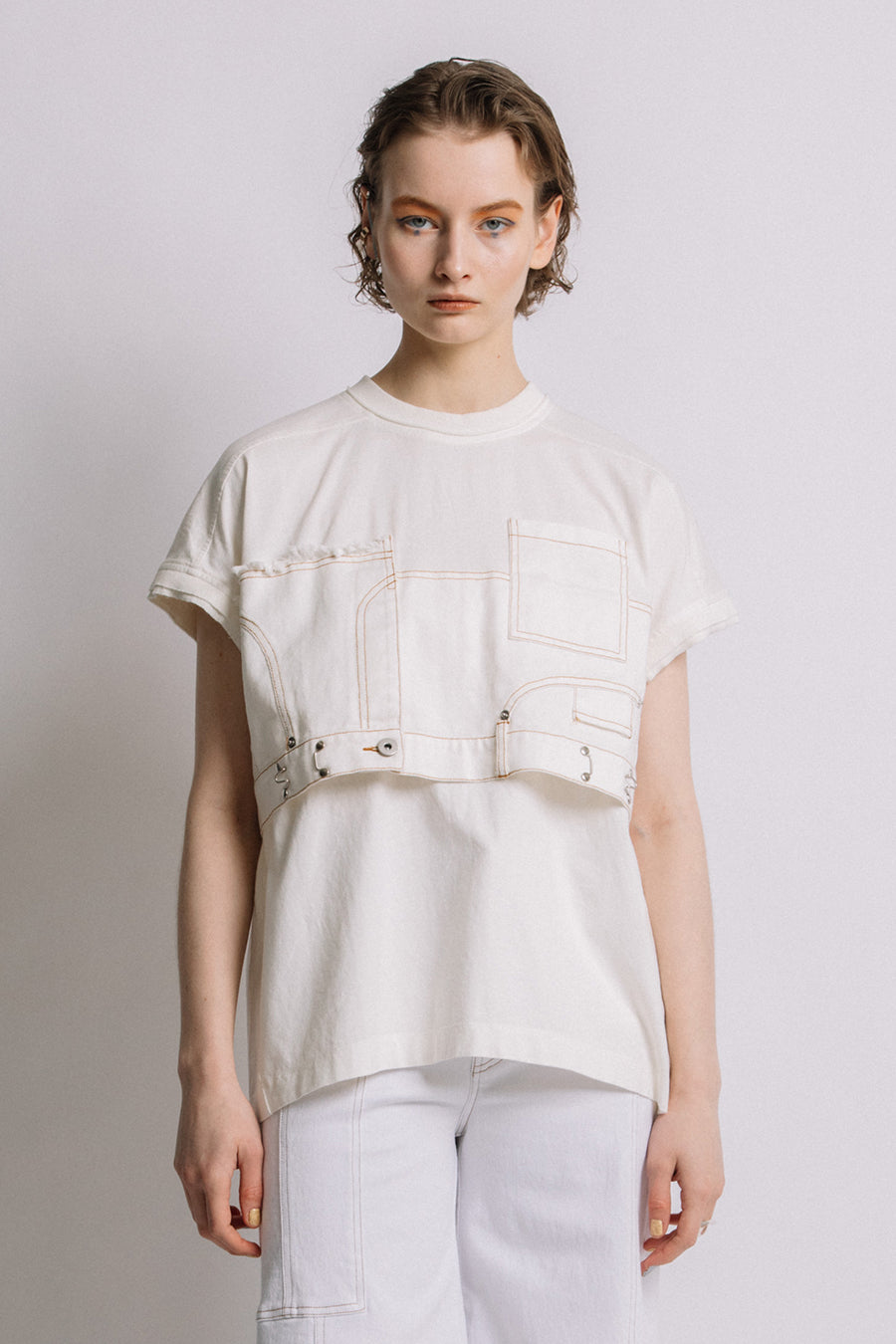 コットン天竺とライトオンスデニムのアシンメトリーコンビTシャツ。薄く軽やかなコットン天竺素材とライトオンスデニムを使用し、春先のインナーとしても、真夏のトップスとしても着用可能。デニムは加工を施し、柔らかく、ヴィンテージライクな風合いに仕上げ、アシンメトリーに施したフリンジもポイントに。デニムのウエスト箇所の前後ホックを留めるとレディライクなフレアシルエットに変わり、ウエストが絞られることでスタイルアップ効果も◎スタイリングによって好みのシルエットを楽しめます。着丈はヒップにかかる設定なので腰回りを、フレンチスリーブは長めの設定で二の腕をカバーしてくれるのも嬉しいポイント。