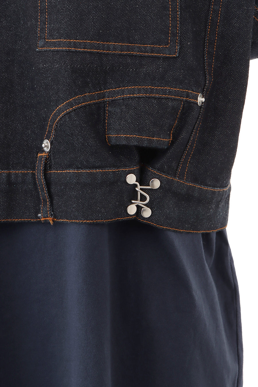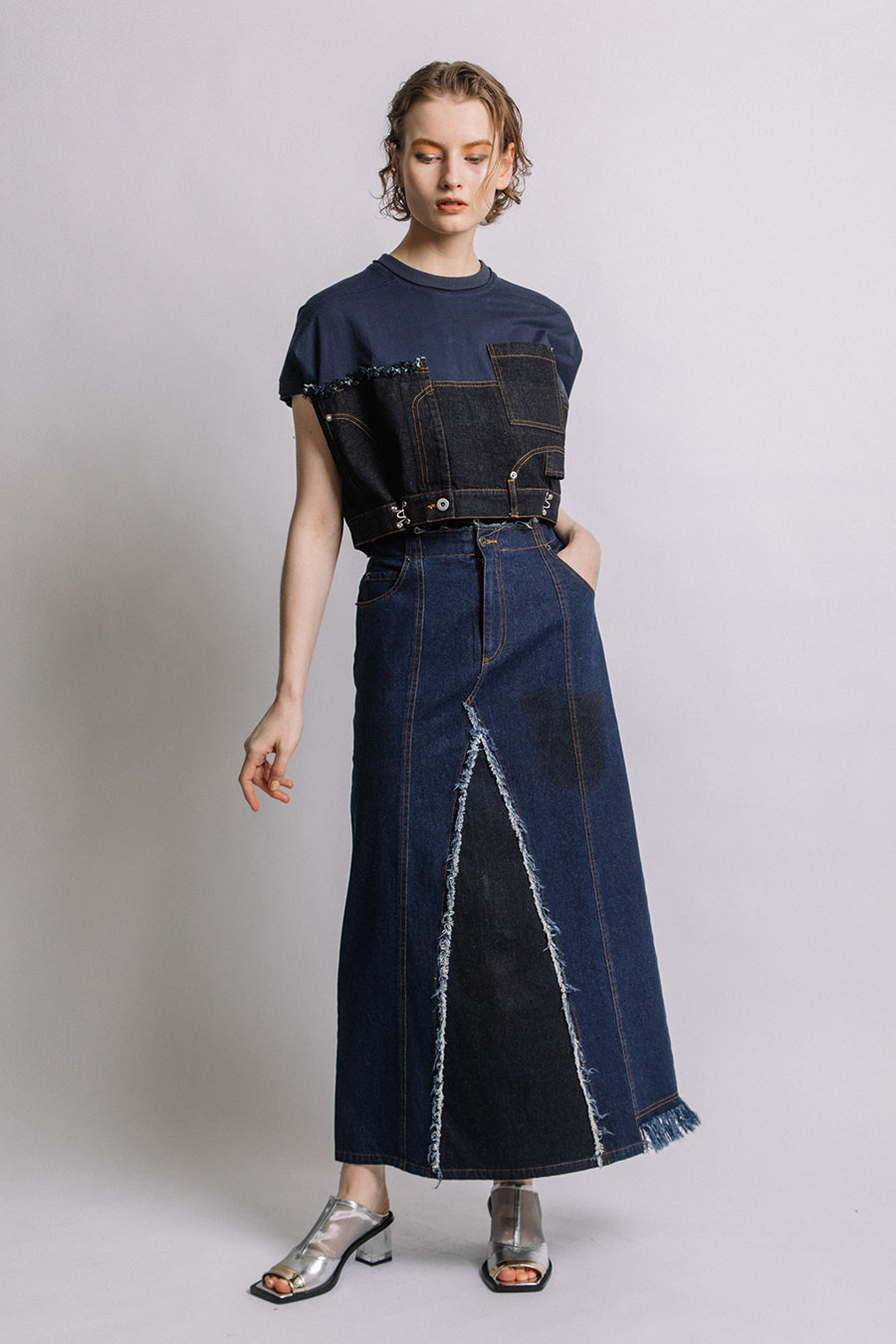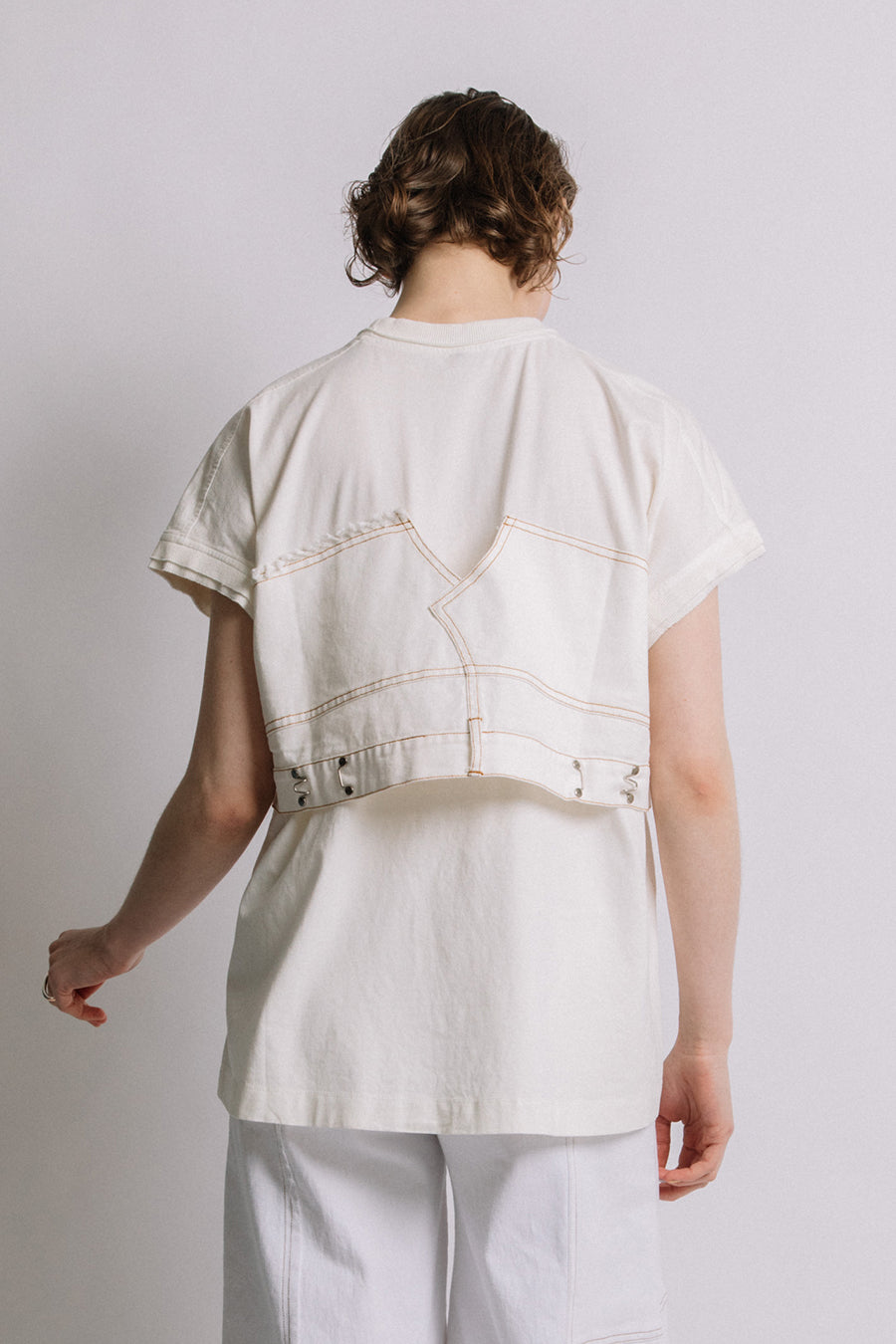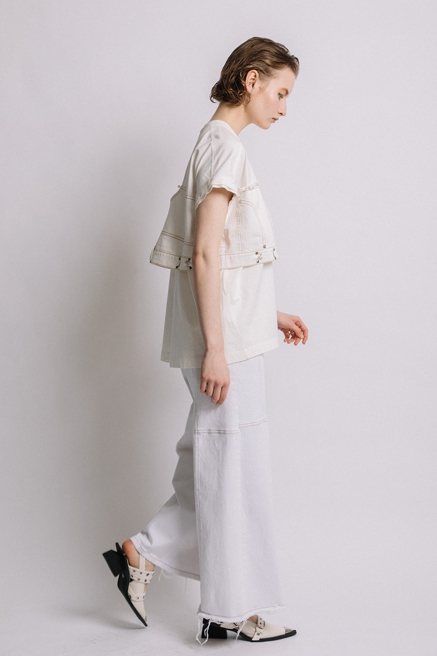コットン天竺とライトオンスデニムのアシンメトリーコンビTシャツ。薄く軽やかなコットン天竺素材とライトオンスデニムを使用し、春先のインナーとしても、真夏のトップスとしても着用可能。デニムは加工を施し、柔らかく、ヴィンテージライクな風合いに仕上げ、アシンメトリーに施したフリンジもポイントに。デニムのウエスト箇所の前後ホックを留めるとレディライクなフレアシルエットに変わり、ウエストが絞られることでスタイルアップ効果も◎スタイリングによって好みのシルエットを楽しめます。着丈はヒップにかかる設定なので腰回りを、フレンチスリーブは長めの設定で二の腕をカバーしてくれるのも嬉しいポイント。