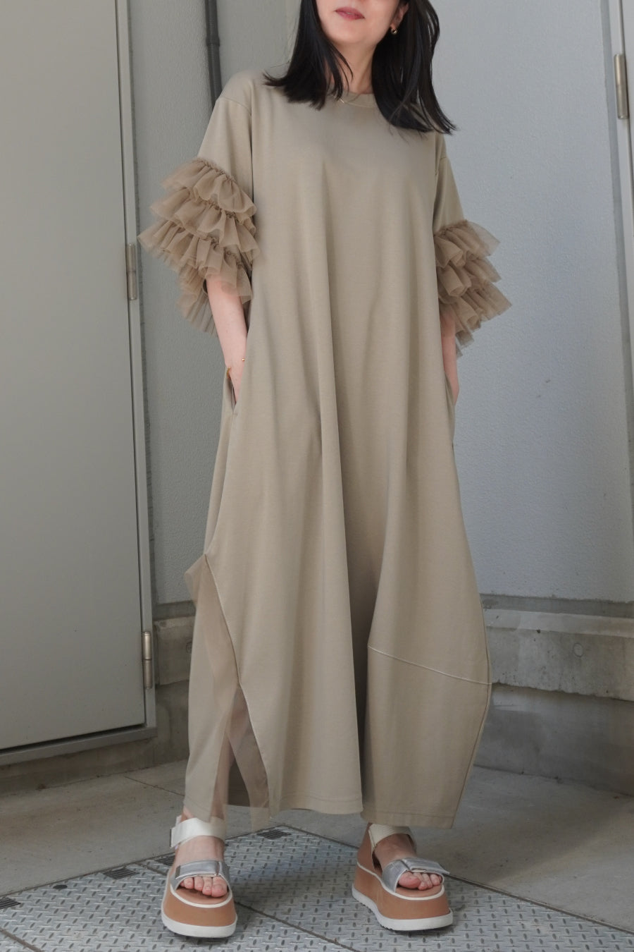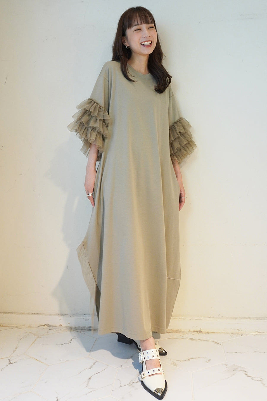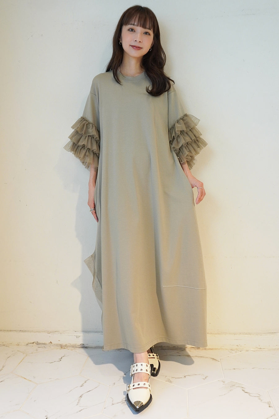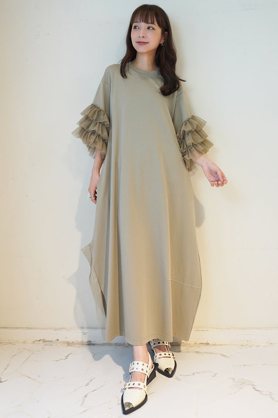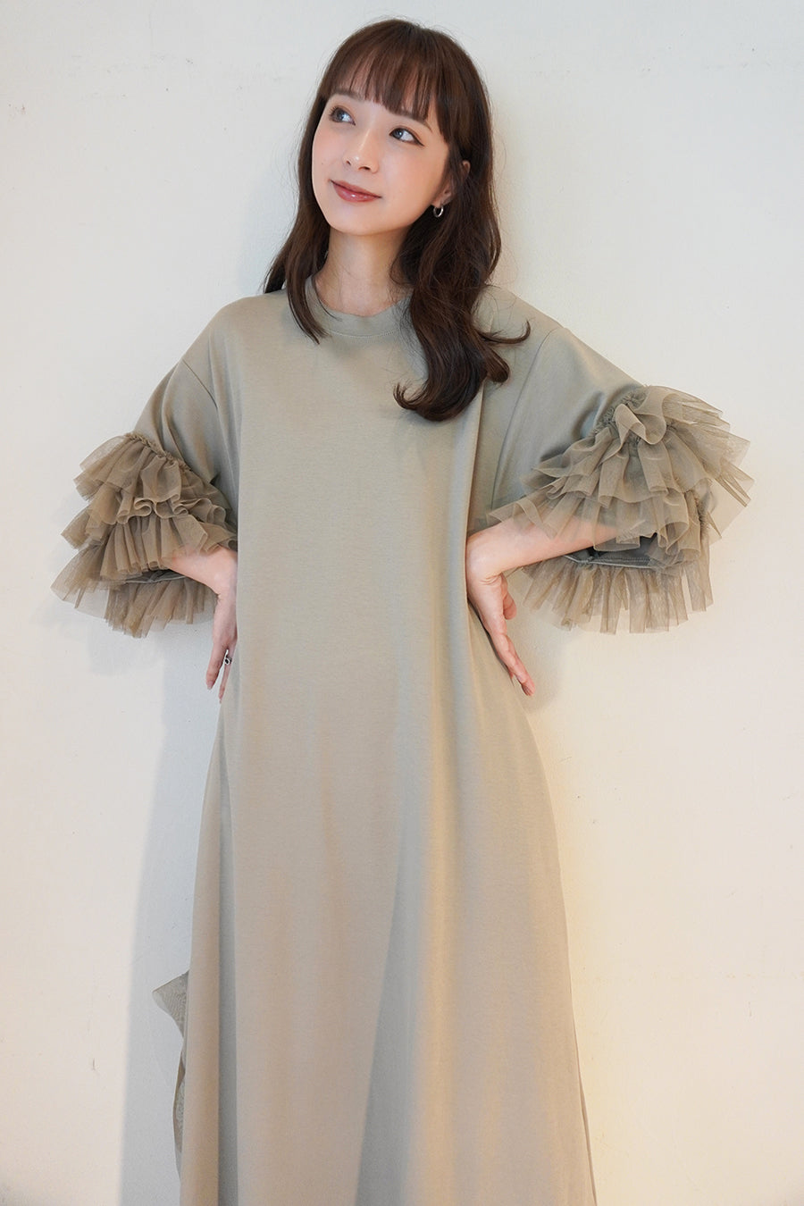 チュールを3段フリルにした袖がポイントの、ビックシルエットワンピース。