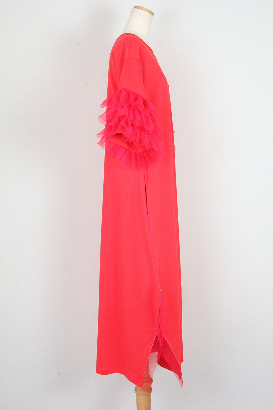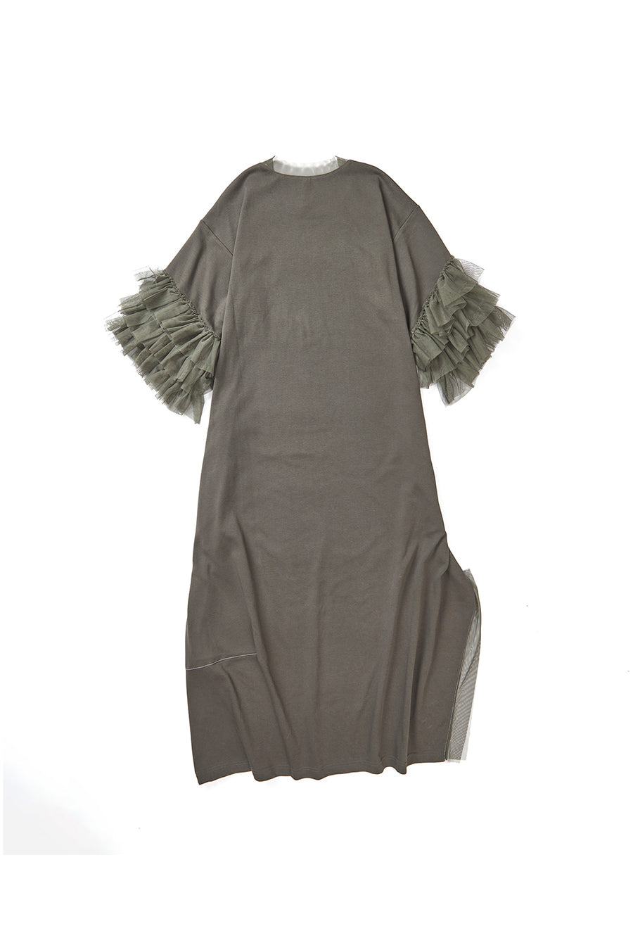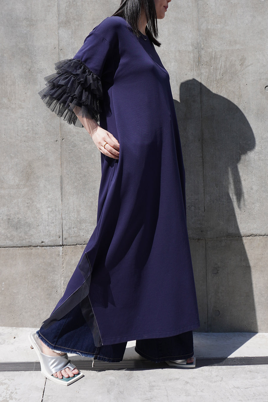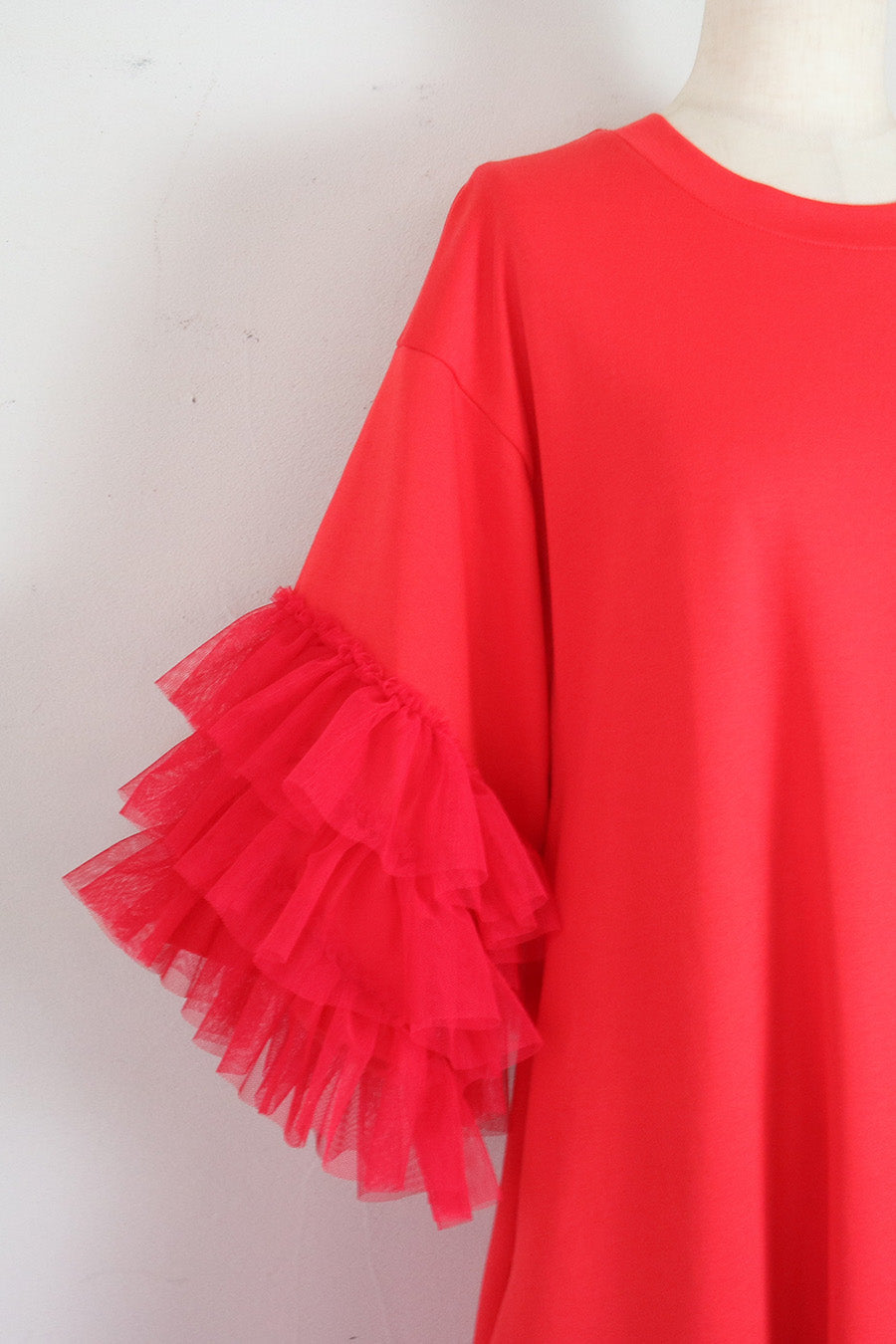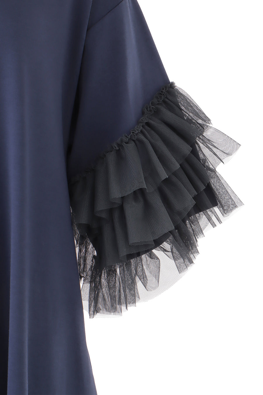 チュールを3段フリルにした袖がポイントの、ビックシルエットワンピース。
