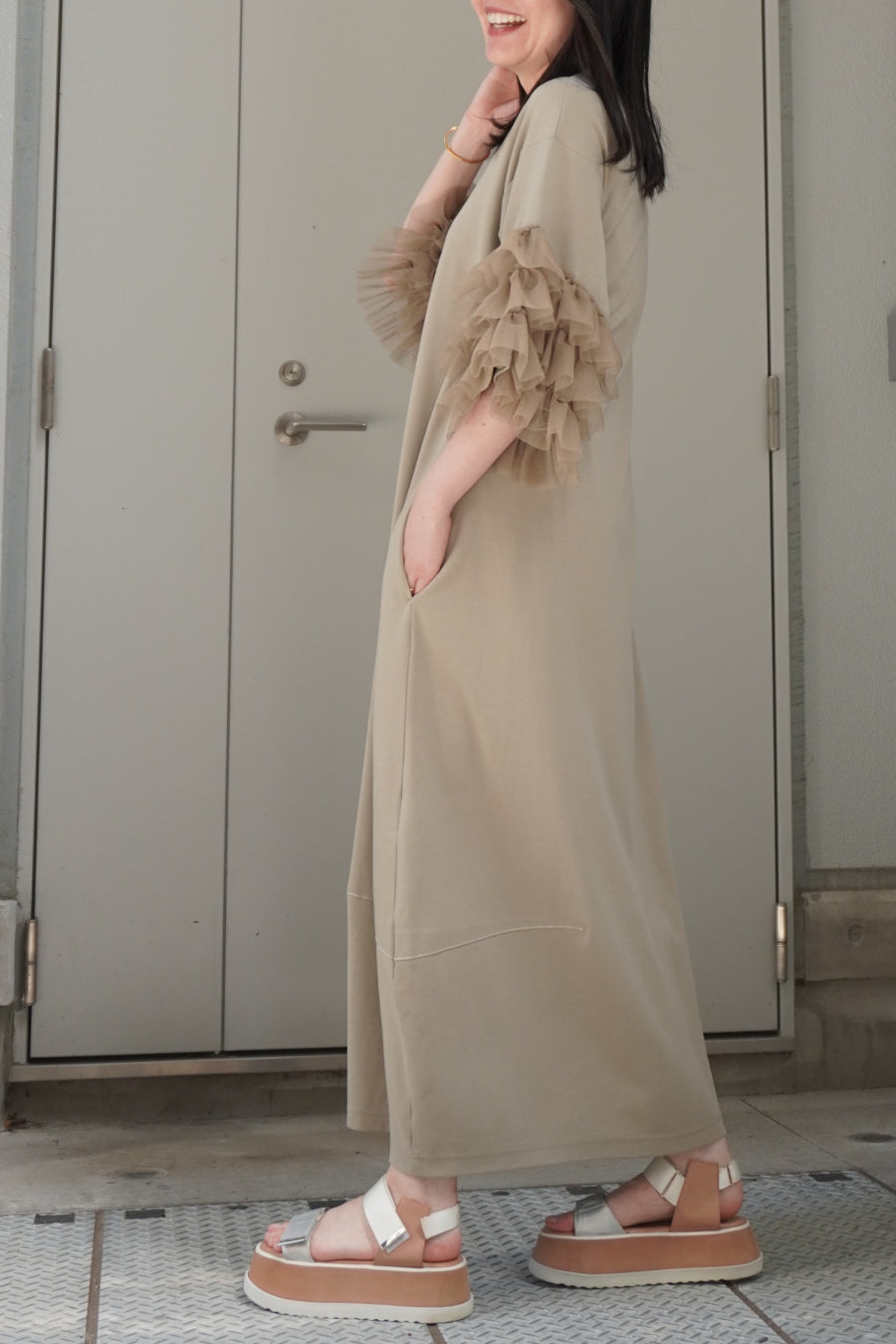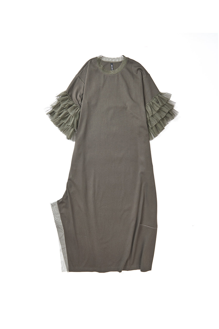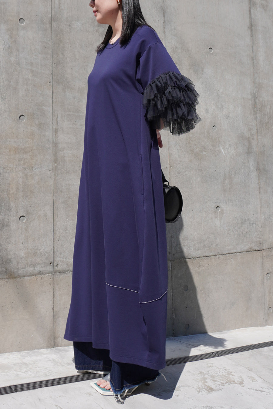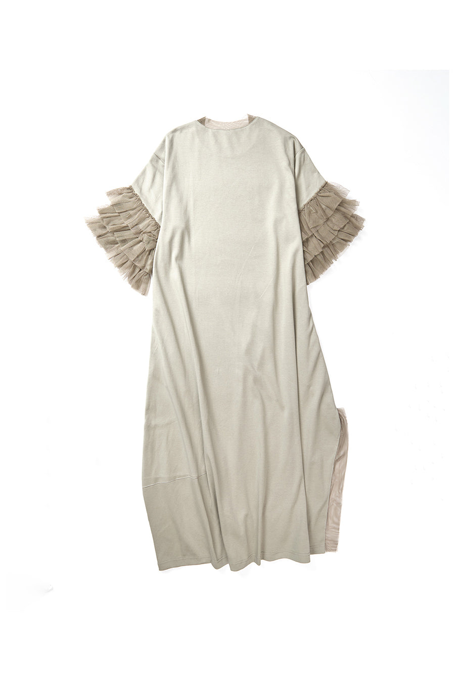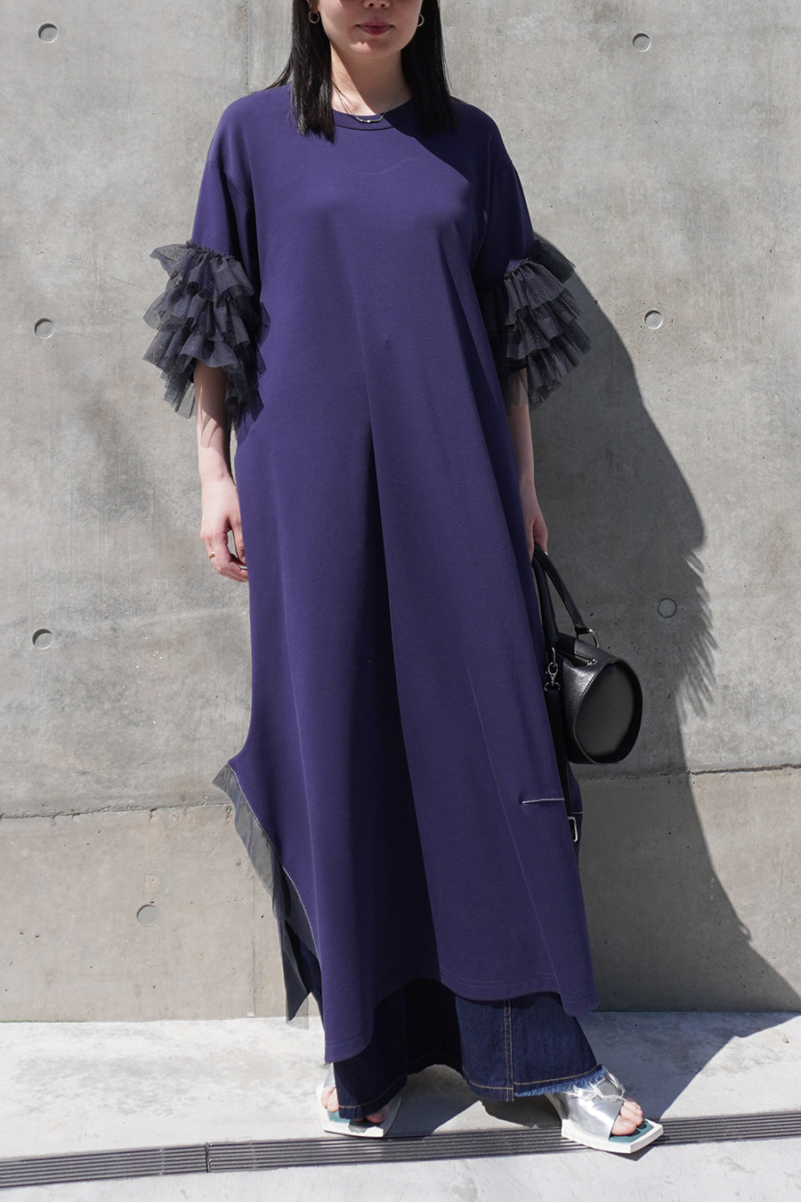 チュールを3段フリルにした袖がポイントの、ビックシルエットワンピース。