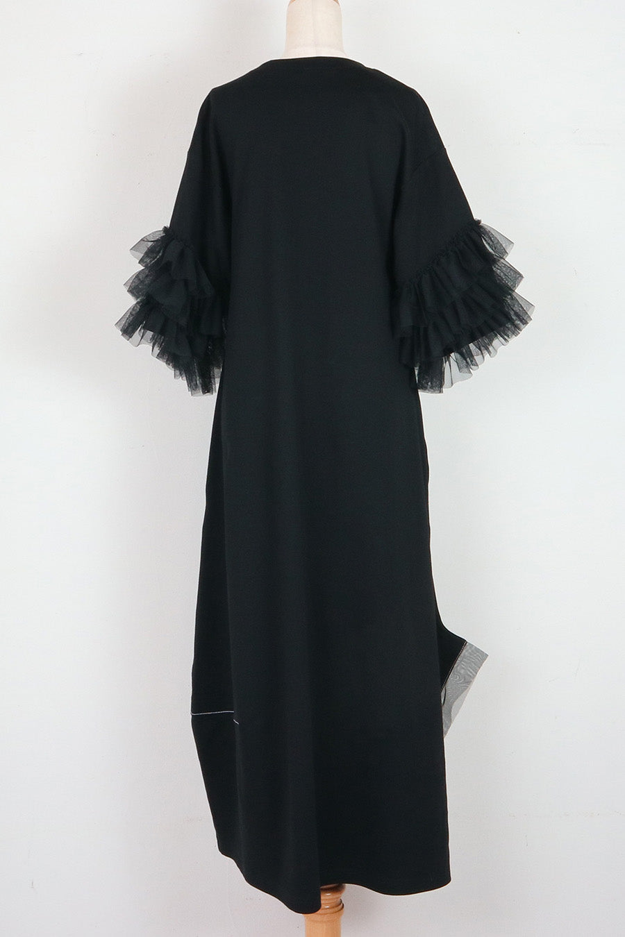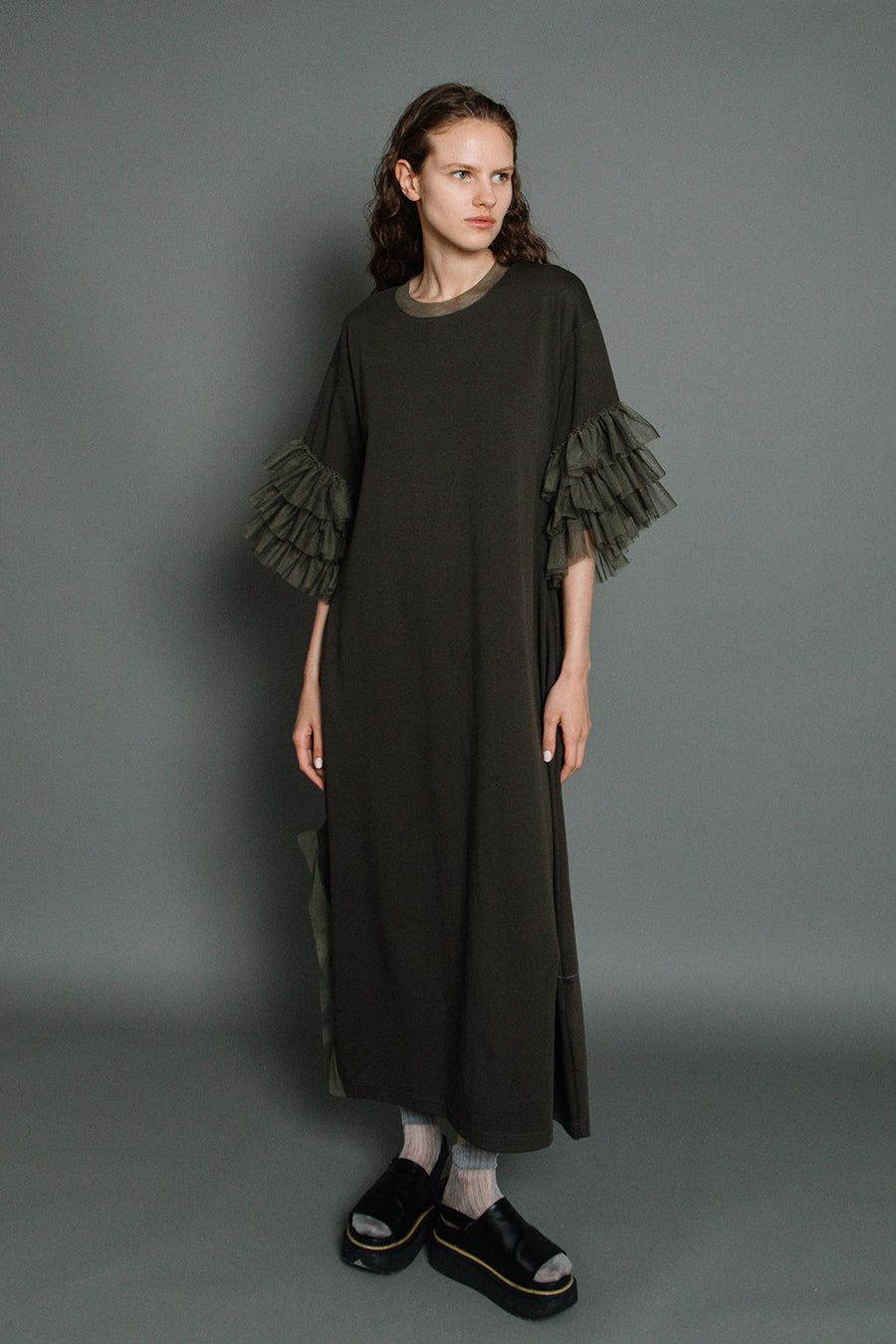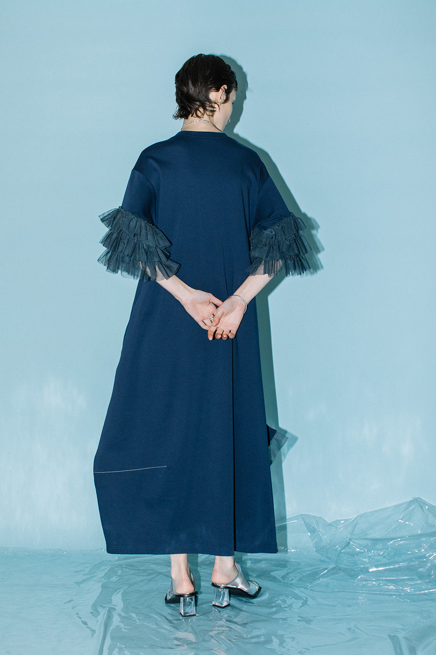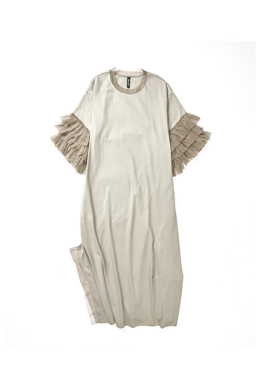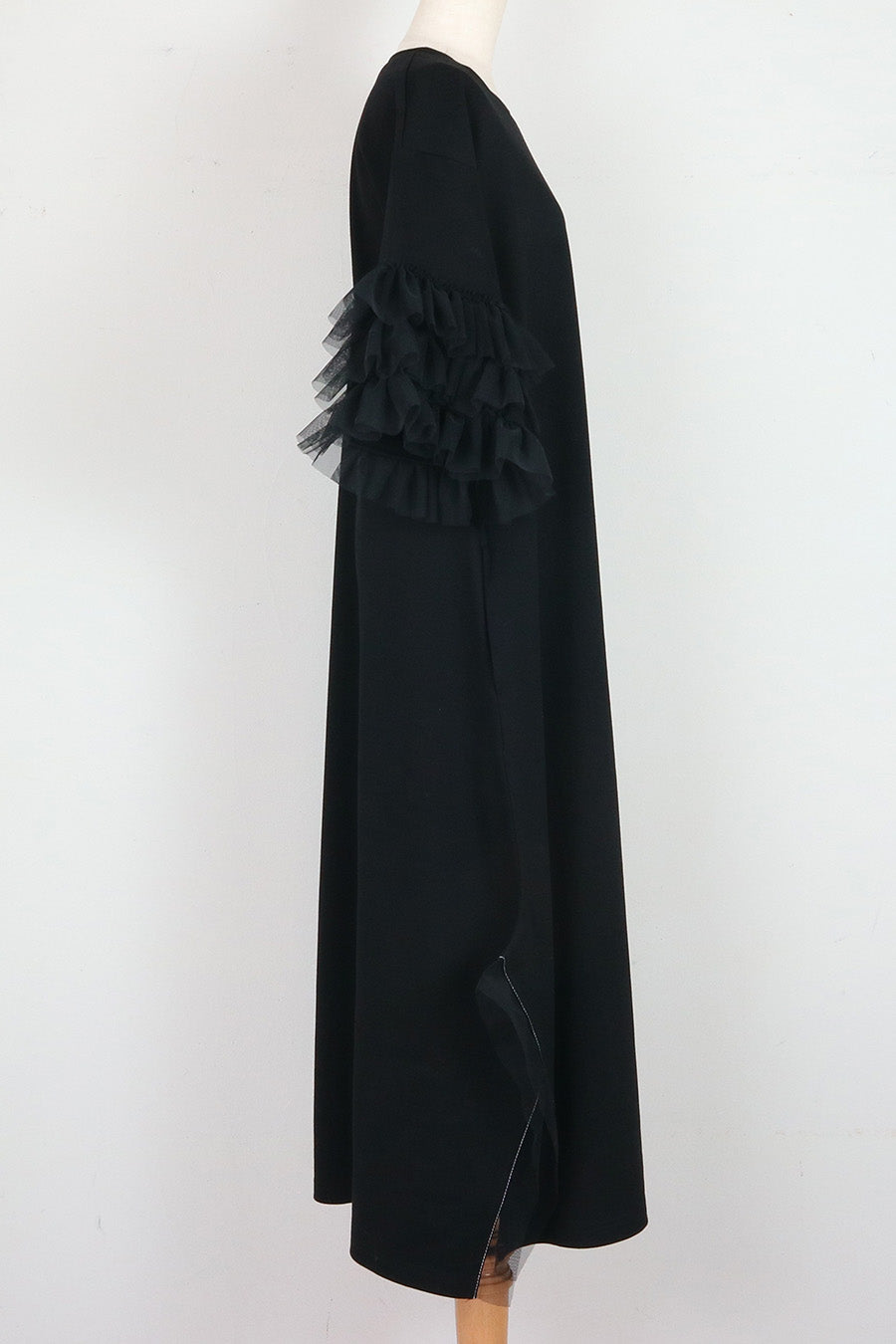 チュールを3段フリルにした袖がポイントの、ビックシルエットワンピース。