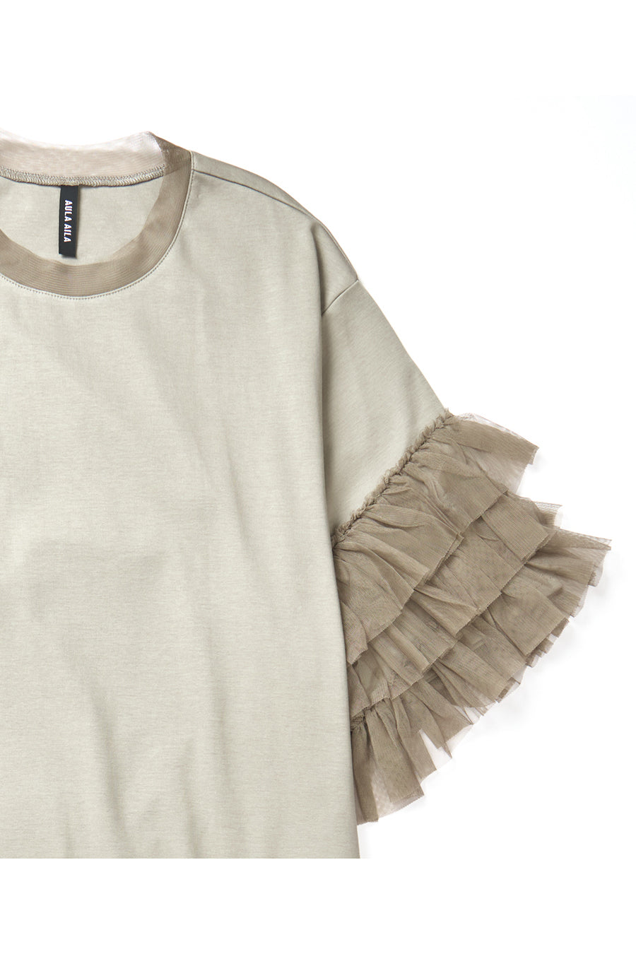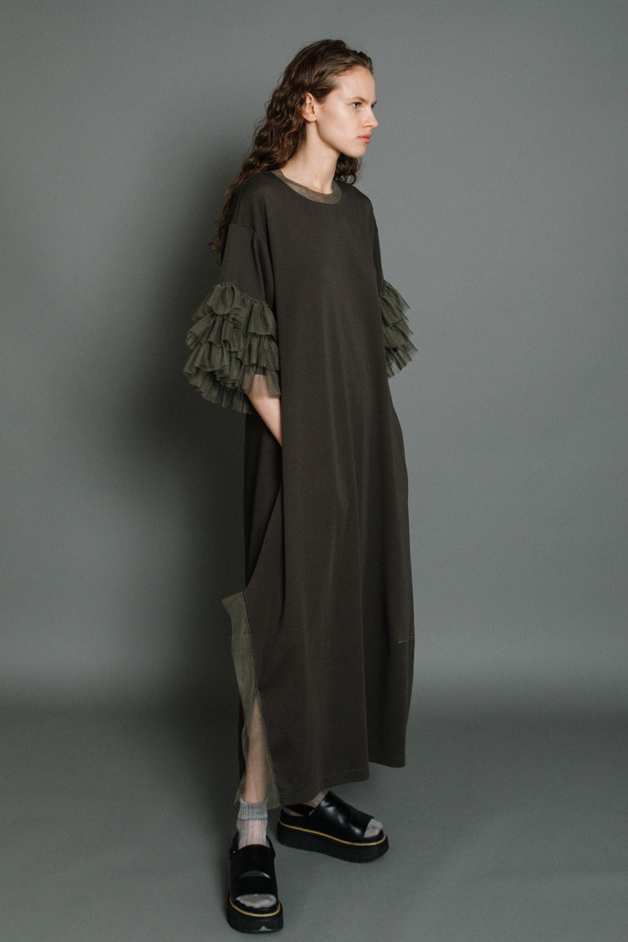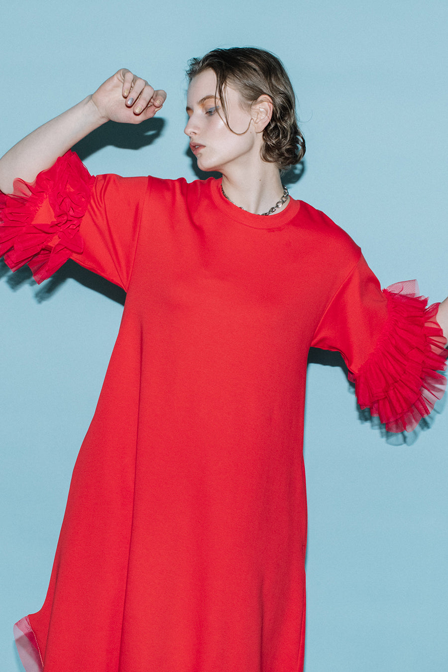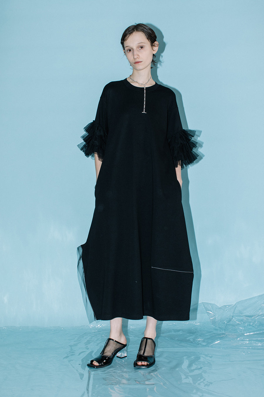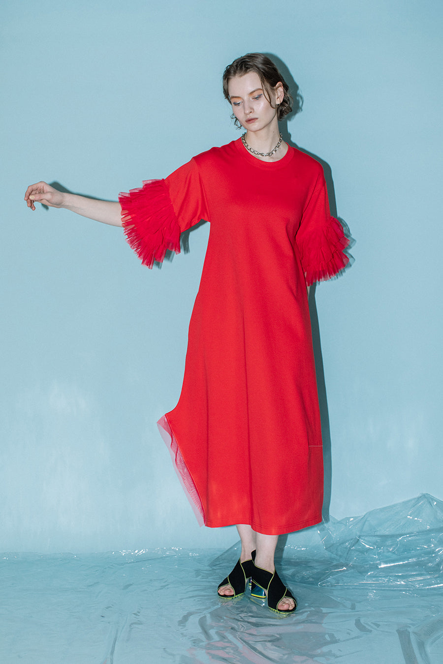 チュールを3段フリルにした袖がポイントの、ビックシルエットワンピース。