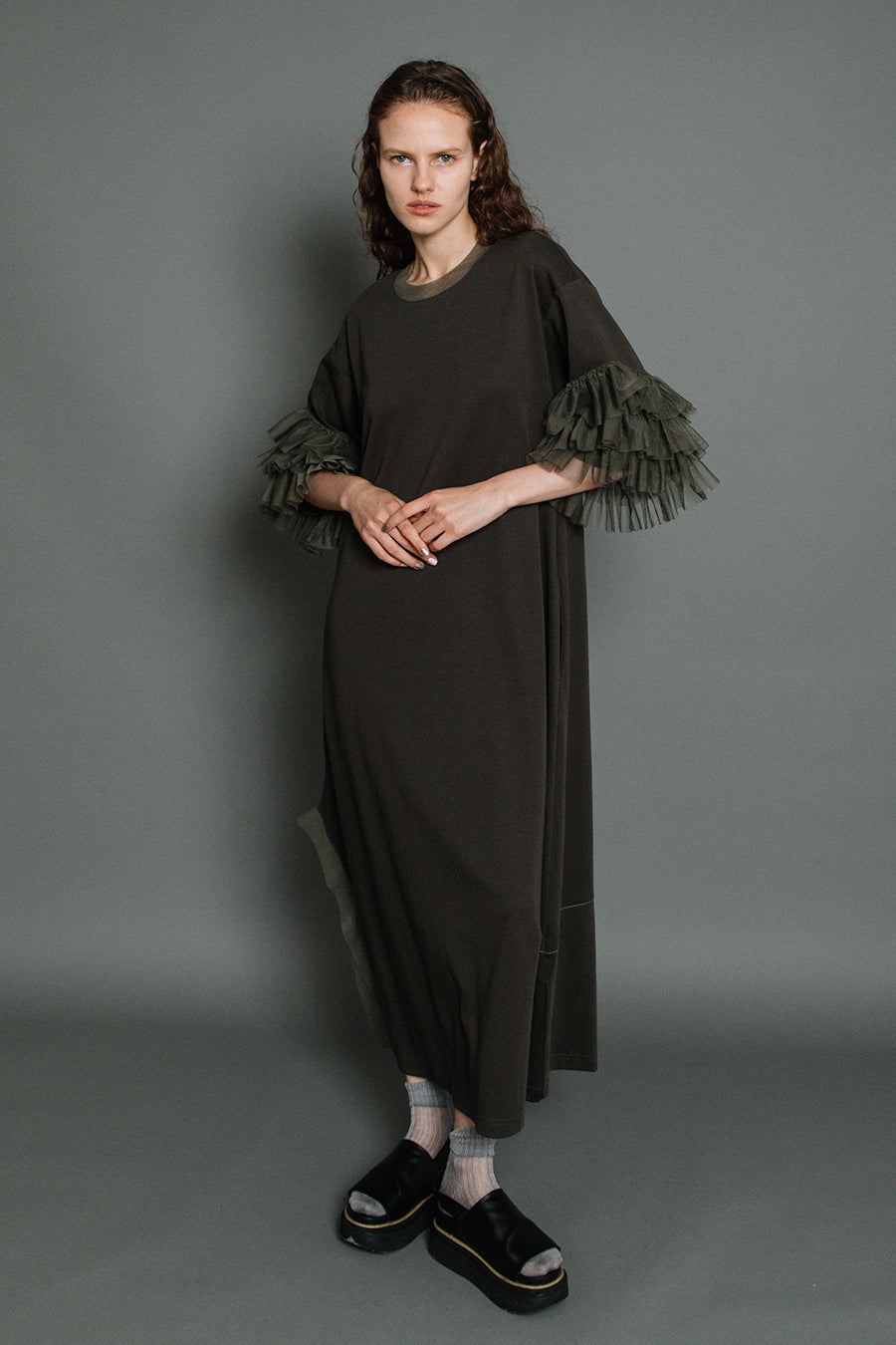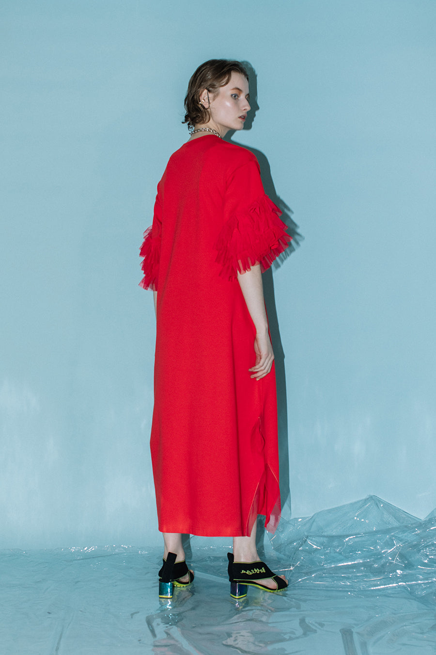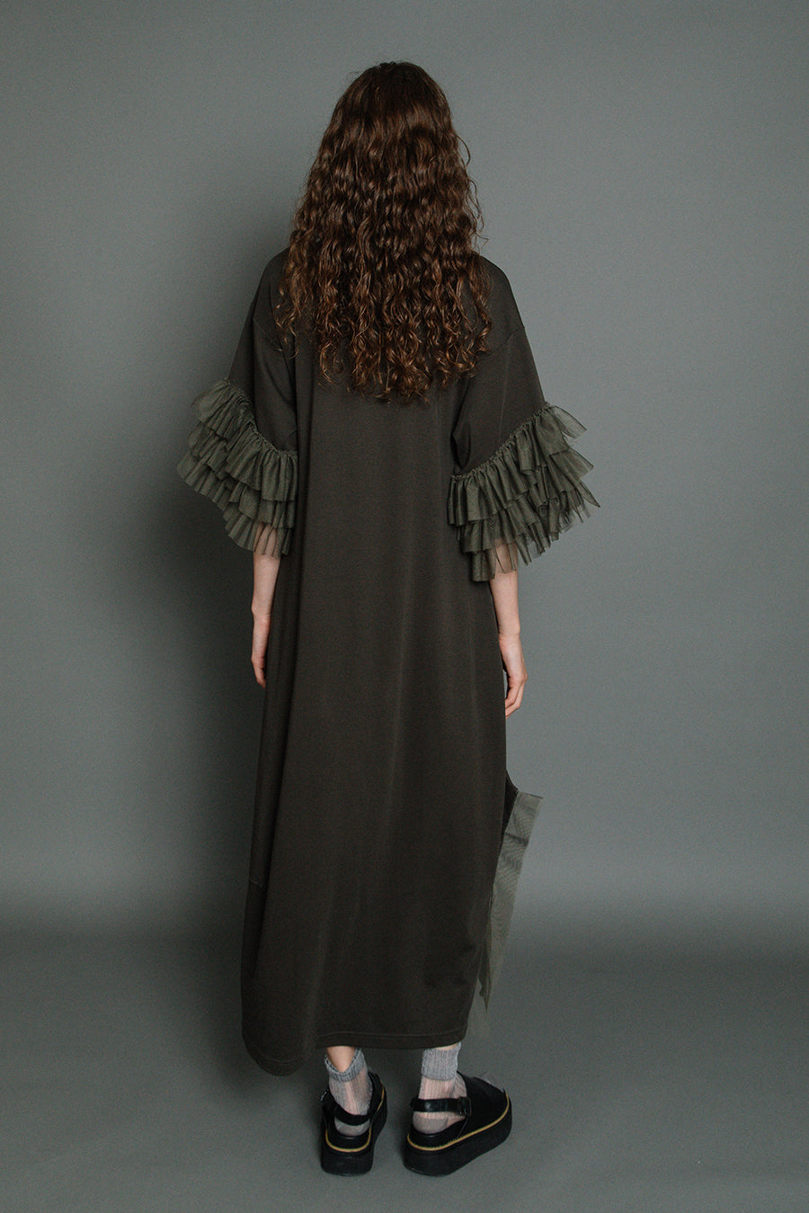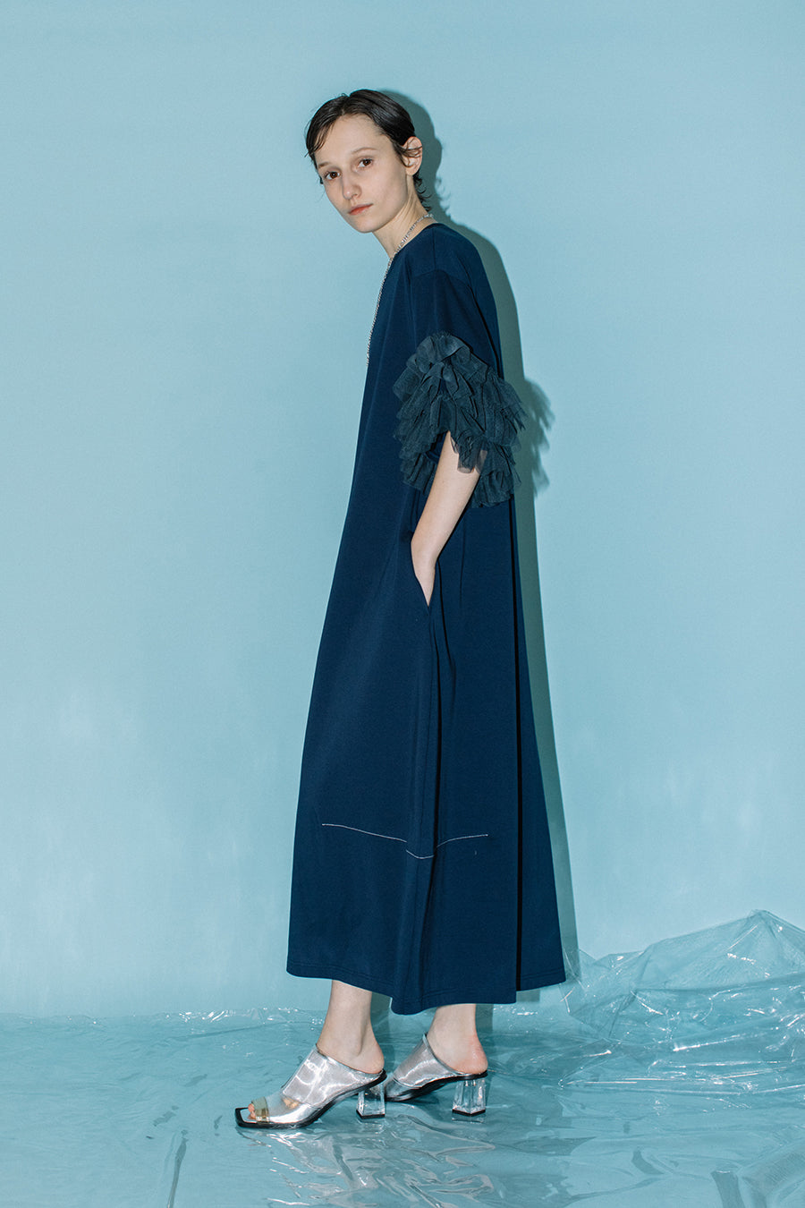 チュールを3段フリルにした袖がポイントの、ビックシルエットワンピース。