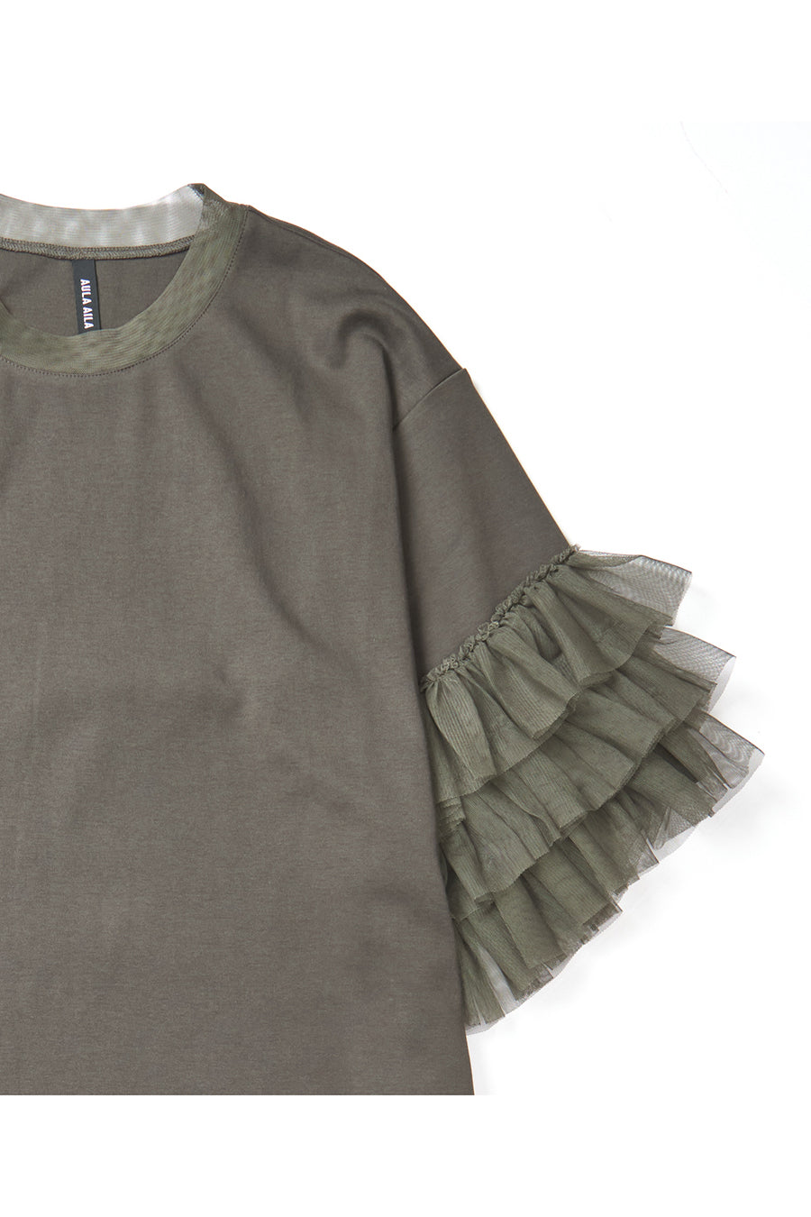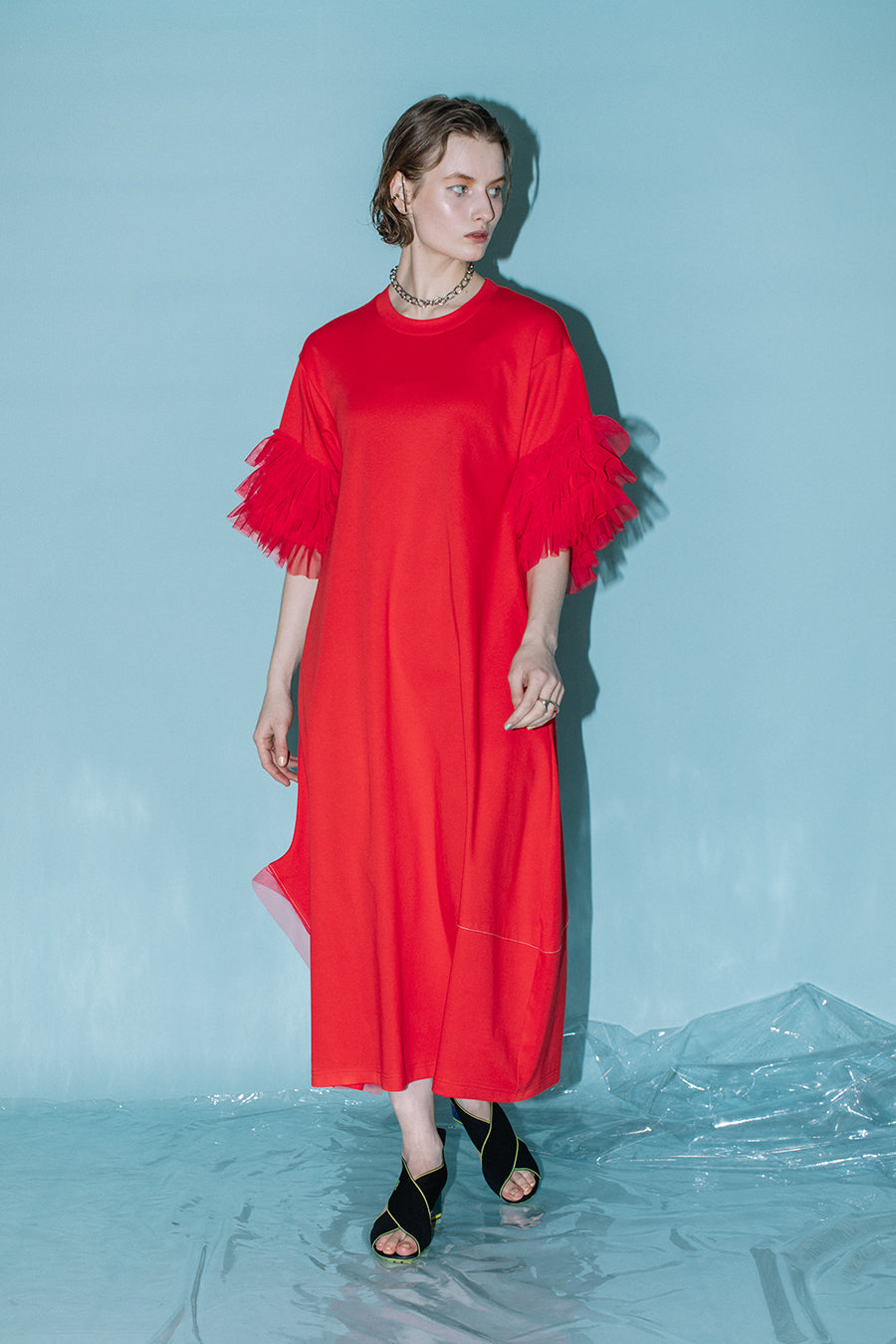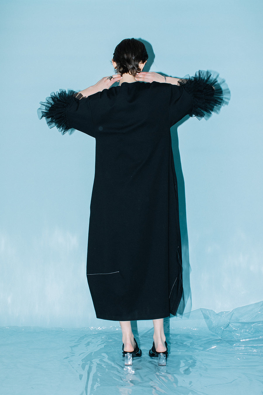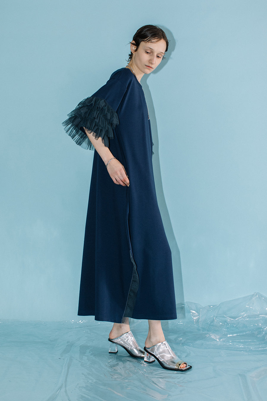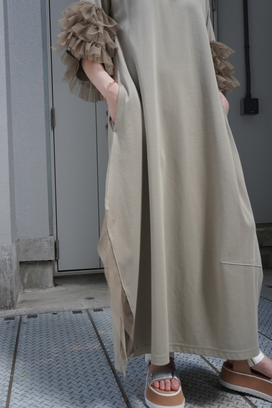 チュールを3段フリルにした袖がポイントの、ビックシルエットワンピース。