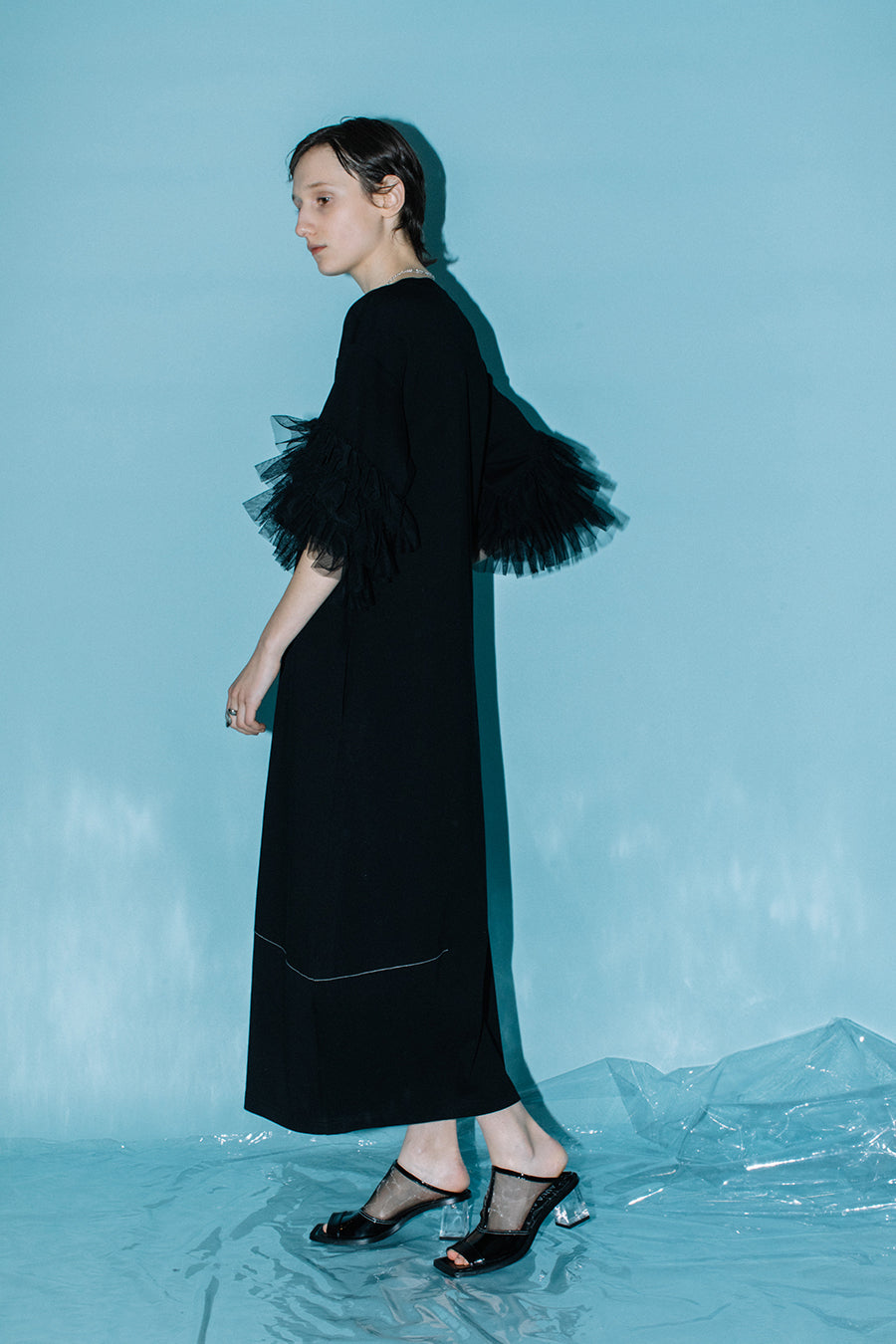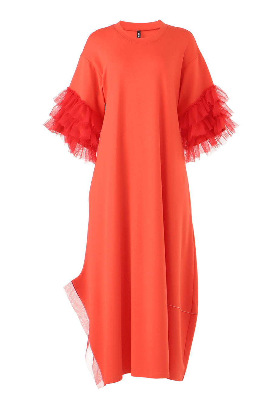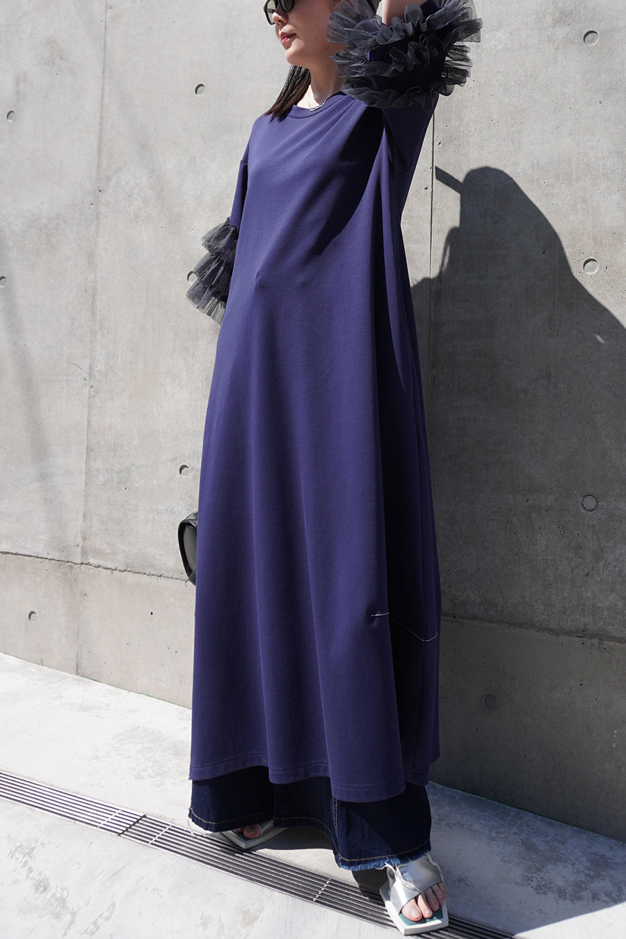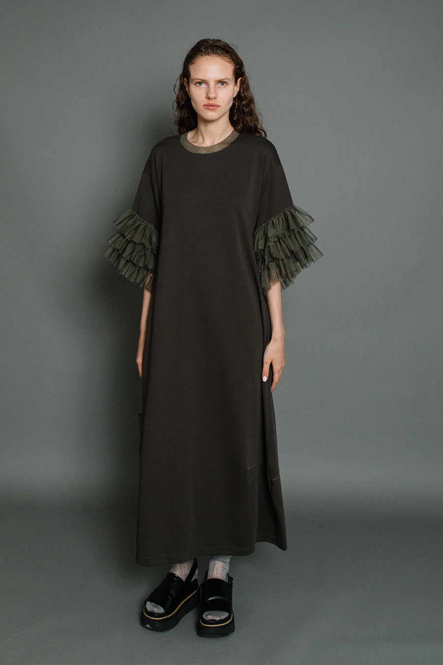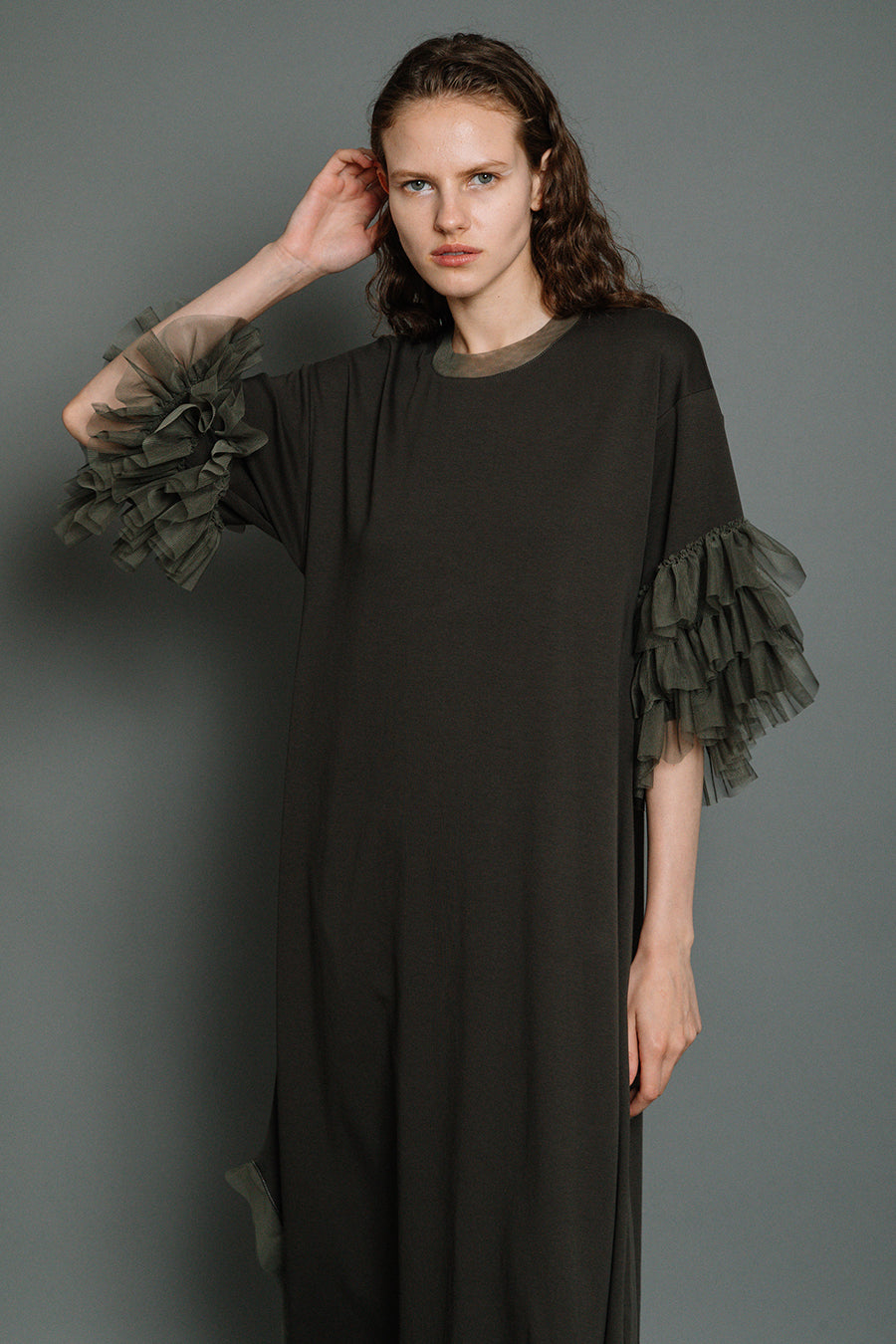 チュールを3段フリルにした袖がポイントの、ビックシルエットワンピース。