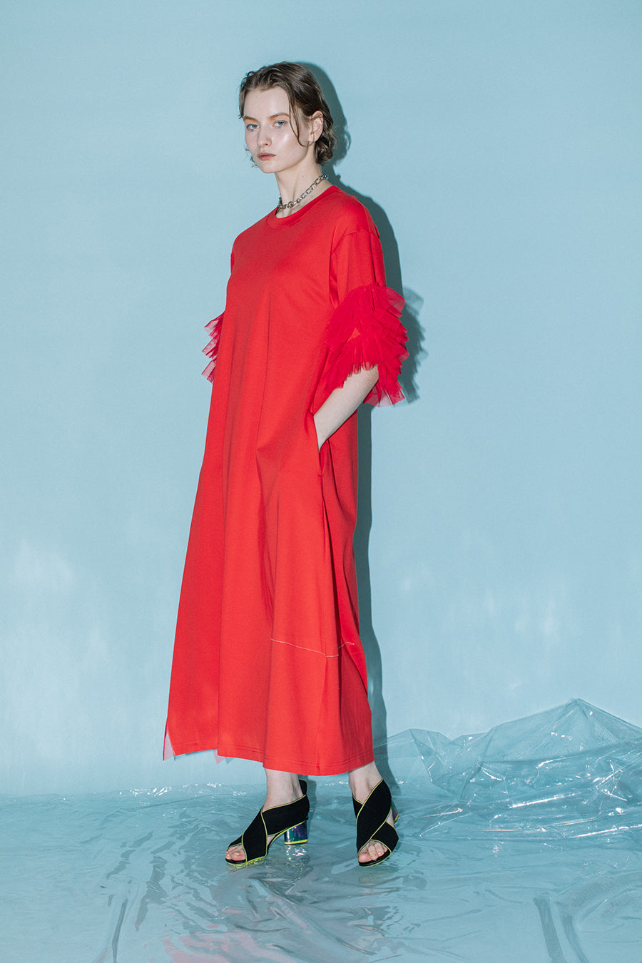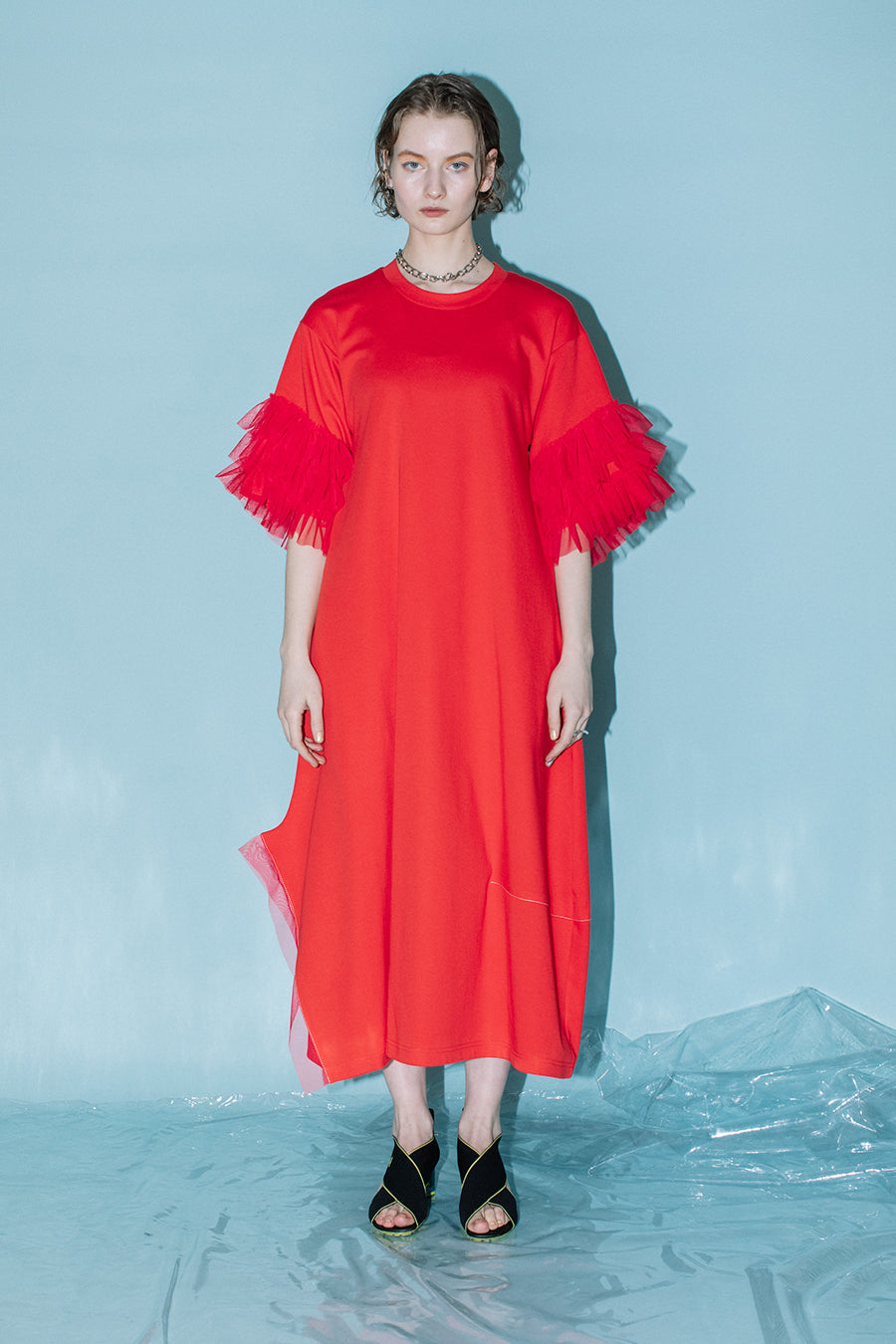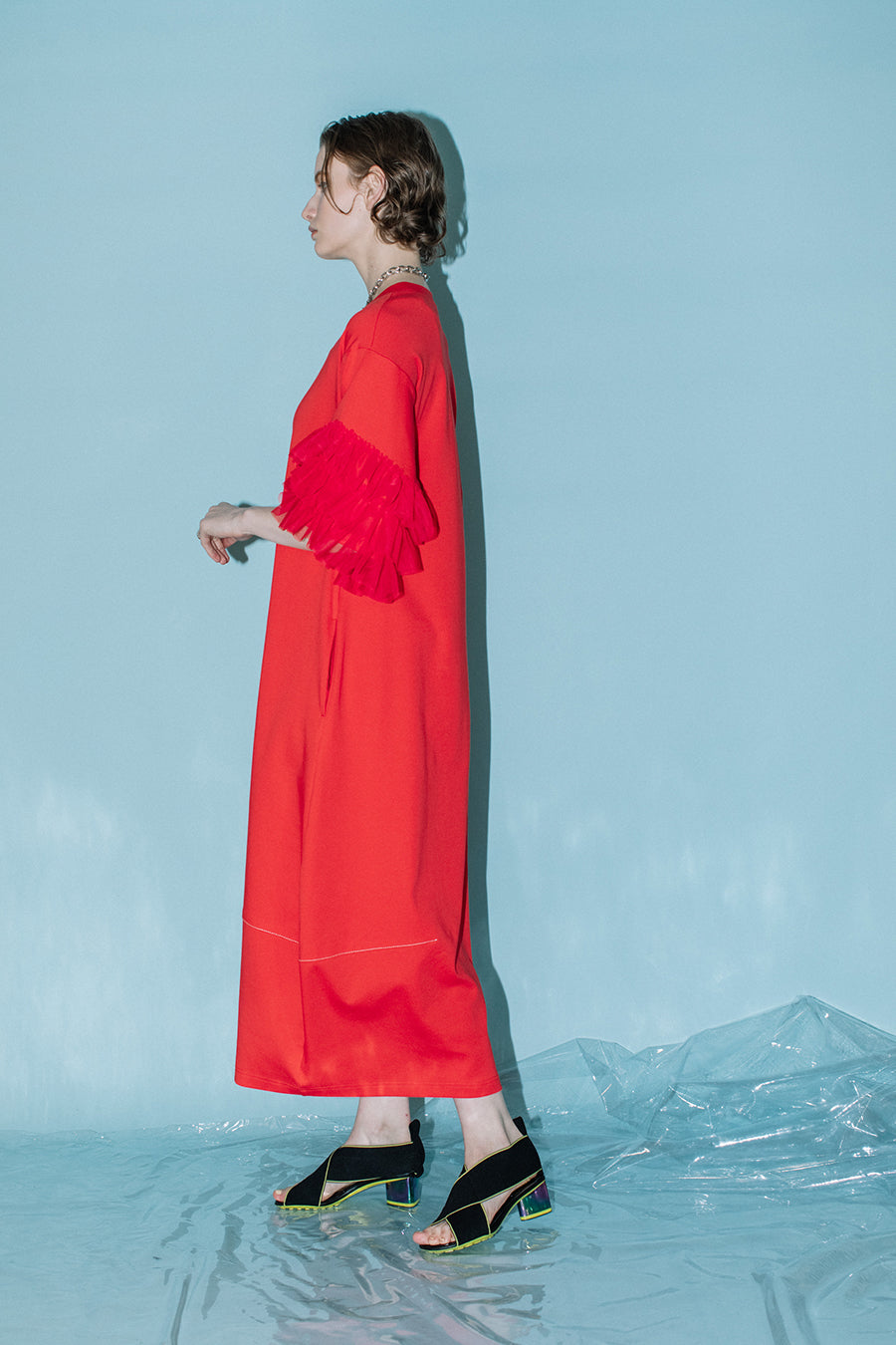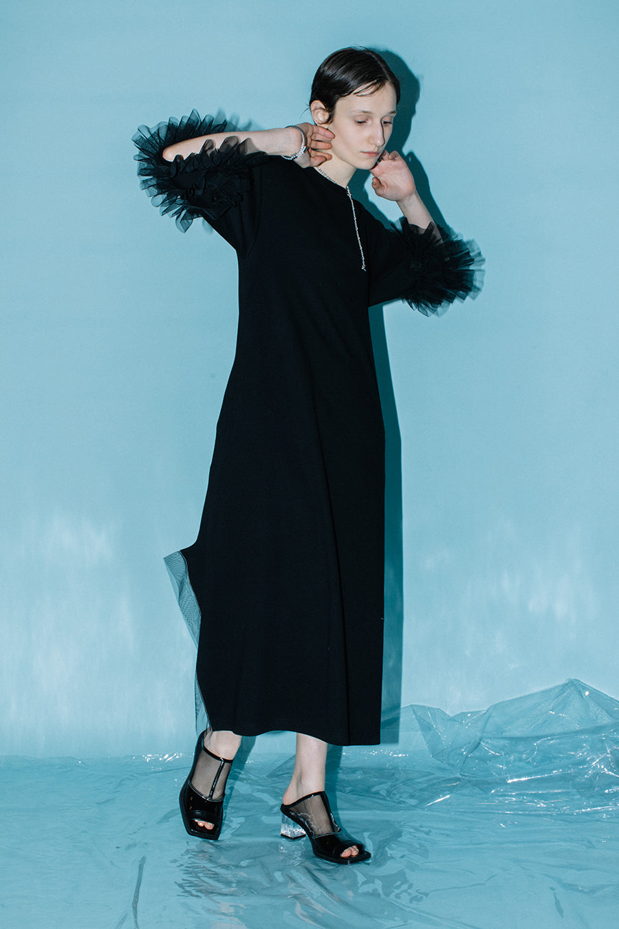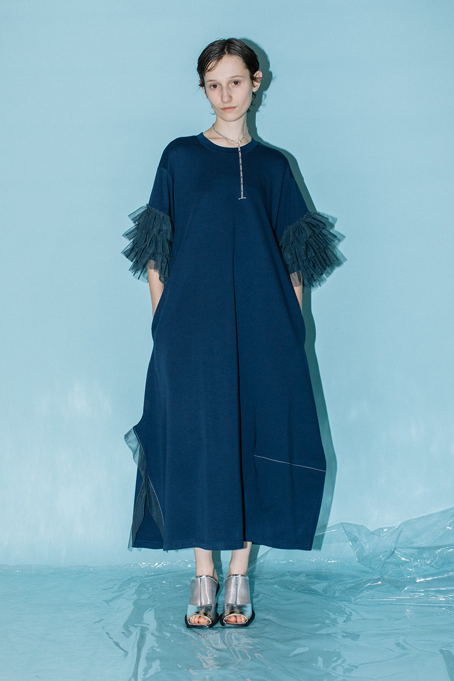 チュールを3段フリルにした袖がポイントの、ビックシルエットワンピース。