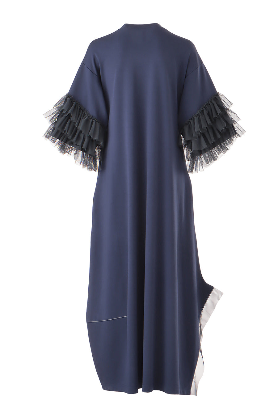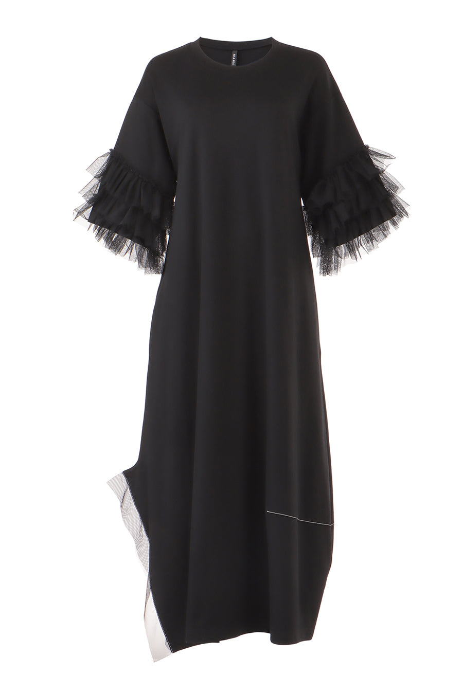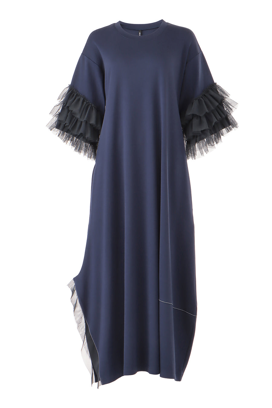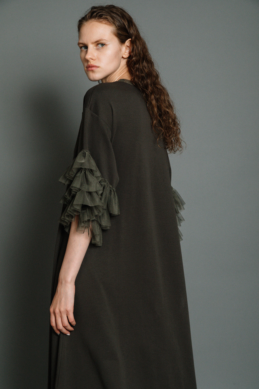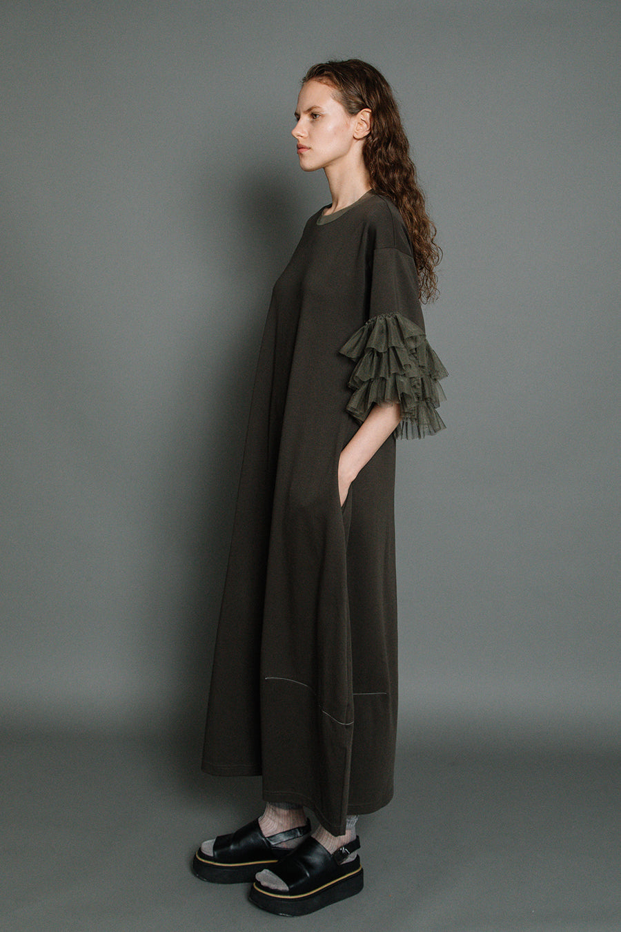 チュールを3段フリルにした袖がポイントの、ビックシルエットワンピース。