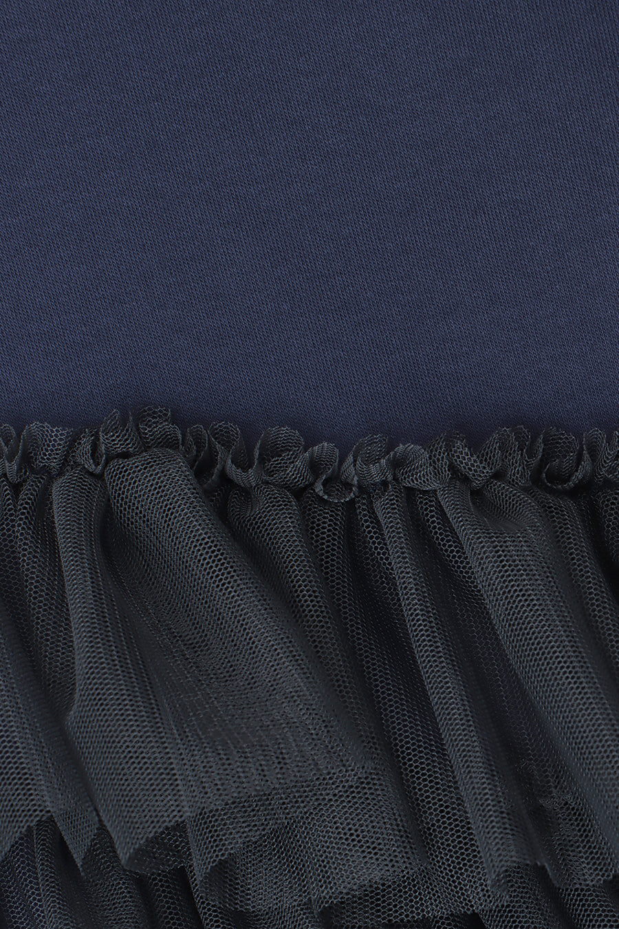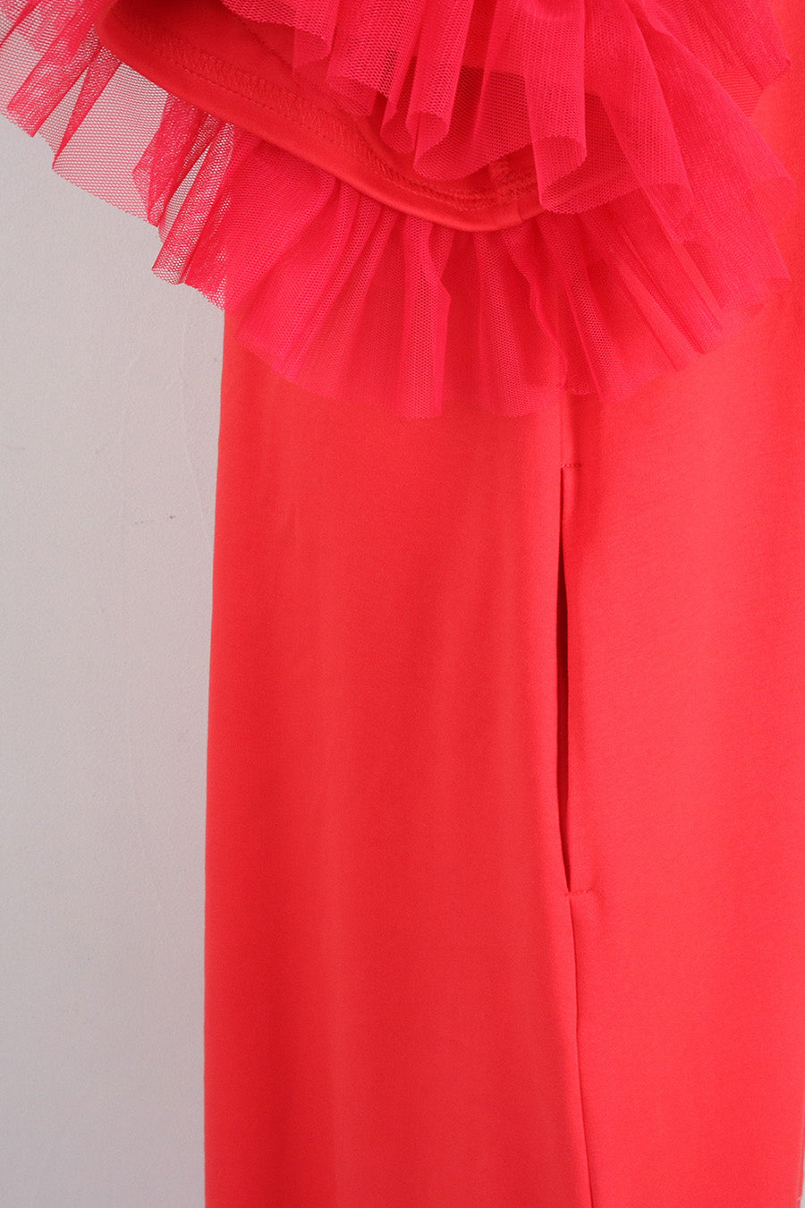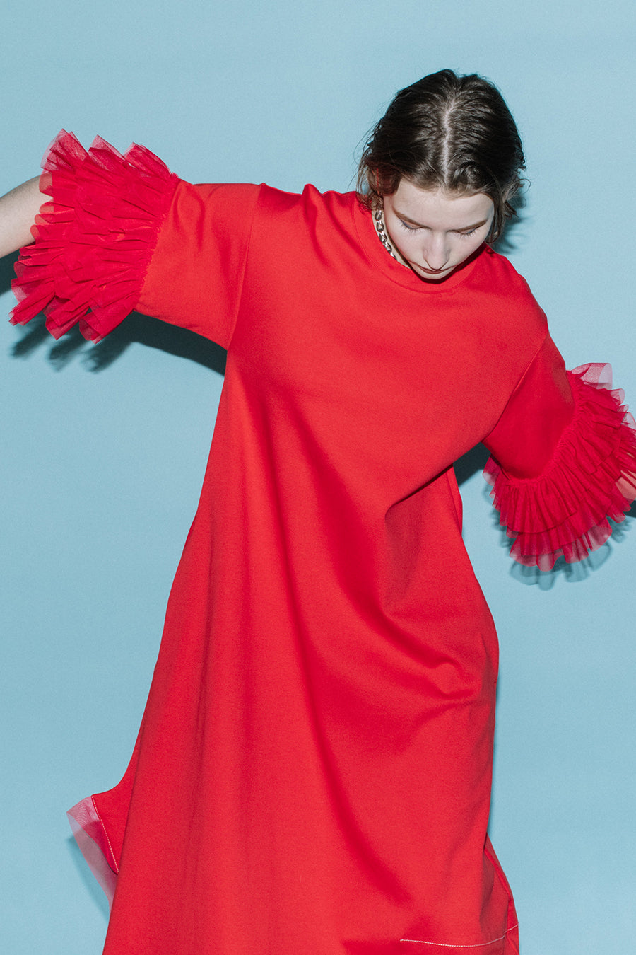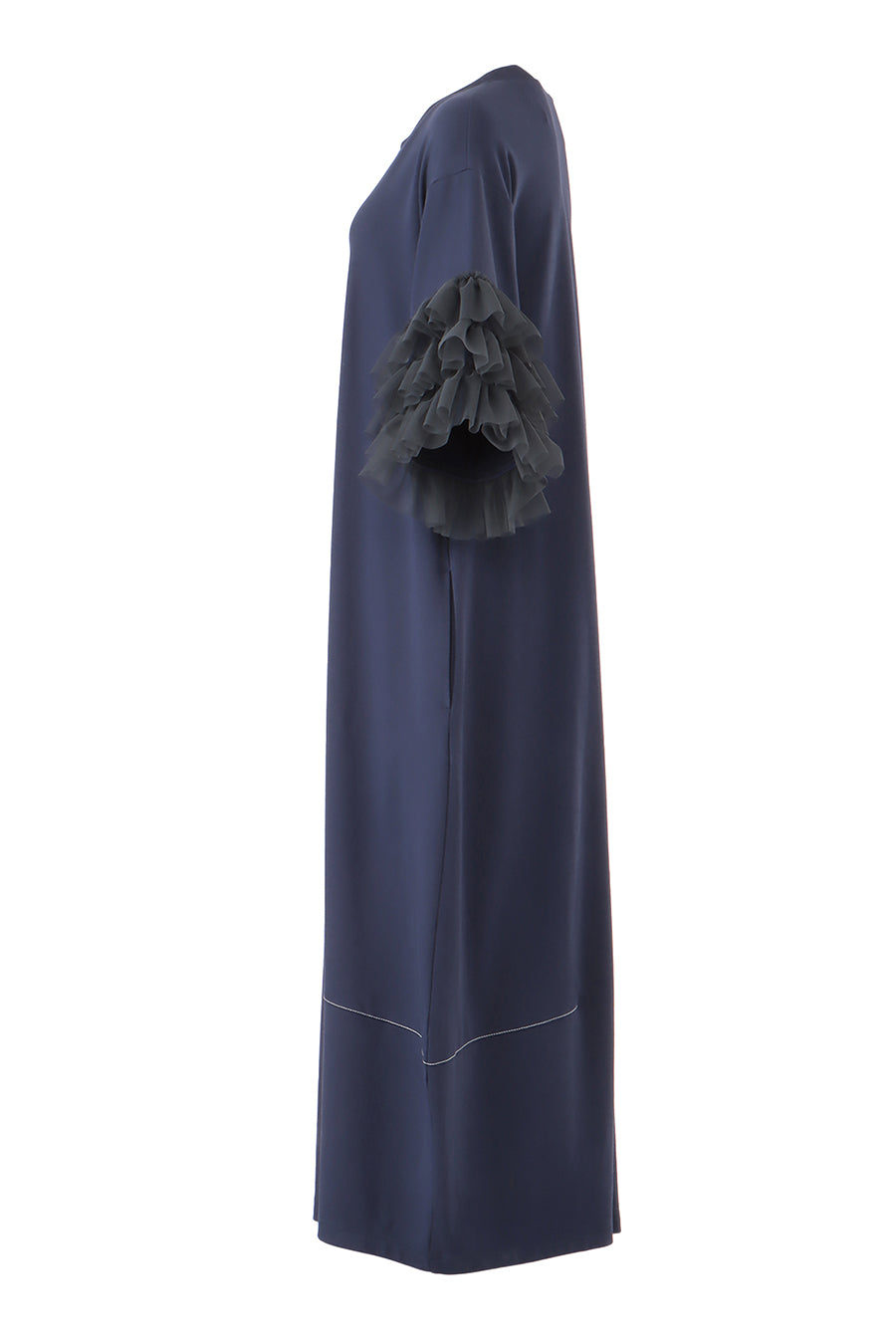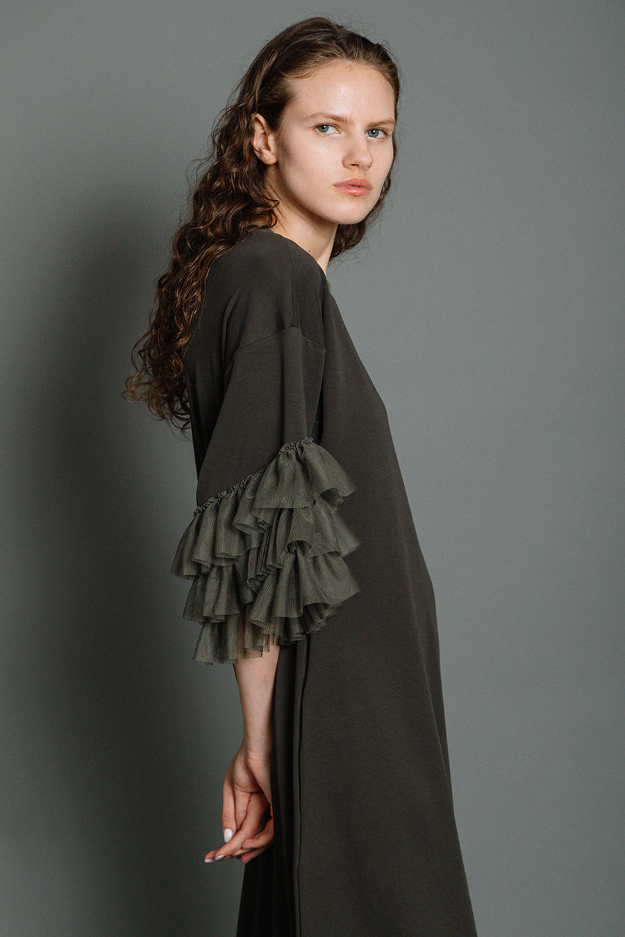 チュールを3段フリルにした袖がポイントの、ビックシルエットワンピース。
