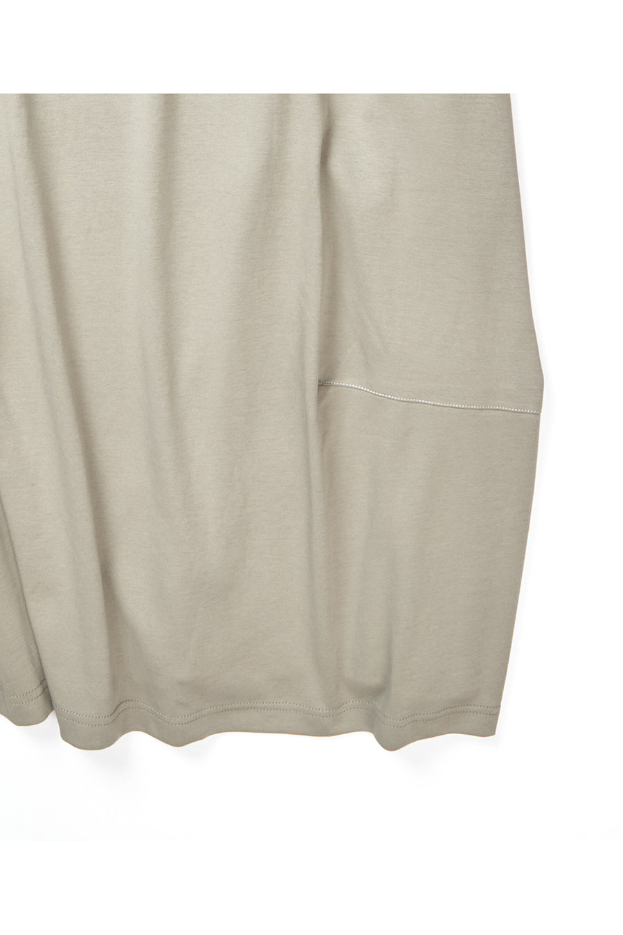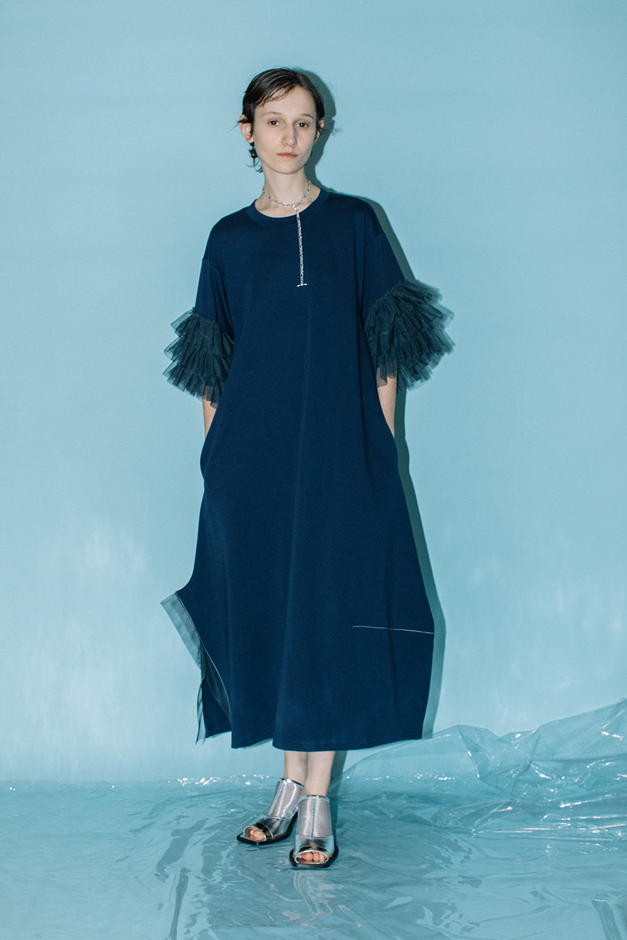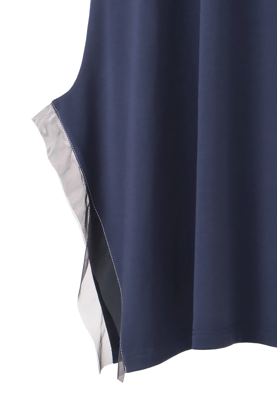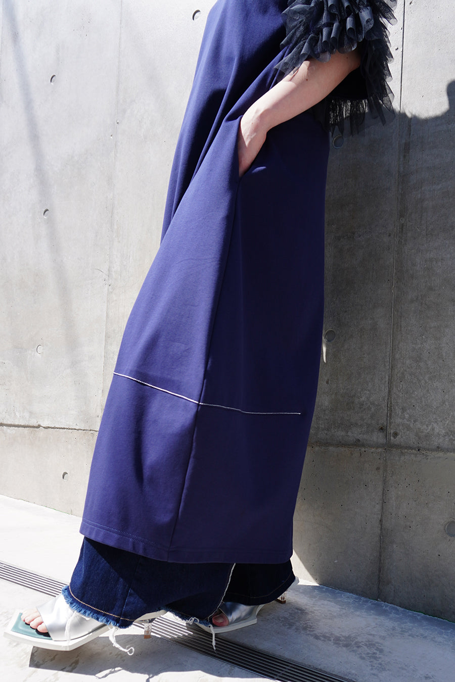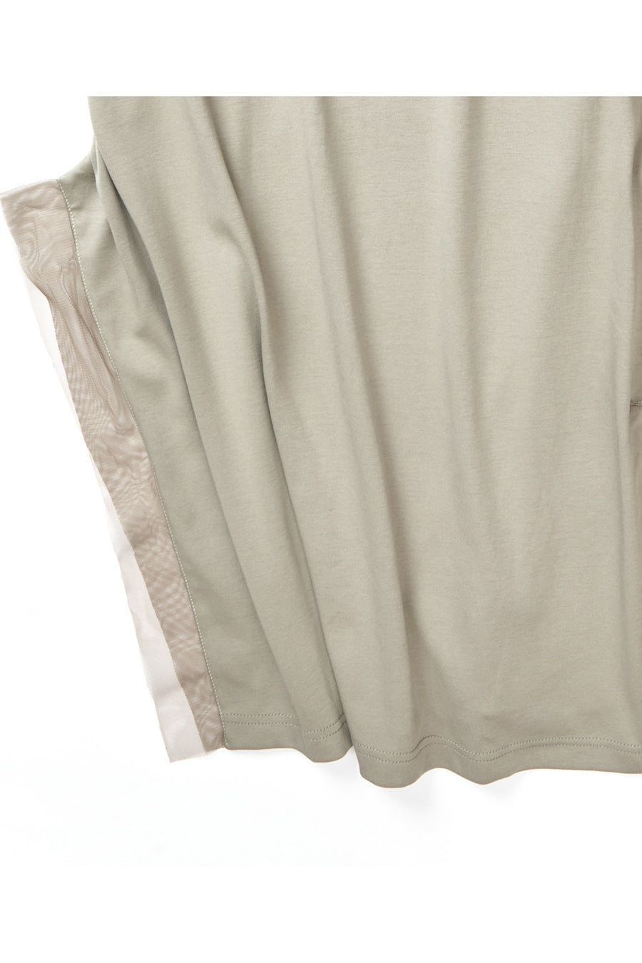 身頃は透けないコットンスムースを使用し、右裾は長くスリット開きに、左脇はコクーンシルエットのアシンメトリーなオーバーサイズで、リラックス感とフェミニンなミックス感が面白いアイテム。首元もチュールを使用し、シアー感が涼しげな印象に。両脇シームポケット付き、裏無し。
