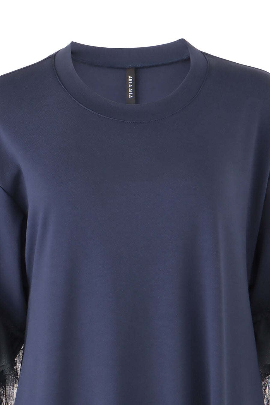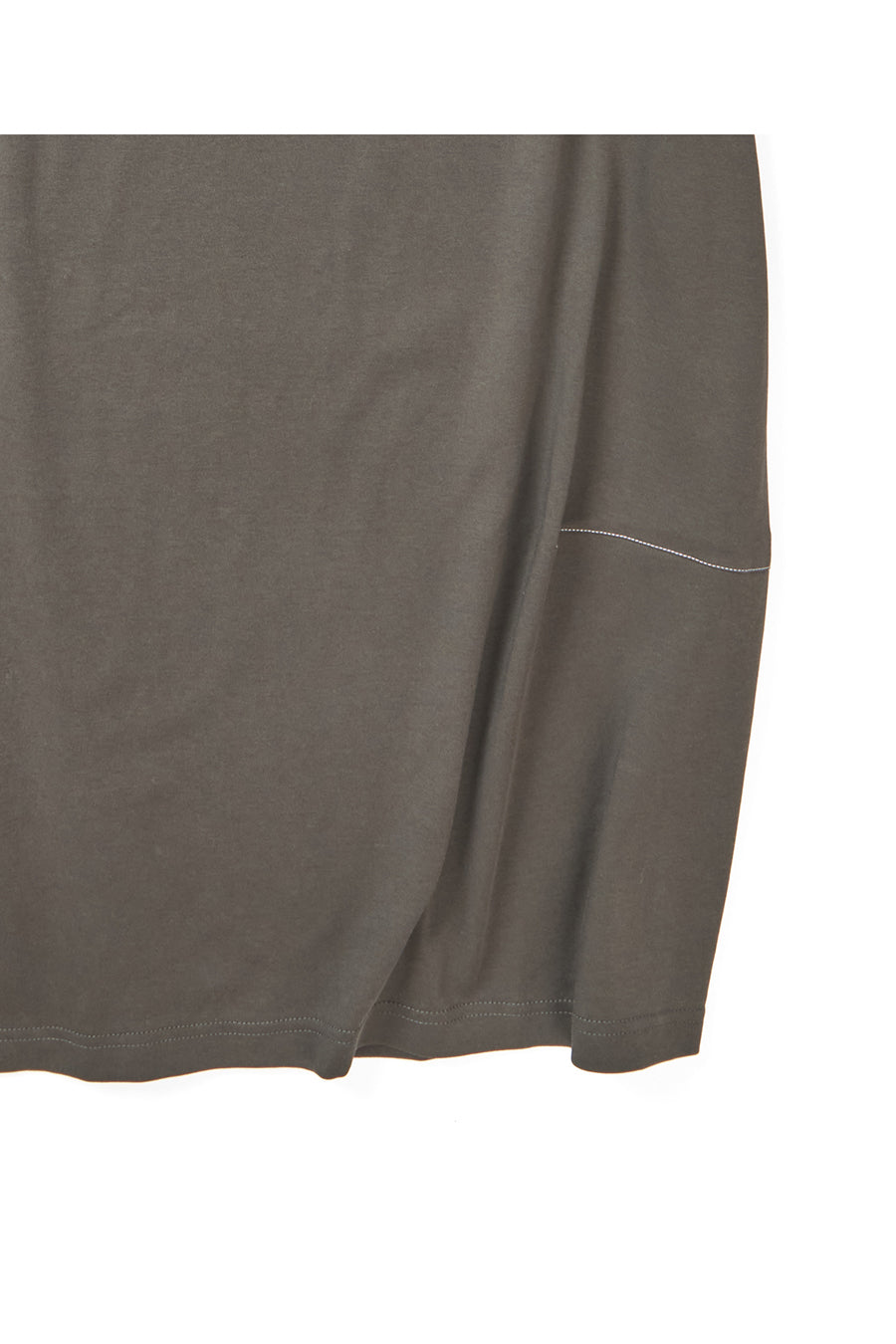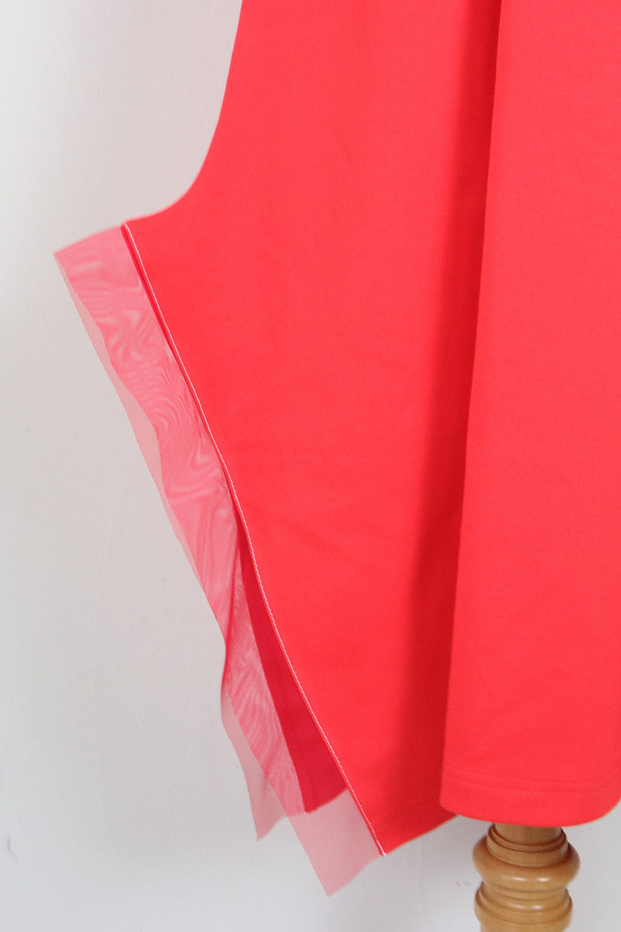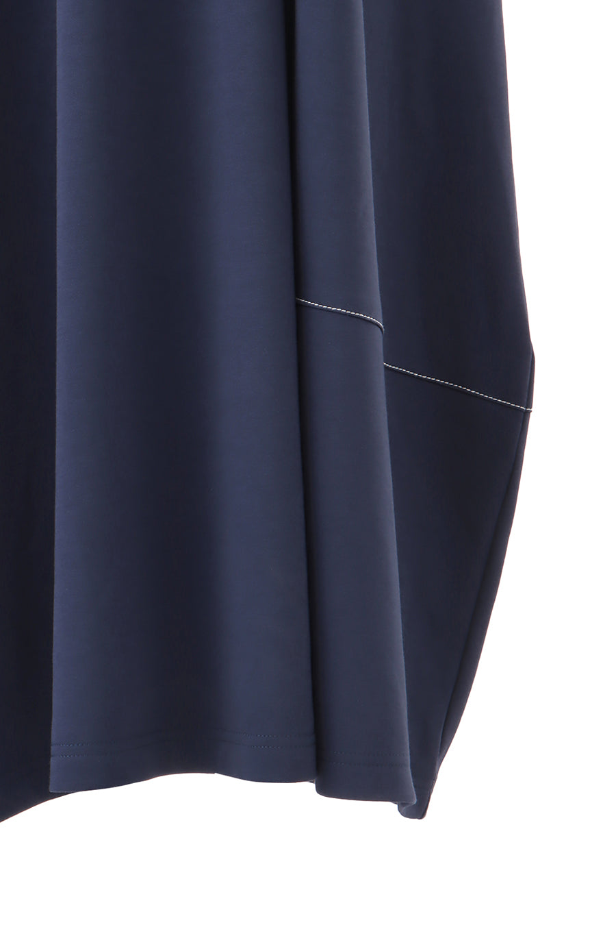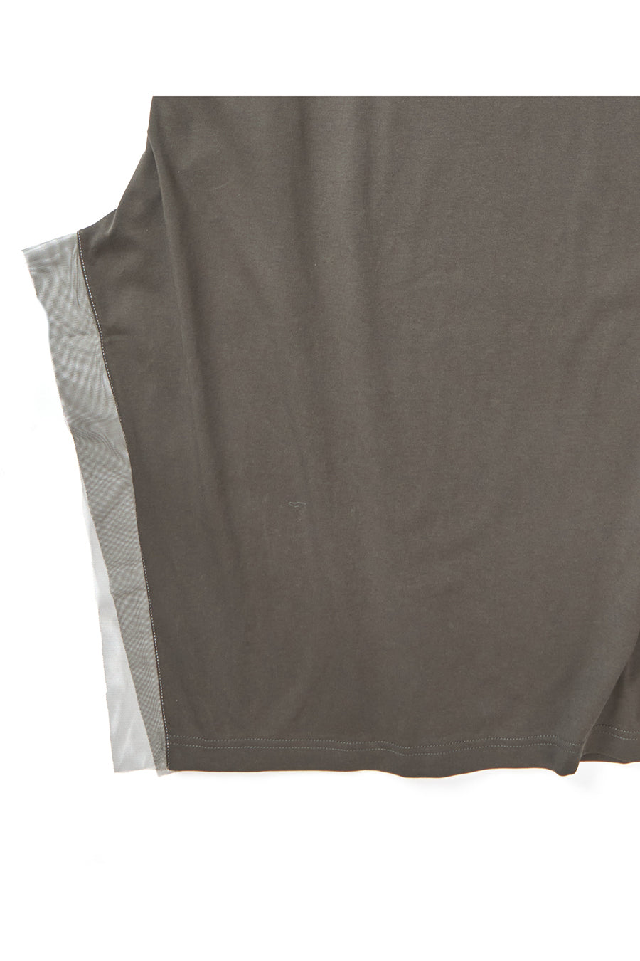 身頃は透けないコットンスムースを使用し、右裾は長くスリット開きに、左脇はコクーンシルエットのアシンメトリーなオーバーサイズで、リラックス感とフェミニンなミックス感が面白いアイテム。首元もチュールを使用し、シアー感が涼しげな印象に。両脇シームポケット付き、裏無し。