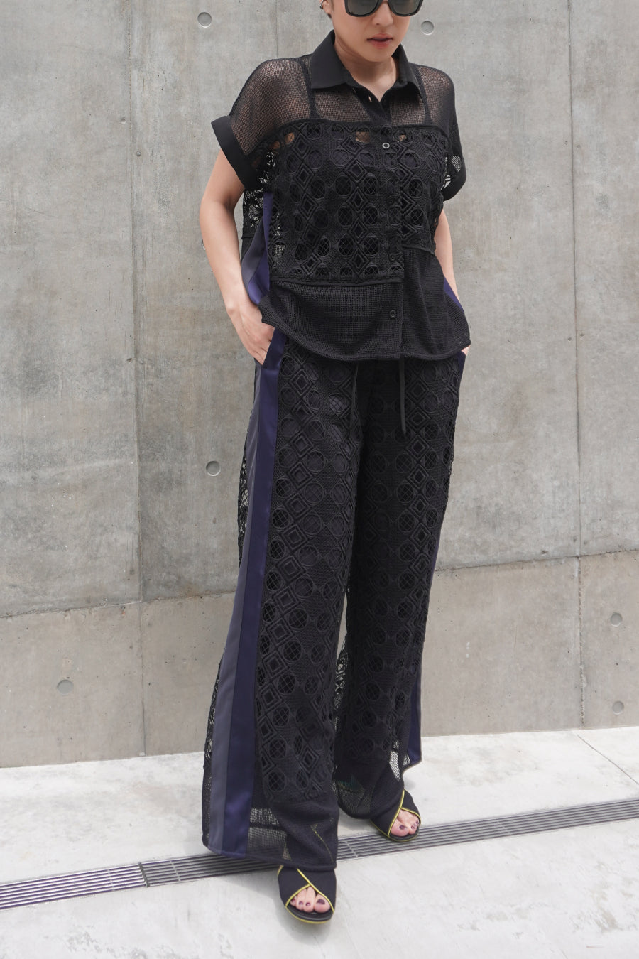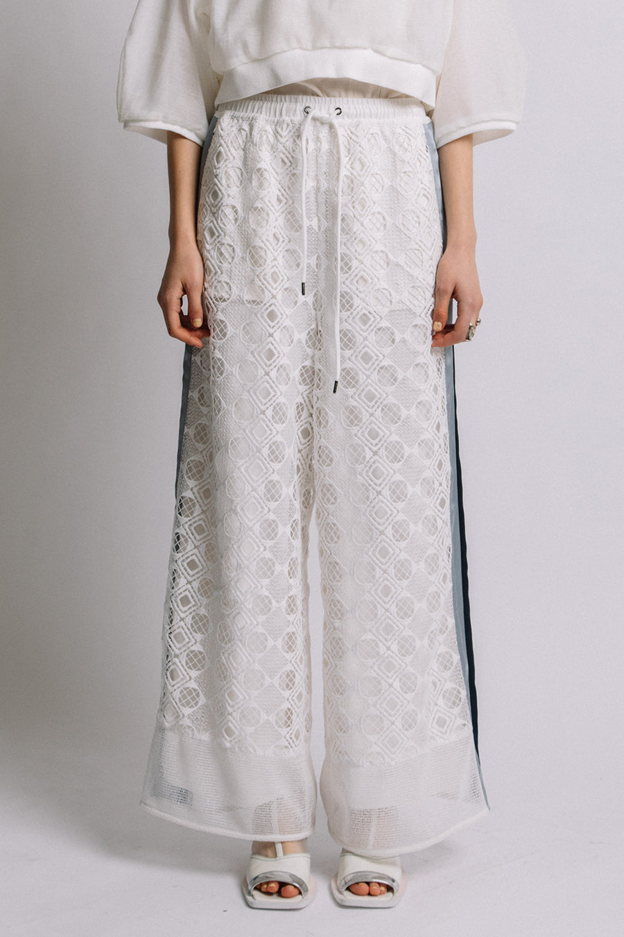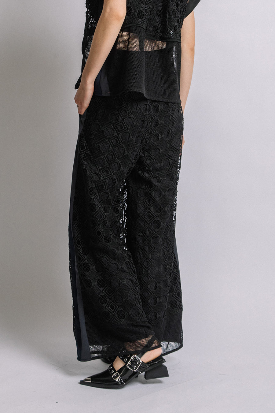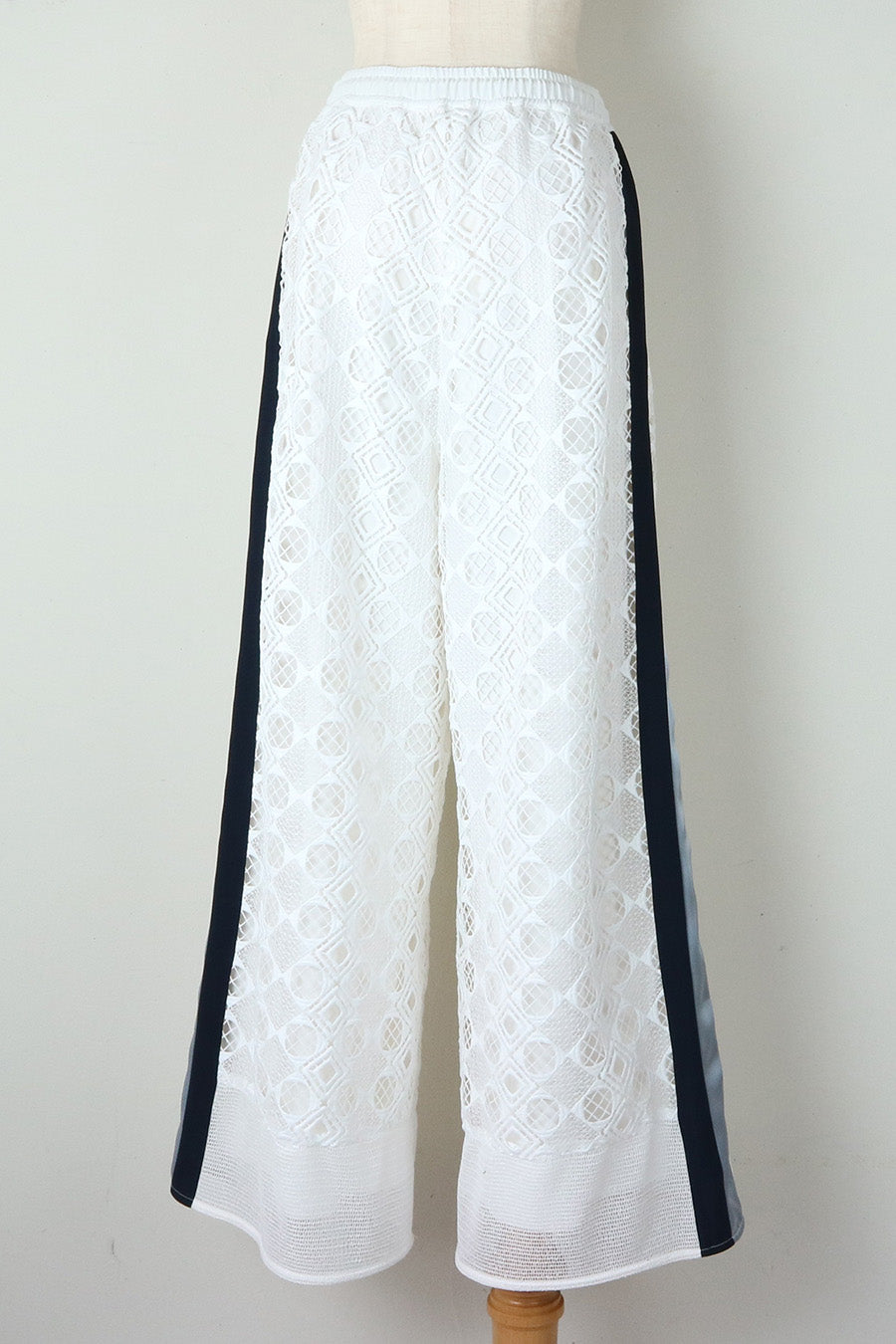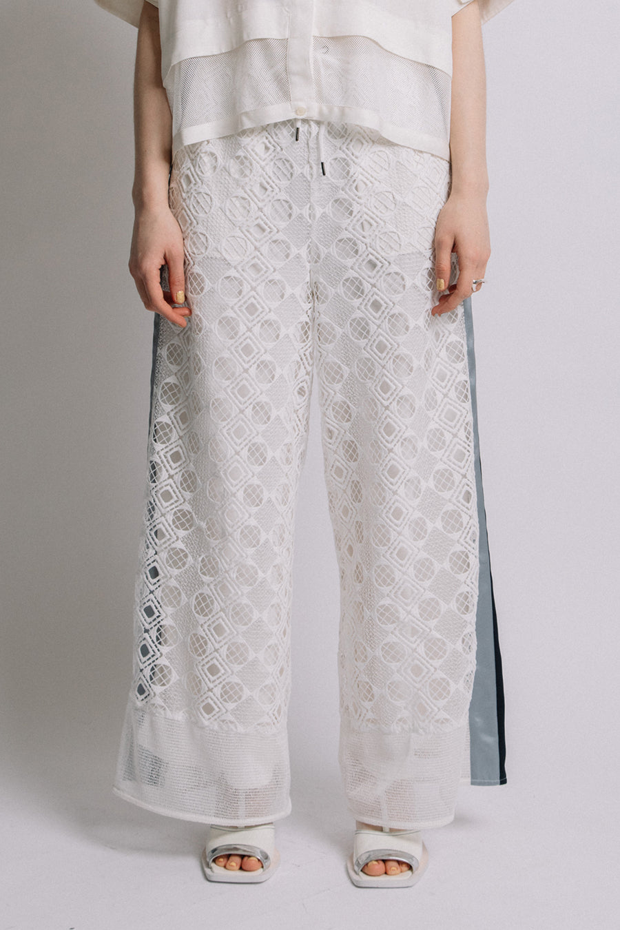 大小柄の2素材をコンビネーションしたパンツは、レースの透け感が涼し気で、夏らしいアイテム。幾何学柄レースと、裾切り替えには格子メッシュを使用。