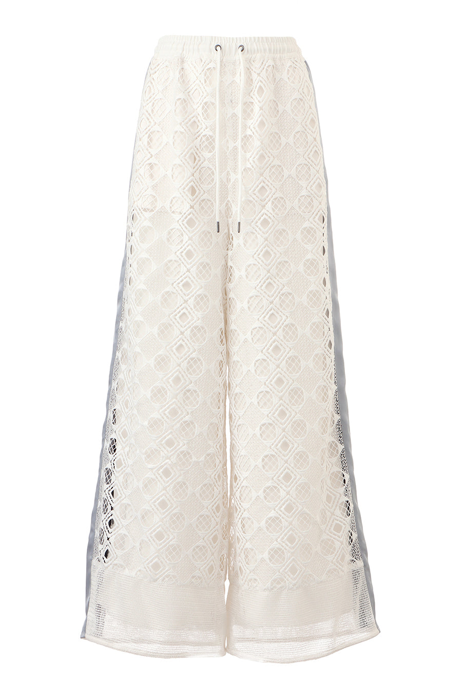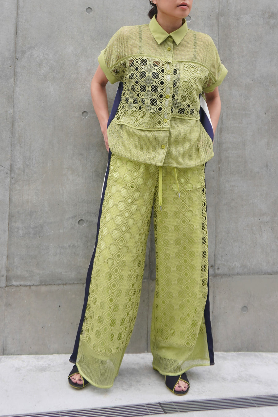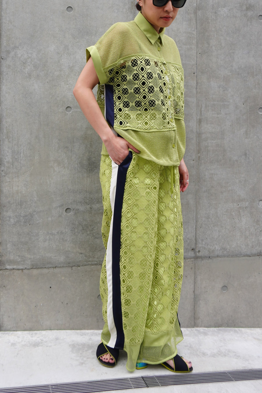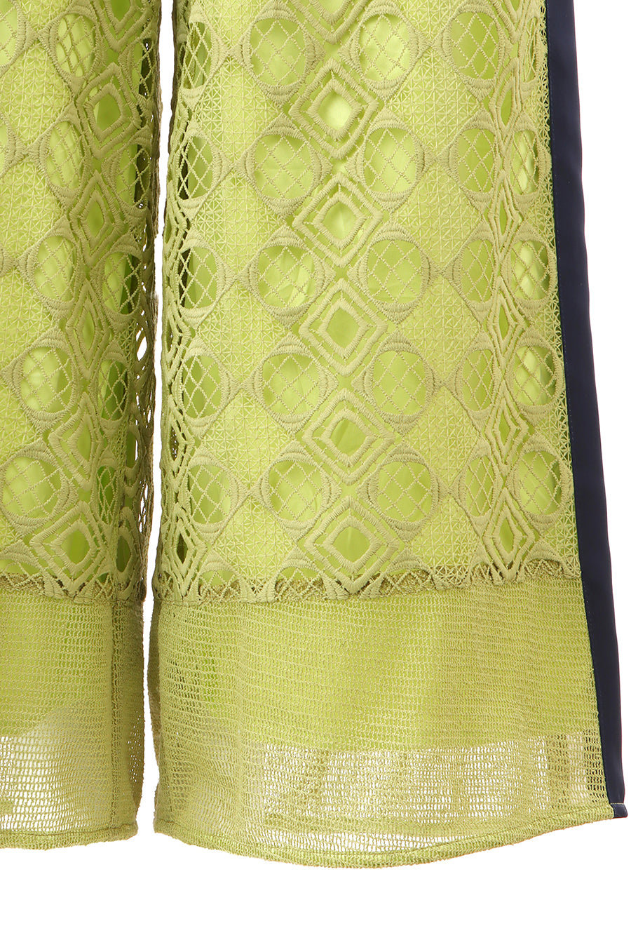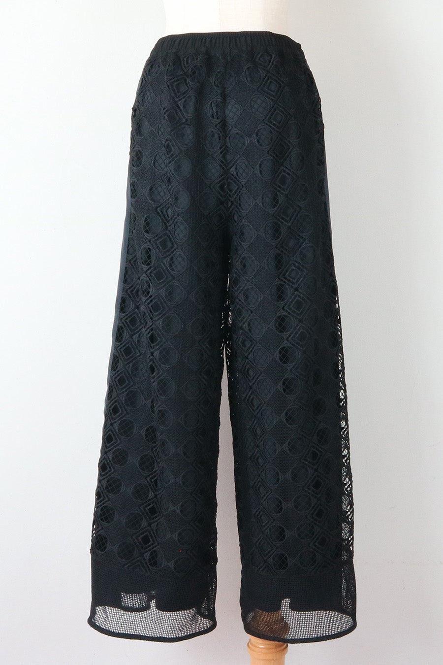 大小柄の2素材をコンビネーションしたパンツは、レースの透け感が涼し気で、夏らしいアイテム。幾何学柄レースと、裾切り替えには格子メッシュを使用。