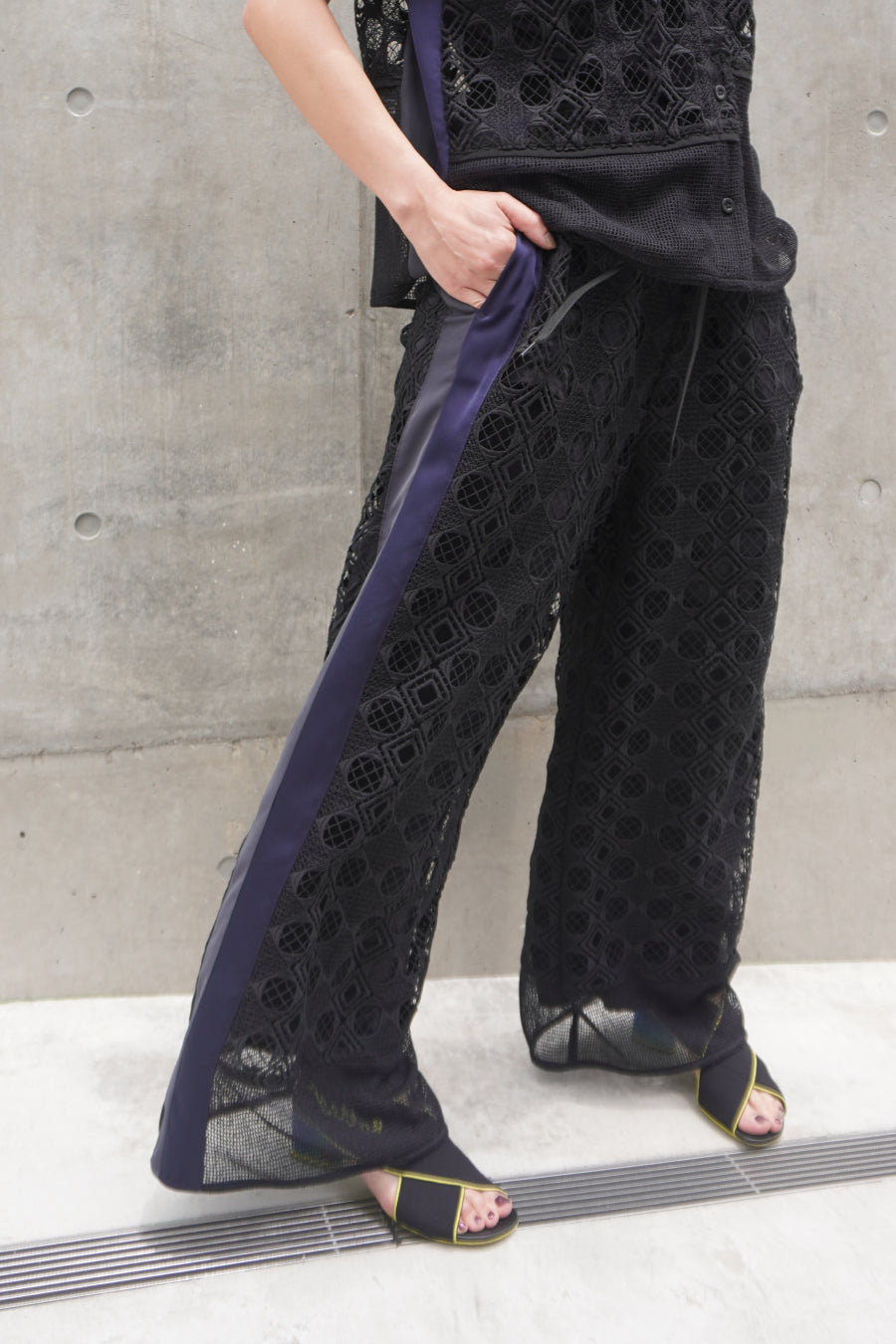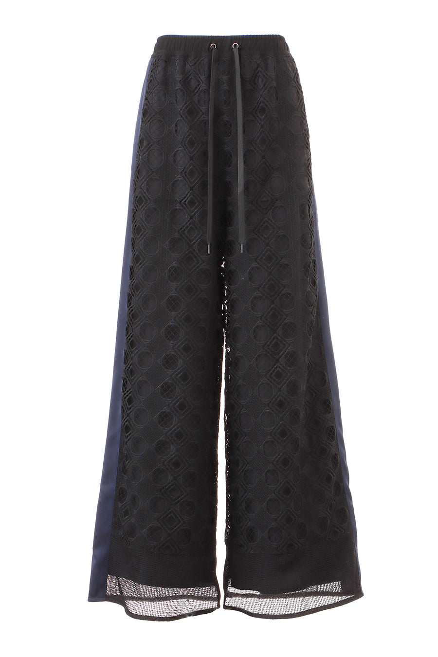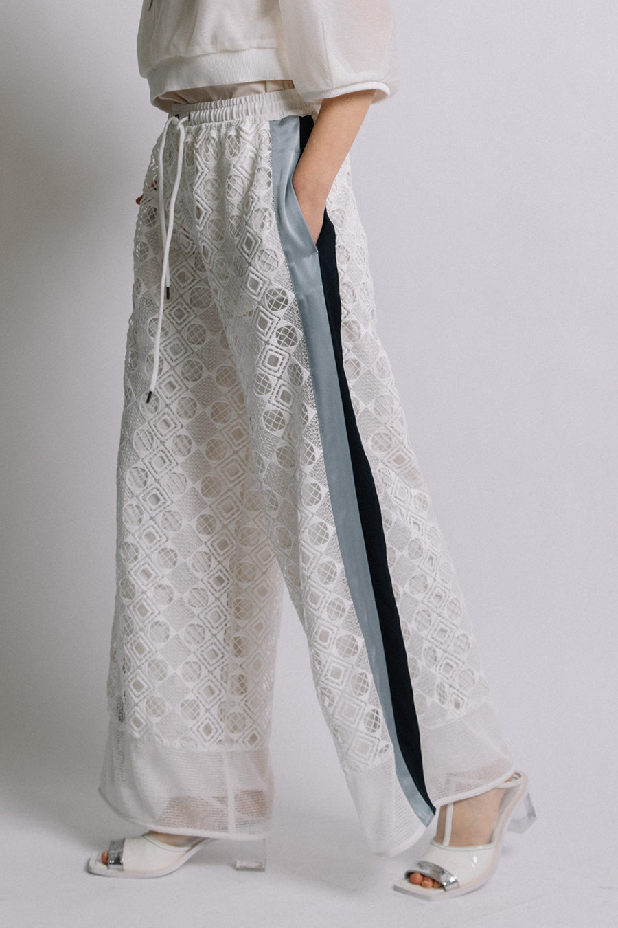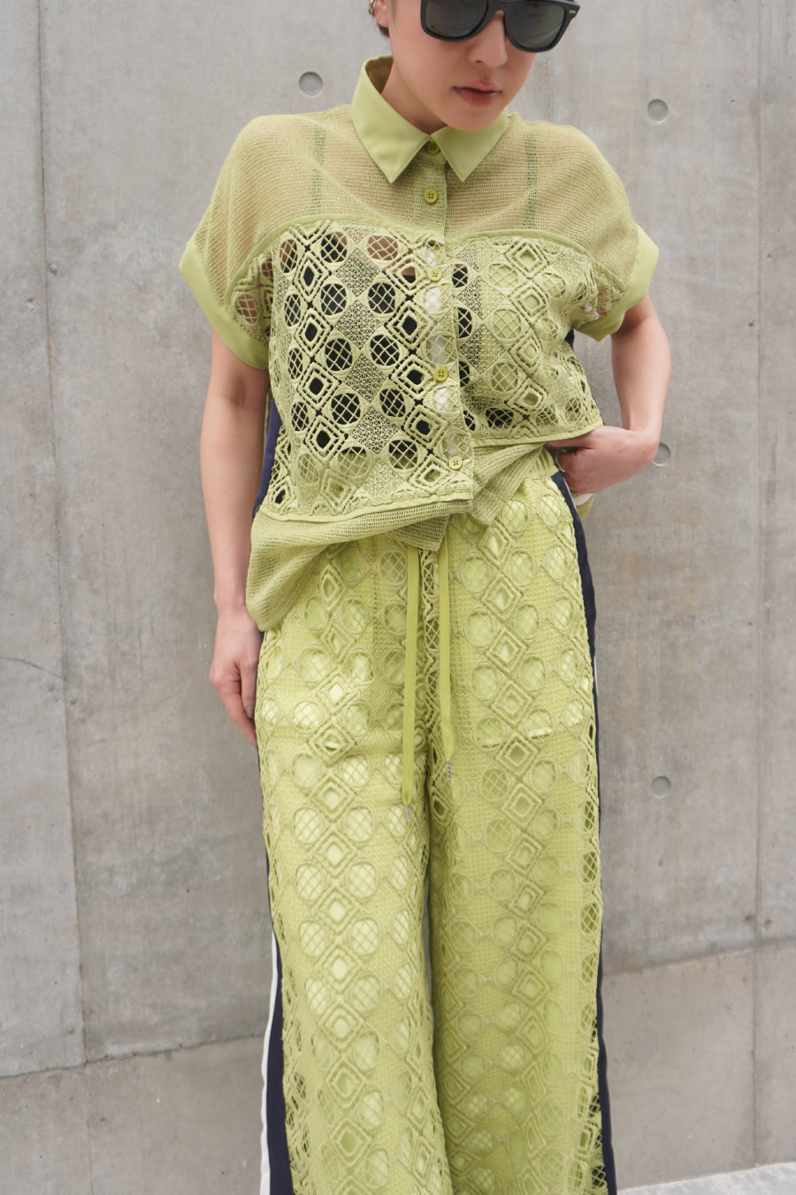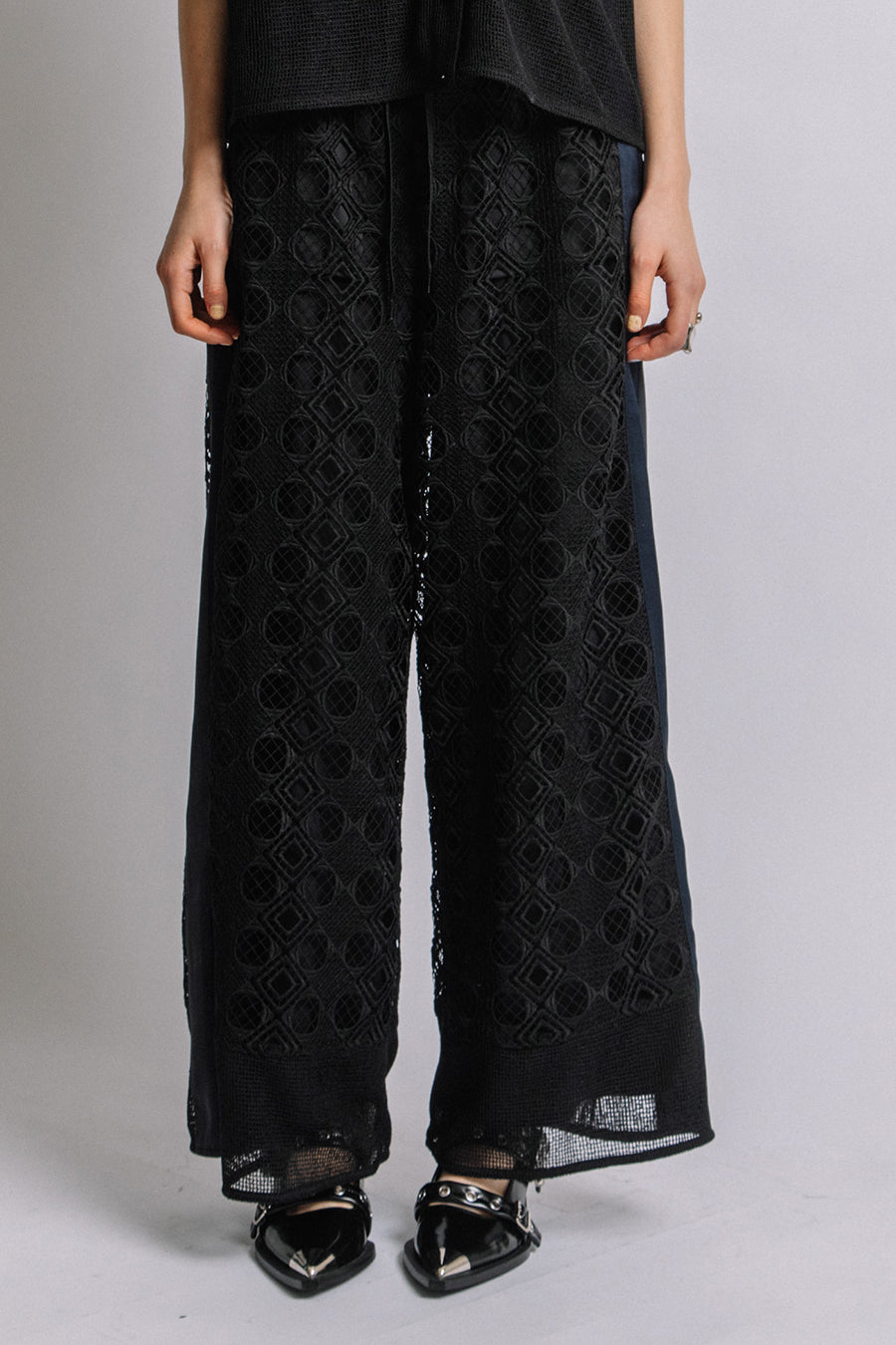 大小柄の2素材をコンビネーションしたパンツは、レースの透け感が涼し気で、夏らしいアイテム。幾何学柄レースと、裾切り替えには格子メッシュを使用。