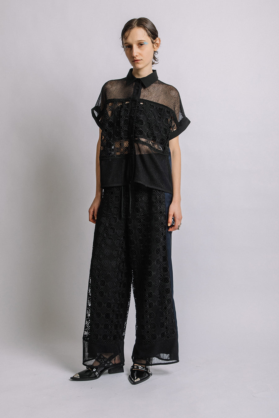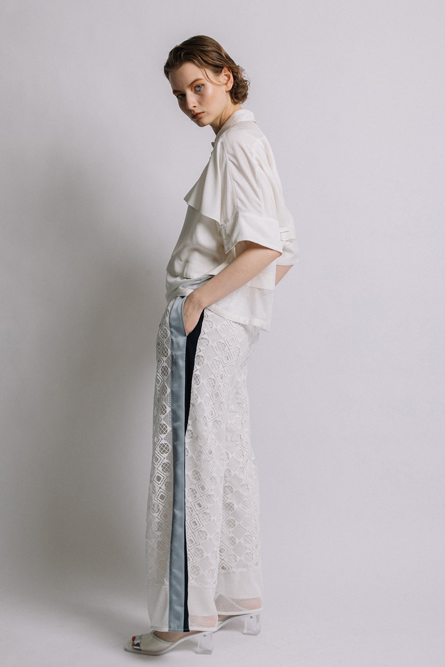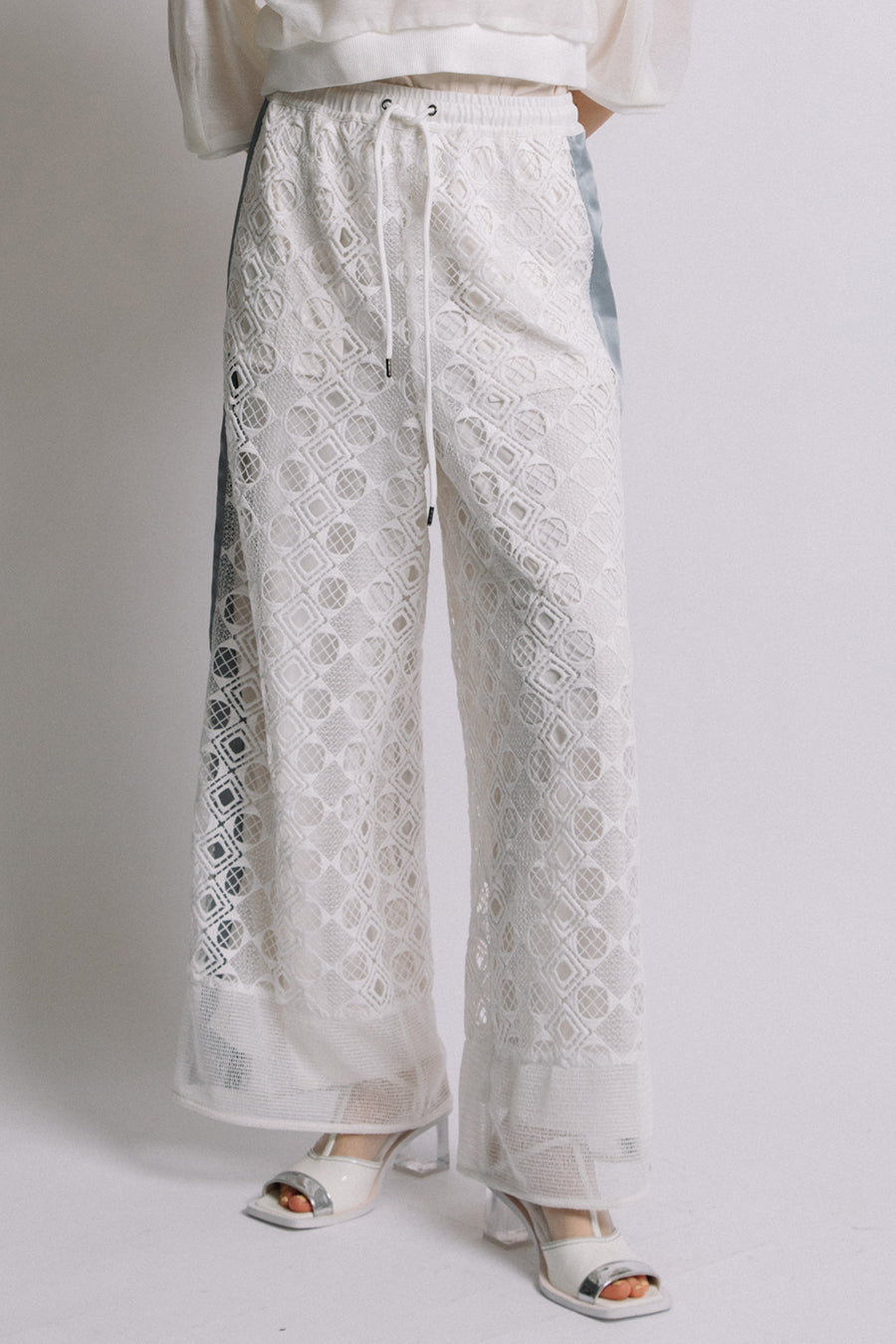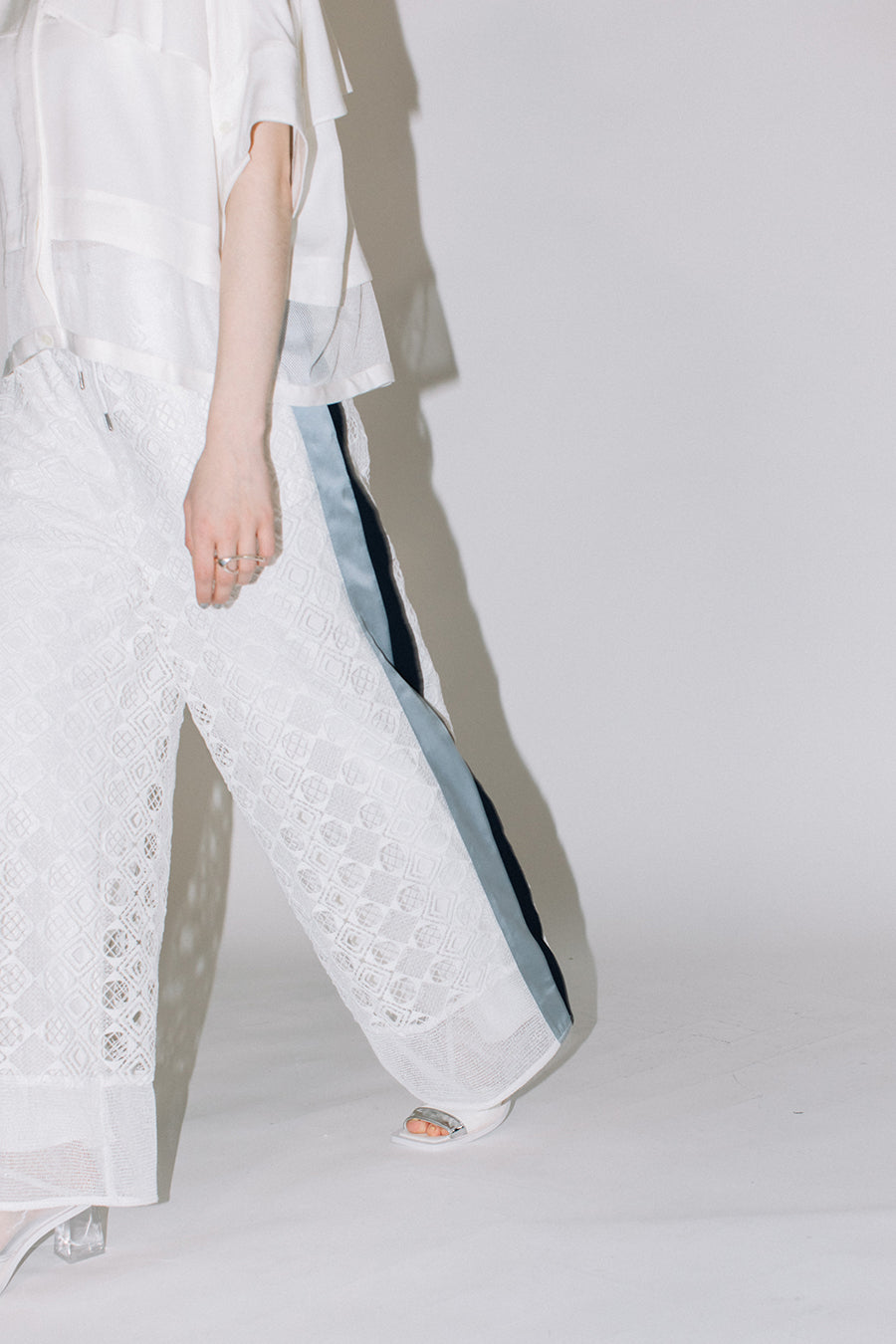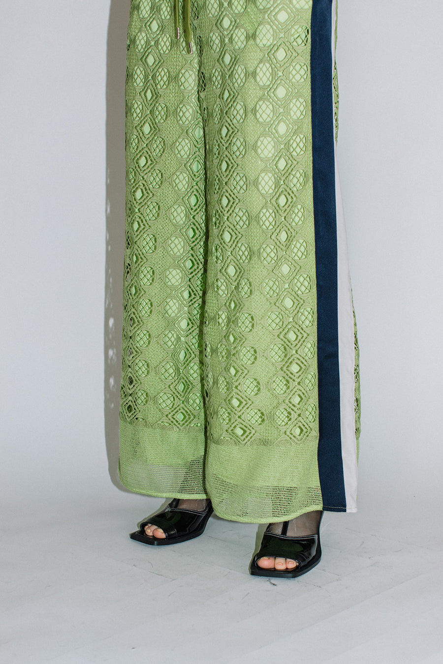 大小柄の2素材をコンビネーションしたパンツは、レースの透け感が涼し気で、夏らしいアイテム。幾何学柄レースと、裾切り替えには格子メッシュを使用。