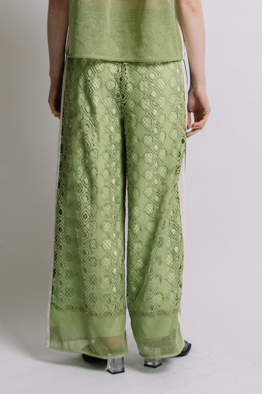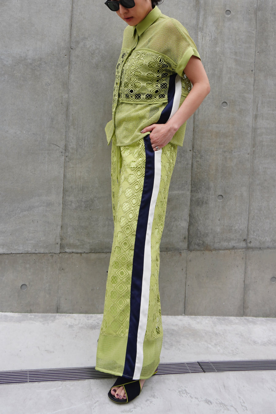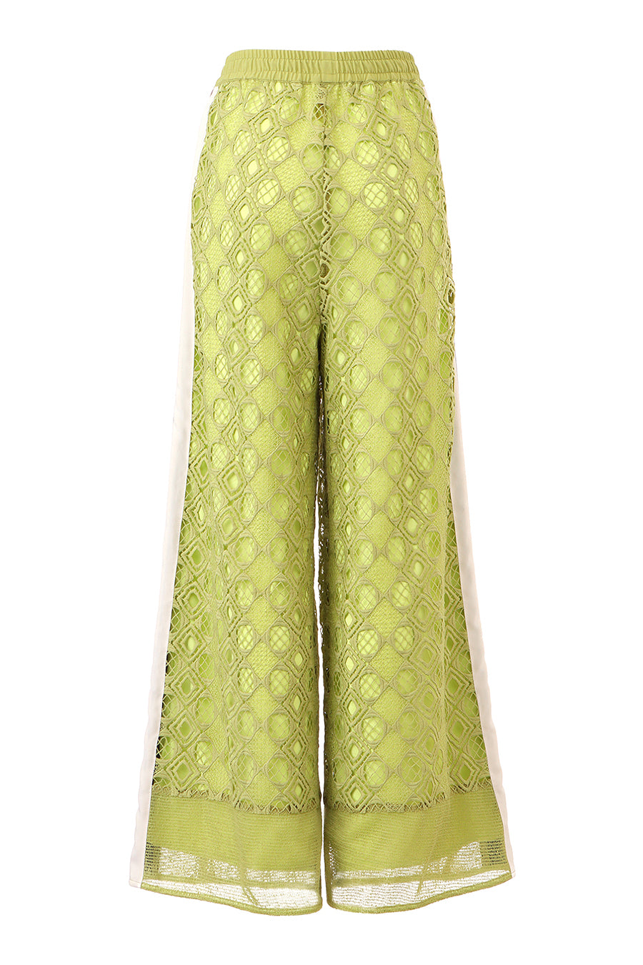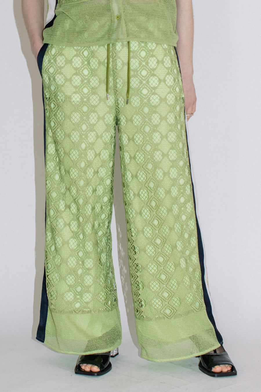大小柄の2素材をコンビネーションしたパンツは、レースの透け感が涼し気で、夏らしいアイテム。幾何学柄レースと、裾切り替えには格子メッシュを使用。
