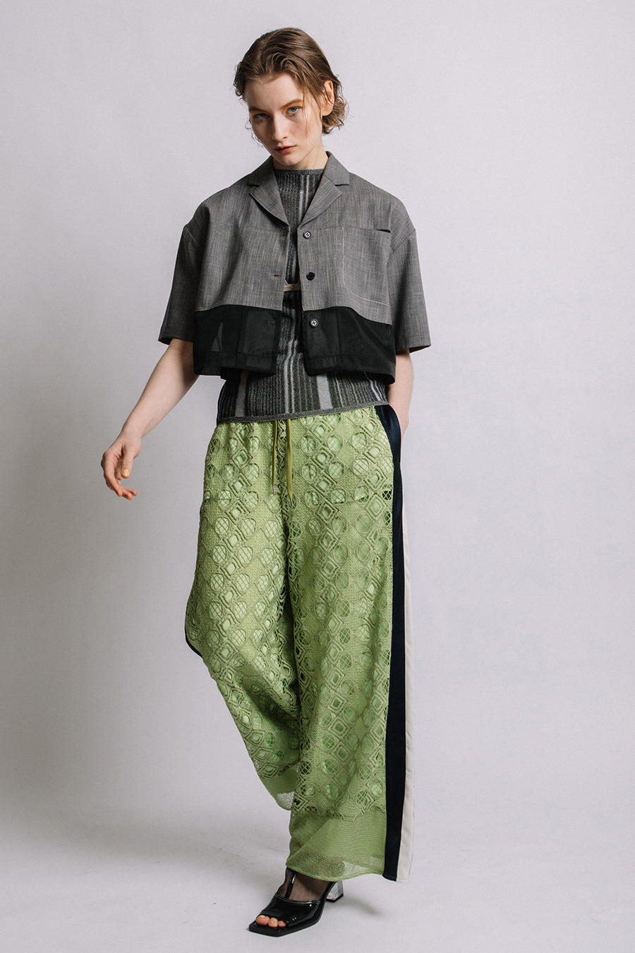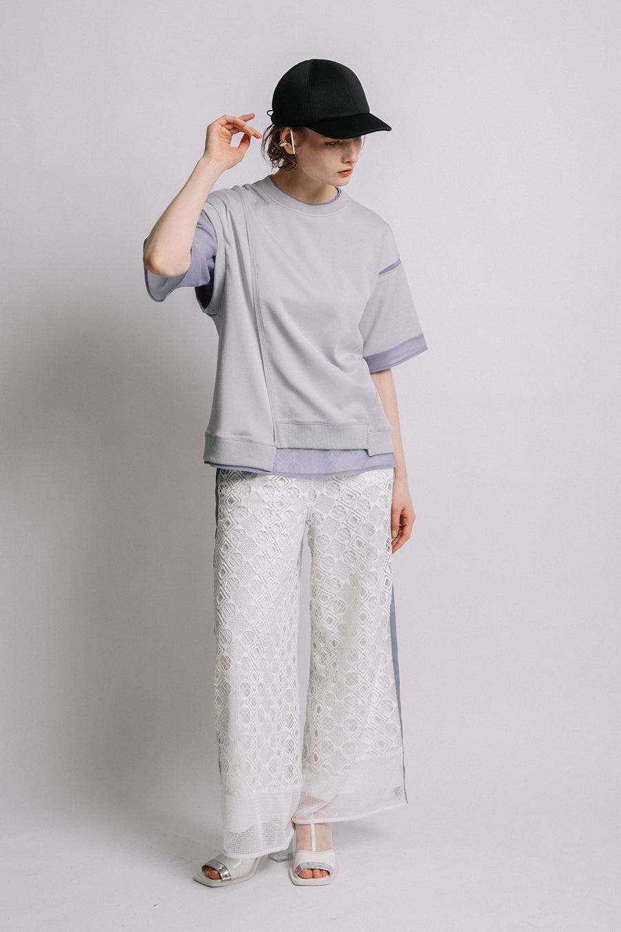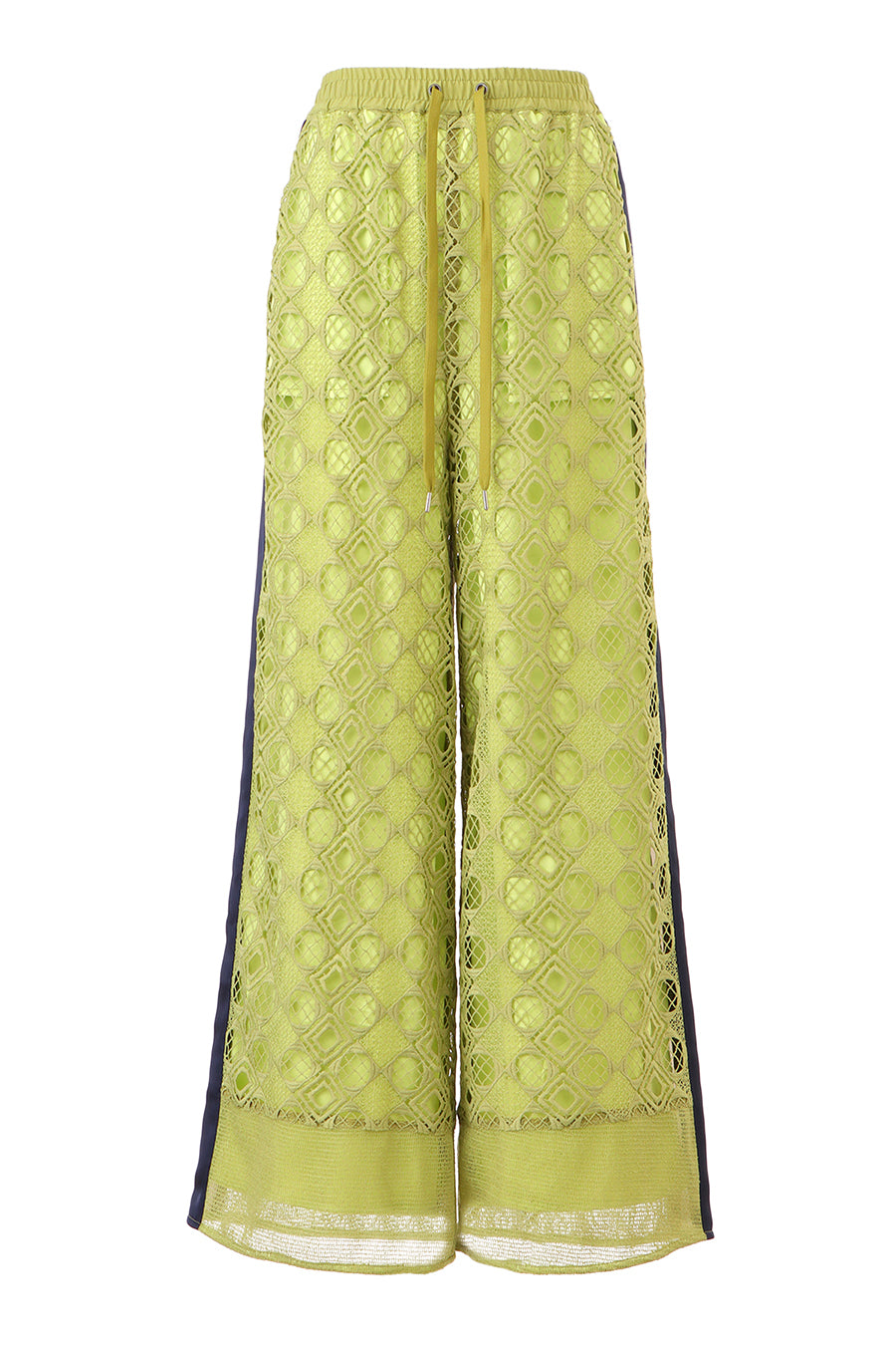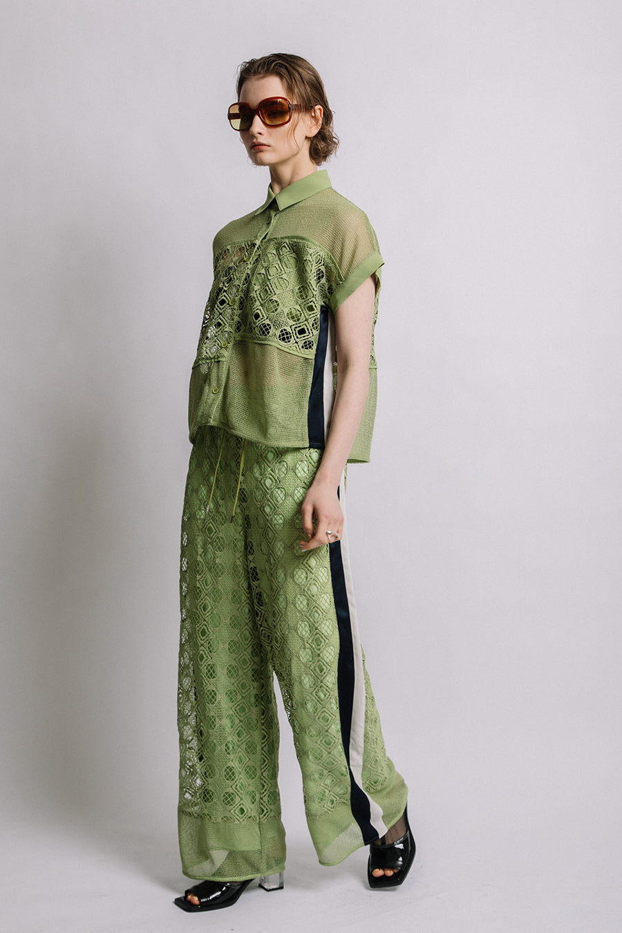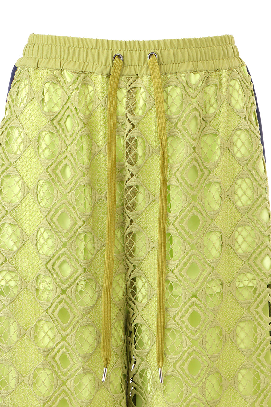 大小柄の2素材をコンビネーションしたパンツは、レースの透け感が涼し気で、夏らしいアイテム。幾何学柄レースと、裾切り替えには格子メッシュを使用。