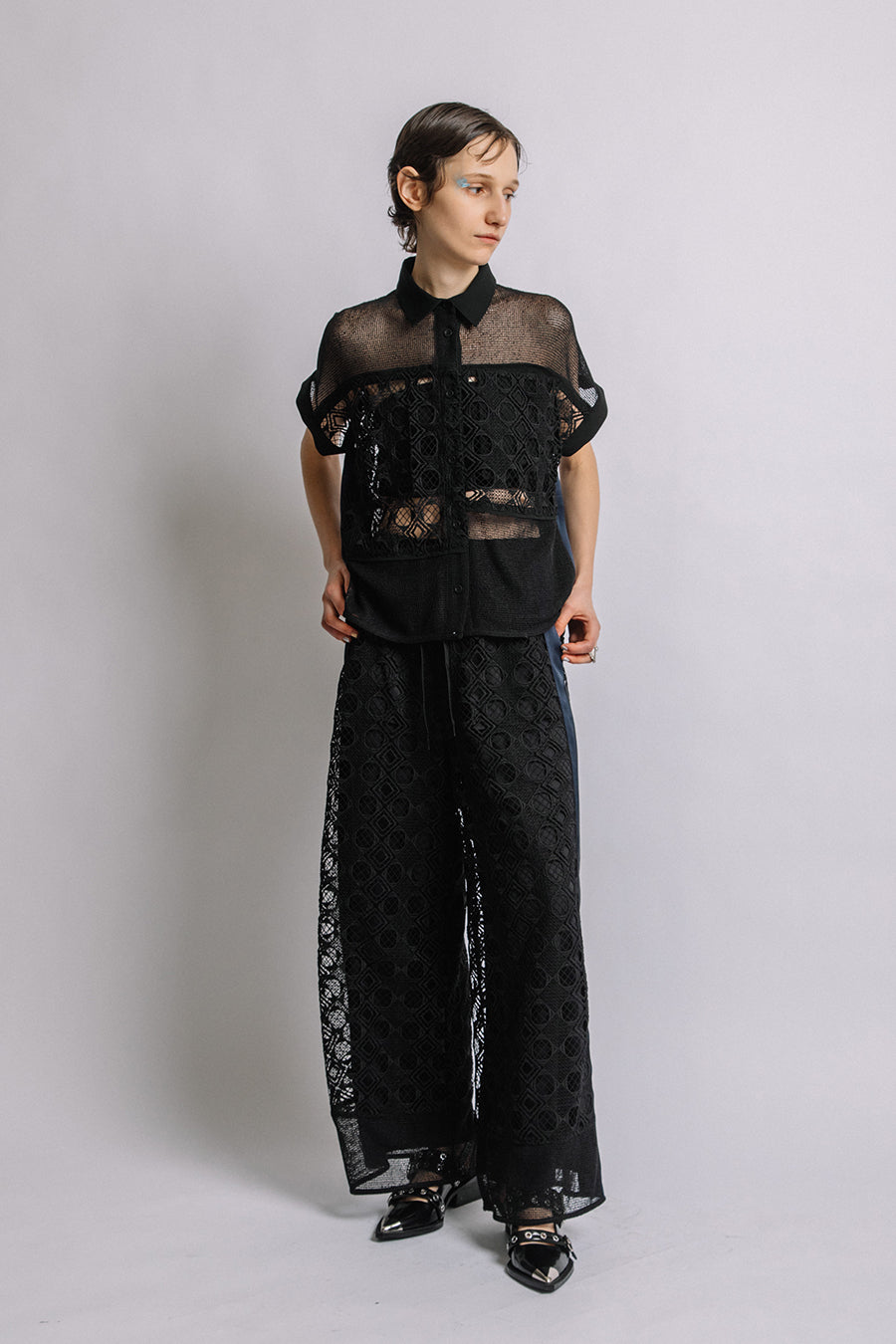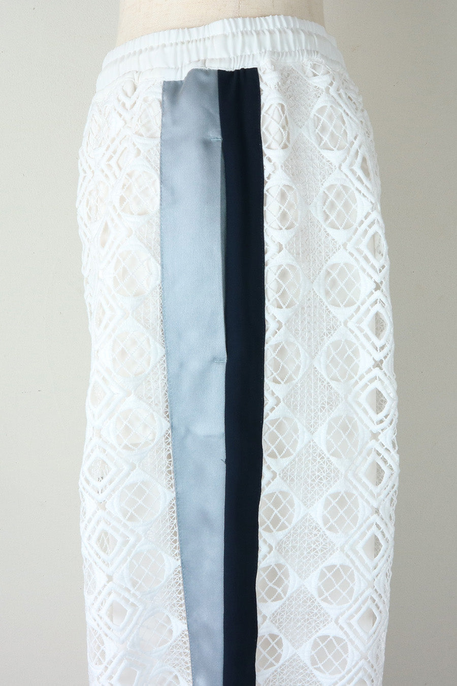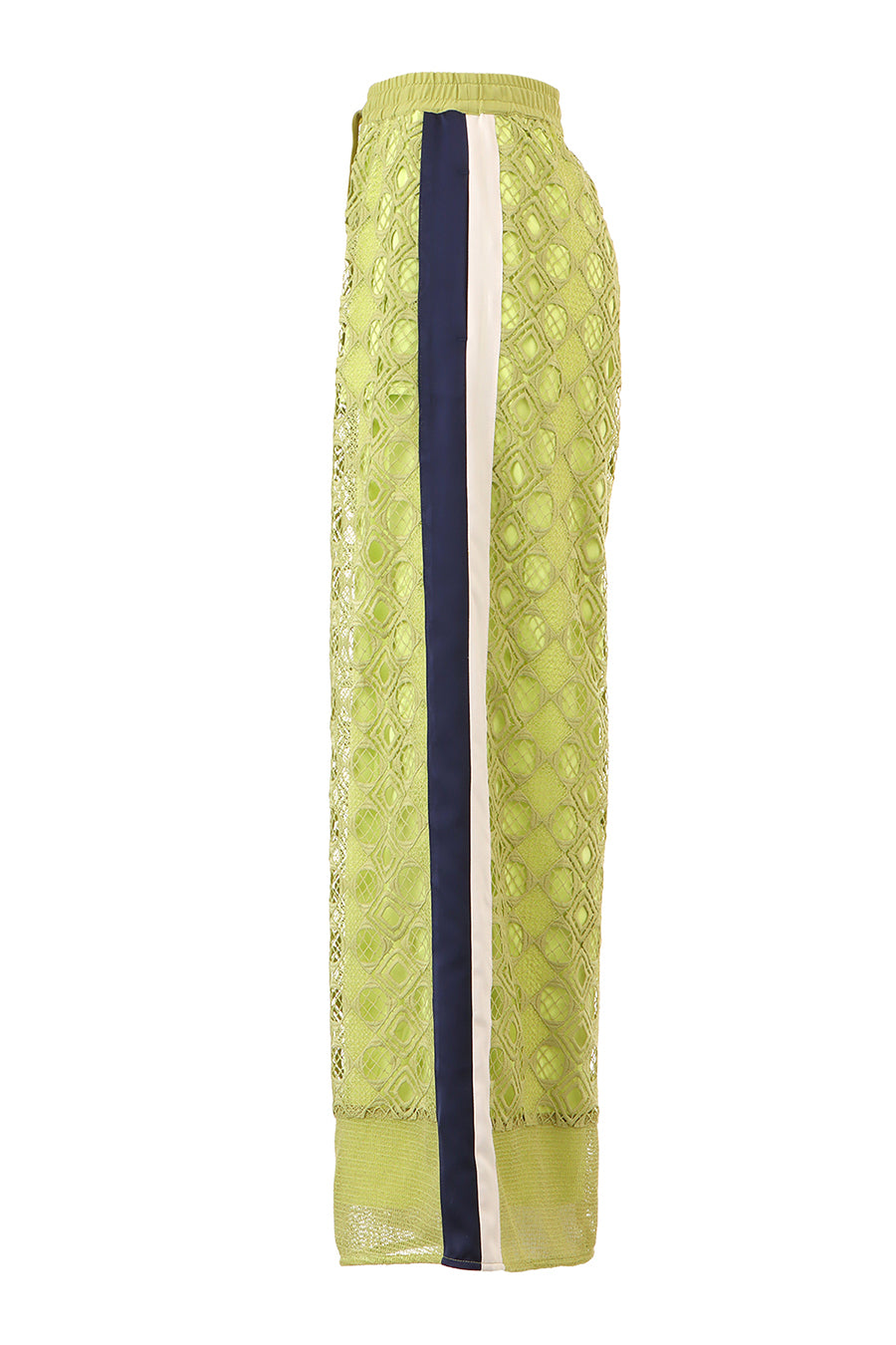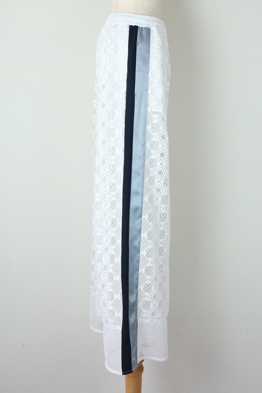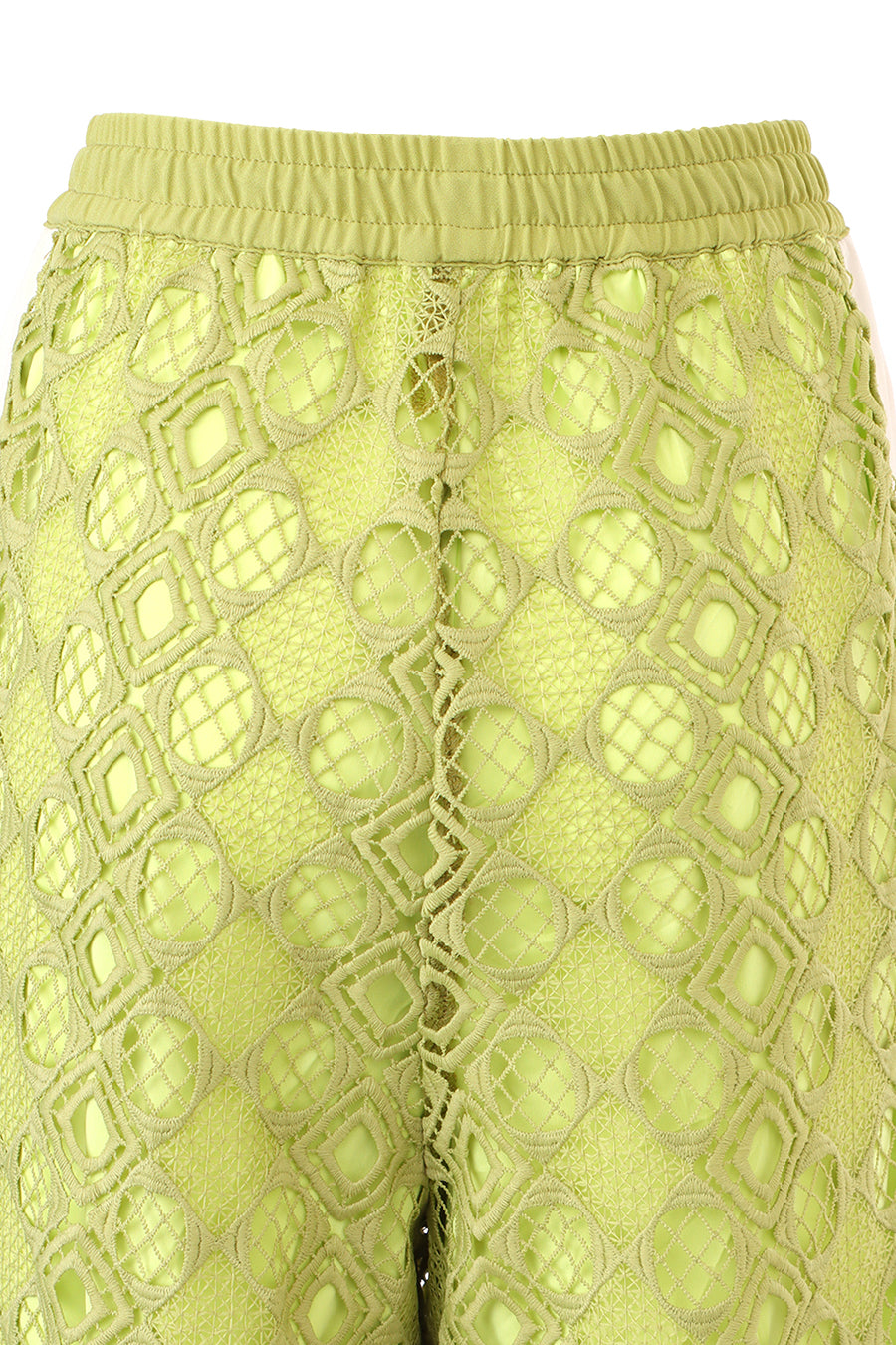 大小柄の2素材をコンビネーションしたパンツは、レースの透け感が涼し気で、夏らしいアイテム。幾何学柄レースと、裾切り替えには格子メッシュを使用。