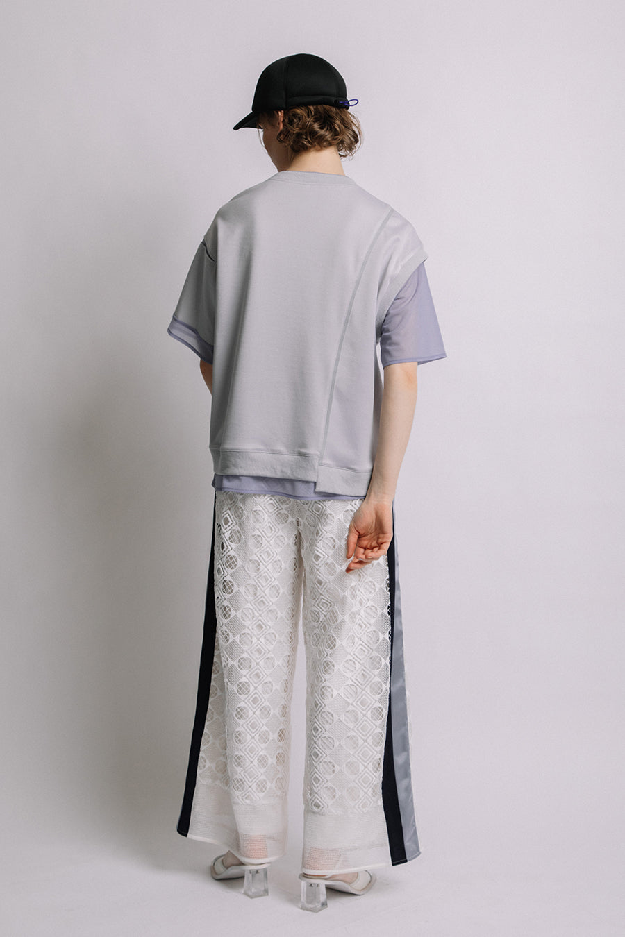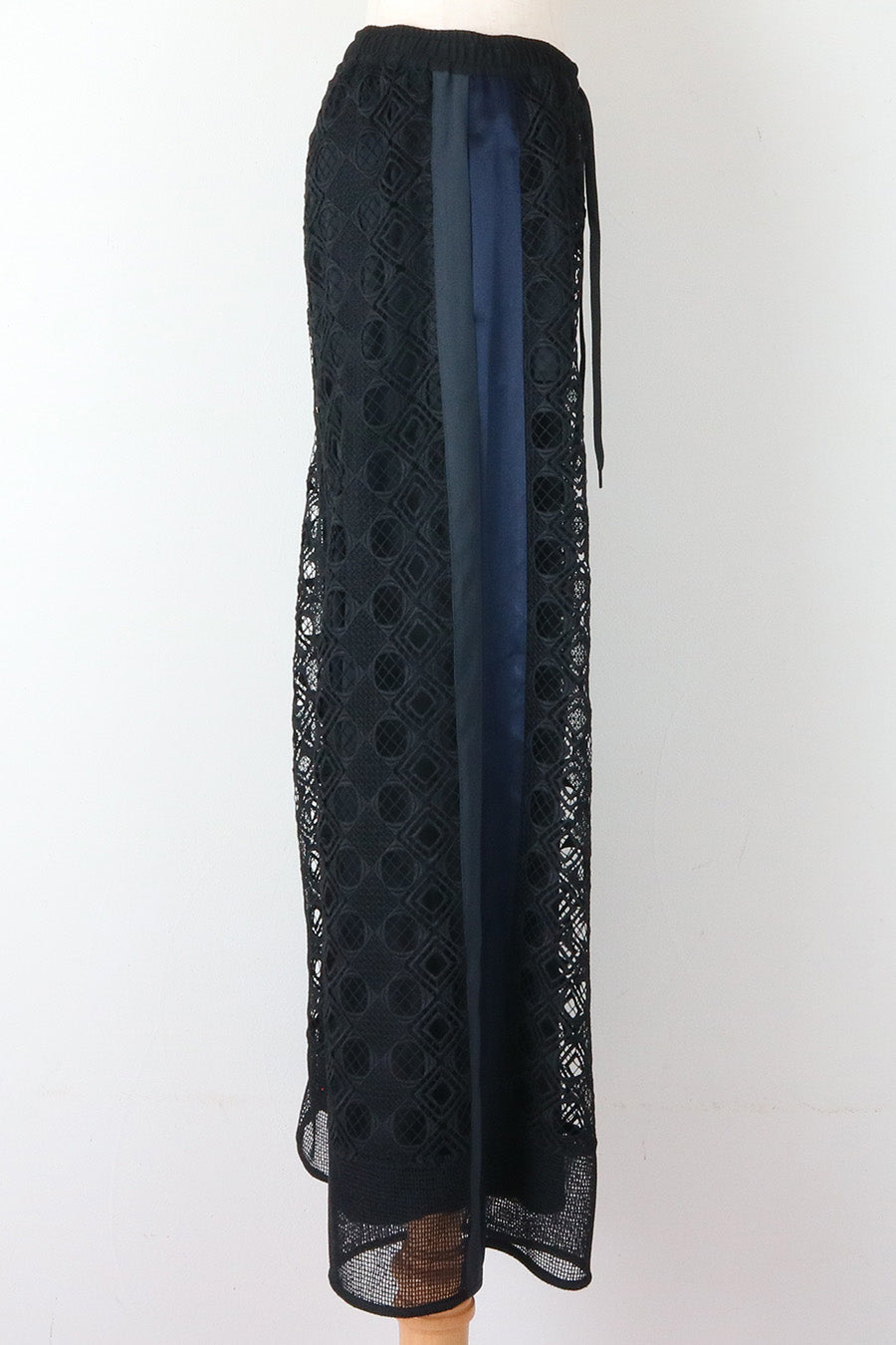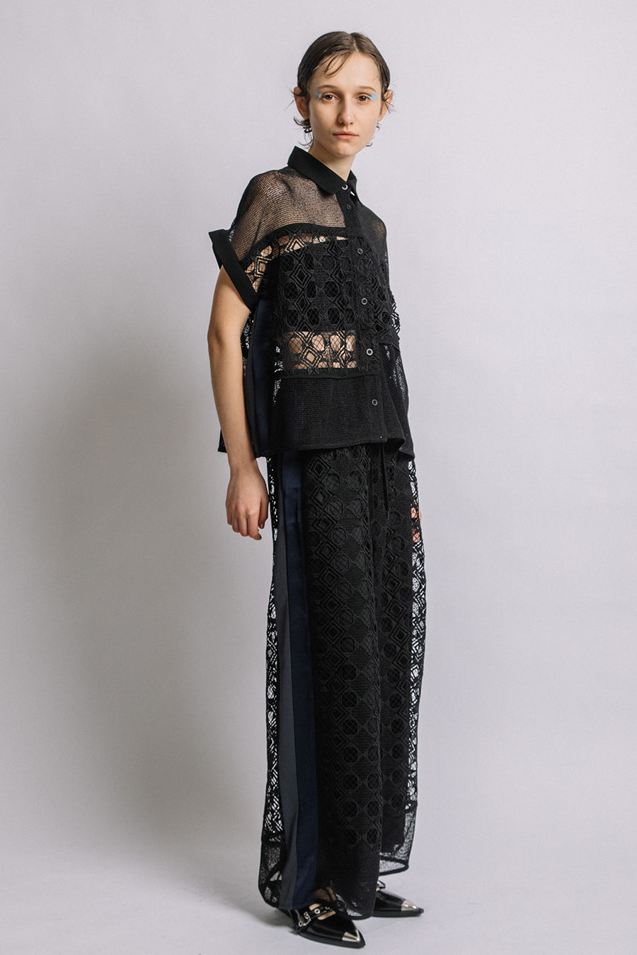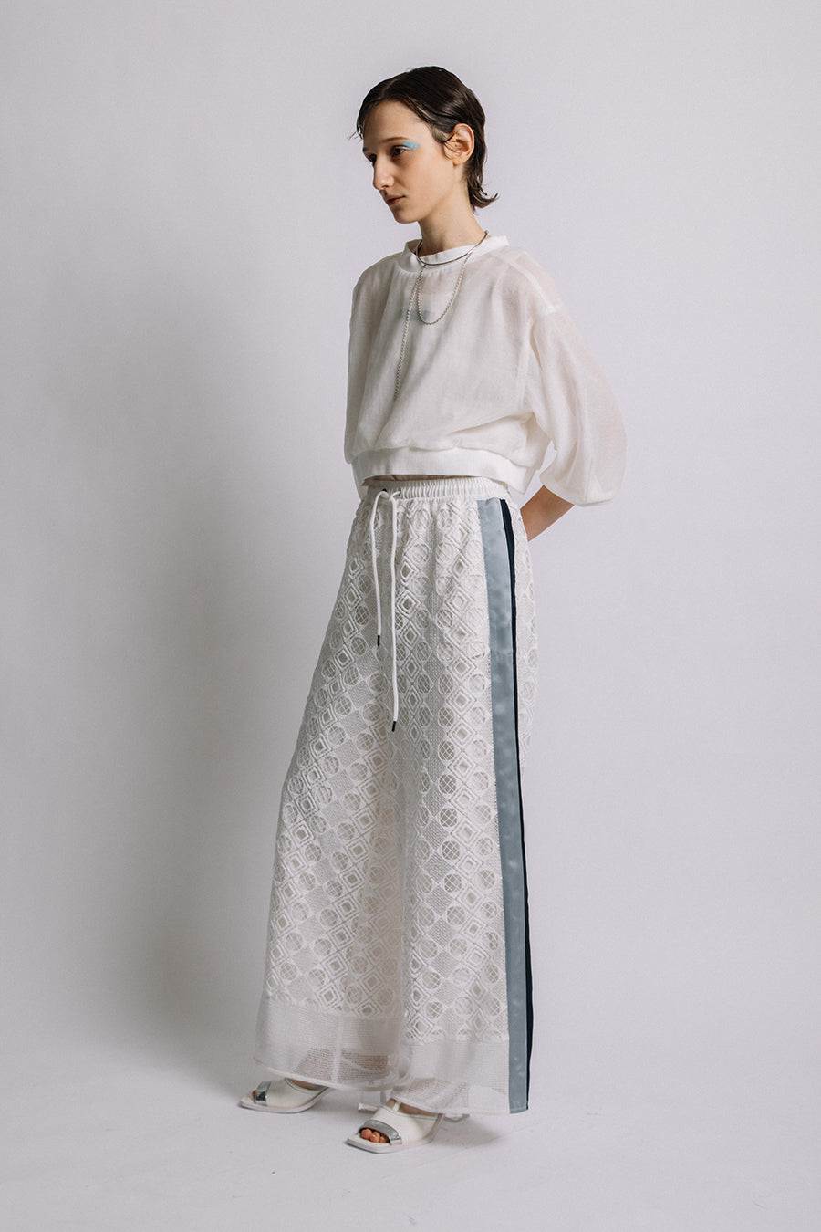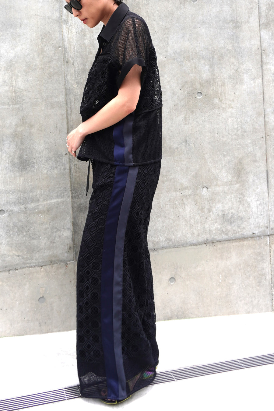 大小柄の2素材をコンビネーションしたパンツは、レースの透け感が涼し気で、夏らしいアイテム。幾何学柄レースと、裾切り替えには格子メッシュを使用。