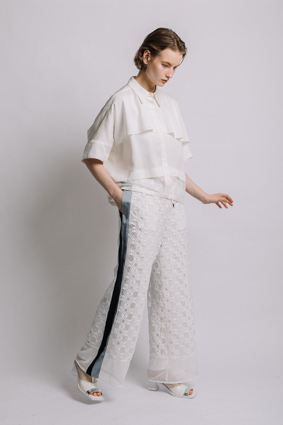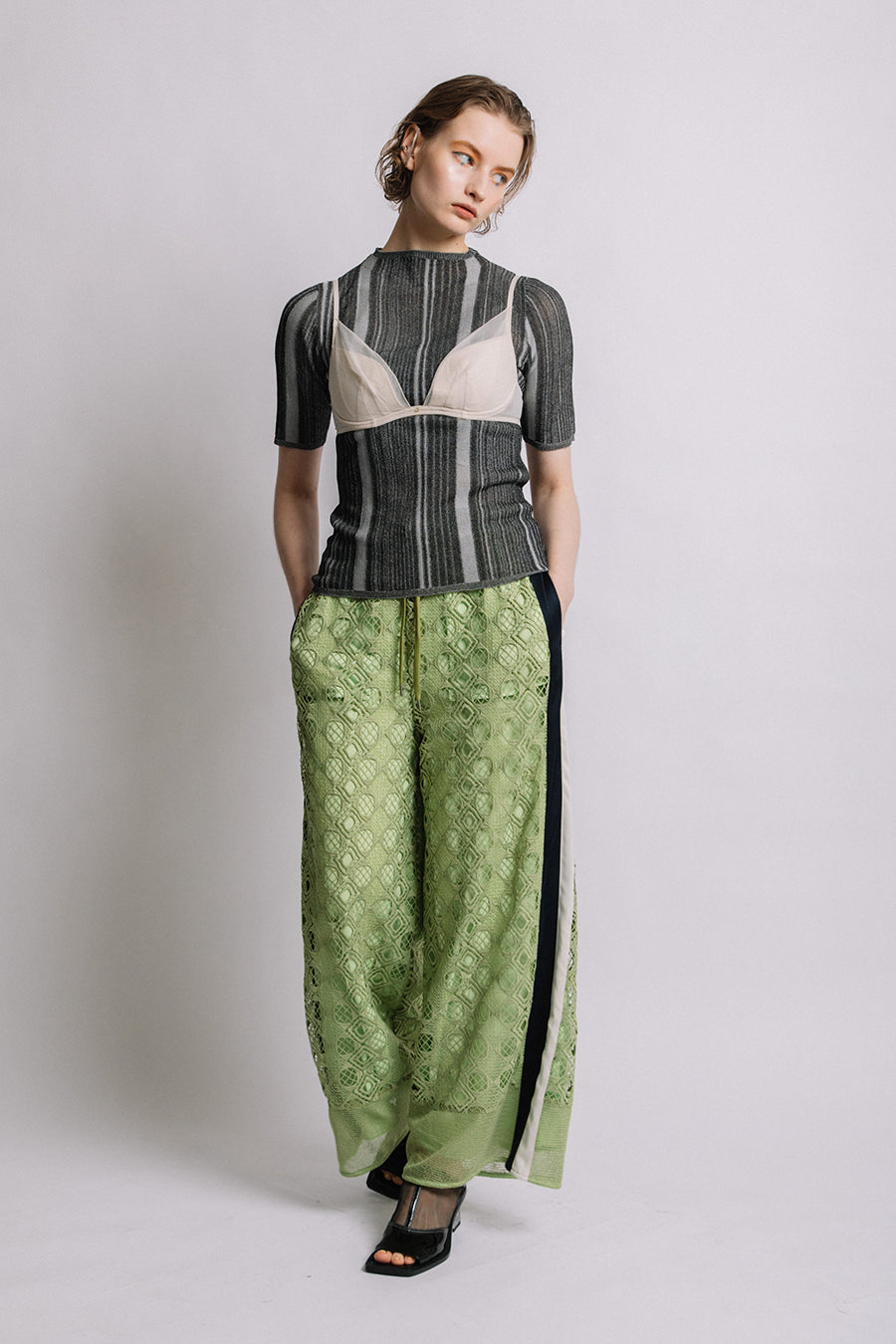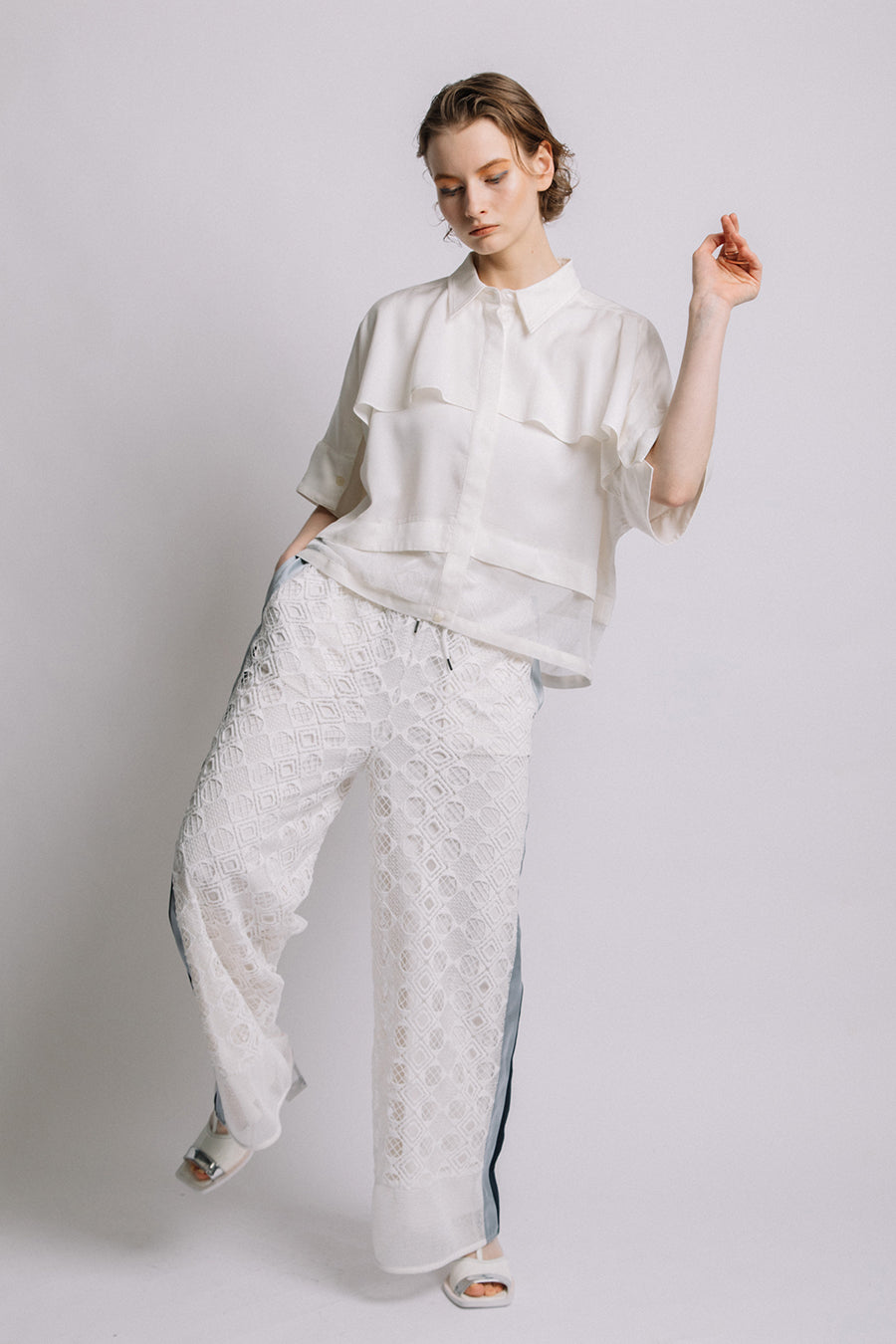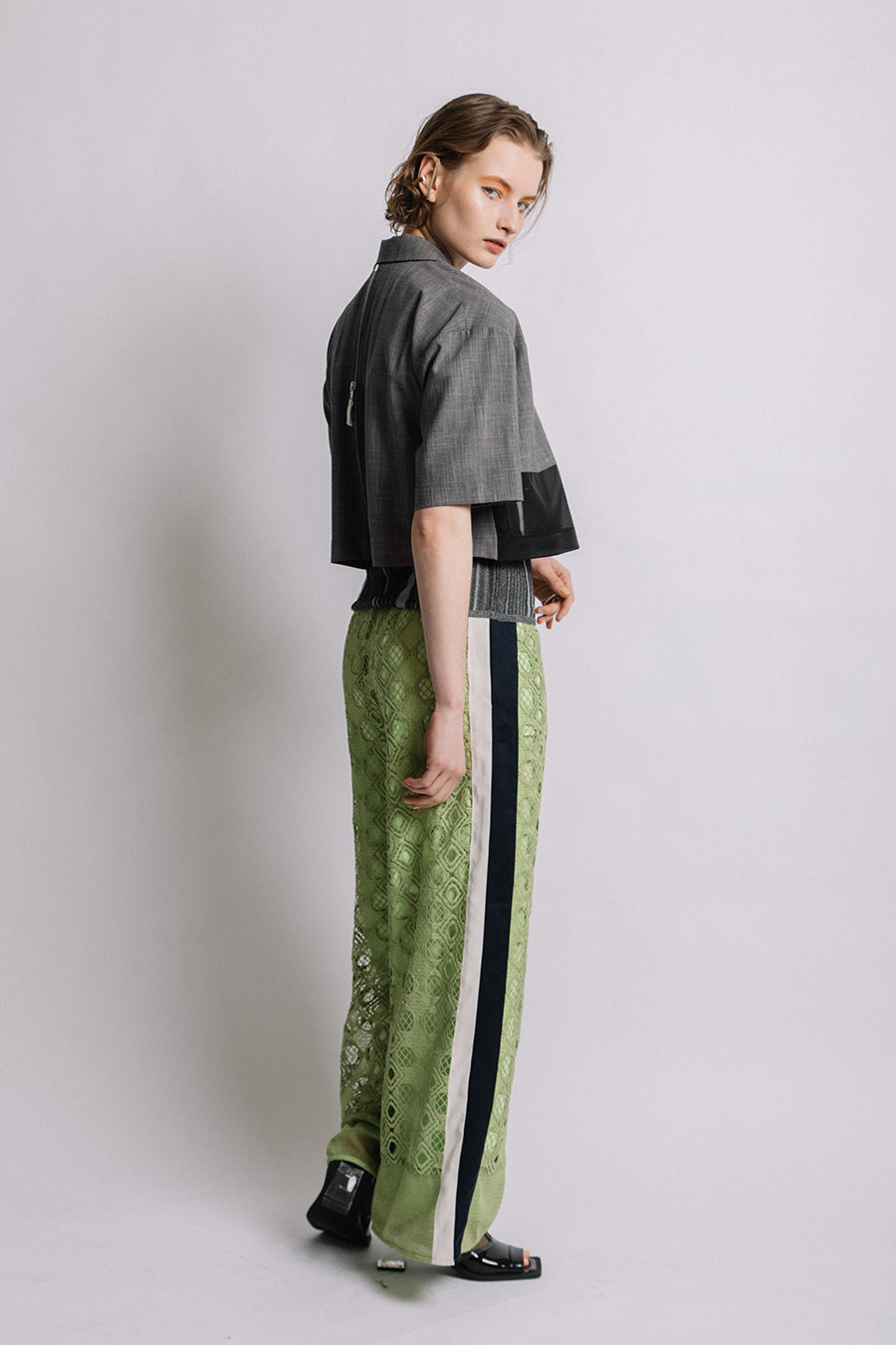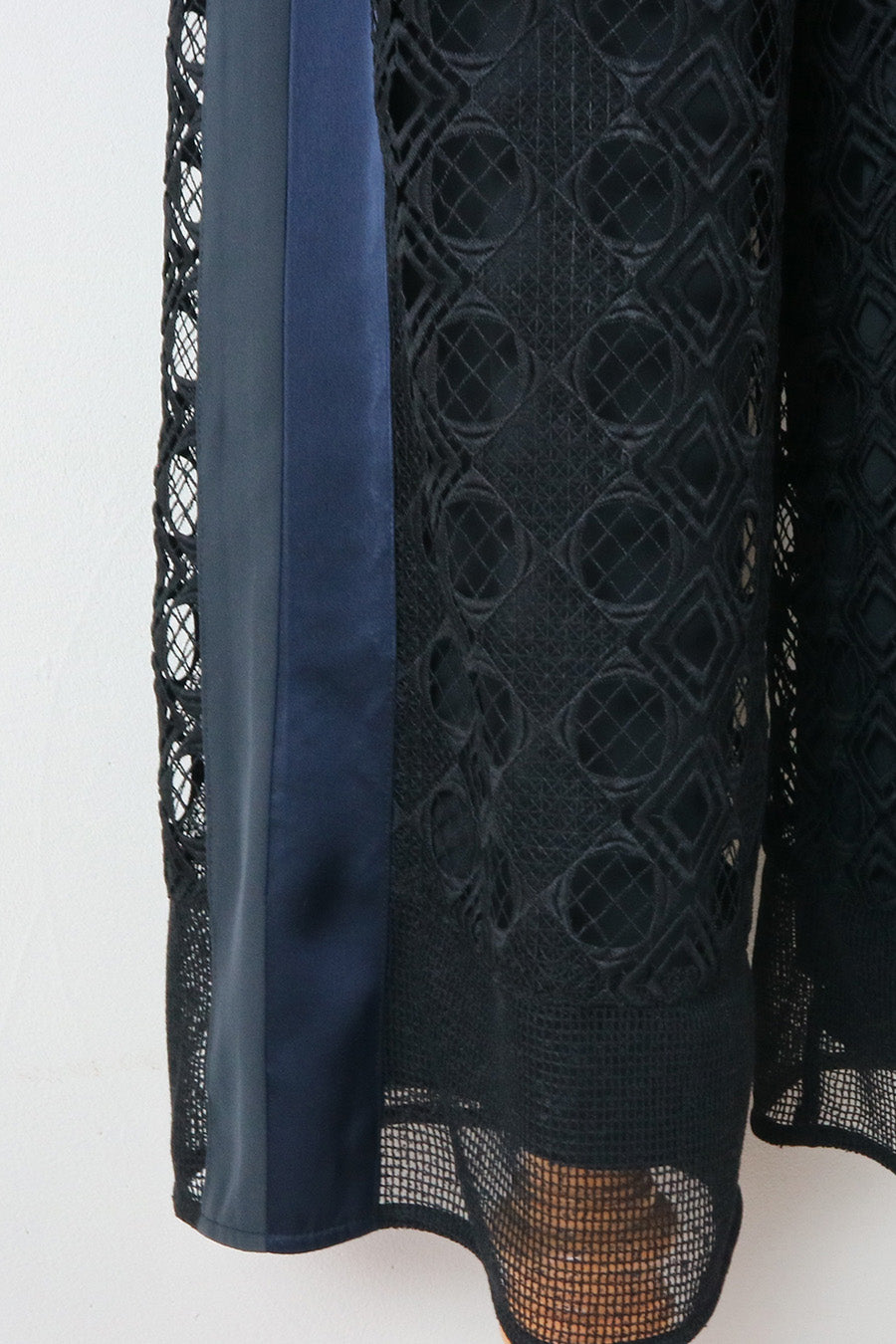 大小柄の2素材をコンビネーションしたパンツは、レースの透け感が涼し気で、夏らしいアイテム。幾何学柄レースと、裾切り替えには格子メッシュを使用。