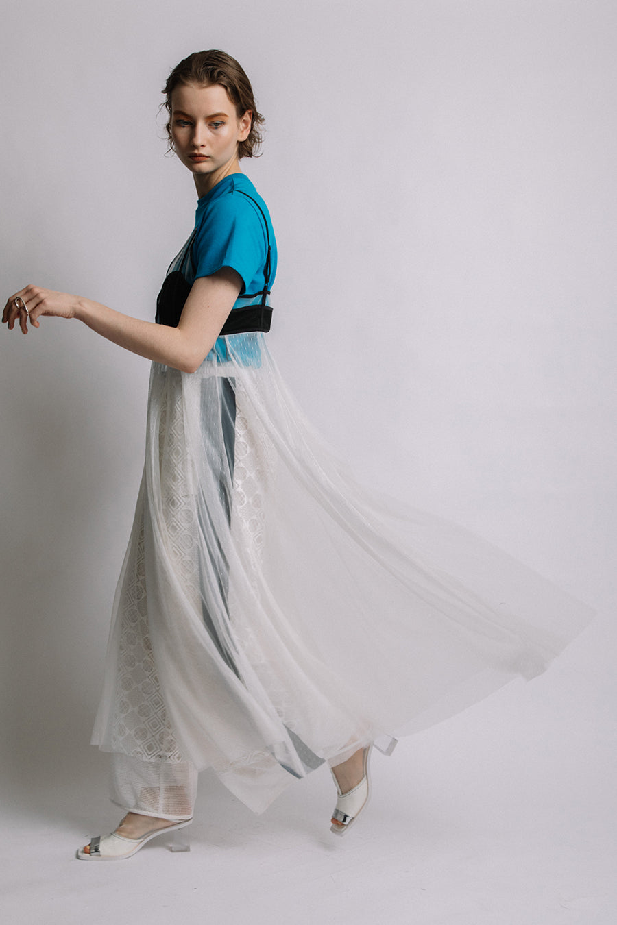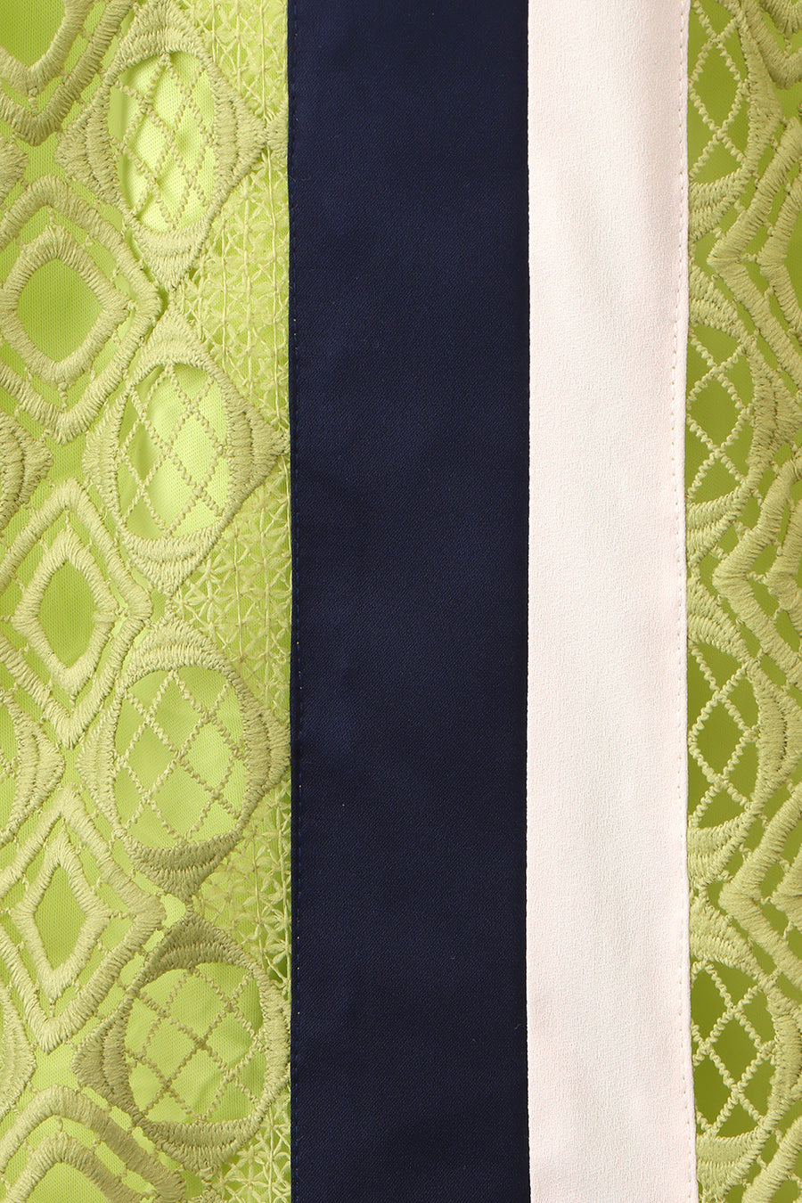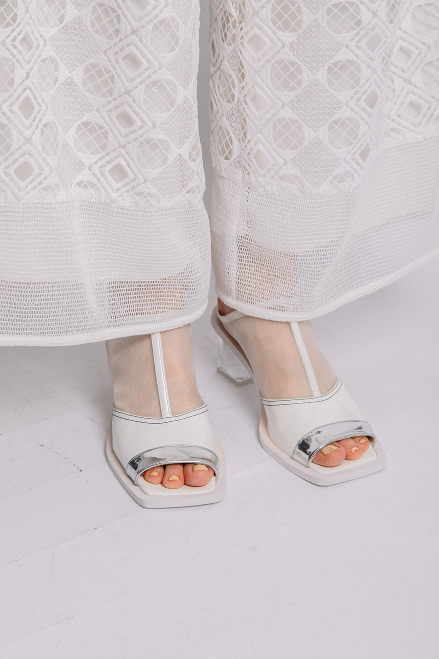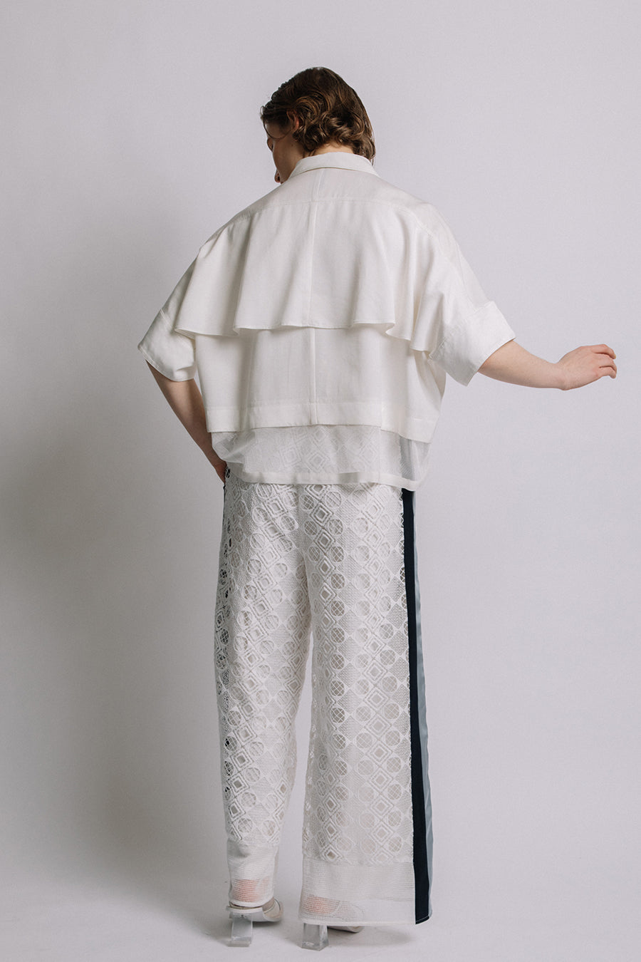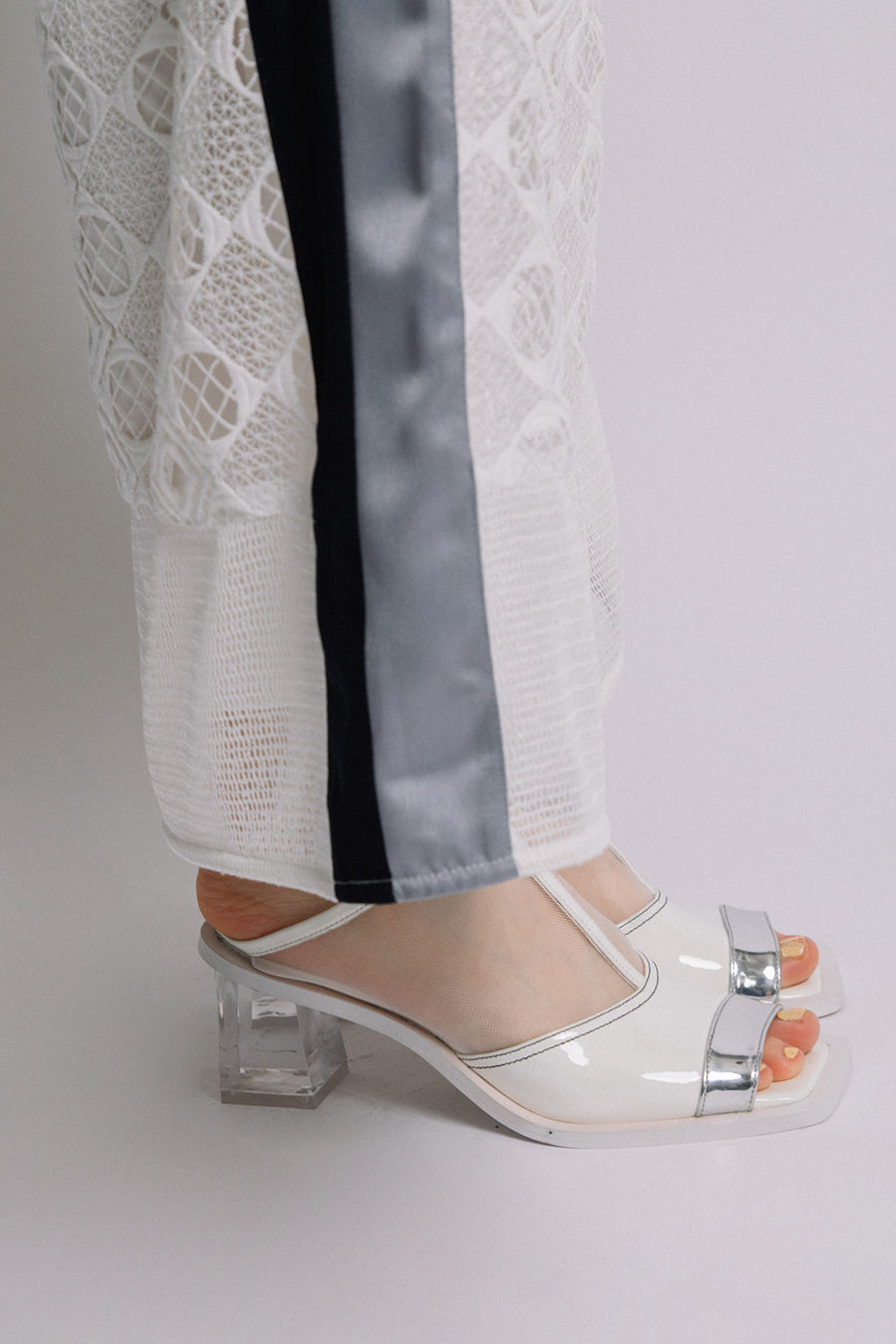 大小柄の2素材をコンビネーションしたパンツは、レースの透け感が涼し気で、夏らしいアイテム。幾何学柄レースと、裾切り替えには格子メッシュを使用。