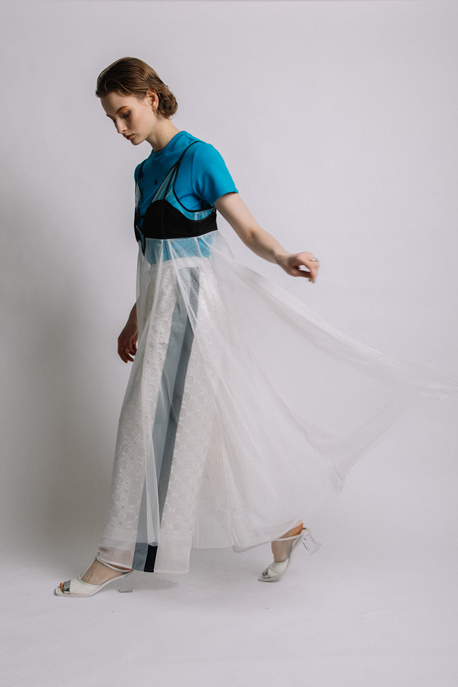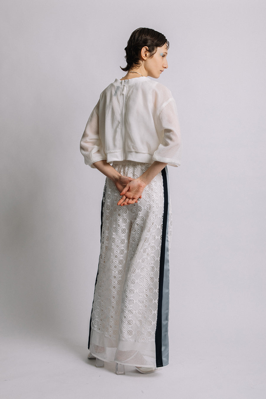 両脇には、2色のサテンとジョーゼットの配色ラインが入り、スポーティーなアクセントで細長効果も。ウエストはゴム入りのサイズフリーで、ドロスト仕様に。同素材のシャツも展開しているので、セットアップコーデもお勧め。