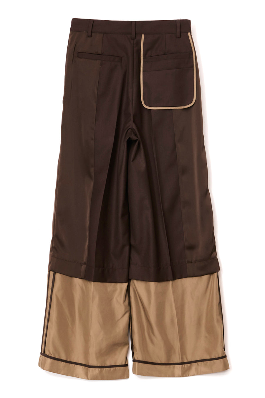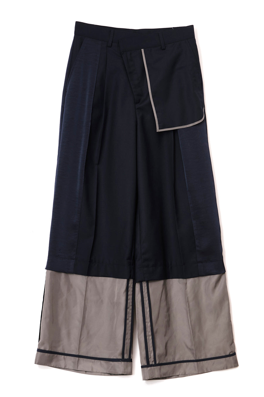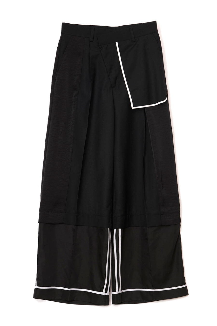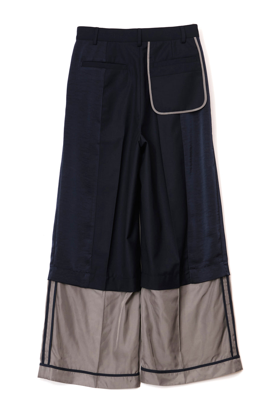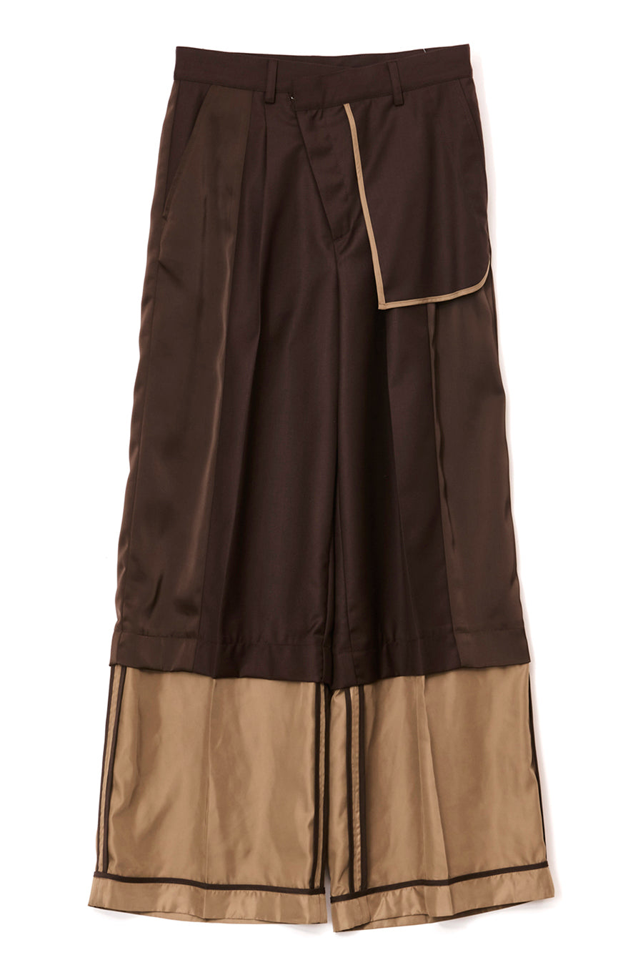 異素材の組み合わせが際立つレイヤード風のトラウザー。微光沢なサテン、柔らかな微起毛のTR、しっとりとしたポリエステルツイルを組み合わせ、カラーは同系色でまとめることで、さりげないコントラストを演出。配色のパイピングが全体を引き締めスタイリッシュな印象に。あえてポケットを表出しにすることでモードなアクセントをプラス。ウエストはさりげないオーバーラップ仕様になっており、細かいディテールにもこだわった1枚。洗練されたシルエットながらも、動きのある表情が楽しめるトラウザーは、シンプルなトップスを合わせるのはもちろん、ニットカーデなどボリュームのあるニットを合わせて着るのもおすすめ。
