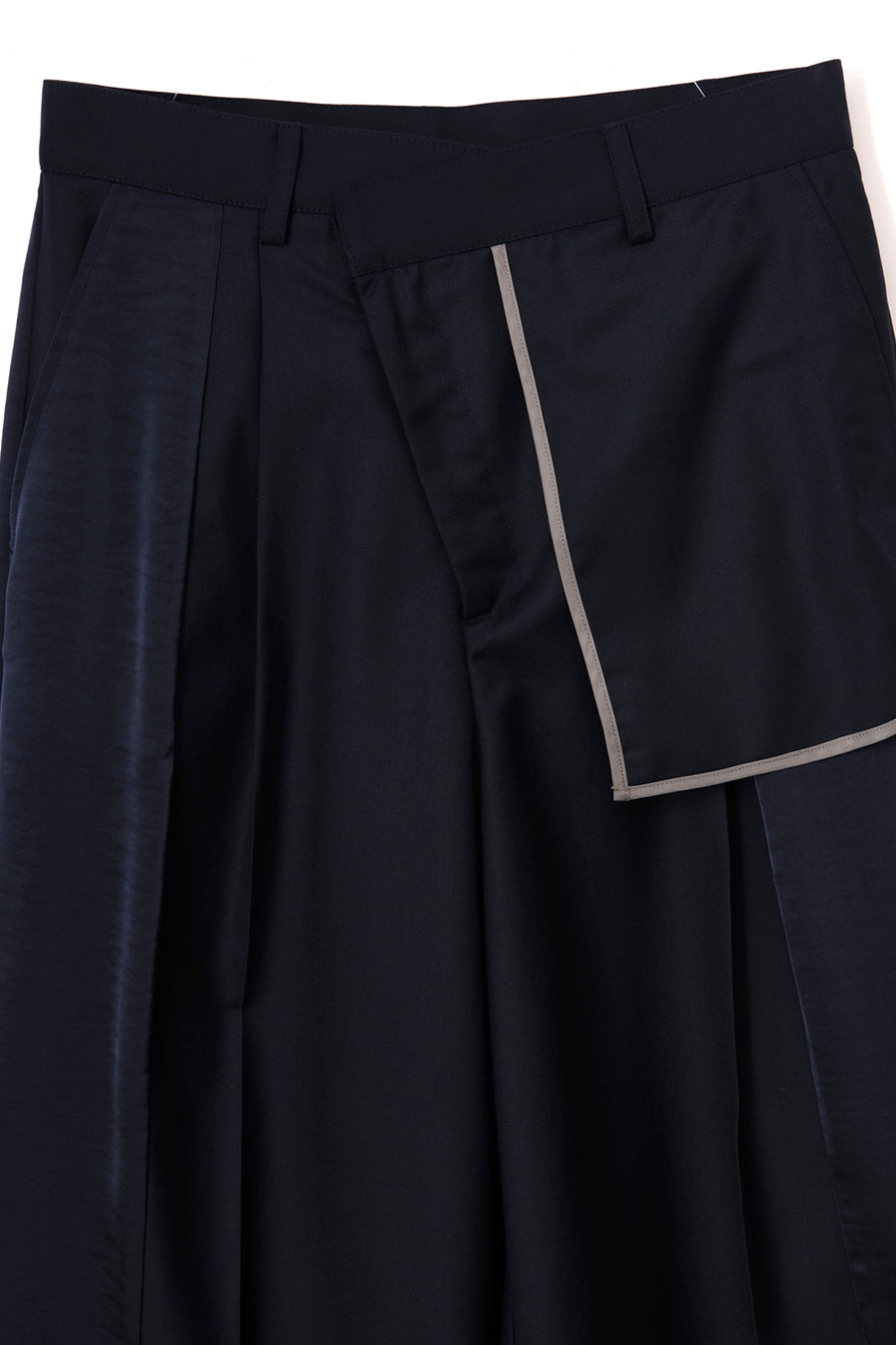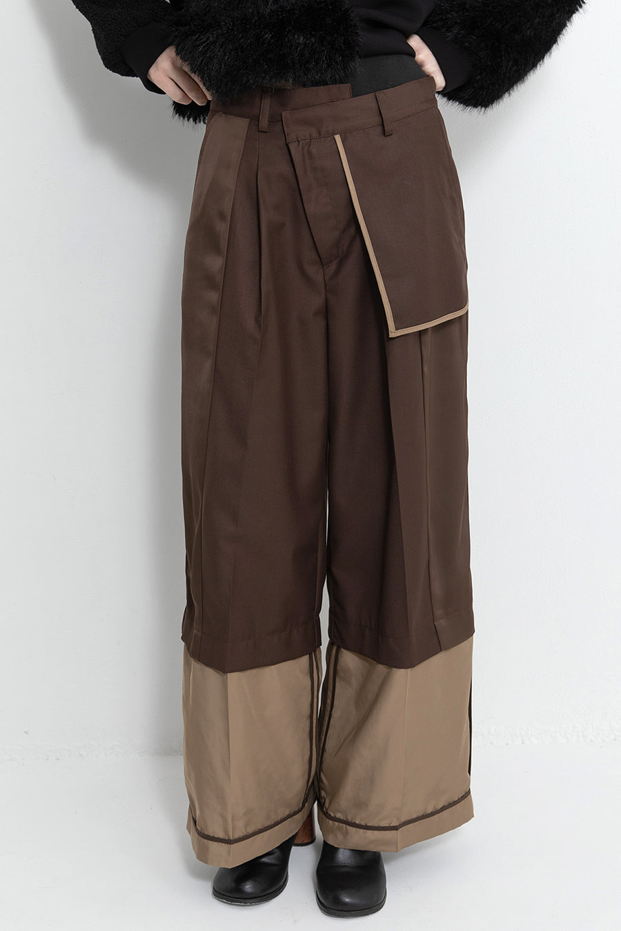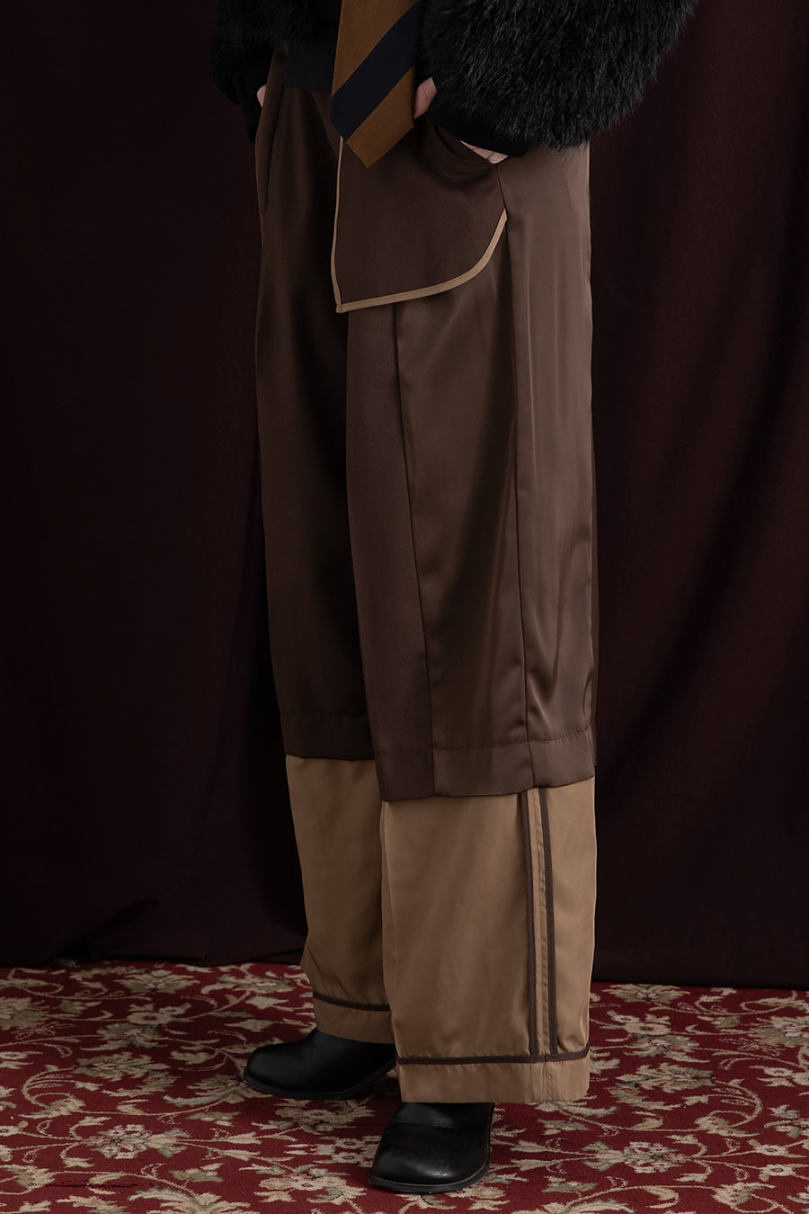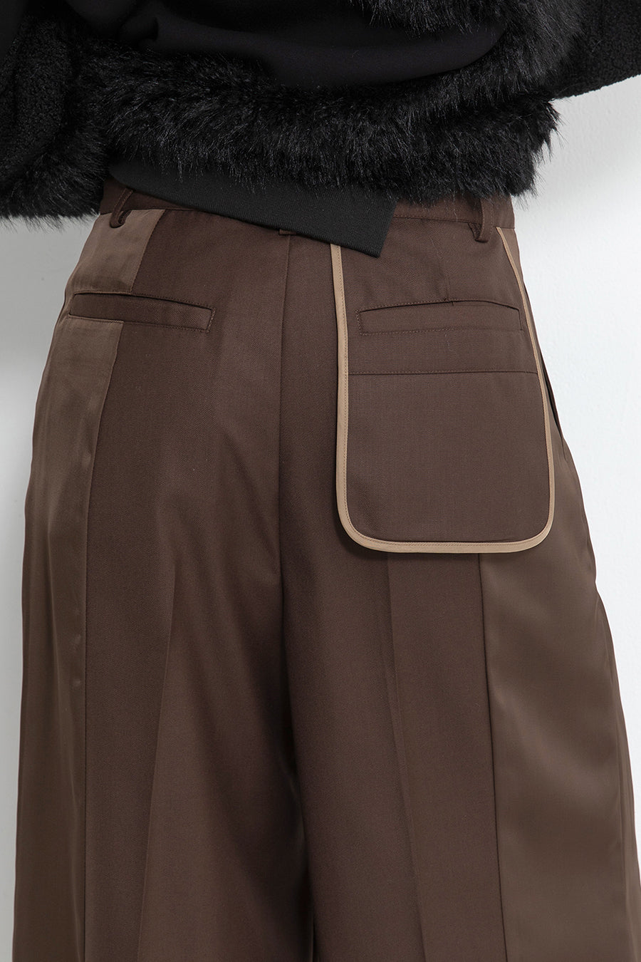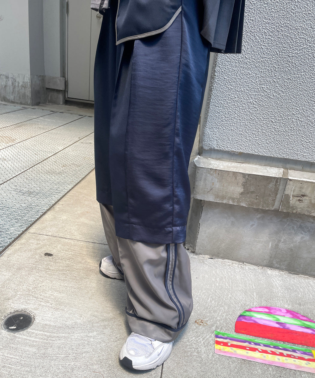 異素材の組み合わせが際立つレイヤード風のトラウザー。微光沢なサテン、柔らかな微起毛のTR、しっとりとしたポリエステルツイルを組み合わせ、カラーは同系色でまとめることで、さりげないコントラストを演出。配色のパイピングが全体を引き締めスタイリッシュな印象に。あえてポケットを表出しにすることでモードなアクセントをプラス。ウエストはさりげないオーバーラップ仕様になっており、細かいディテールにもこだわった1枚。洗練されたシルエットながらも、動きのある表情が楽しめるトラウザーは、シンプルなトップスを合わせるのはもちろん、ニットカーデなどボリュームのあるニットを合わせて着るのもおすすめ。
