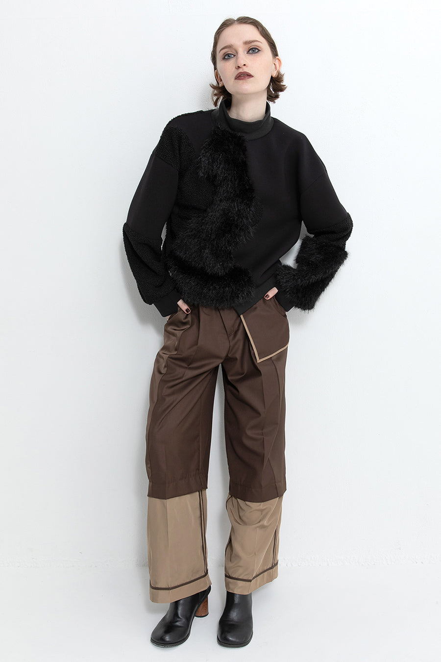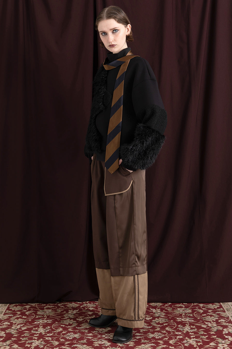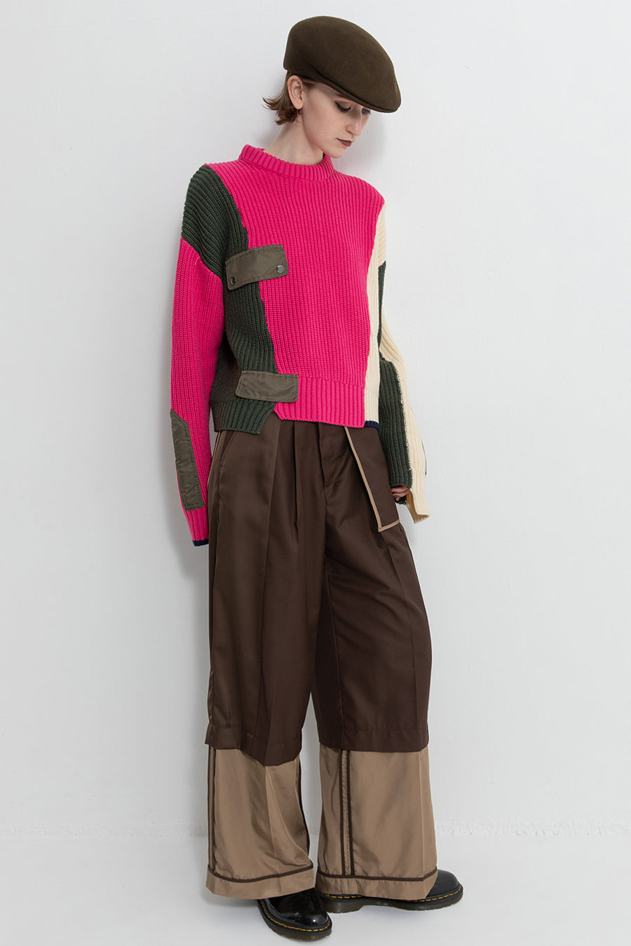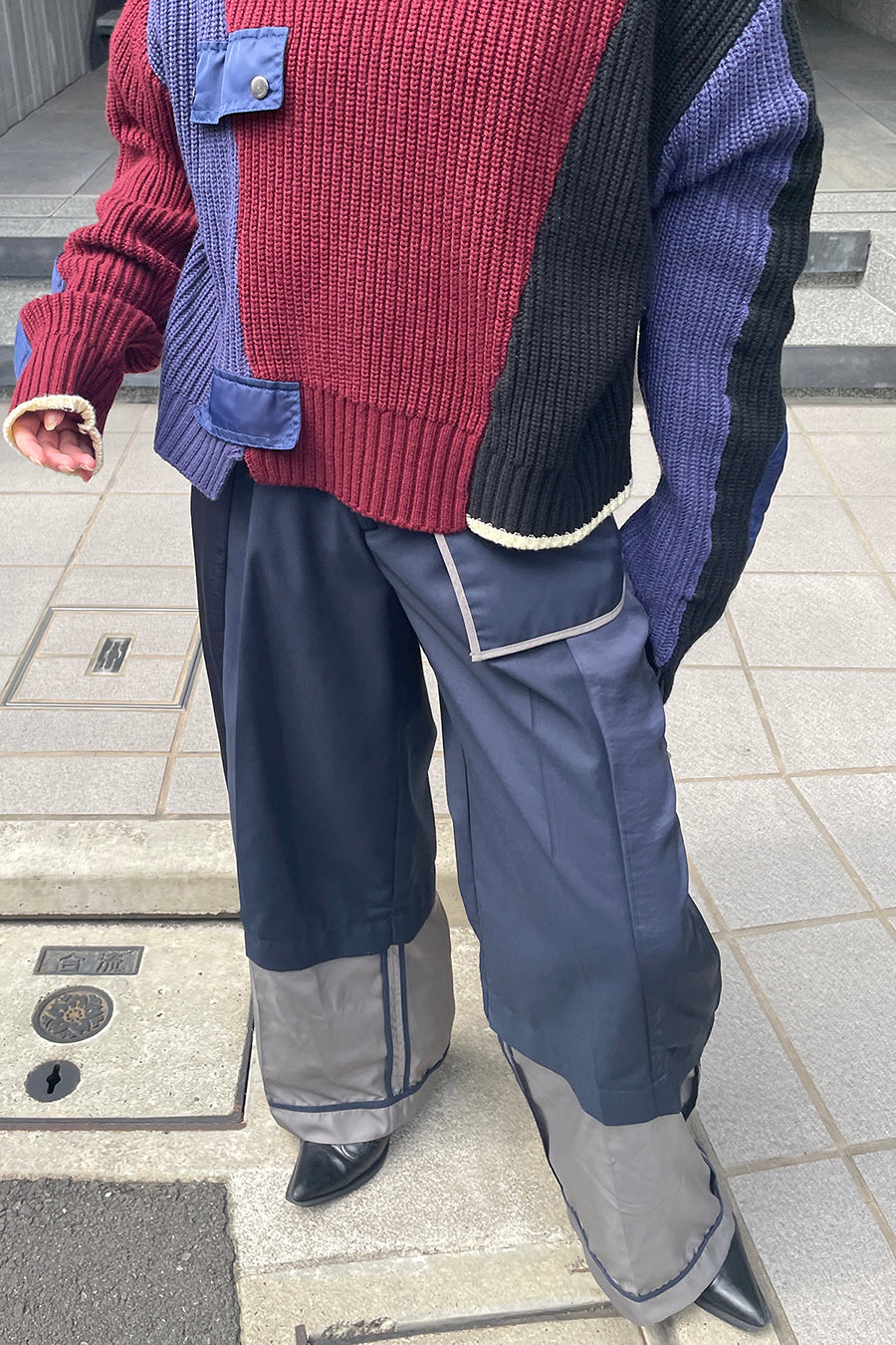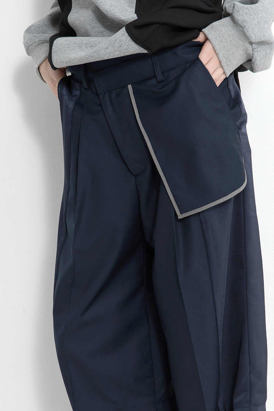 異素材の組み合わせが際立つレイヤード風のトラウザー。微光沢なサテン、柔らかな微起毛のTR、しっとりとしたポリエステルツイルを組み合わせ、カラーは同系色でまとめることで、さりげないコントラストを演出。配色のパイピングが全体を引き締めスタイリッシュな印象に。あえてポケットを表出しにすることでモードなアクセントをプラス。ウエストはさりげないオーバーラップ仕様になっており、細かいディテールにもこだわった1枚。洗練されたシルエットながらも、動きのある表情が楽しめるトラウザーは、シンプルなトップスを合わせるのはもちろん、ニットカーデなどボリュームのあるニットを合わせて着るのもおすすめ。