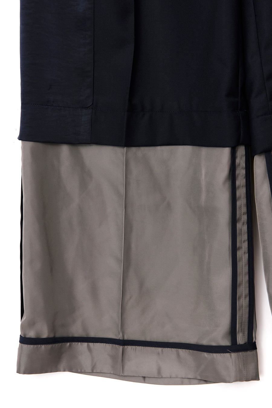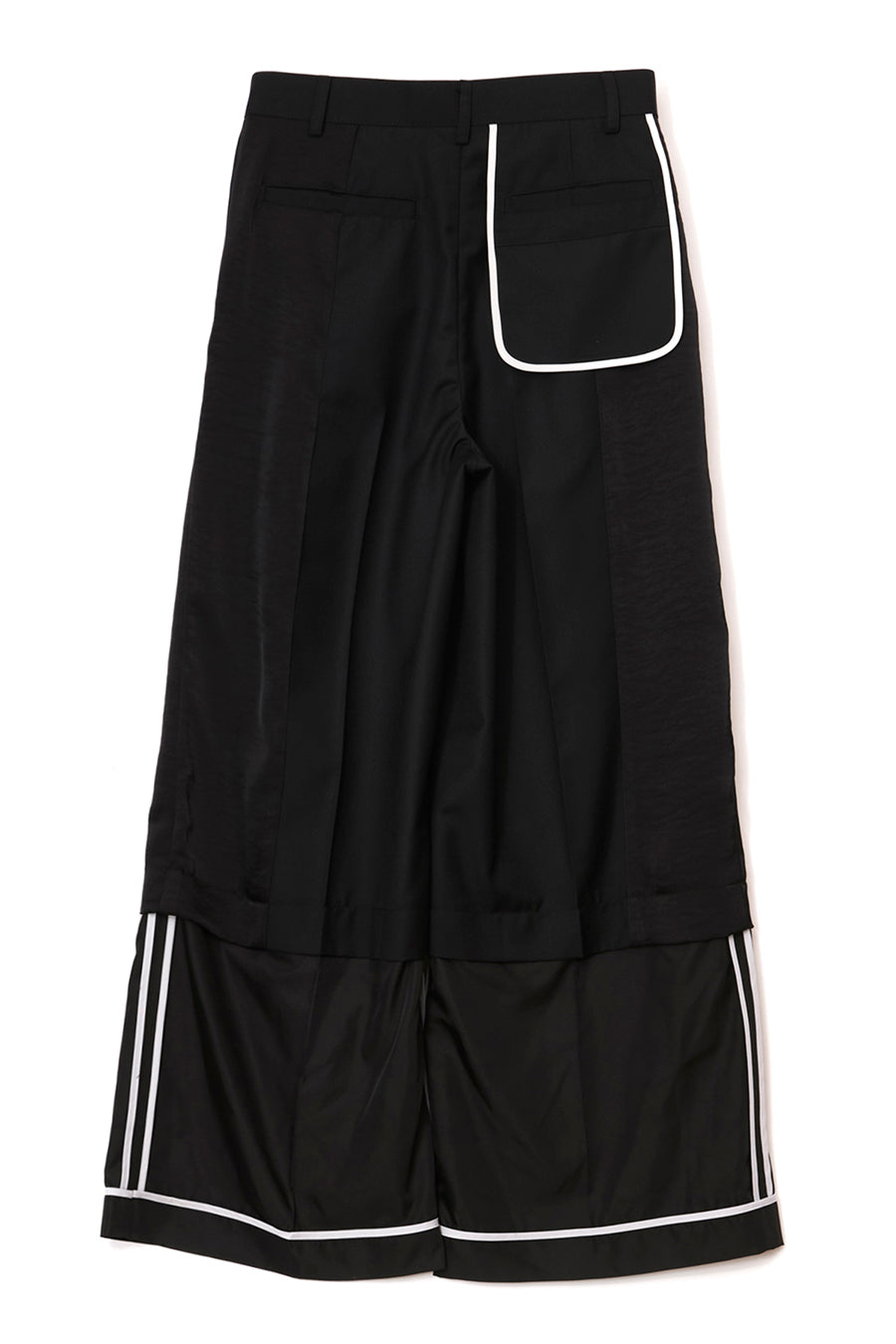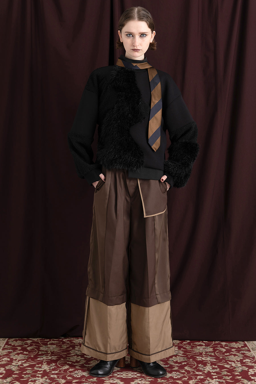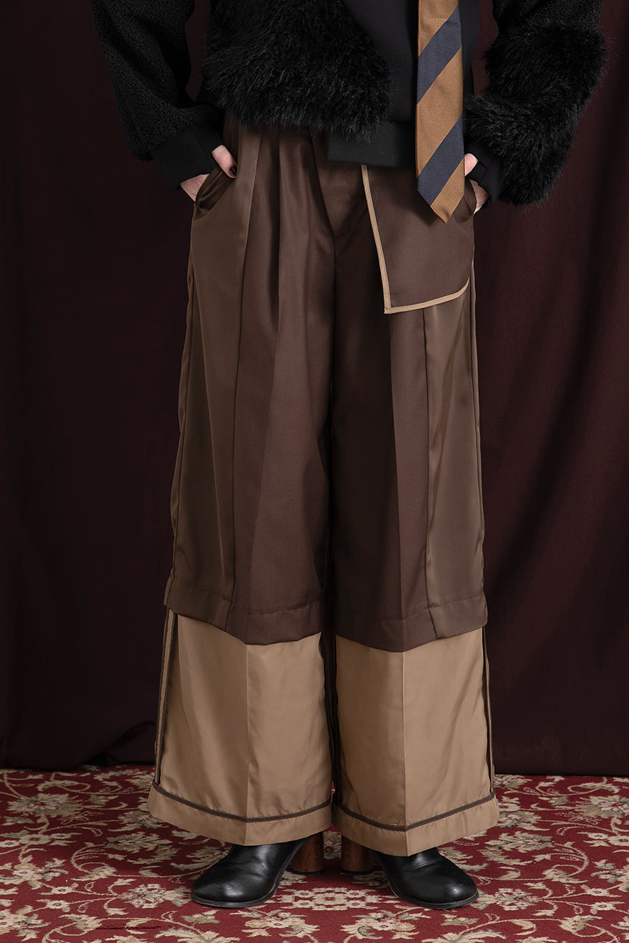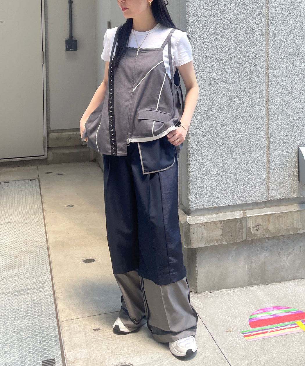 異素材の組み合わせが際立つレイヤード風のトラウザー。微光沢なサテン、柔らかな微起毛のTR、しっとりとしたポリエステルツイルを組み合わせ、カラーは同系色でまとめることで、さりげないコントラストを演出。配色のパイピングが全体を引き締めスタイリッシュな印象に。あえてポケットを表出しにすることでモードなアクセントをプラス。ウエストはさりげないオーバーラップ仕様になっており、細かいディテールにもこだわった1枚。洗練されたシルエットながらも、動きのある表情が楽しめるトラウザーは、シンプルなトップスを合わせるのはもちろん、ニットカーデなどボリュームのあるニットを合わせて着るのもおすすめ。