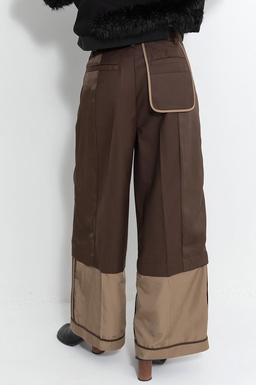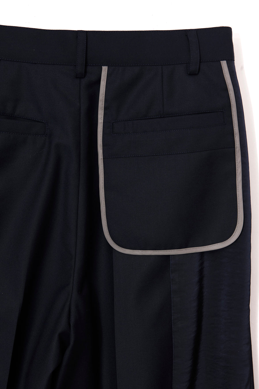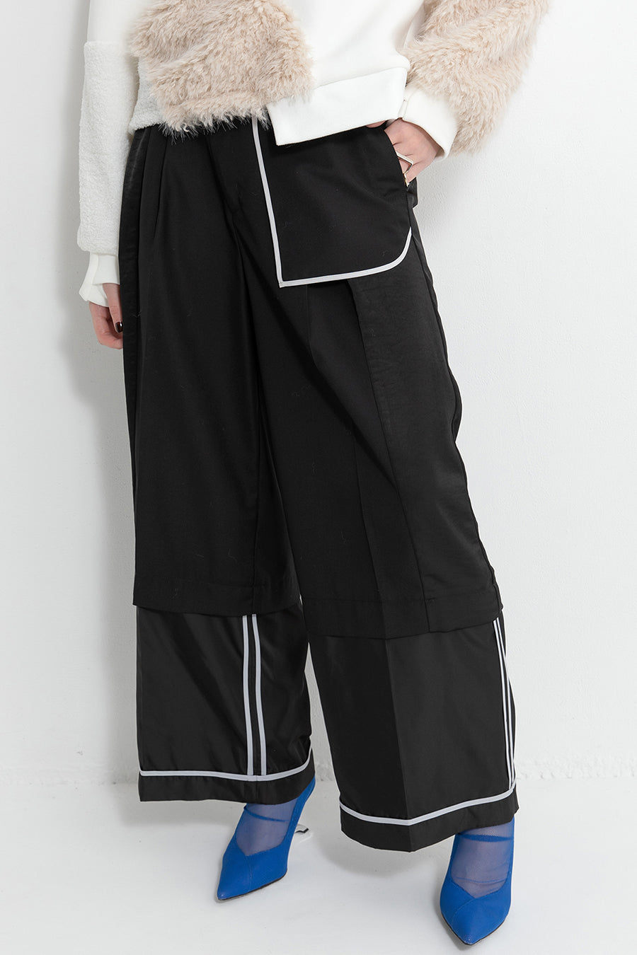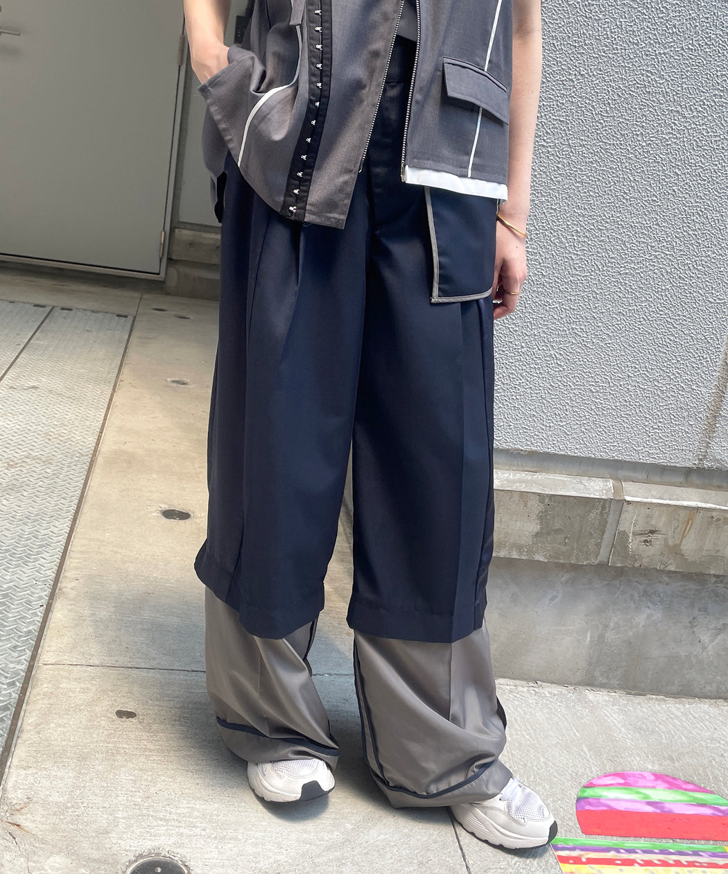 異素材の組み合わせが際立つレイヤード風のトラウザー。微光沢なサテン、柔らかな微起毛のTR、しっとりとしたポリエステルツイルを組み合わせ、カラーは同系色でまとめることで、さりげないコントラストを演出。配色のパイピングが全体を引き締めスタイリッシュな印象に。あえてポケットを表出しにすることでモードなアクセントをプラス。ウエストはさりげないオーバーラップ仕様になっており、細かいディテールにもこだわった1枚。洗練されたシルエットながらも、動きのある表情が楽しめるトラウザーは、シンプルなトップスを合わせるのはもちろん、ニットカーデなどボリュームのあるニットを合わせて着るのもおすすめ。