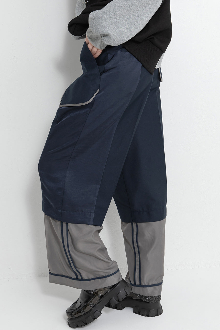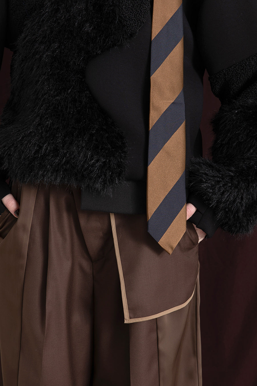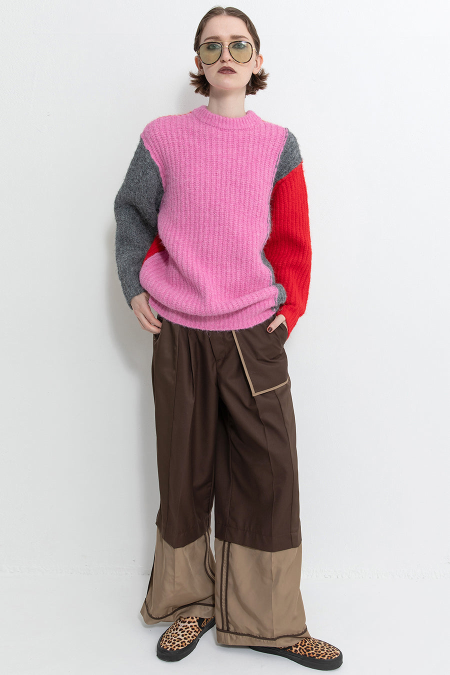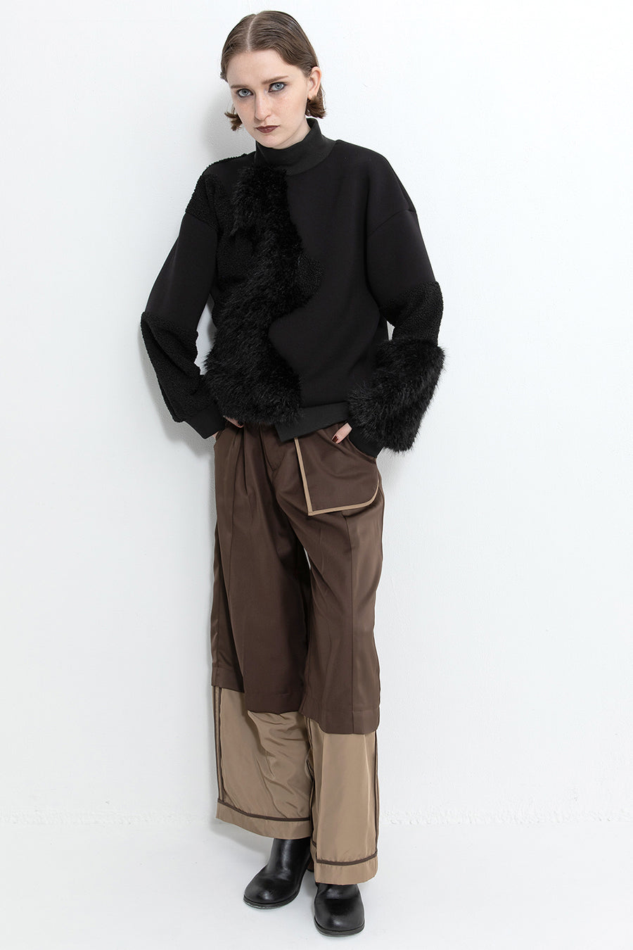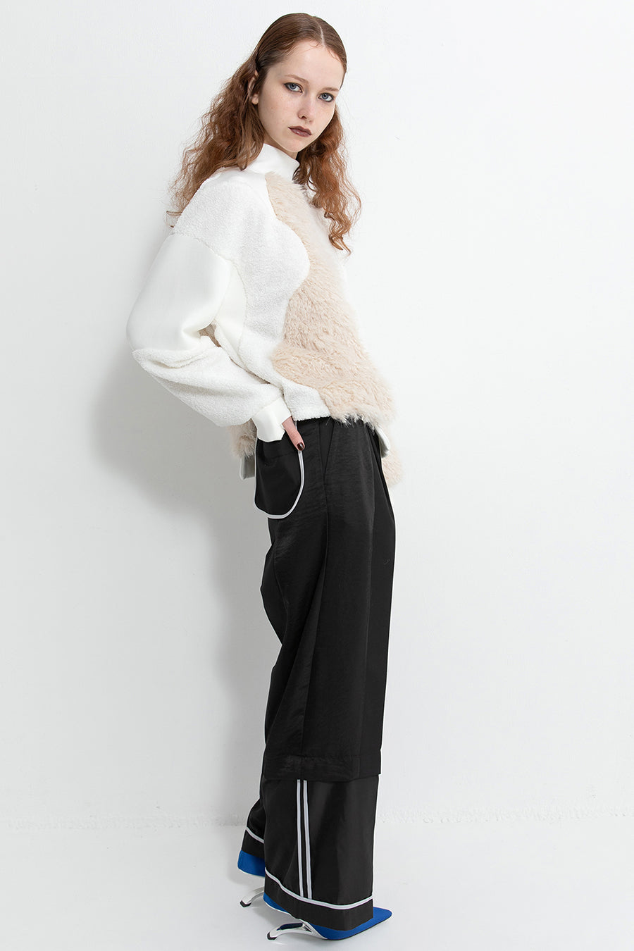 異素材の組み合わせが際立つレイヤード風のトラウザー。微光沢なサテン、柔らかな微起毛のTR、しっとりとしたポリエステルツイルを組み合わせ、カラーは同系色でまとめることで、さりげないコントラストを演出。配色のパイピングが全体を引き締めスタイリッシュな印象に。あえてポケットを表出しにすることでモードなアクセントをプラス。ウエストはさりげないオーバーラップ仕様になっており、細かいディテールにもこだわった1枚。洗練されたシルエットながらも、動きのある表情が楽しめるトラウザーは、シンプルなトップスを合わせるのはもちろん、ニットカーデなどボリュームのあるニットを合わせて着るのもおすすめ。
