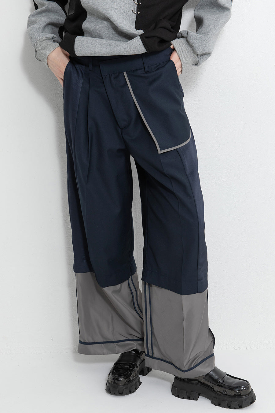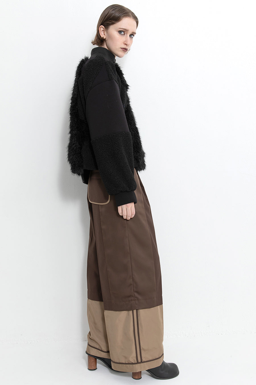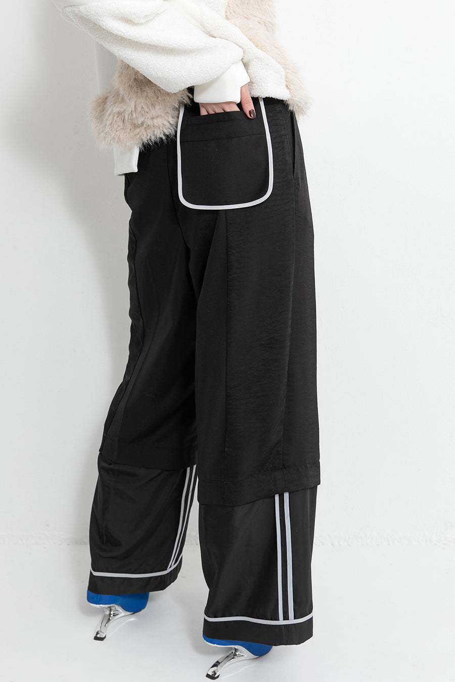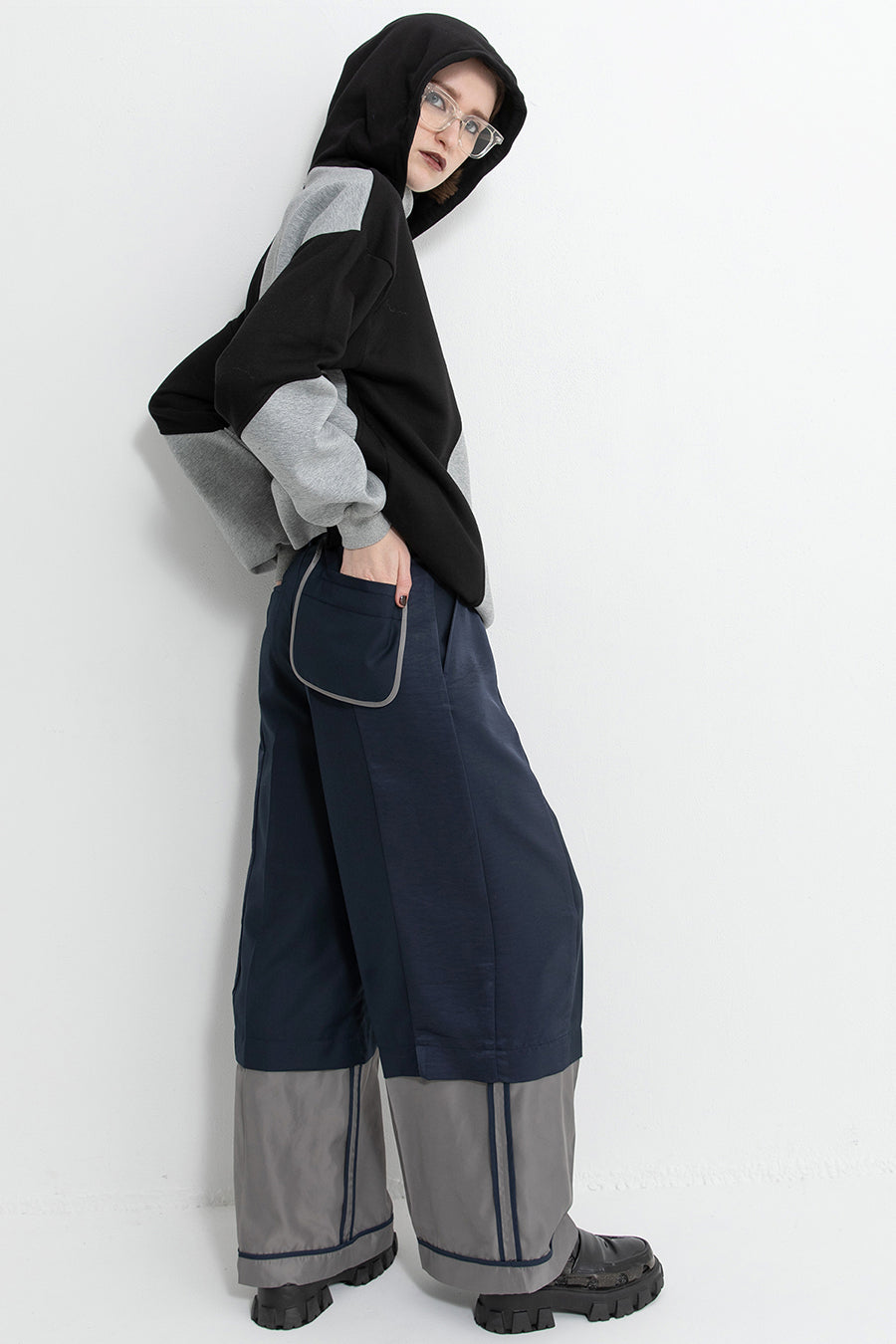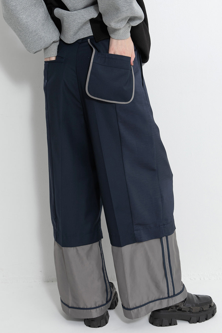 異素材の組み合わせが際立つレイヤード風のトラウザー。微光沢なサテン、柔らかな微起毛のTR、しっとりとしたポリエステルツイルを組み合わせ、カラーは同系色でまとめることで、さりげないコントラストを演出。配色のパイピングが全体を引き締めスタイリッシュな印象に。あえてポケットを表出しにすることでモードなアクセントをプラス。ウエストはさりげないオーバーラップ仕様になっており、細かいディテールにもこだわった1枚。洗練されたシルエットながらも、動きのある表情が楽しめるトラウザーは、シンプルなトップスを合わせるのはもちろん、ニットカーデなどボリュームのあるニットを合わせて着るのもおすすめ。