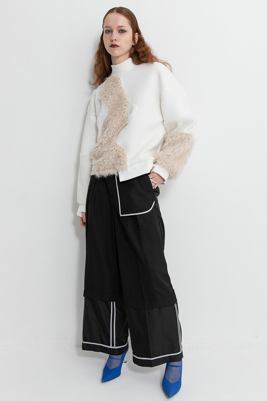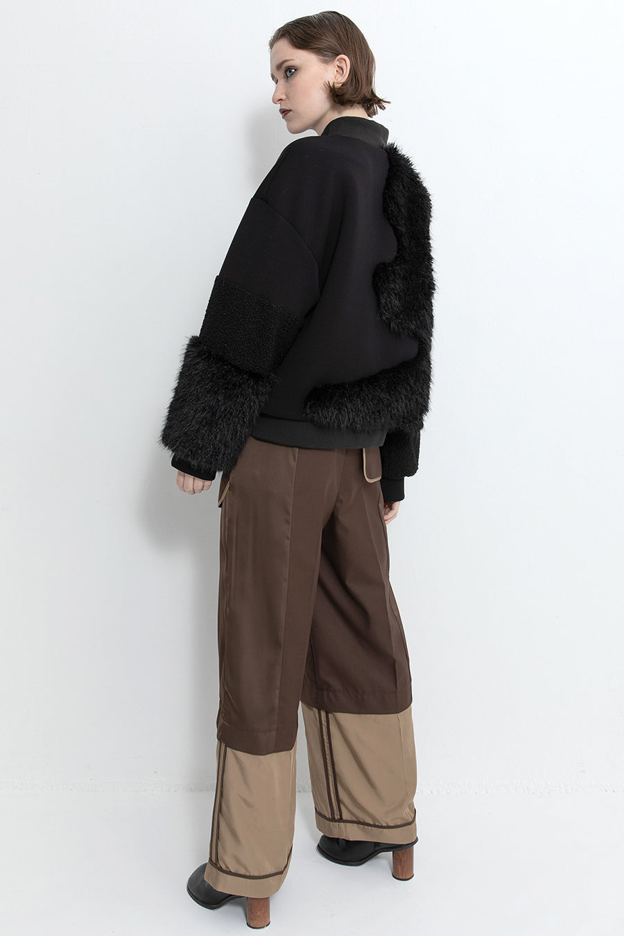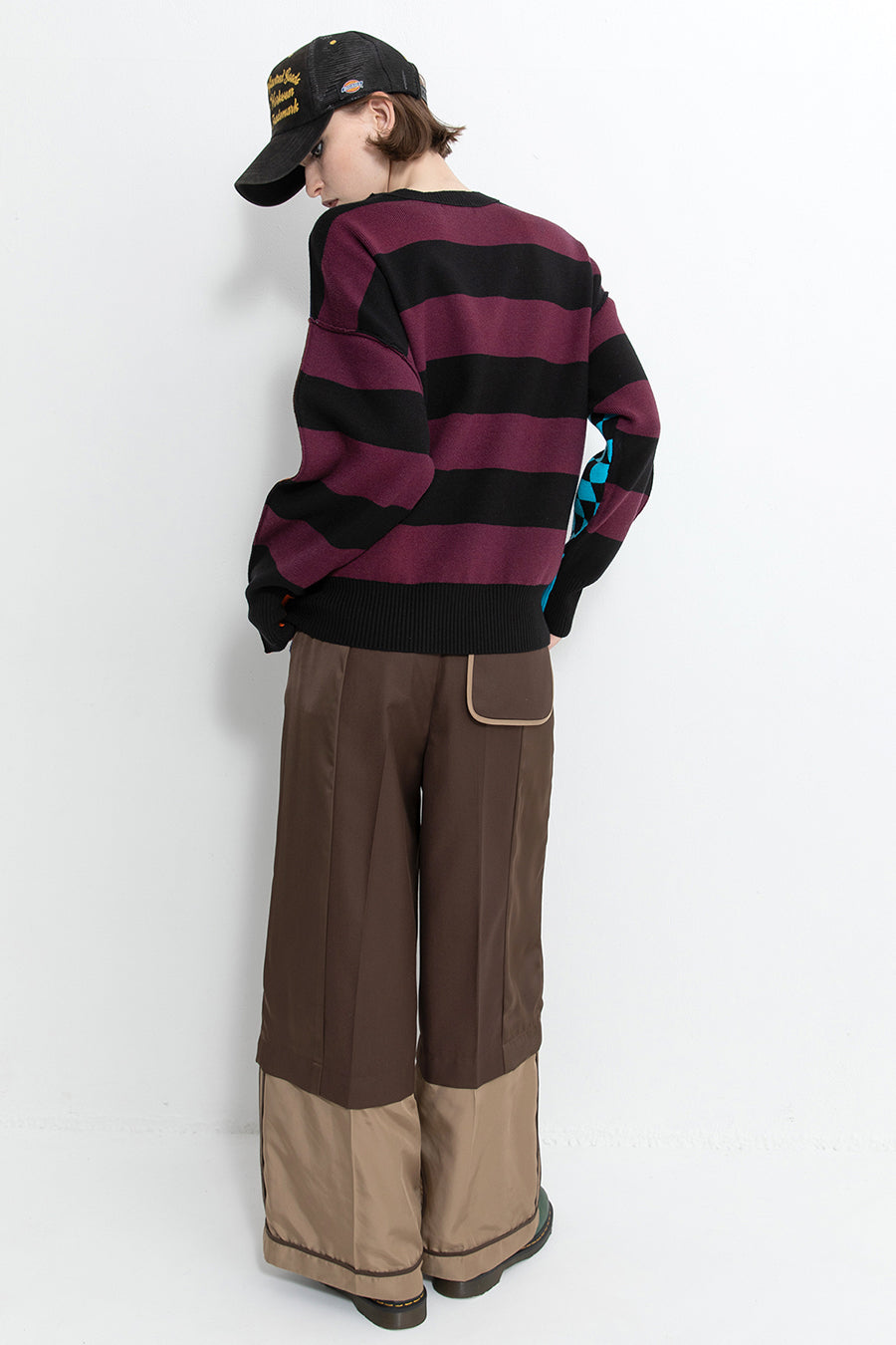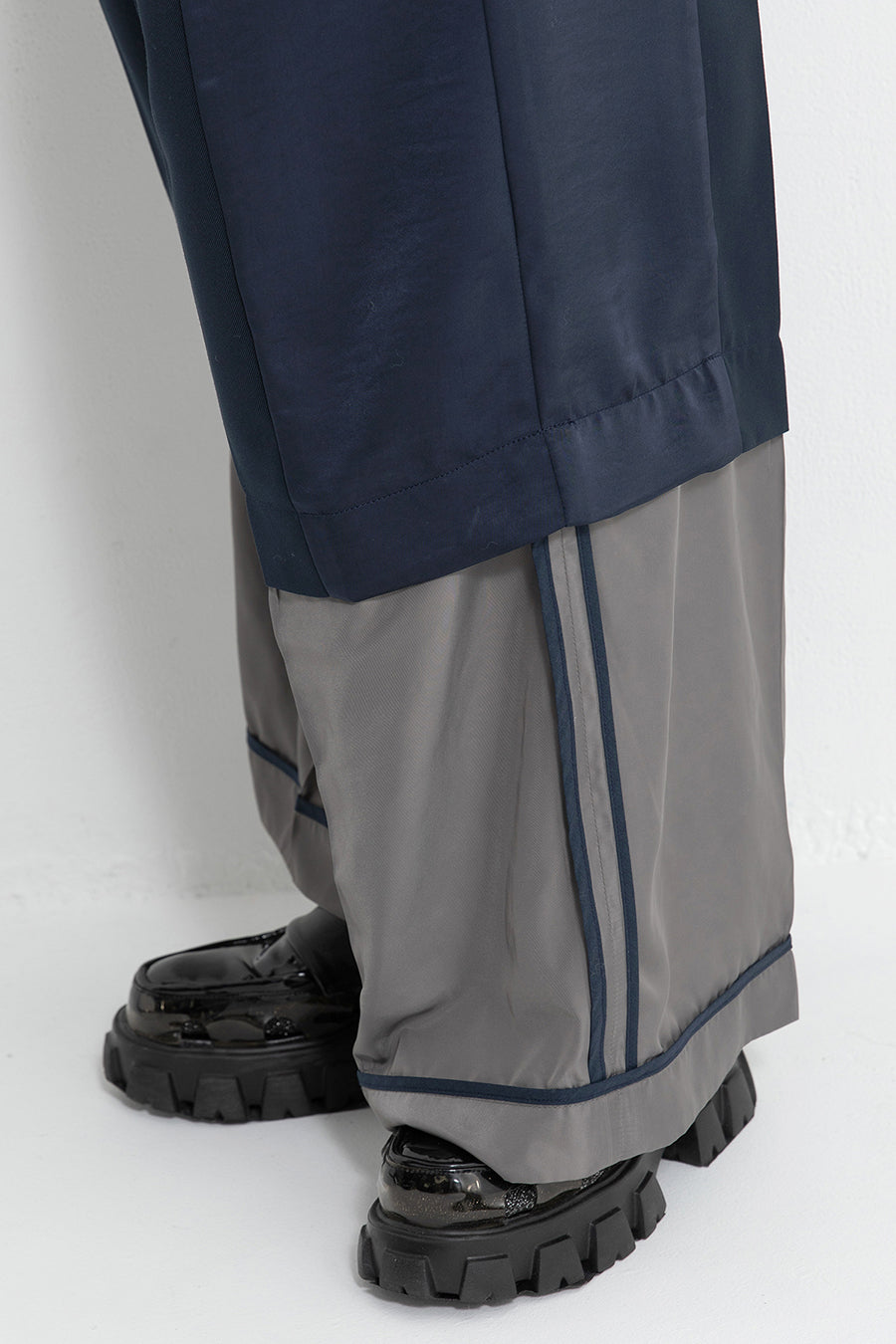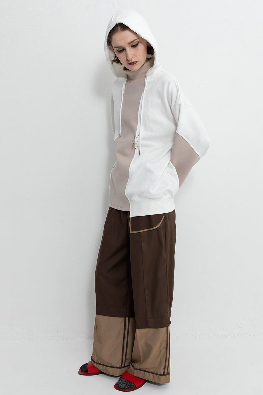異素材の組み合わせが際立つレイヤード風のトラウザー。微光沢なサテン、柔らかな微起毛のTR、しっとりとしたポリエステルツイルを組み合わせ、カラーは同系色でまとめることで、さりげないコントラストを演出。配色のパイピングが全体を引き締めスタイリッシュな印象に。あえてポケットを表出しにすることでモードなアクセントをプラス。ウエストはさりげないオーバーラップ仕様になっており、細かいディテールにもこだわった1枚。洗練されたシルエットながらも、動きのある表情が楽しめるトラウザーは、シンプルなトップスを合わせるのはもちろん、ニットカーデなどボリュームのあるニットを合わせて着るのもおすすめ。