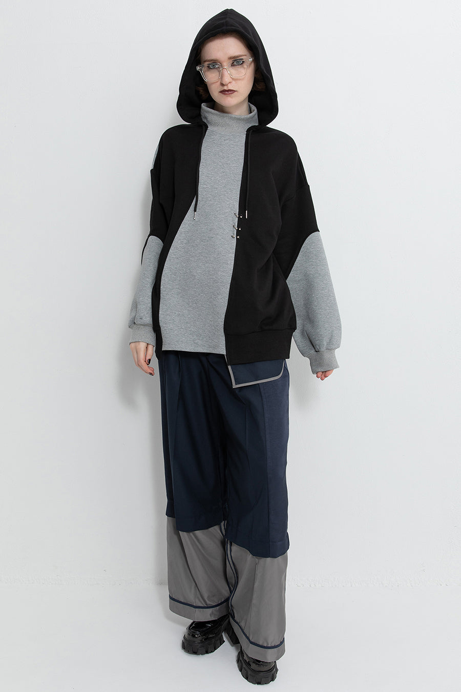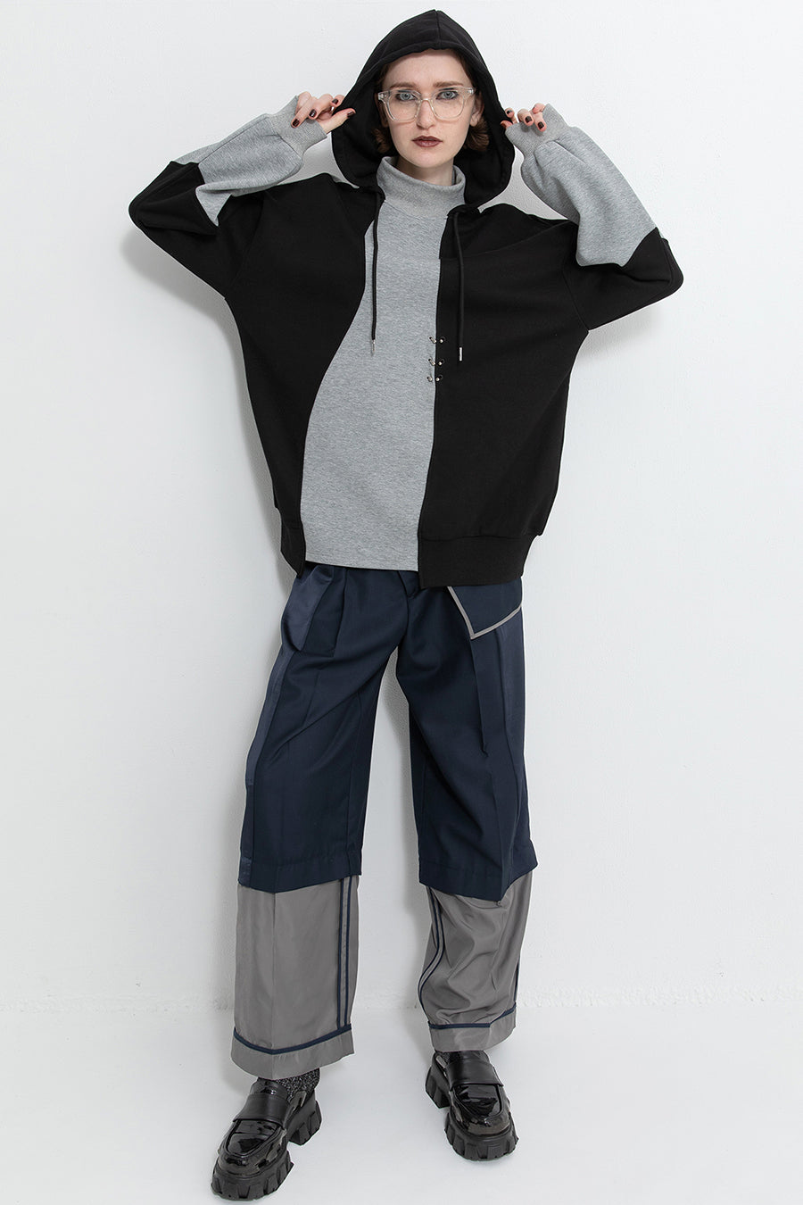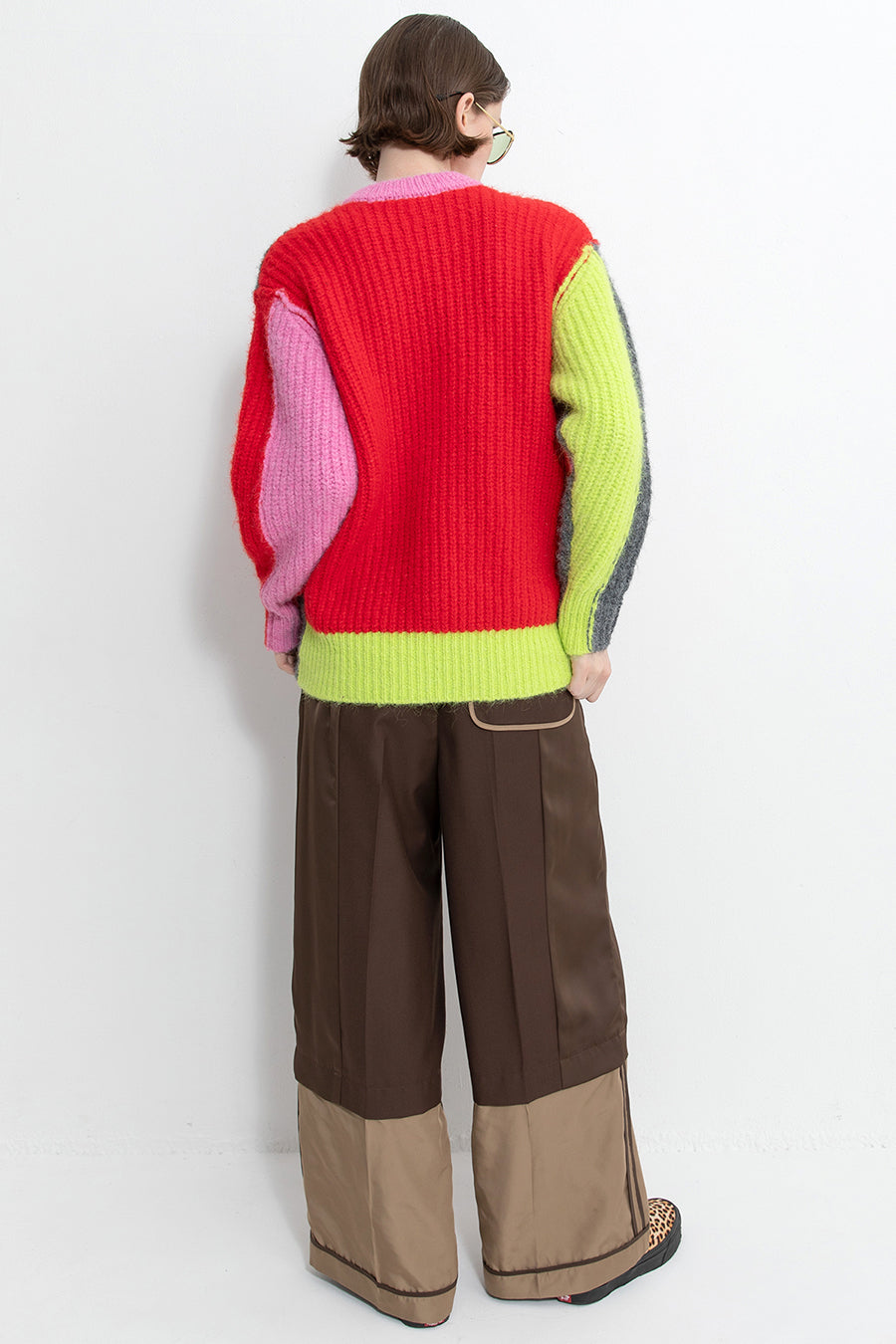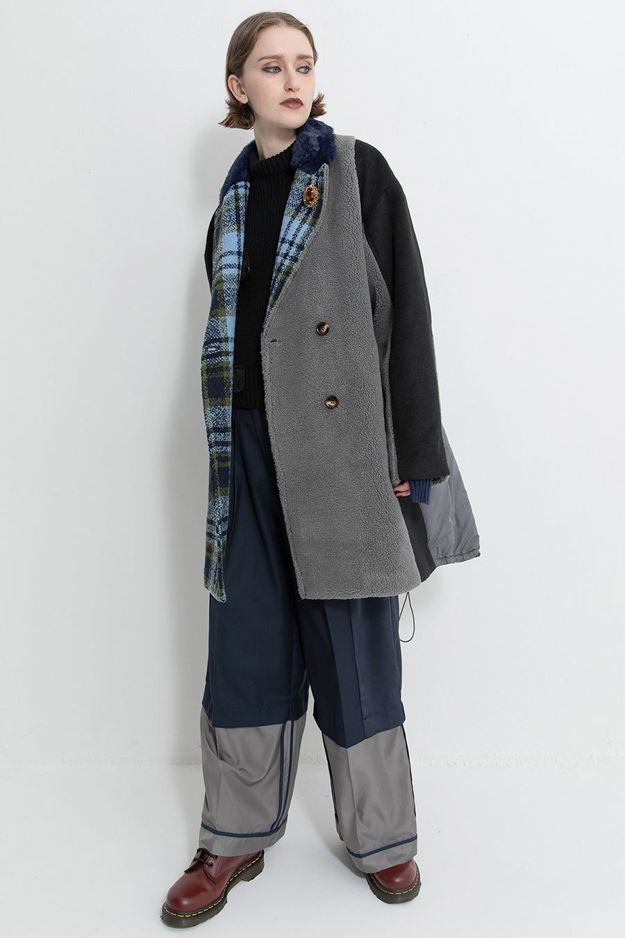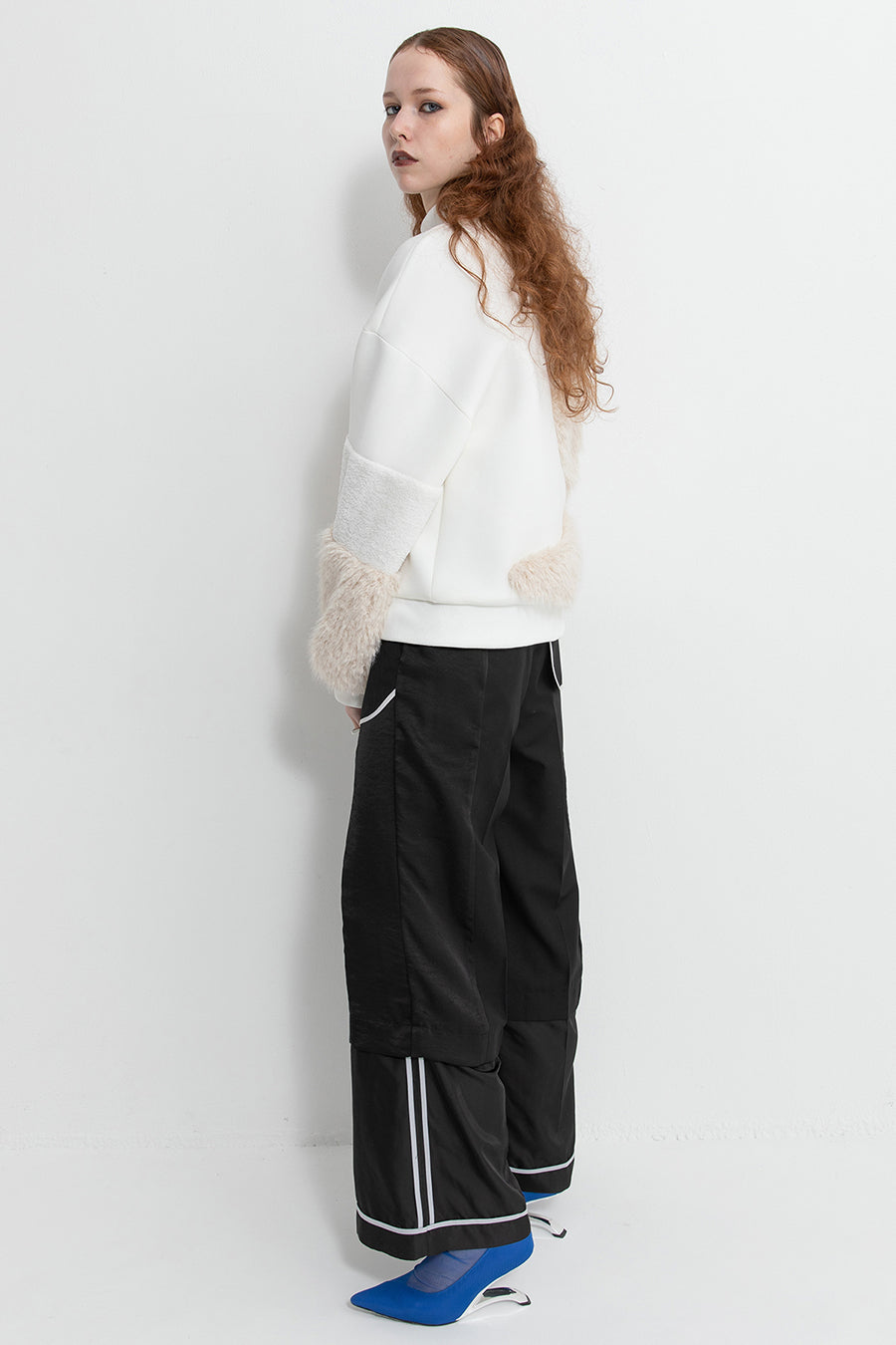 異素材の組み合わせが際立つレイヤード風のトラウザー。微光沢なサテン、柔らかな微起毛のTR、しっとりとしたポリエステルツイルを組み合わせ、カラーは同系色でまとめることで、さりげないコントラストを演出。配色のパイピングが全体を引き締めスタイリッシュな印象に。あえてポケットを表出しにすることでモードなアクセントをプラス。ウエストはさりげないオーバーラップ仕様になっており、細かいディテールにもこだわった1枚。洗練されたシルエットながらも、動きのある表情が楽しめるトラウザーは、シンプルなトップスを合わせるのはもちろん、ニットカーデなどボリュームのあるニットを合わせて着るのもおすすめ。