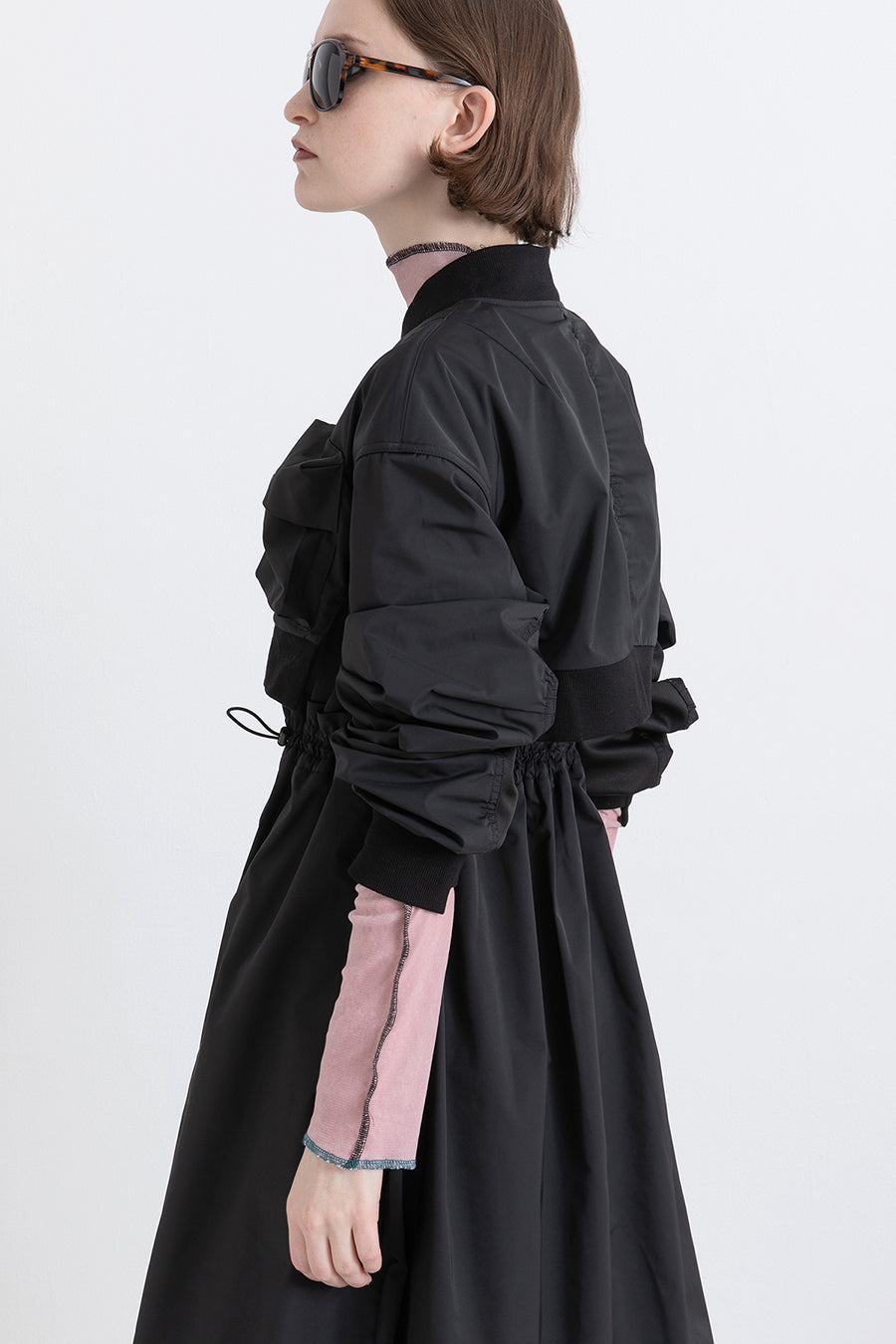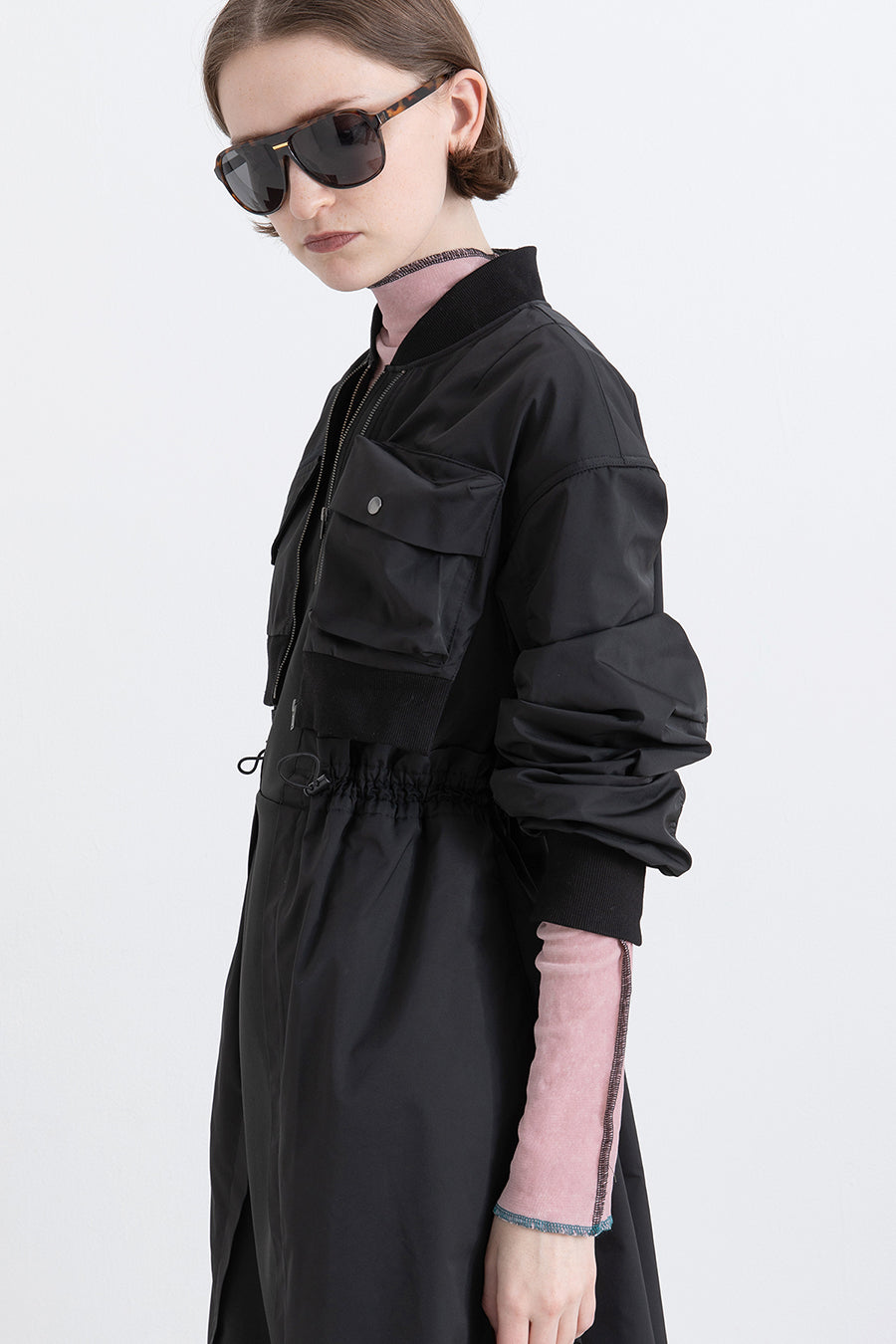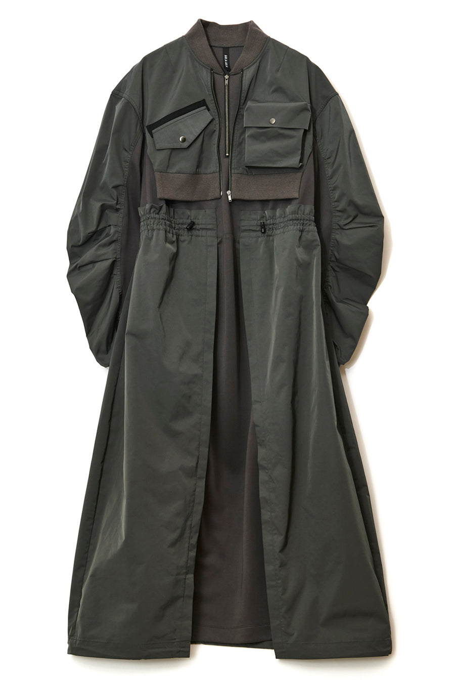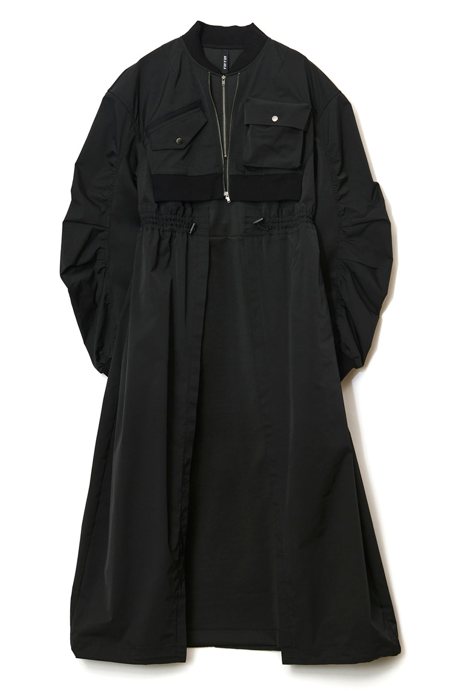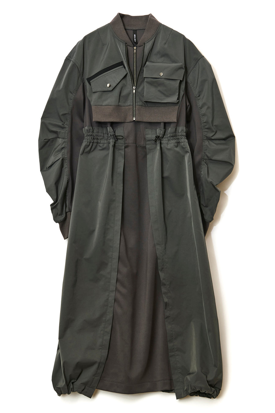 ゆったりとしたサイジングにジャージーカットソーとポリエステルツイルを組みあわせたMA1ディテールのワンピース。ボリュームのある裾はドローコードになっているので絞ってバルーン風にでき、トレンド感のあるシルエットにすることも可能。ウエストはゴム入りなので、絞るとメリハリのあるすっきりとしたシルエットに。上身はショート丈のMA-1ブルゾンを羽織っているようなレイヤードデザインもポイント。ウエストゴム入り、裏なし。脇ポケットあり。