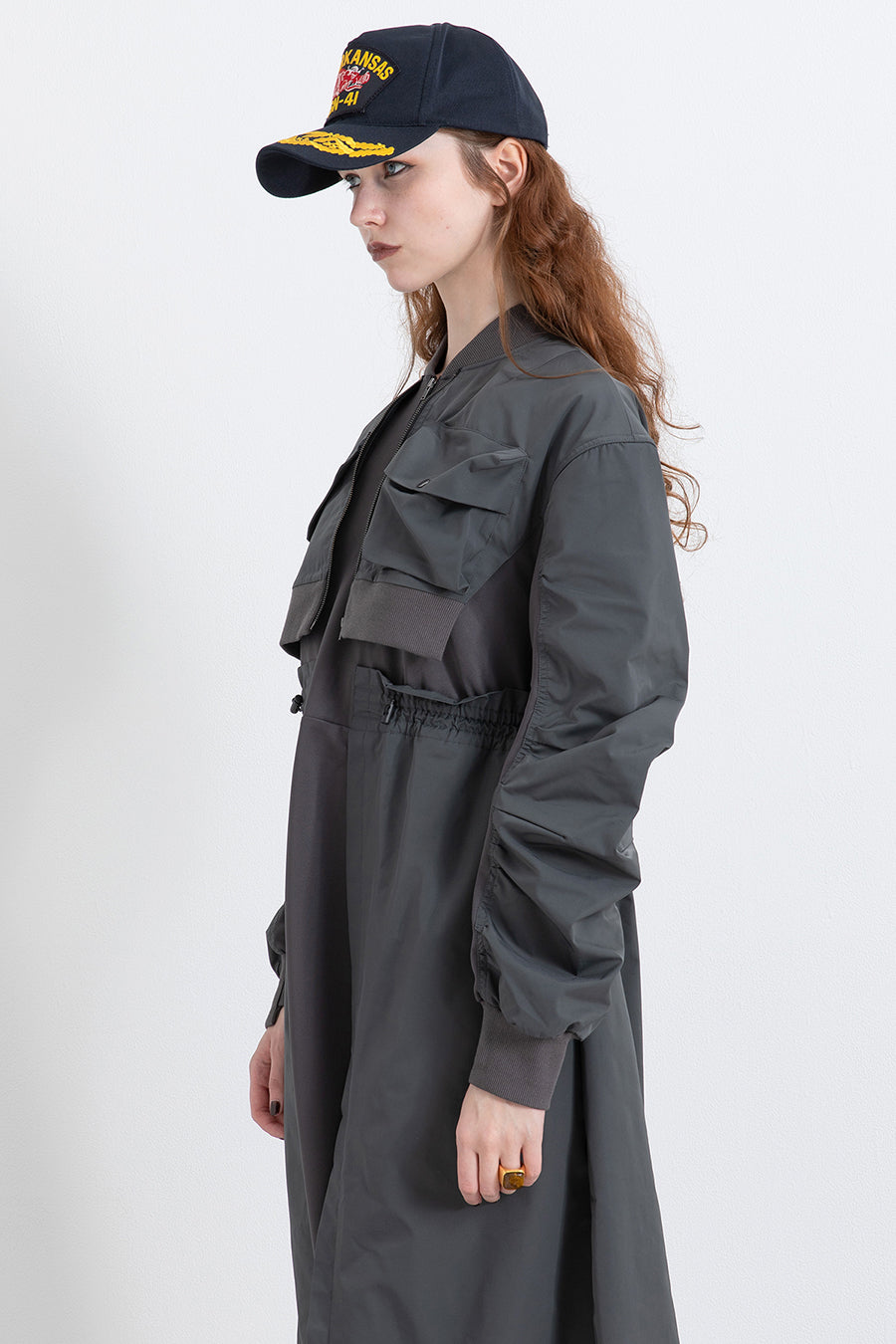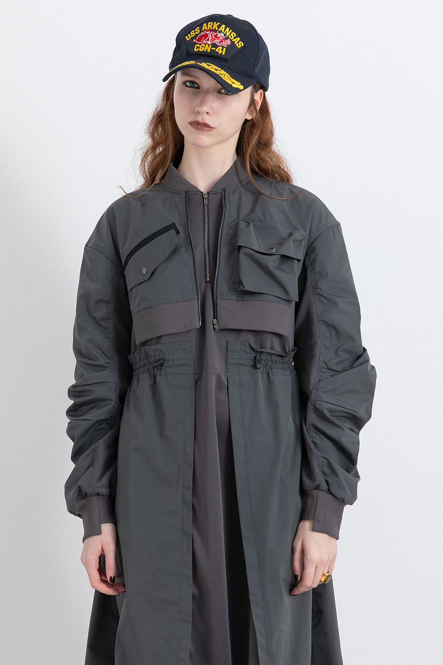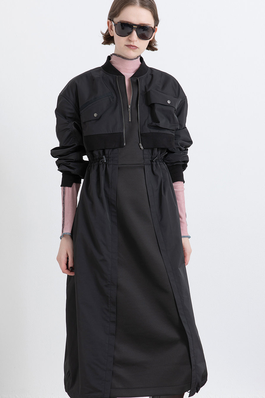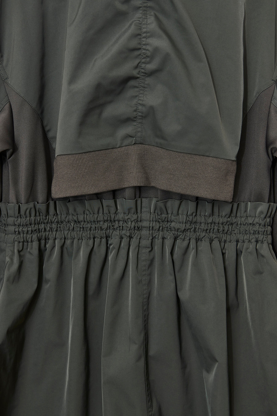 ゆったりとしたサイジングにジャージーカットソーとポリエステルツイルを組みあわせたMA1ディテールのワンピース。ボリュームのある裾はドローコードになっているので絞ってバルーン風にでき、トレンド感のあるシルエットにすることも可能。ウエストはゴム入りなので、絞るとメリハリのあるすっきりとしたシルエットに。上身はショート丈のMA-1ブルゾンを羽織っているようなレイヤードデザインもポイント。ウエストゴム入り、裏なし。脇ポケットあり。