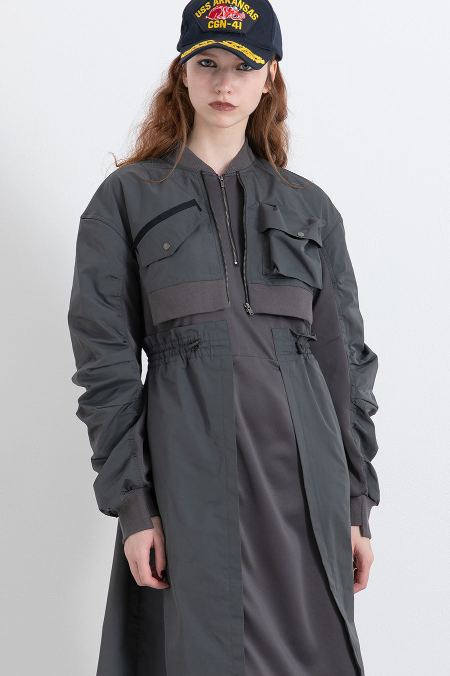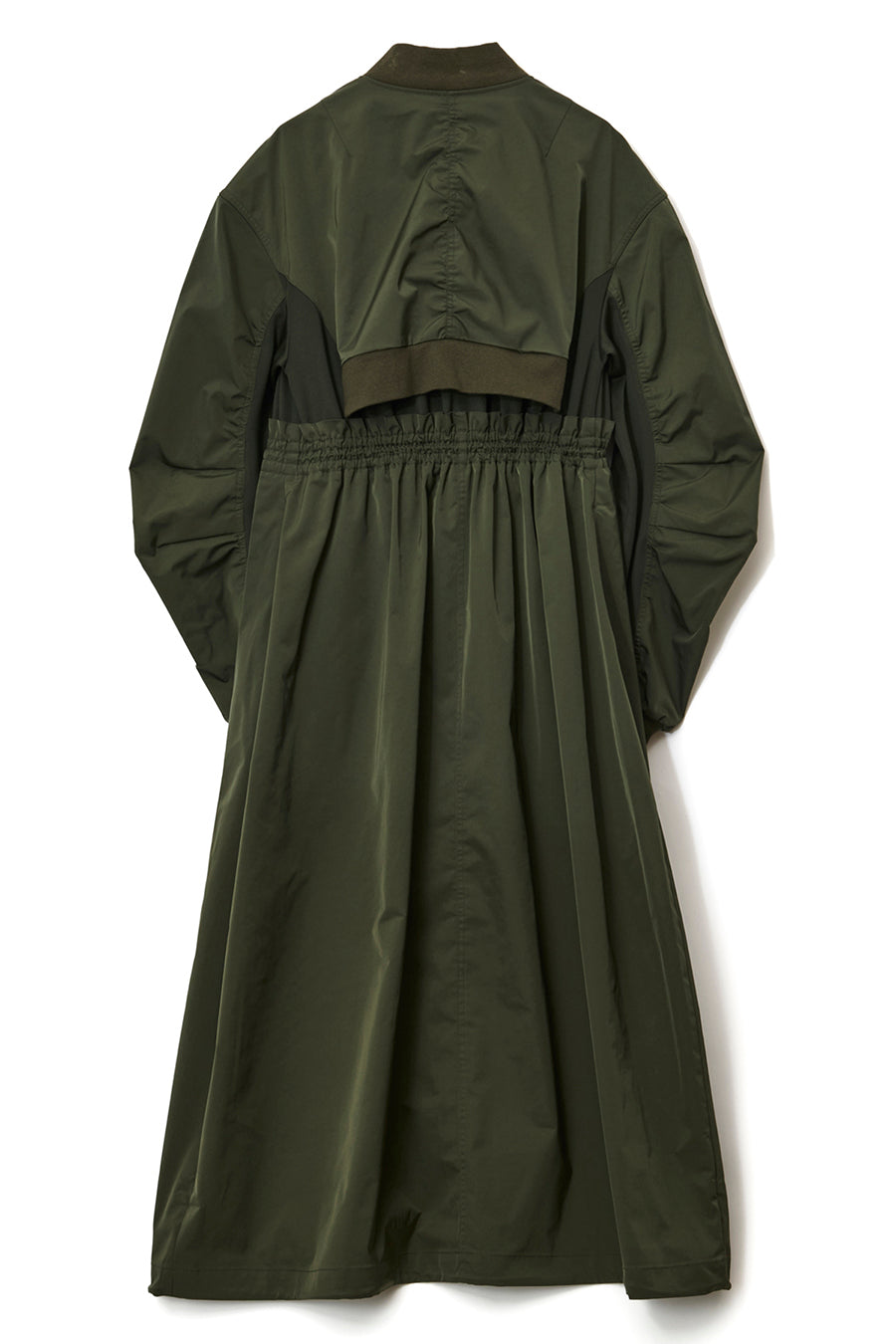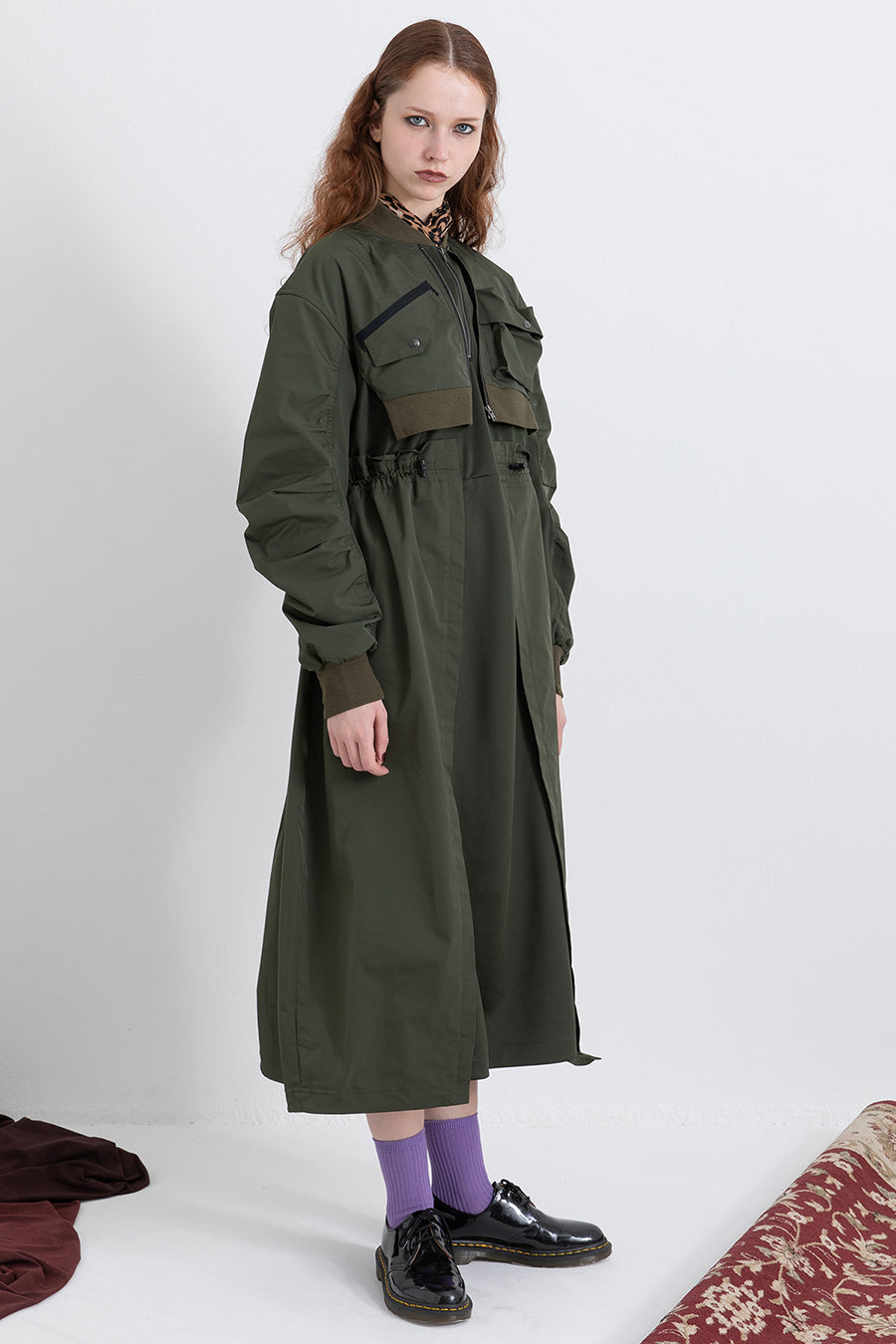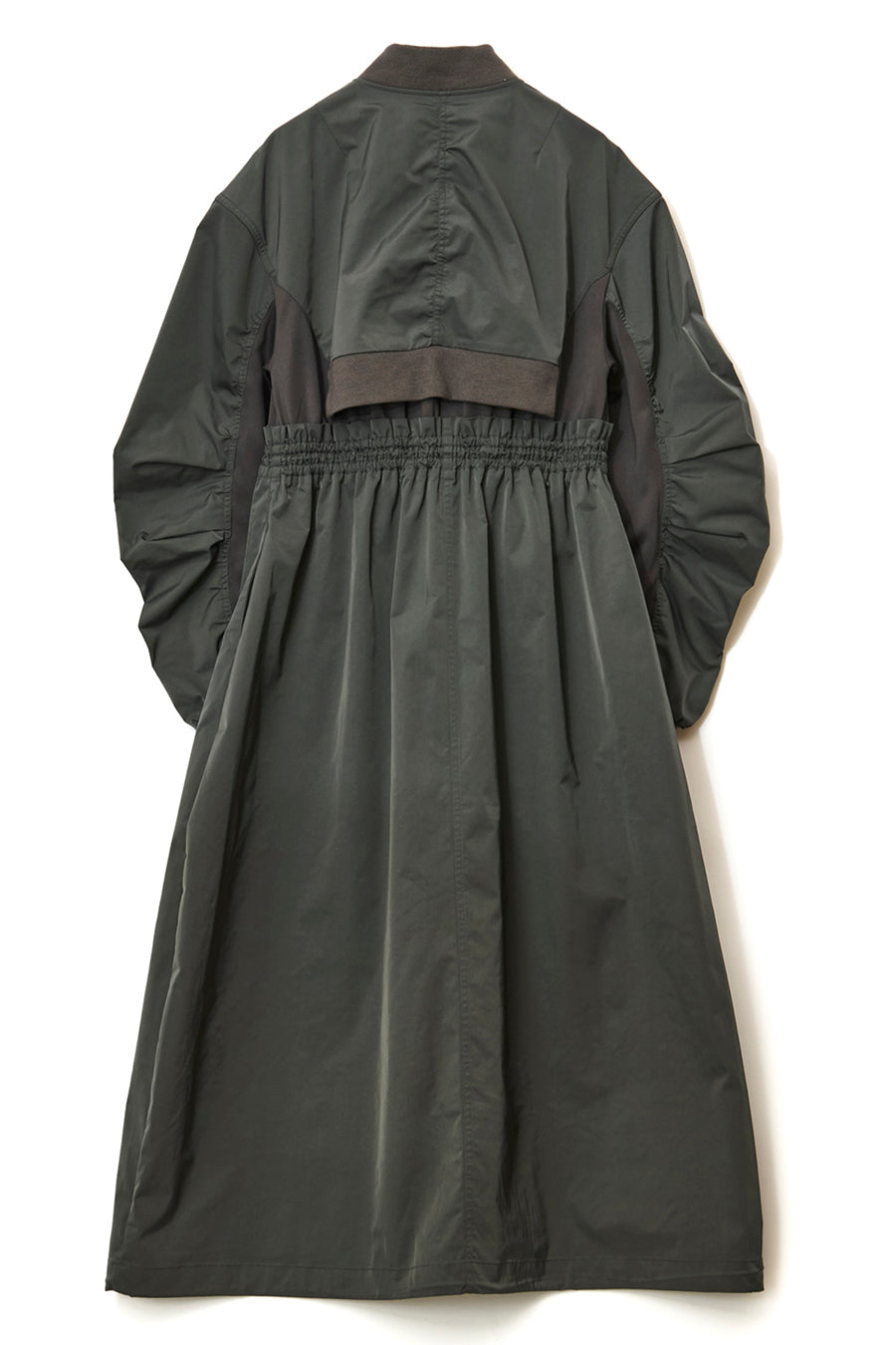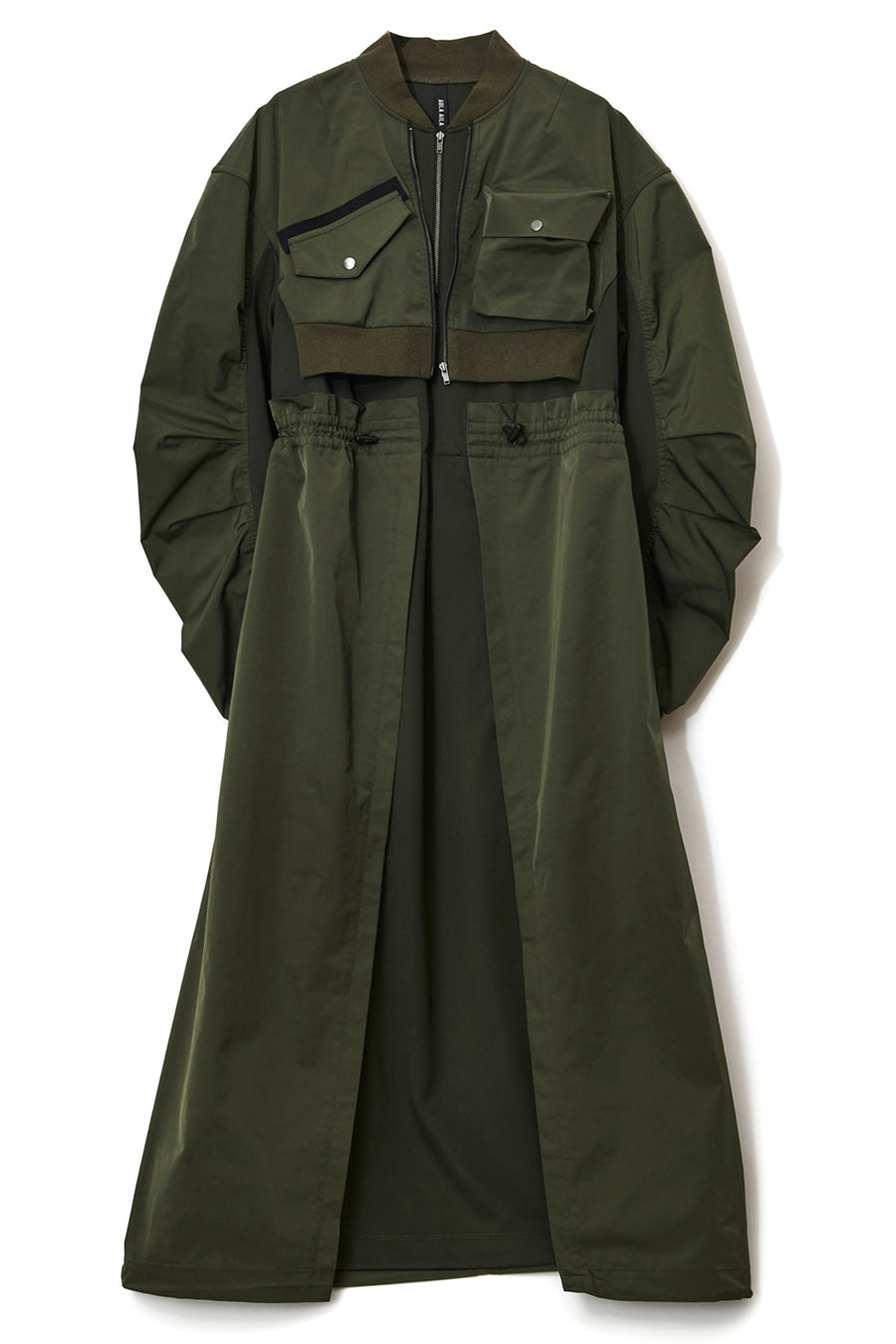 ゆったりとしたサイジングにジャージーカットソーとポリエステルツイルを組みあわせたMA1ディテールのワンピース。ボリュームのある裾はドローコードになっているので絞ってバルーン風にでき、トレンド感のあるシルエットにすることも可能。ウエストはゴム入りなので、絞るとメリハリのあるすっきりとしたシルエットに。上身はショート丈のMA-1ブルゾンを羽織っているようなレイヤードデザインもポイント。ウエストゴム入り、裏なし。脇ポケットあり。