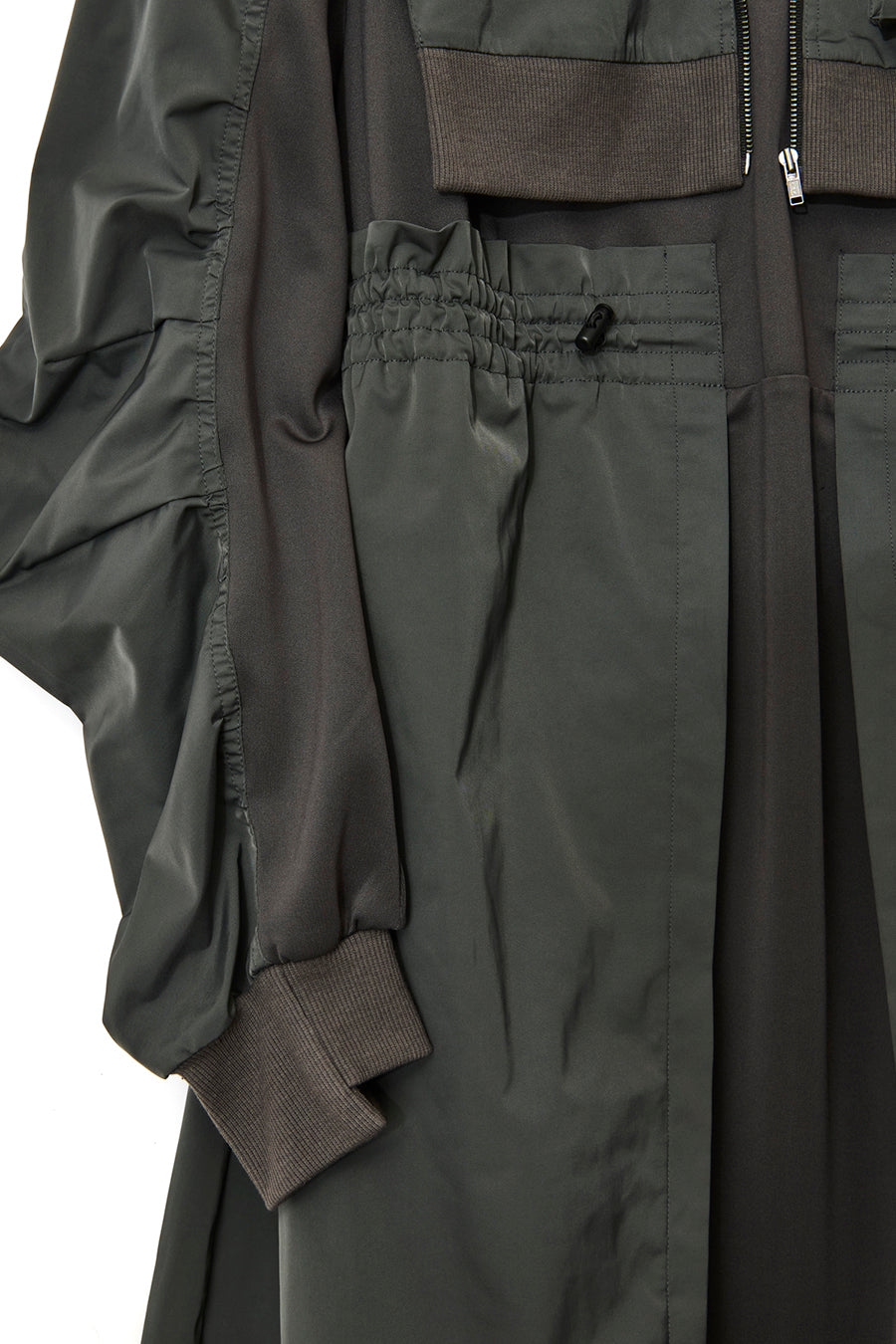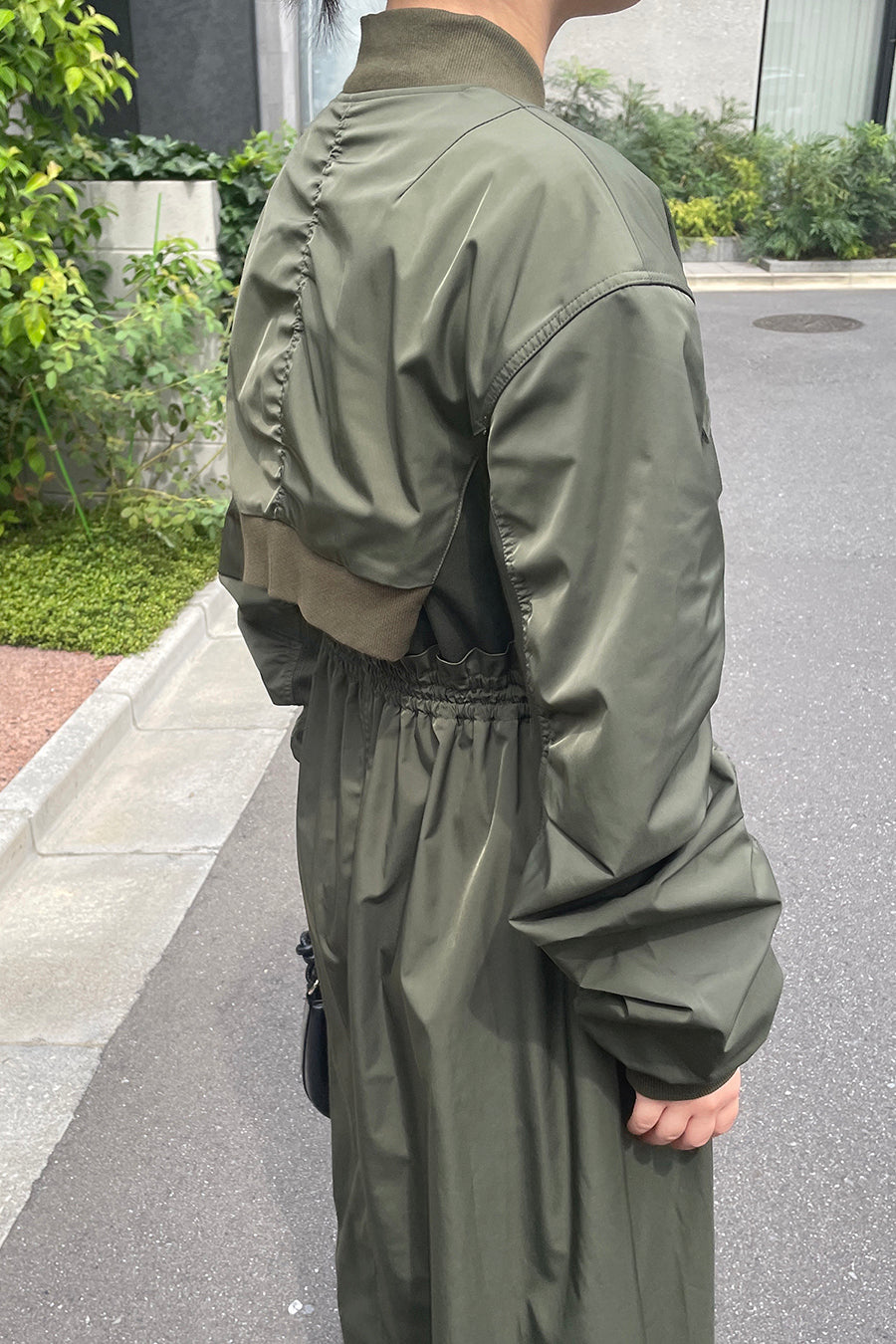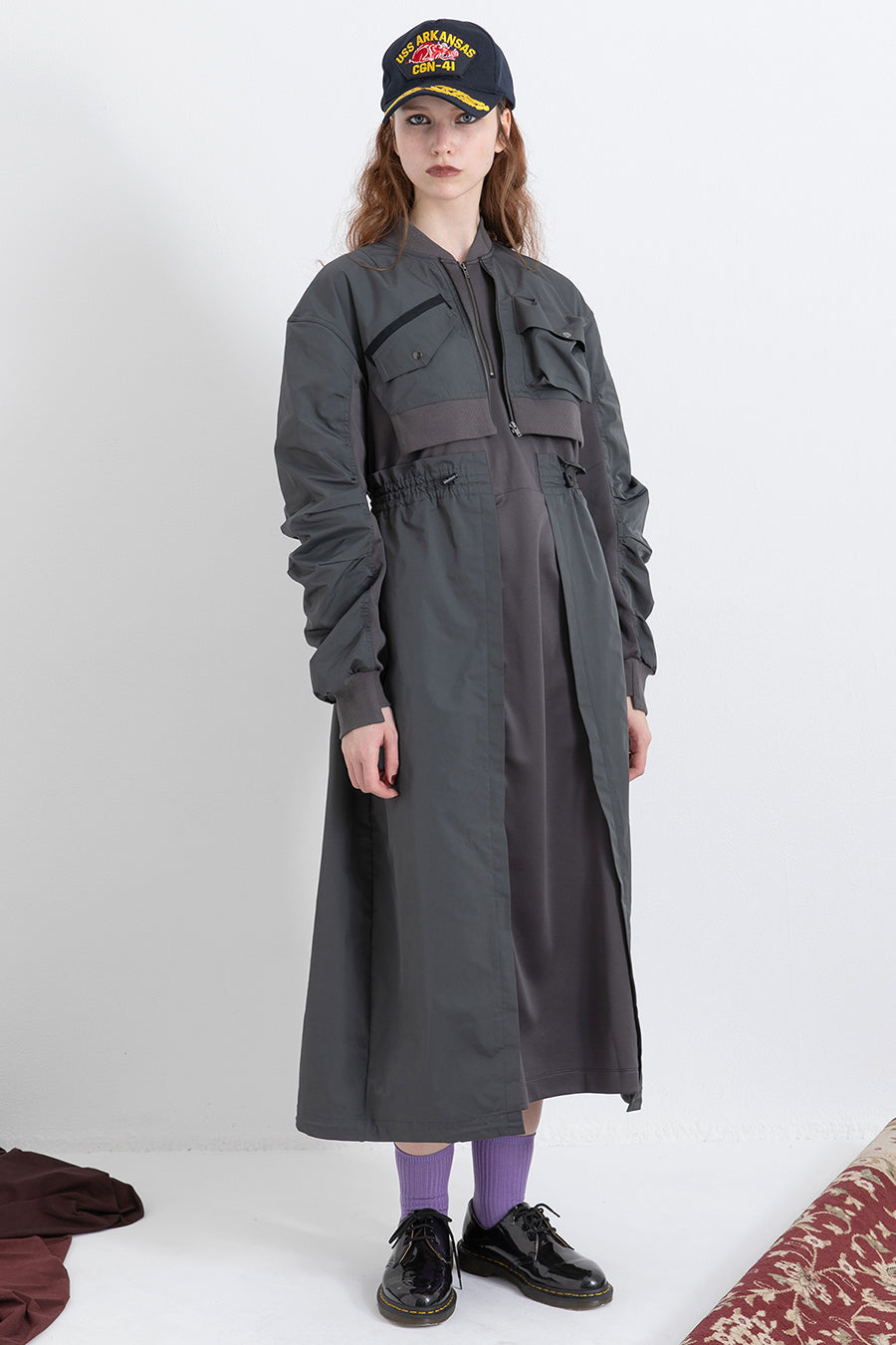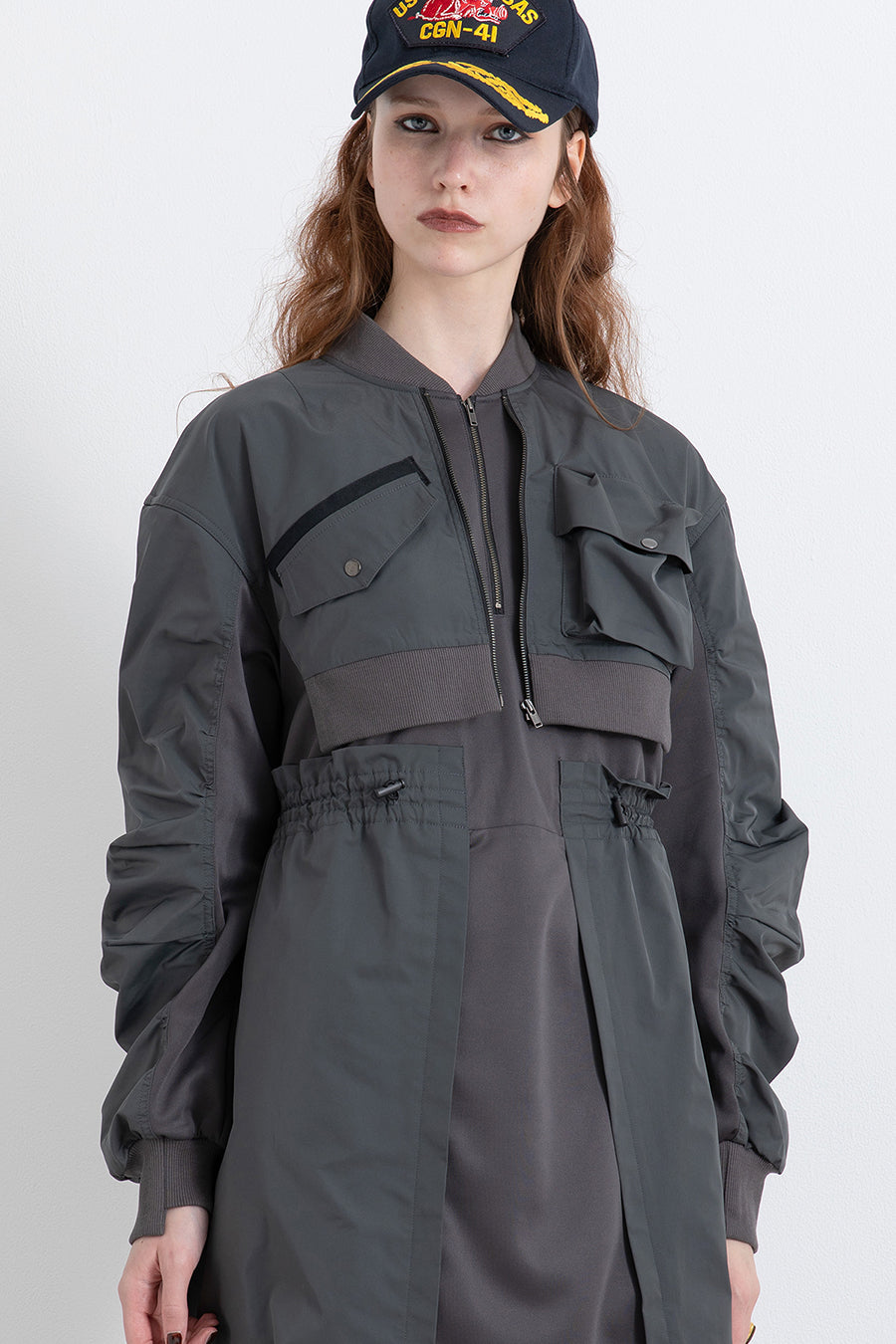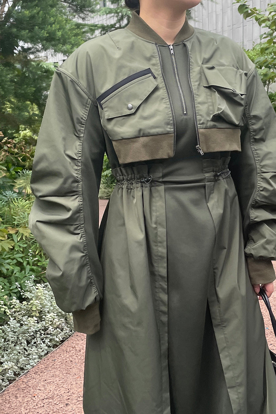 ゆったりとしたサイジングにジャージーカットソーとポリエステルツイルを組みあわせたMA1ディテールのワンピース。ボリュームのある裾はドローコードになっているので絞ってバルーン風にでき、トレンド感のあるシルエットにすることも可能。ウエストはゴム入りなので、絞るとメリハリのあるすっきりとしたシルエットに。上身はショート丈のMA-1ブルゾンを羽織っているようなレイヤードデザインもポイント。ウエストゴム入り、裏なし。脇ポケットあり。
