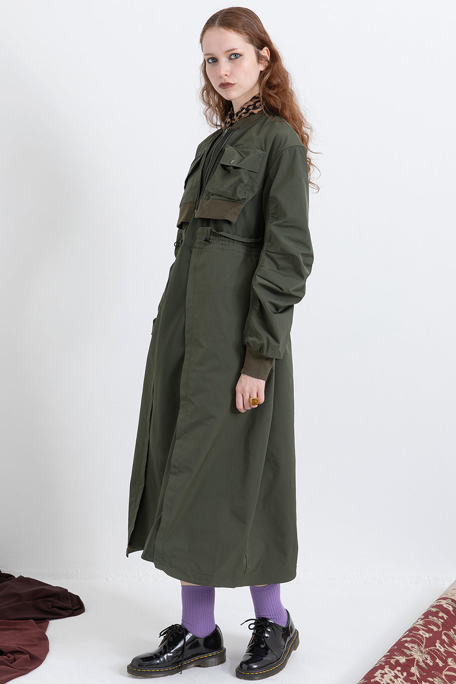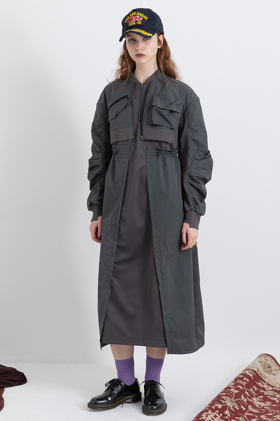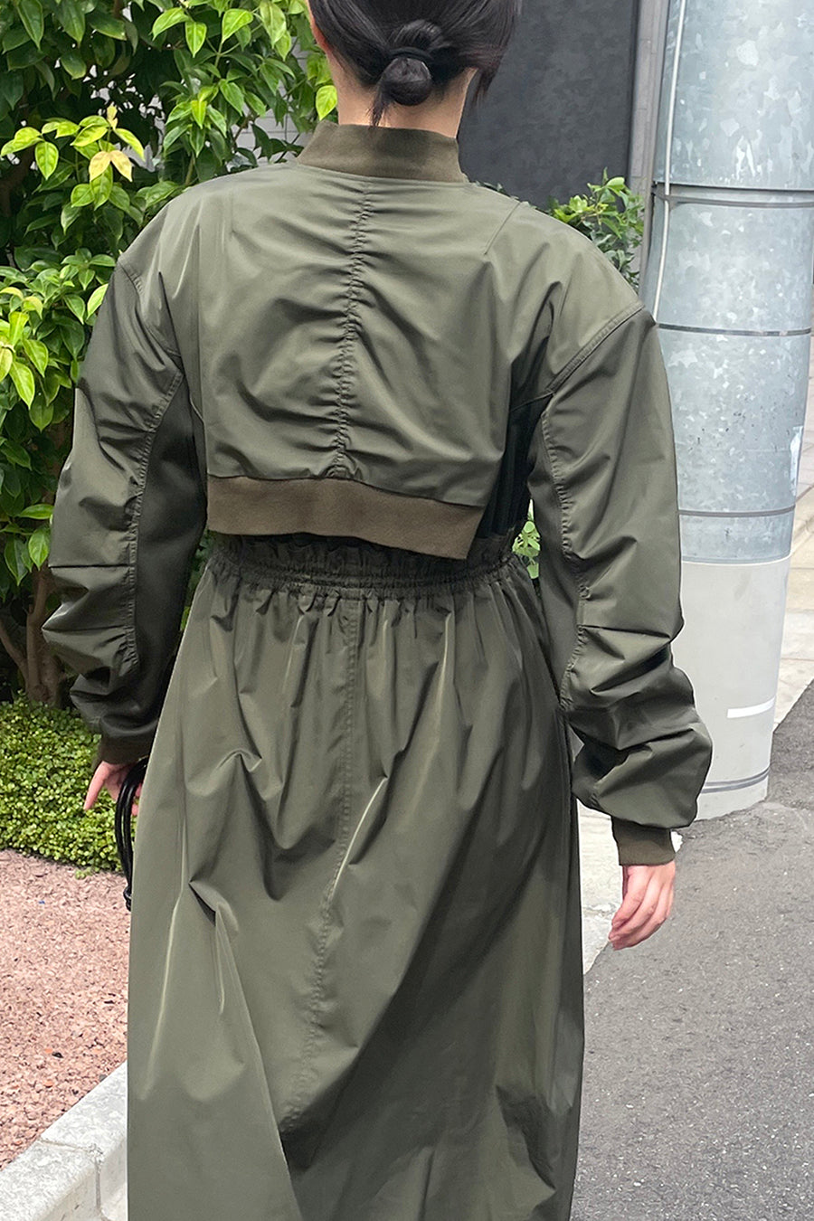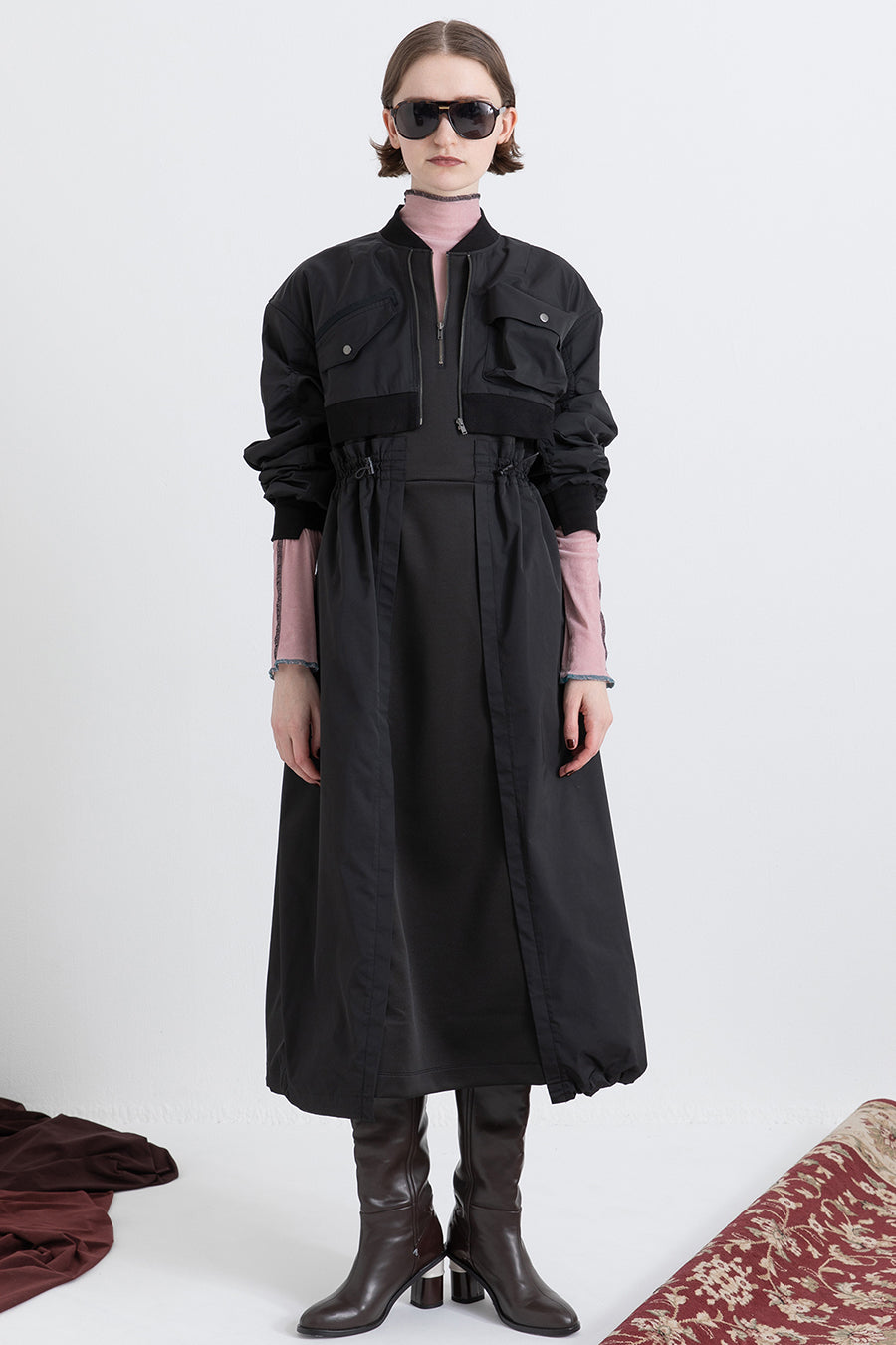 ゆったりとしたサイジングにジャージーカットソーとポリエステルツイルを組みあわせたMA1ディテールのワンピース。ボリュームのある裾はドローコードになっているので絞ってバルーン風にでき、トレンド感のあるシルエットにすることも可能。ウエストはゴム入りなので、絞るとメリハリのあるすっきりとしたシルエットに。上身はショート丈のMA-1ブルゾンを羽織っているようなレイヤードデザインもポイント。ウエストゴム入り、裏なし。脇ポケットあり。