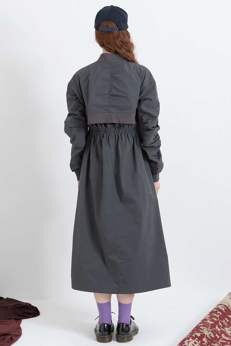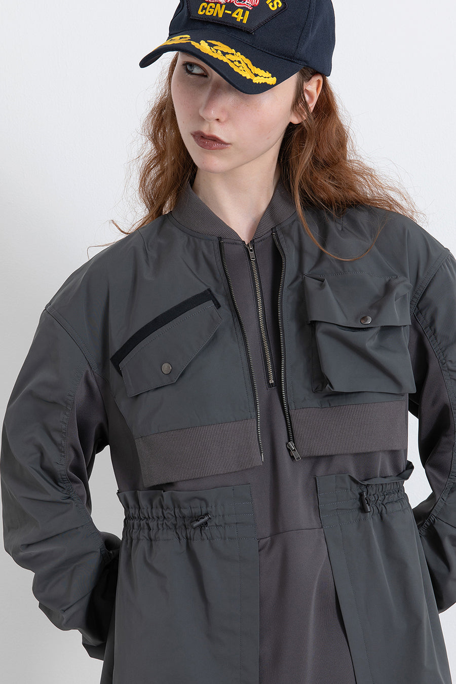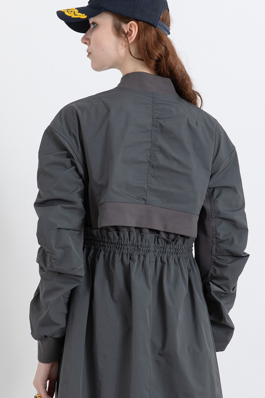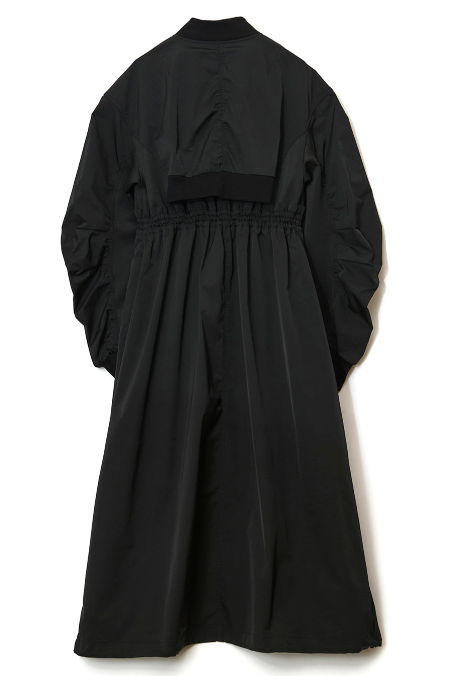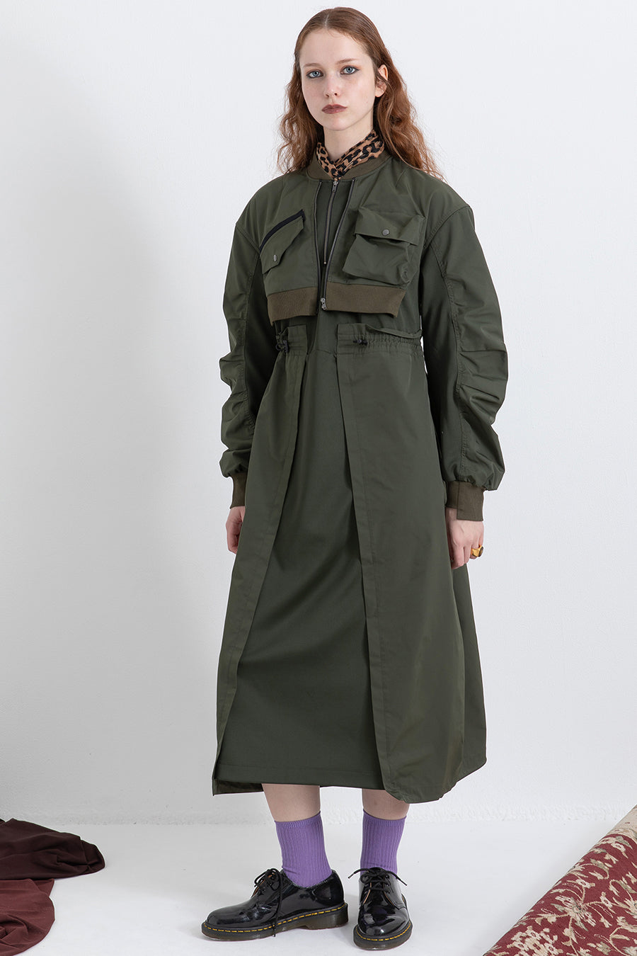 ゆったりとしたサイジングにジャージーカットソーとポリエステルツイルを組みあわせたMA1ディテールのワンピース。ボリュームのある裾はドローコードになっているので絞ってバルーン風にでき、トレンド感のあるシルエットにすることも可能。ウエストはゴム入りなので、絞るとメリハリのあるすっきりとしたシルエットに。上身はショート丈のMA-1ブルゾンを羽織っているようなレイヤードデザインもポイント。ウエストゴム入り、裏なし。脇ポケットあり。