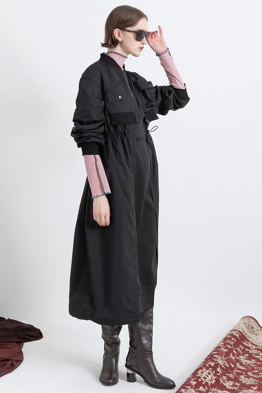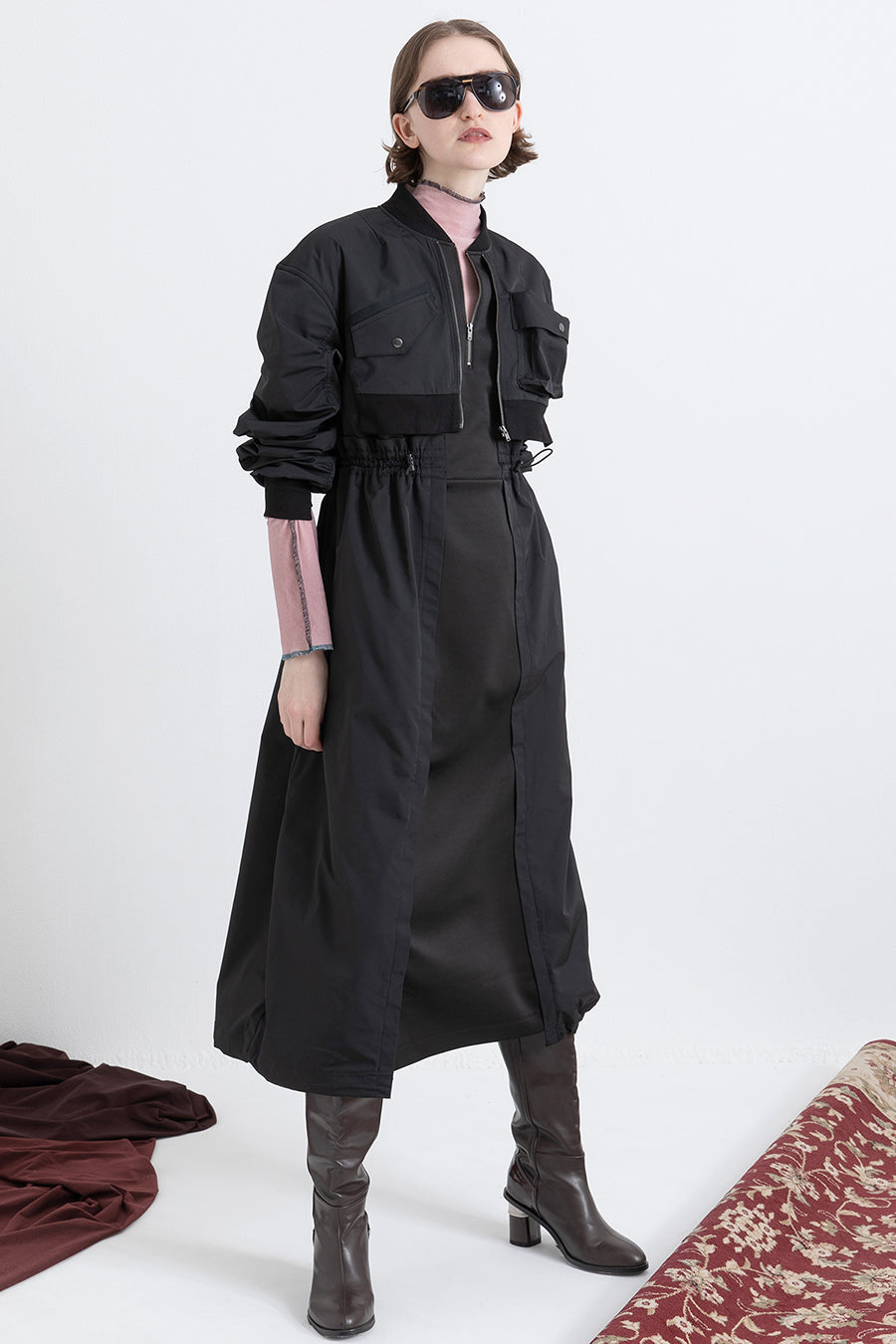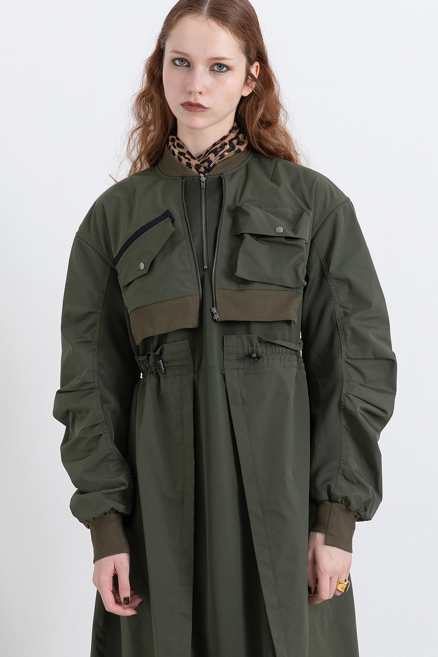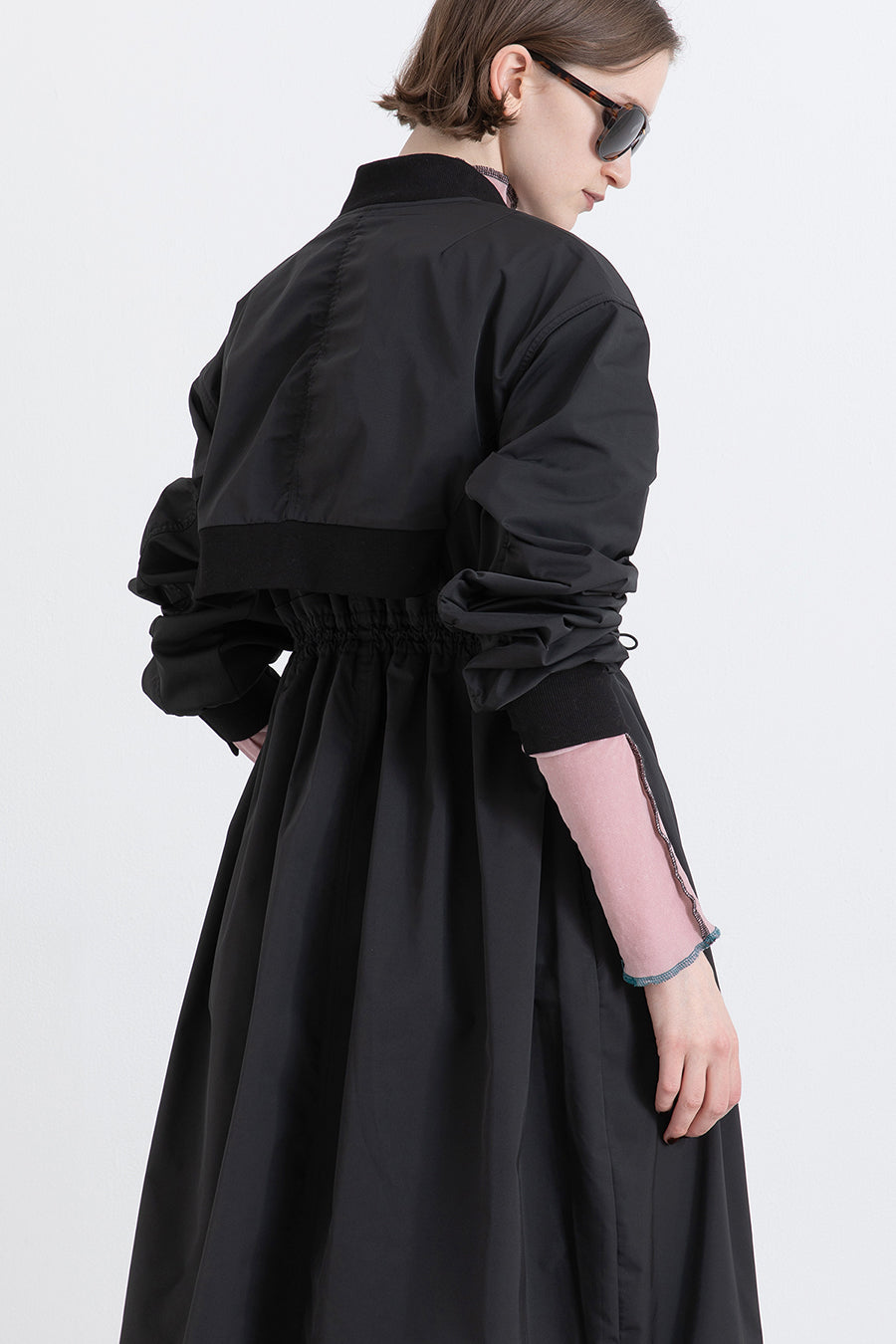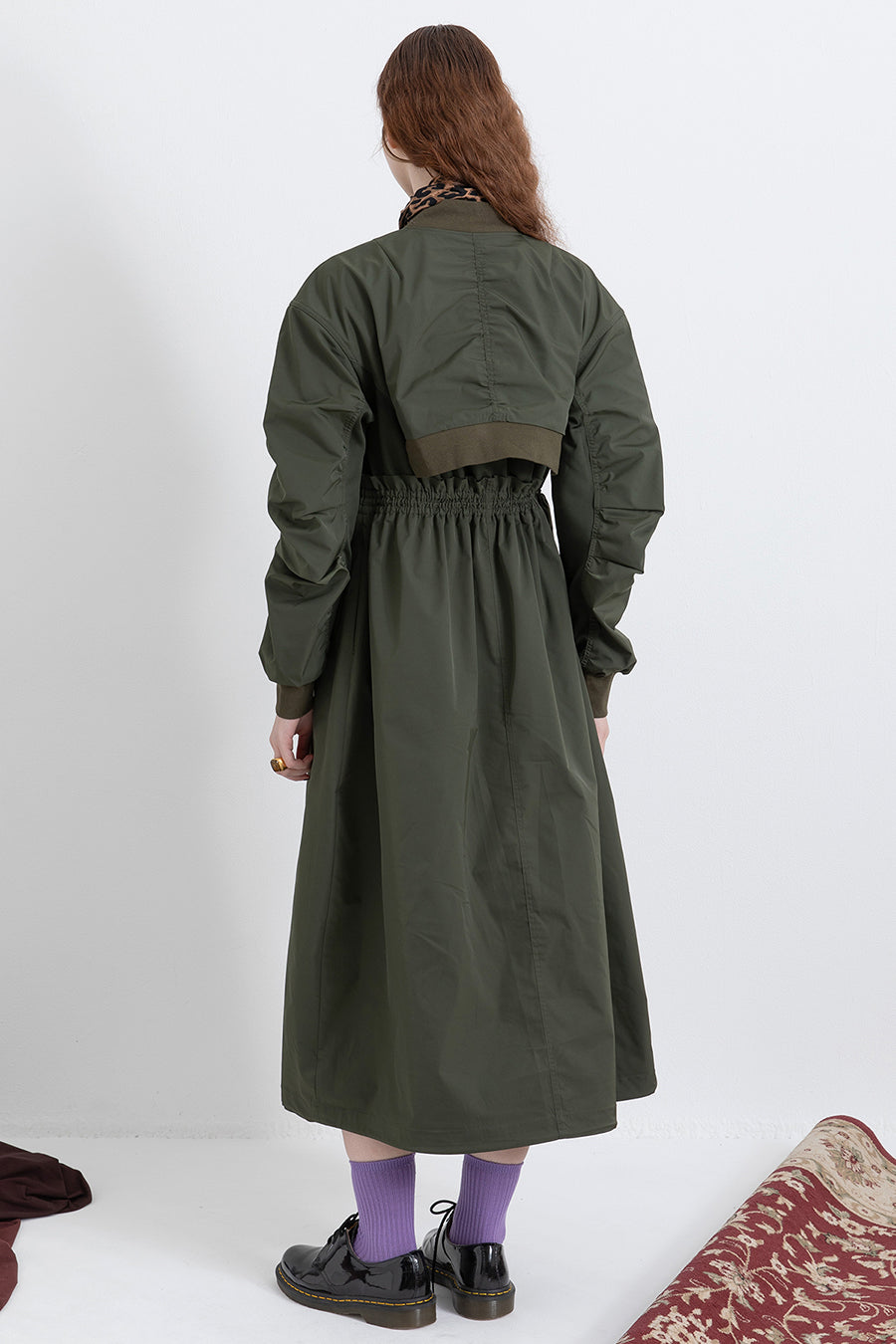ゆったりとしたサイジングにジャージーカットソーとポリエステルツイルを組みあわせたMA1ディテールのワンピース。ボリュームのある裾はドローコードになっているので絞ってバルーン風にでき、トレンド感のあるシルエットにすることも可能。ウエストはゴム入りなので、絞るとメリハリのあるすっきりとしたシルエットに。上身はショート丈のMA-1ブルゾンを羽織っているようなレイヤードデザインもポイント。ウエストゴム入り、裏なし。脇ポケットあり。