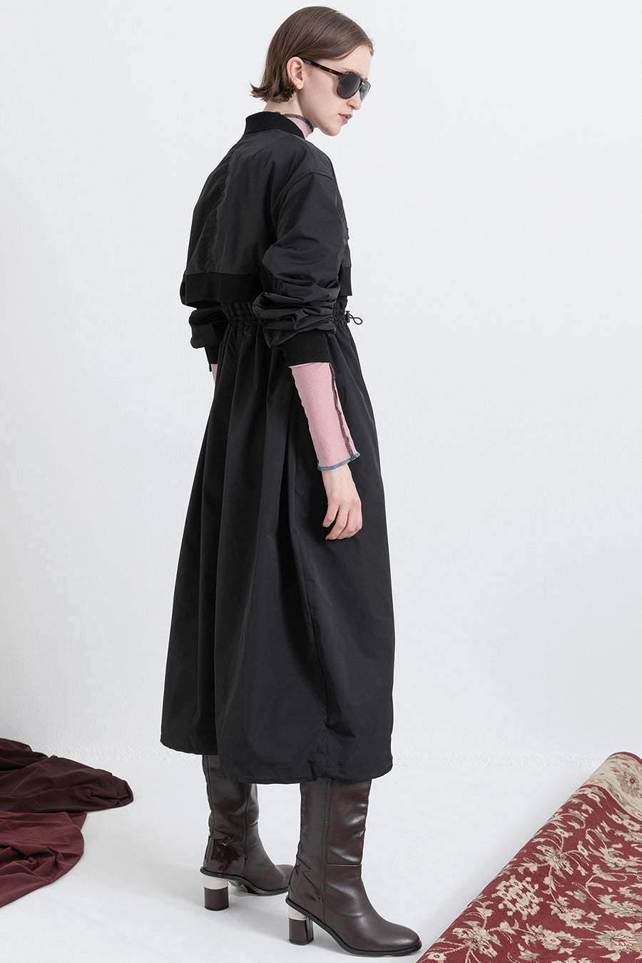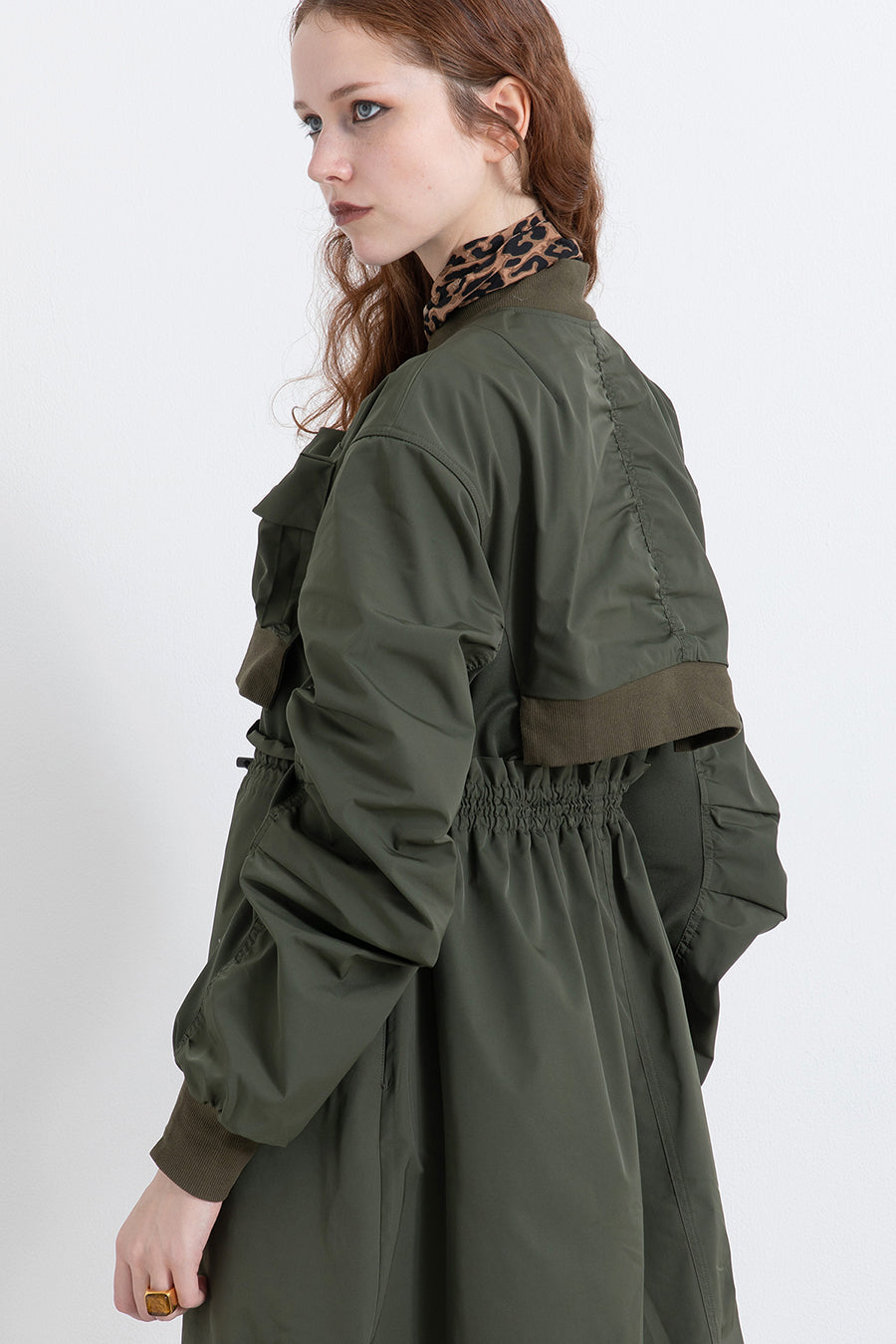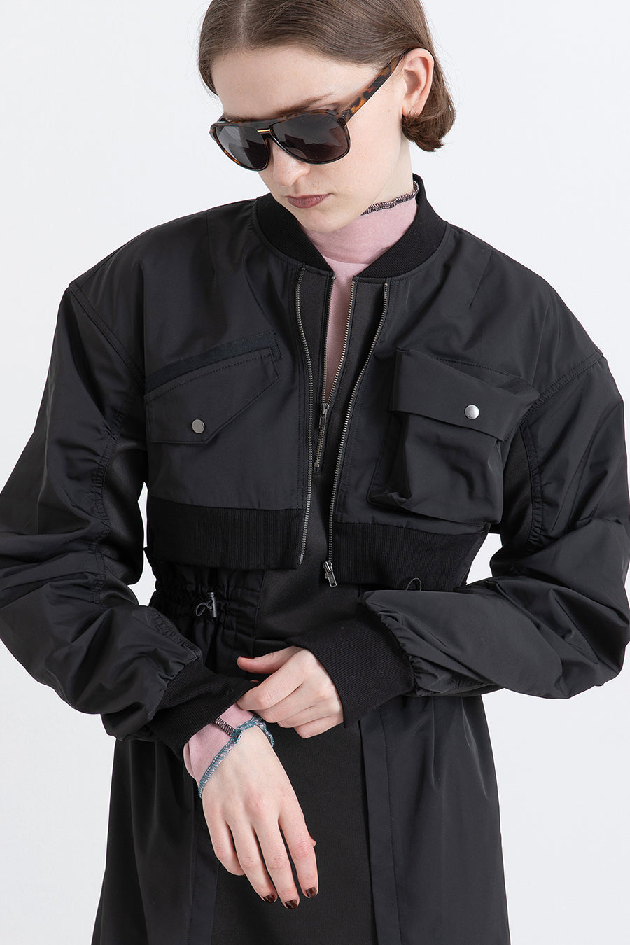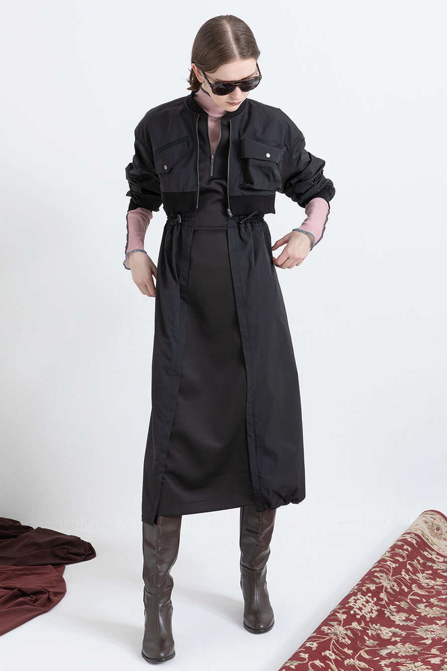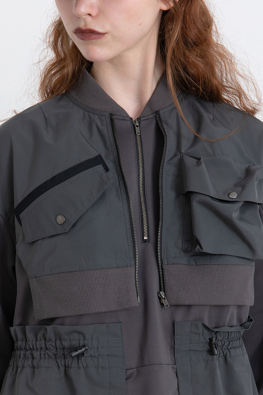 ゆったりとしたサイジングにジャージーカットソーとポリエステルツイルを組みあわせたMA1ディテールのワンピース。ボリュームのある裾はドローコードになっているので絞ってバルーン風にでき、トレンド感のあるシルエットにすることも可能。ウエストはゴム入りなので、絞るとメリハリのあるすっきりとしたシルエットに。上身はショート丈のMA-1ブルゾンを羽織っているようなレイヤードデザインもポイント。ウエストゴム入り、裏なし。脇ポケットあり。