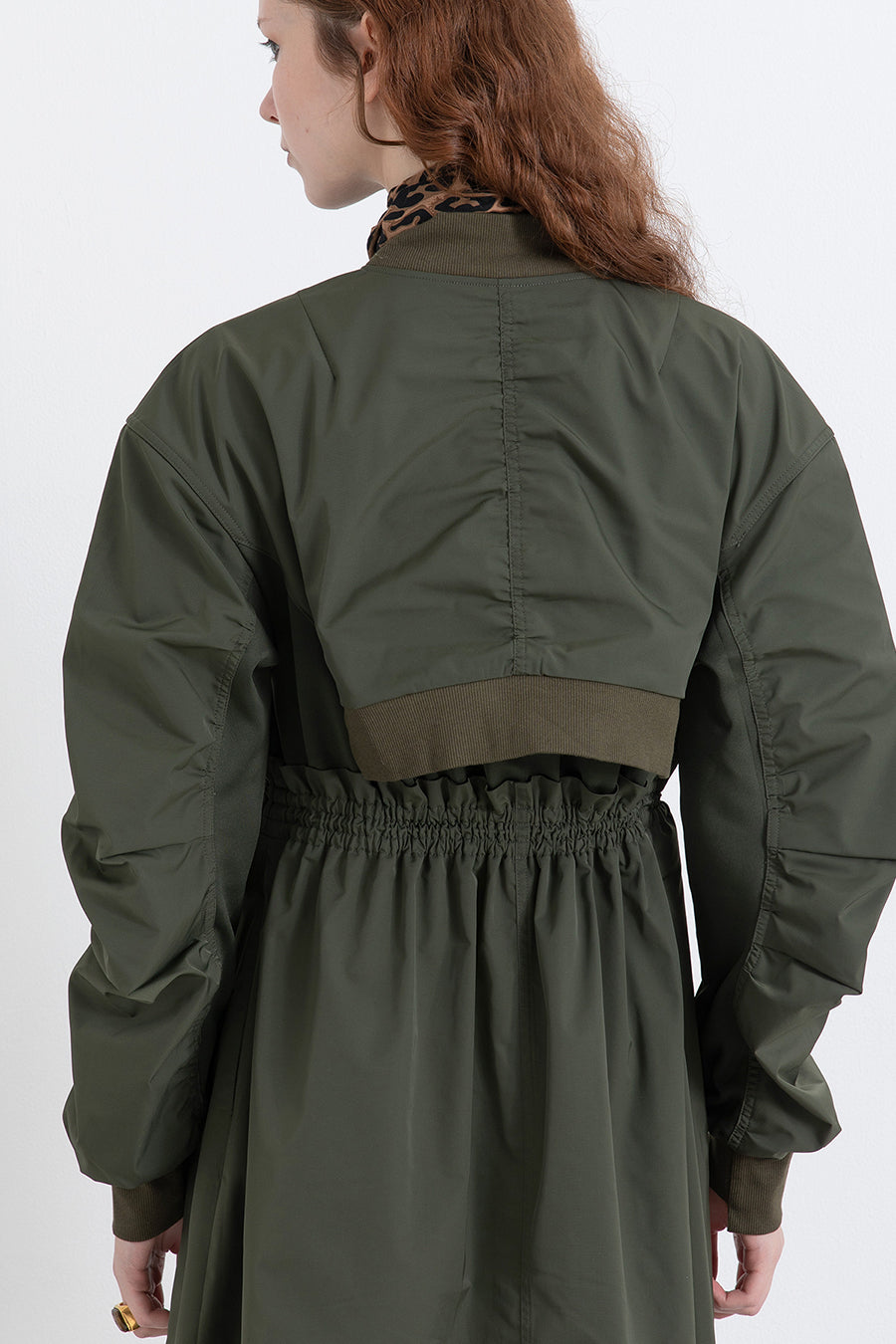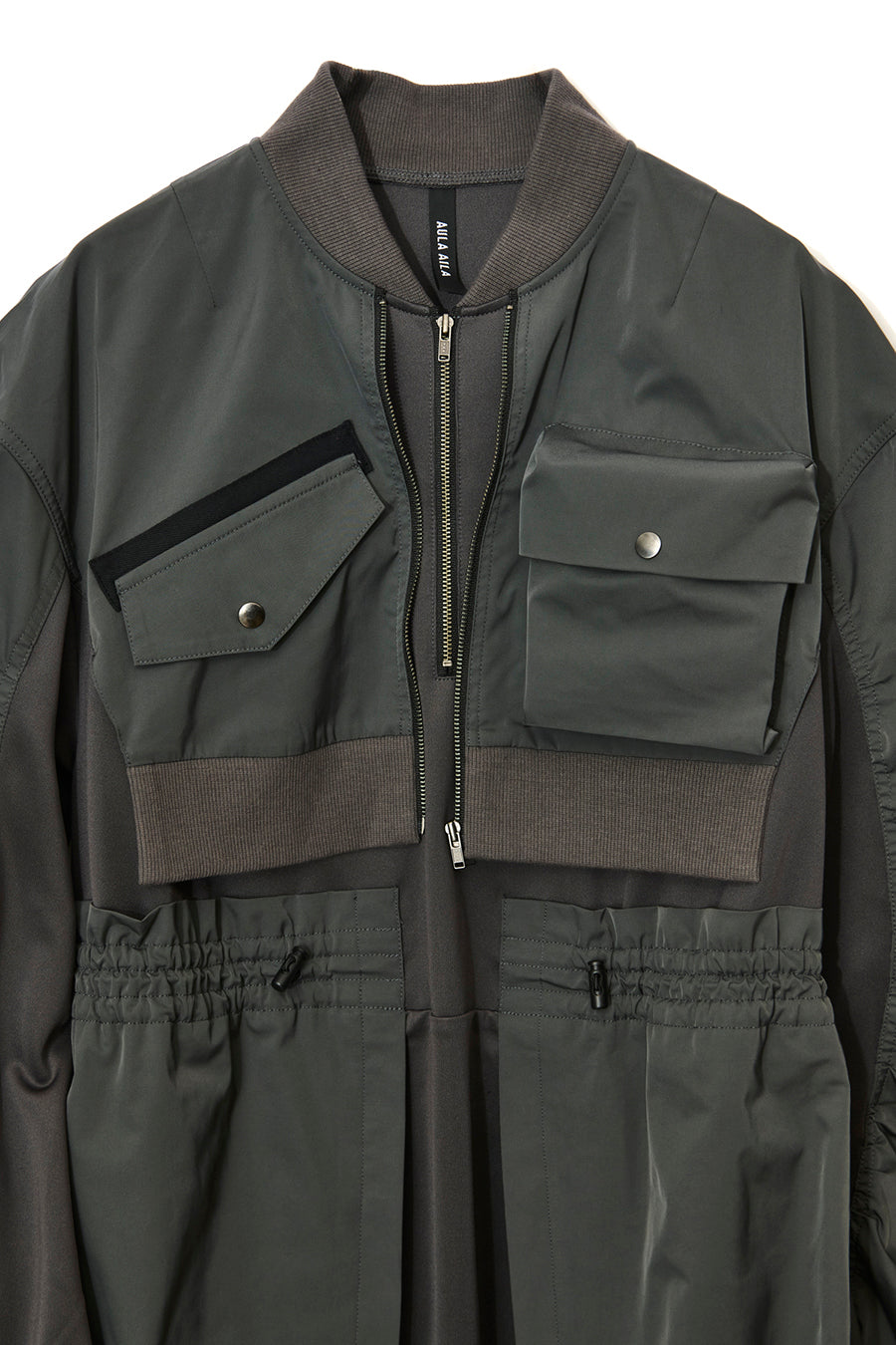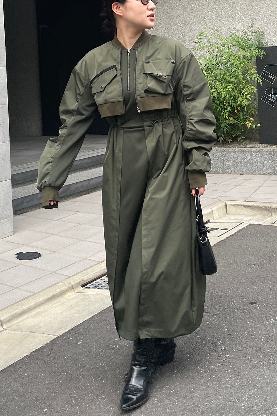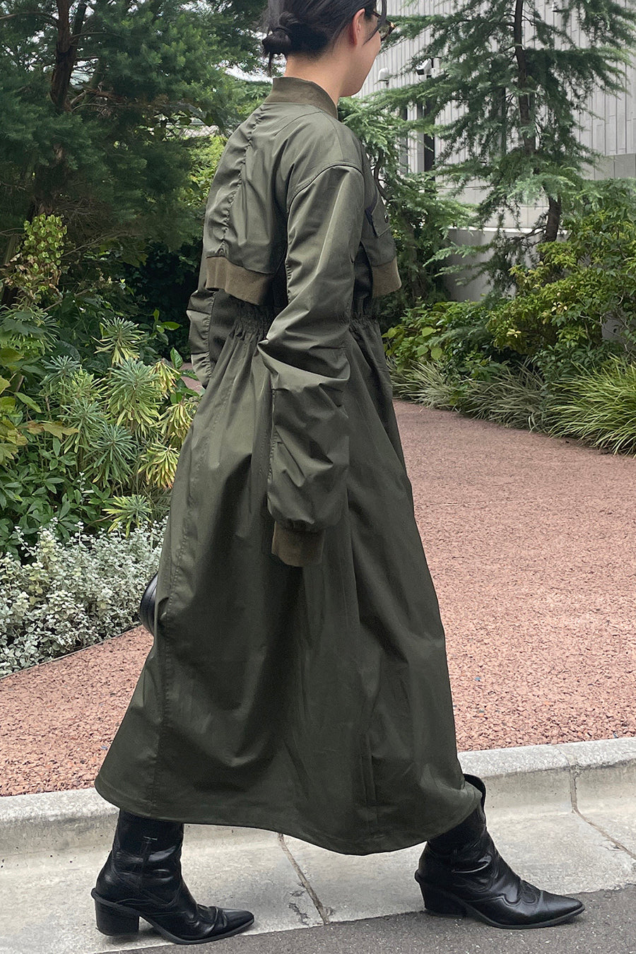 ゆったりとしたサイジングにジャージーカットソーとポリエステルツイルを組みあわせたMA1ディテールのワンピース。ボリュームのある裾はドローコードになっているので絞ってバルーン風にでき、トレンド感のあるシルエットにすることも可能。ウエストはゴム入りなので、絞るとメリハリのあるすっきりとしたシルエットに。上身はショート丈のMA-1ブルゾンを羽織っているようなレイヤードデザインもポイント。ウエストゴム入り、裏なし。脇ポケットあり。