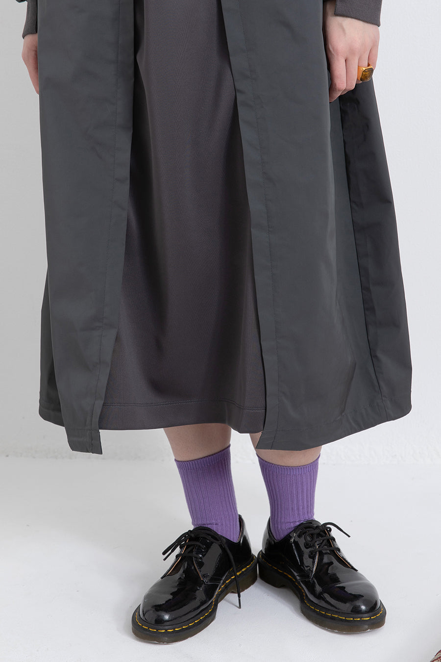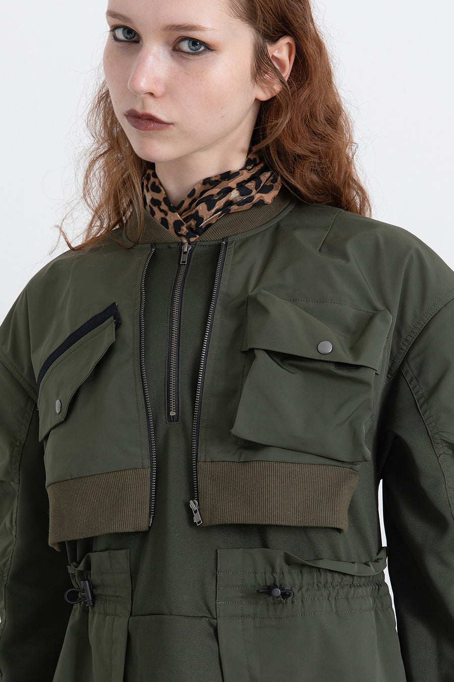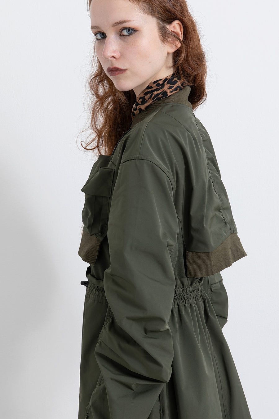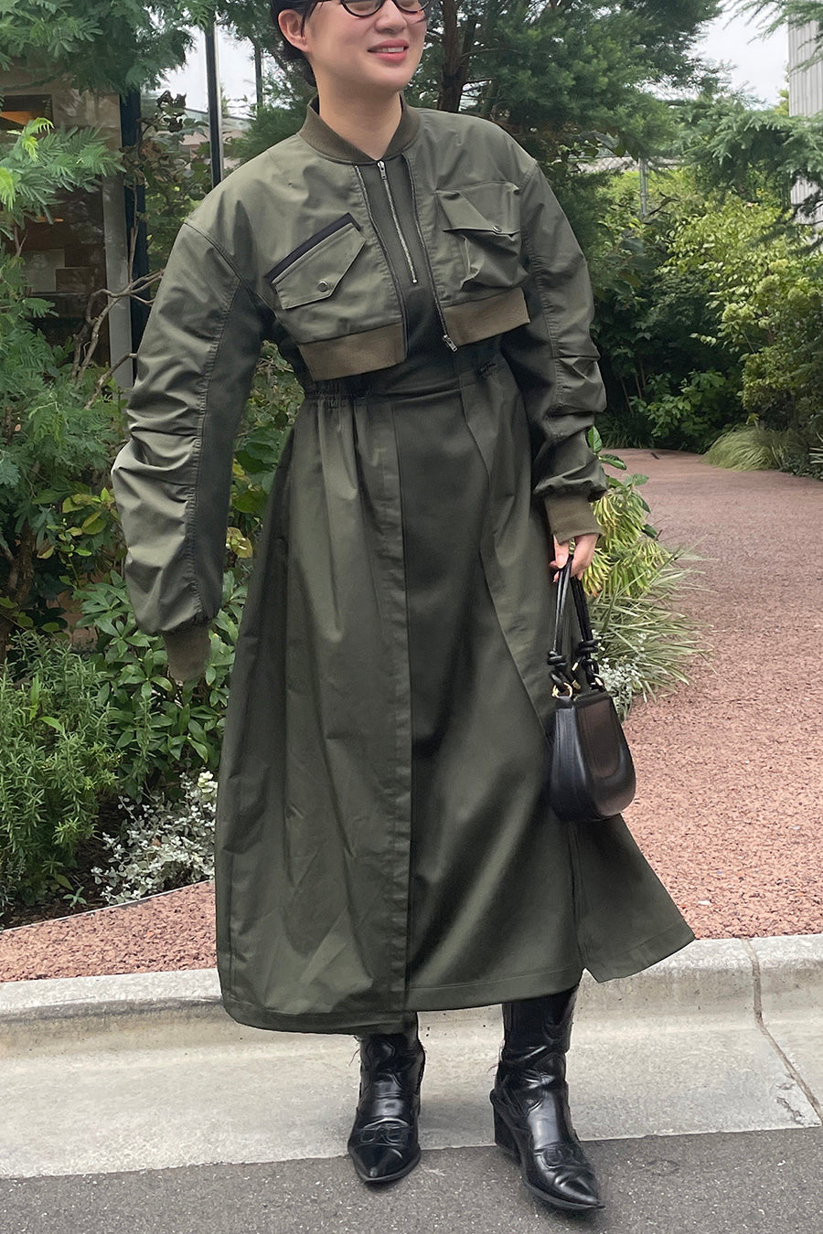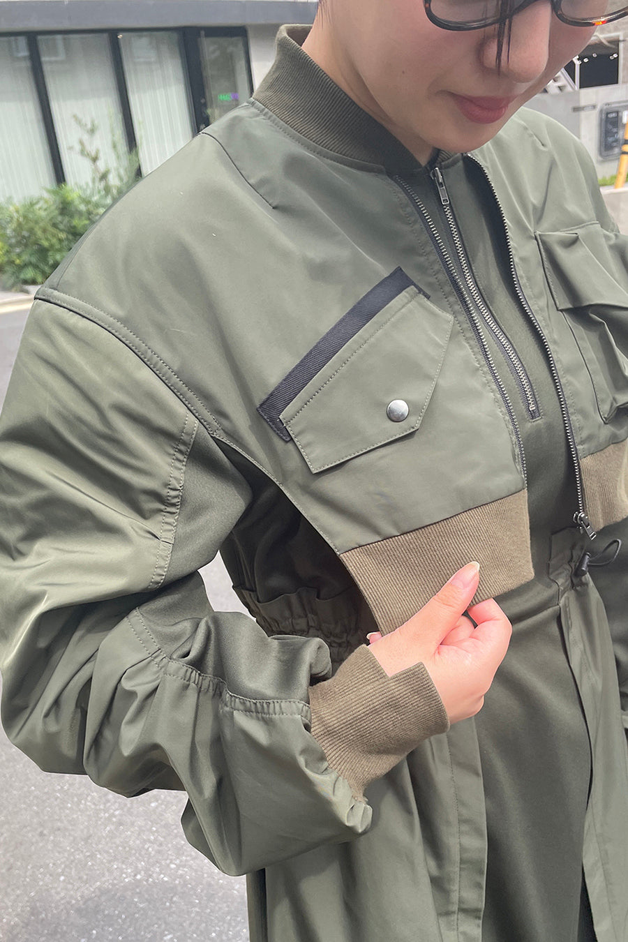 ゆったりとしたサイジングにジャージーカットソーとポリエステルツイルを組みあわせたMA1ディテールのワンピース。ボリュームのある裾はドローコードになっているので絞ってバルーン風にでき、トレンド感のあるシルエットにすることも可能。ウエストはゴム入りなので、絞るとメリハリのあるすっきりとしたシルエットに。上身はショート丈のMA-1ブルゾンを羽織っているようなレイヤードデザインもポイント。ウエストゴム入り、裏なし。脇ポケットあり。