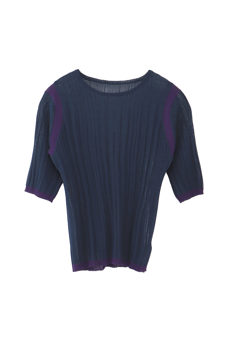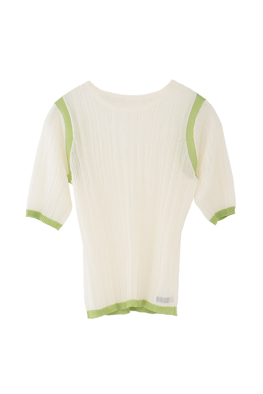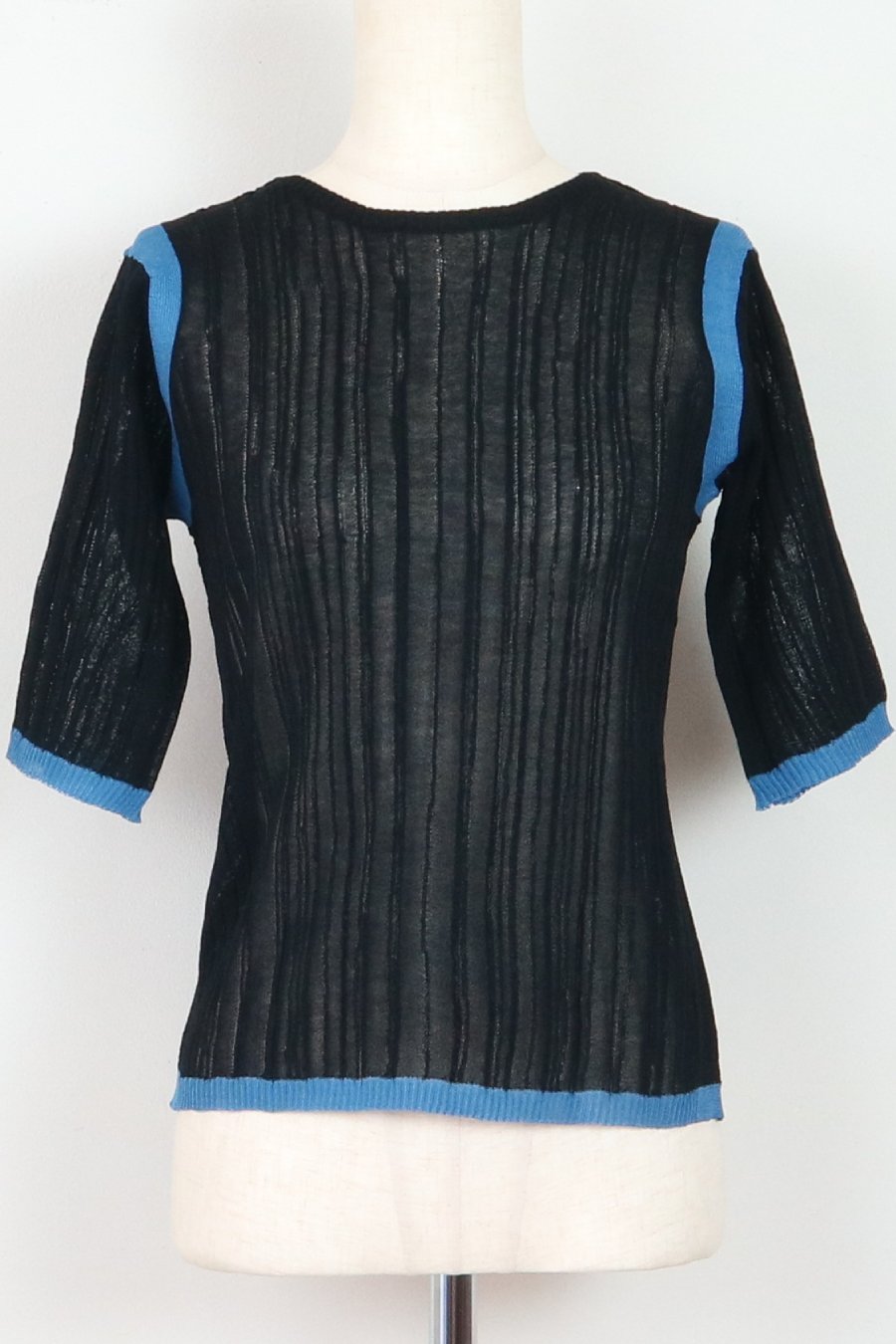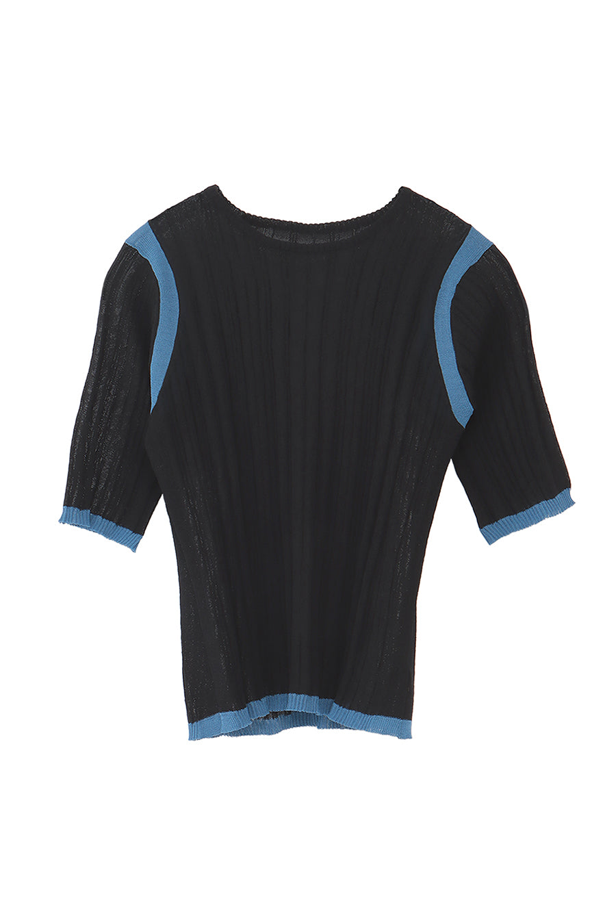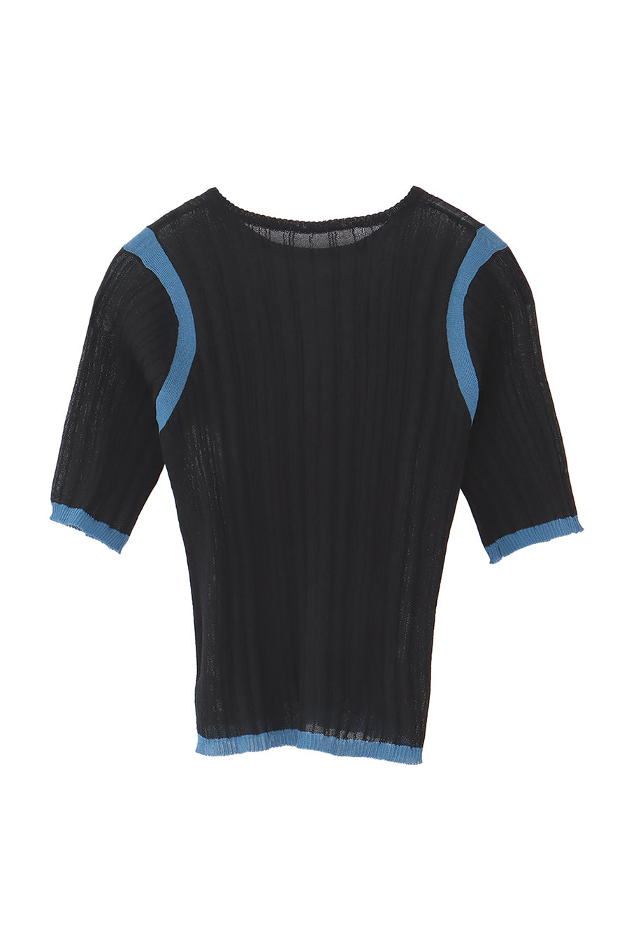 アームホール、袖口と裾の配色ラインがポイントのシアーニット。