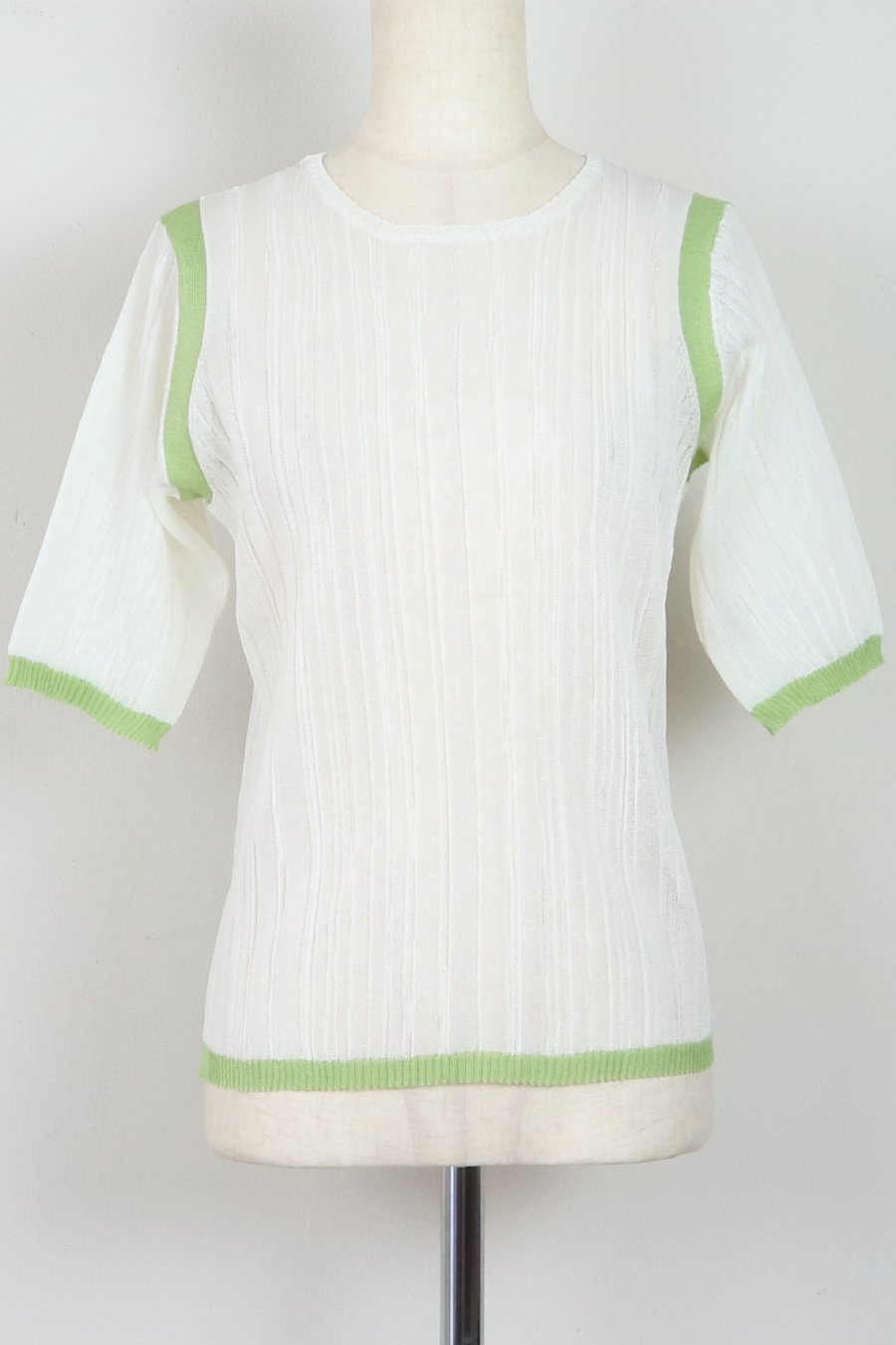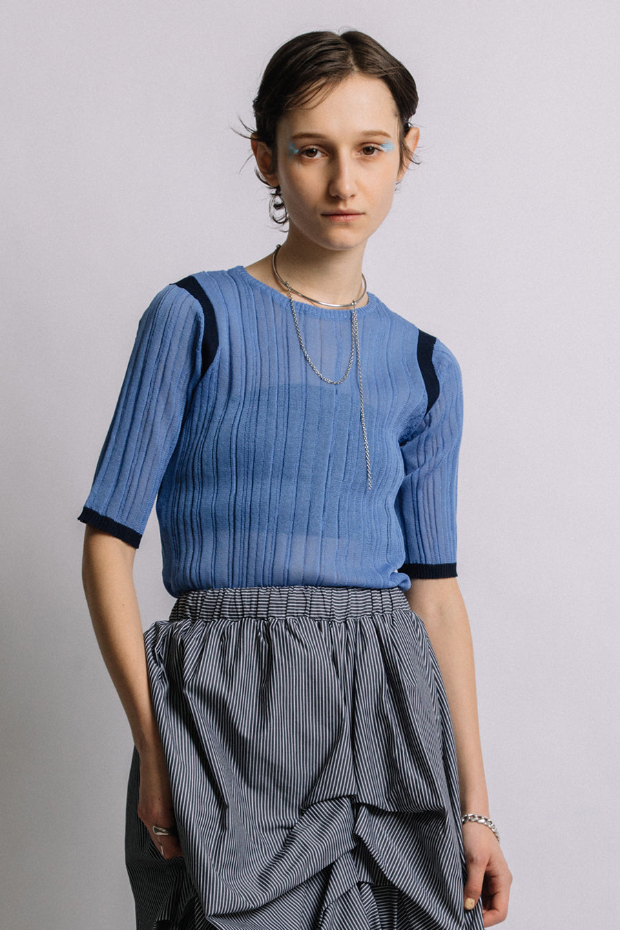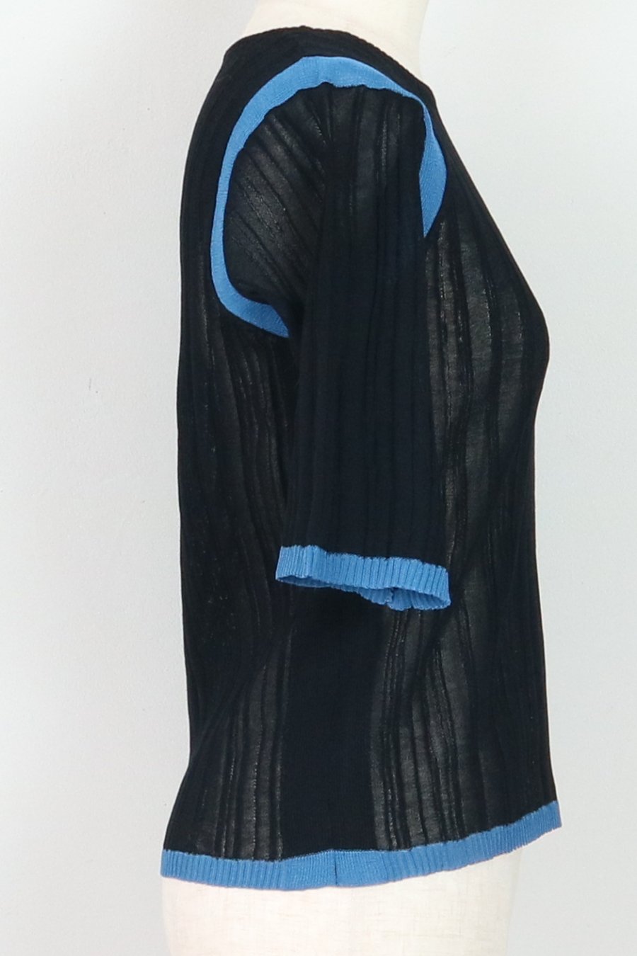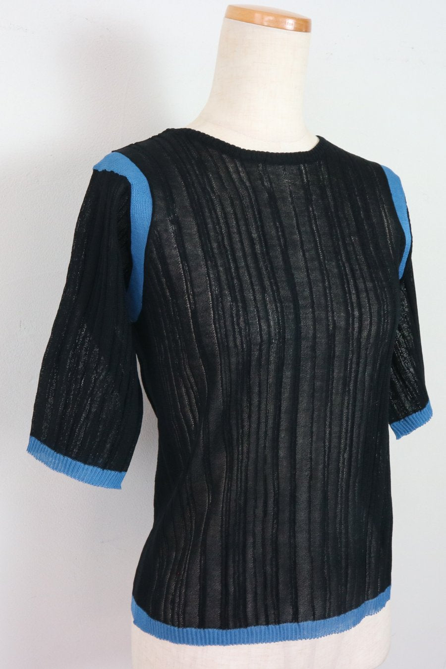 アームホール、袖口と裾の配色ラインがポイントのシアーニット。