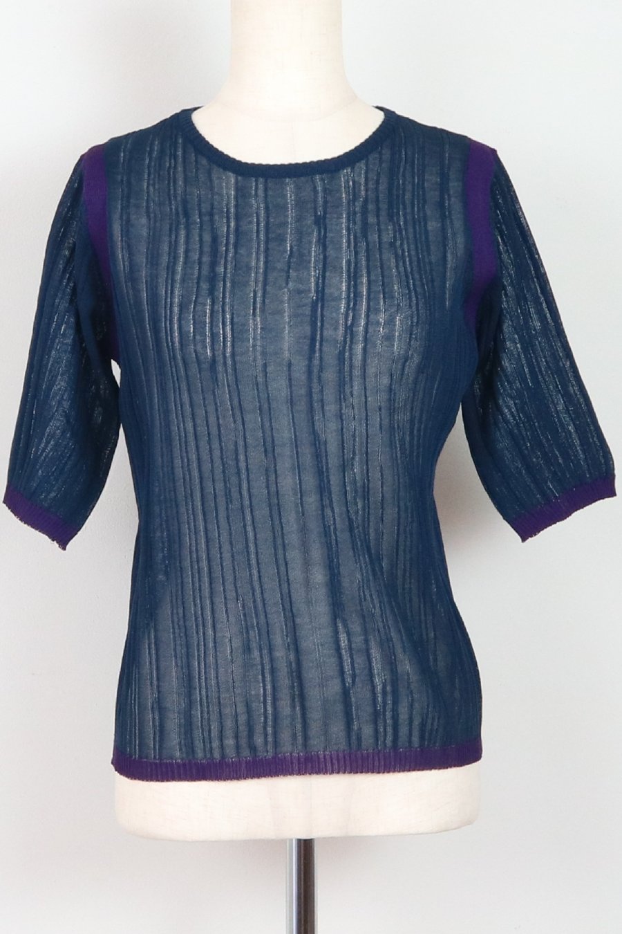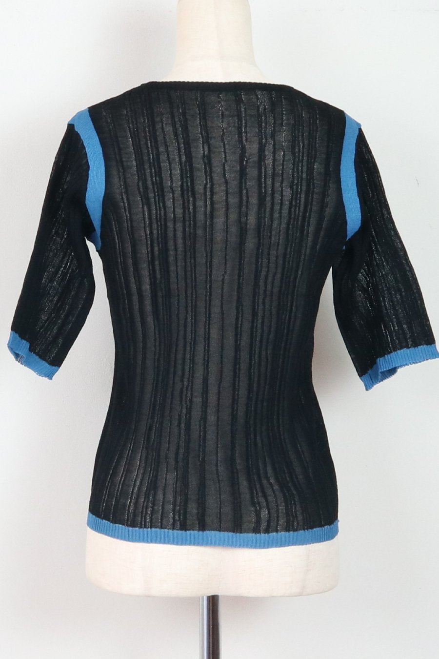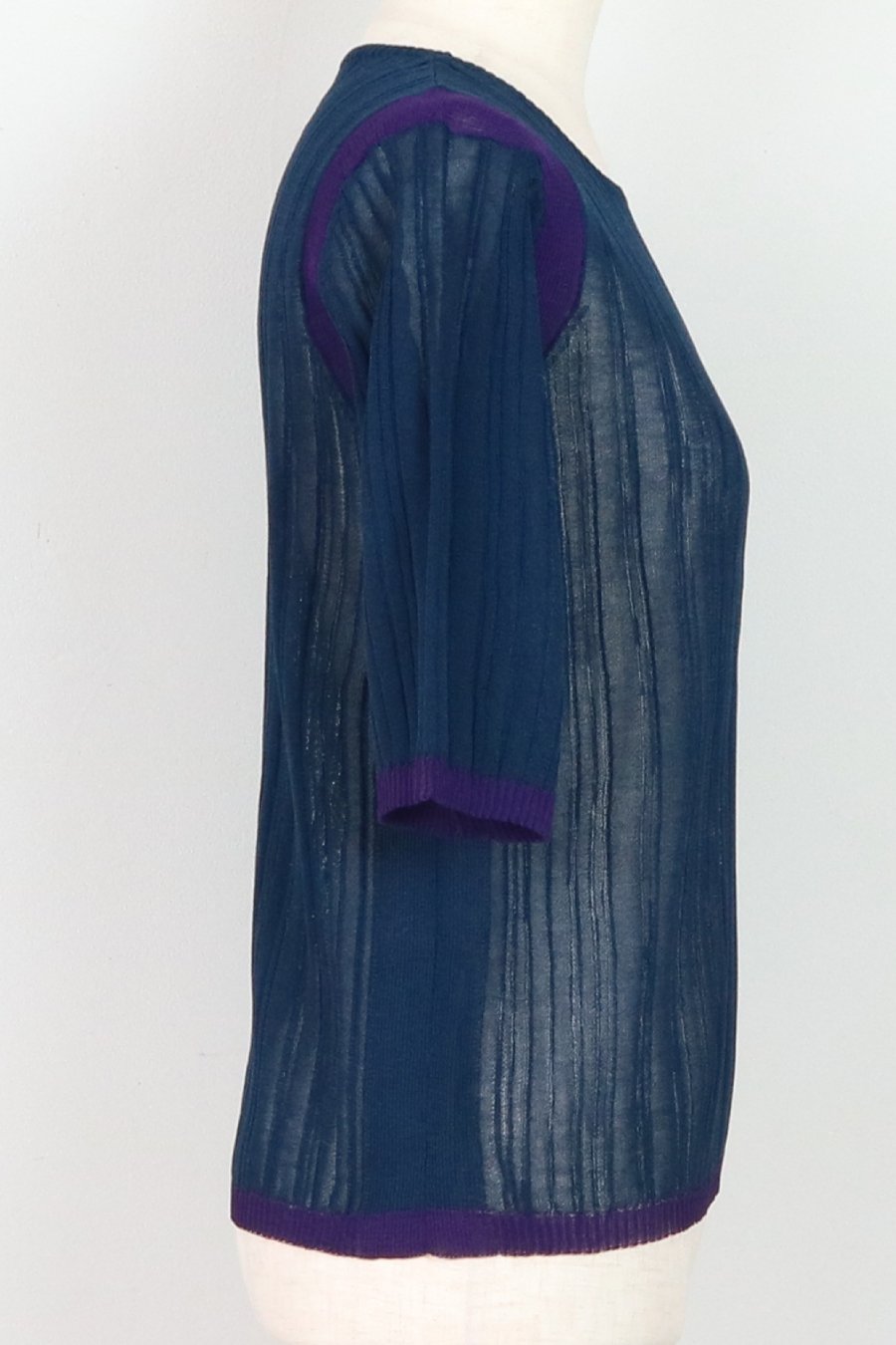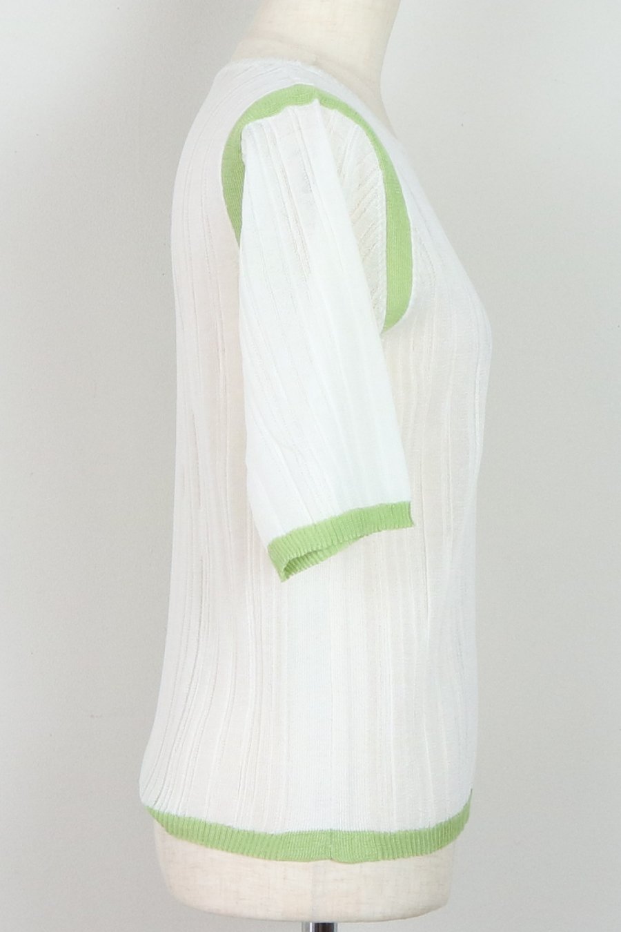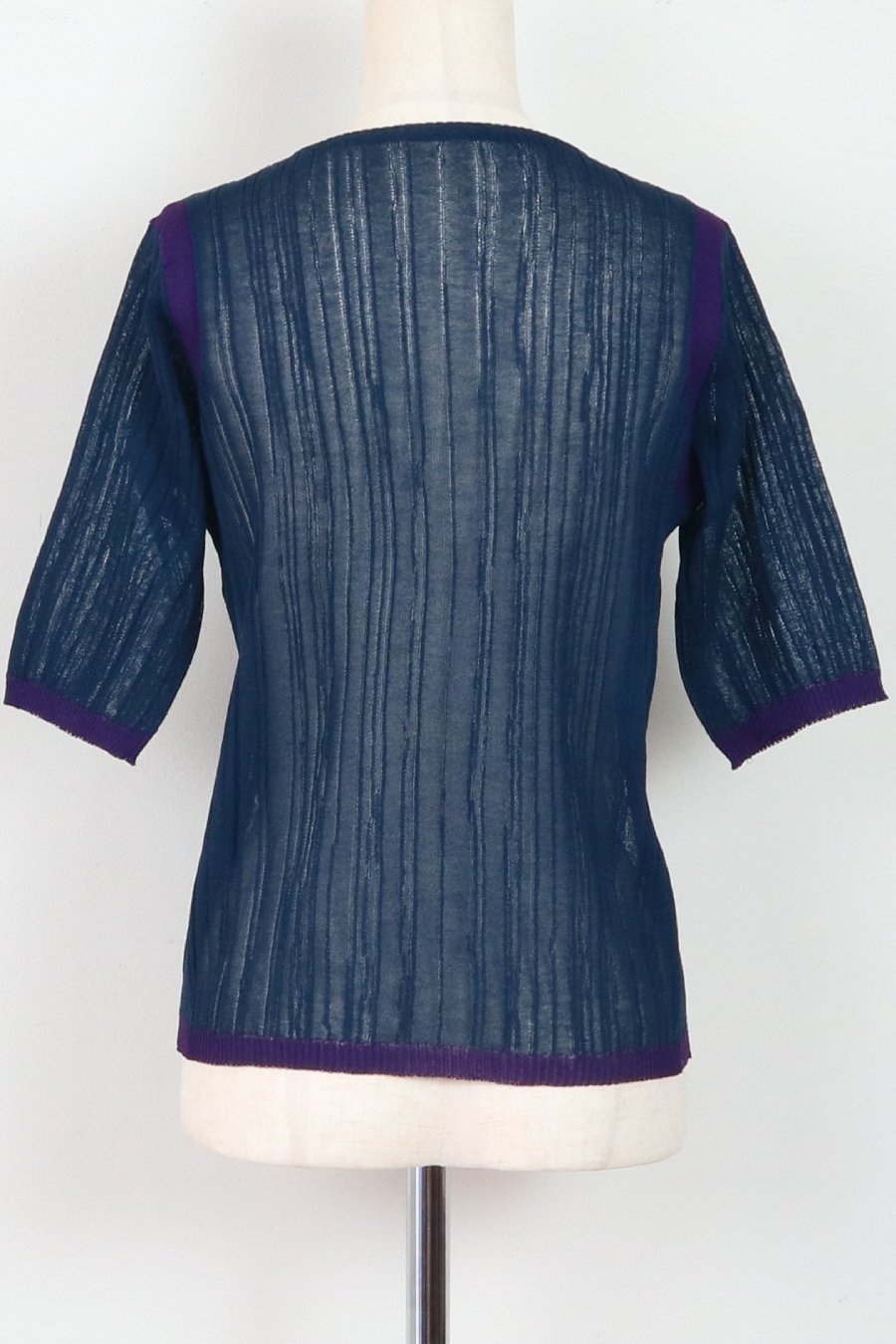 アームホール、袖口と裾の配色ラインがポイントのシアーニット。
