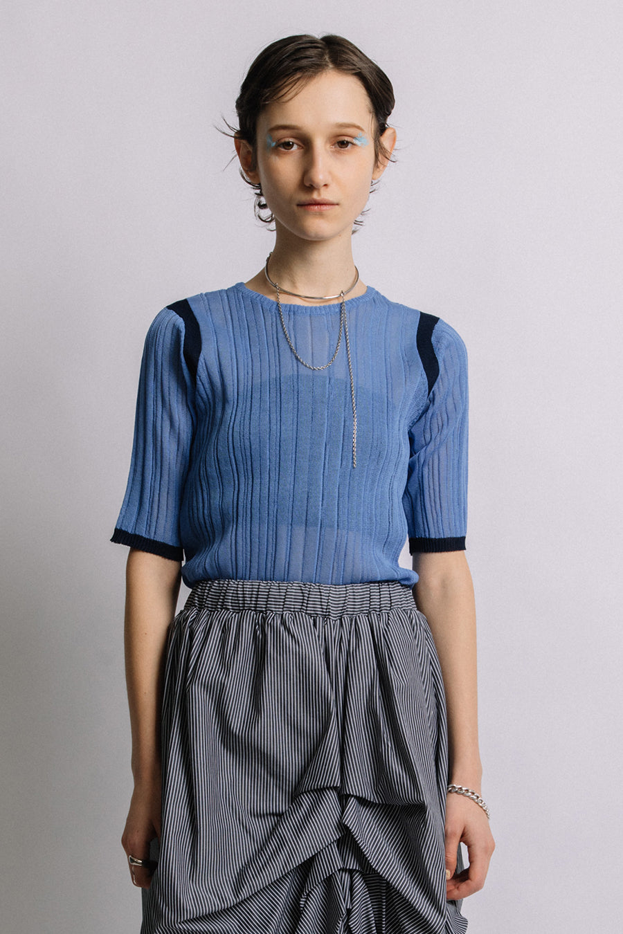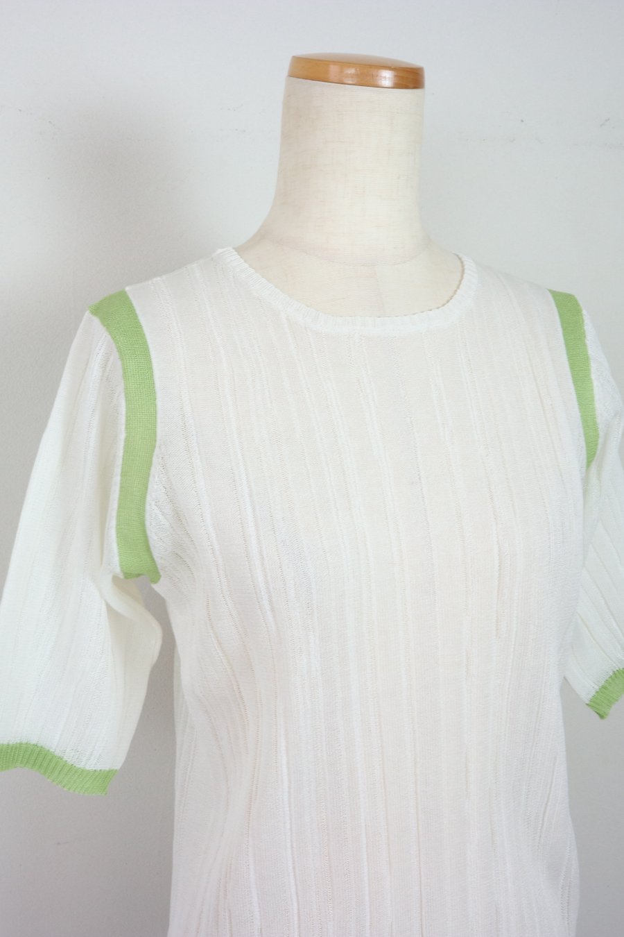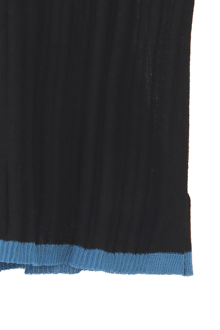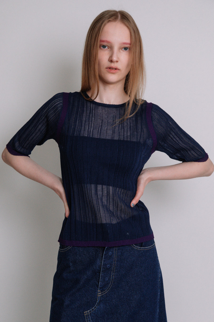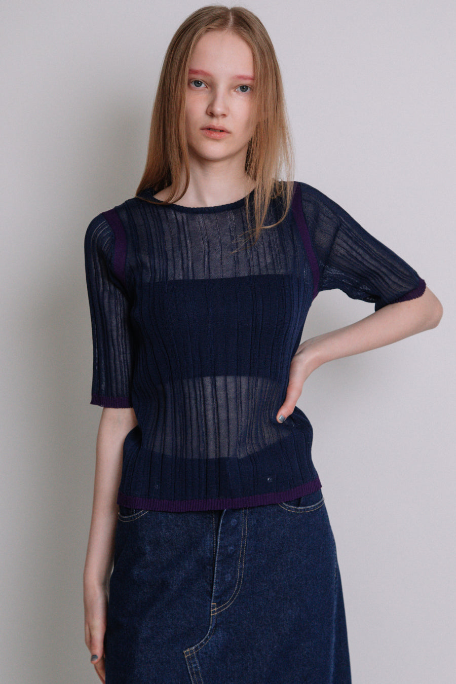 アームホール、袖口と裾の配色ラインがポイントのシアーニット。